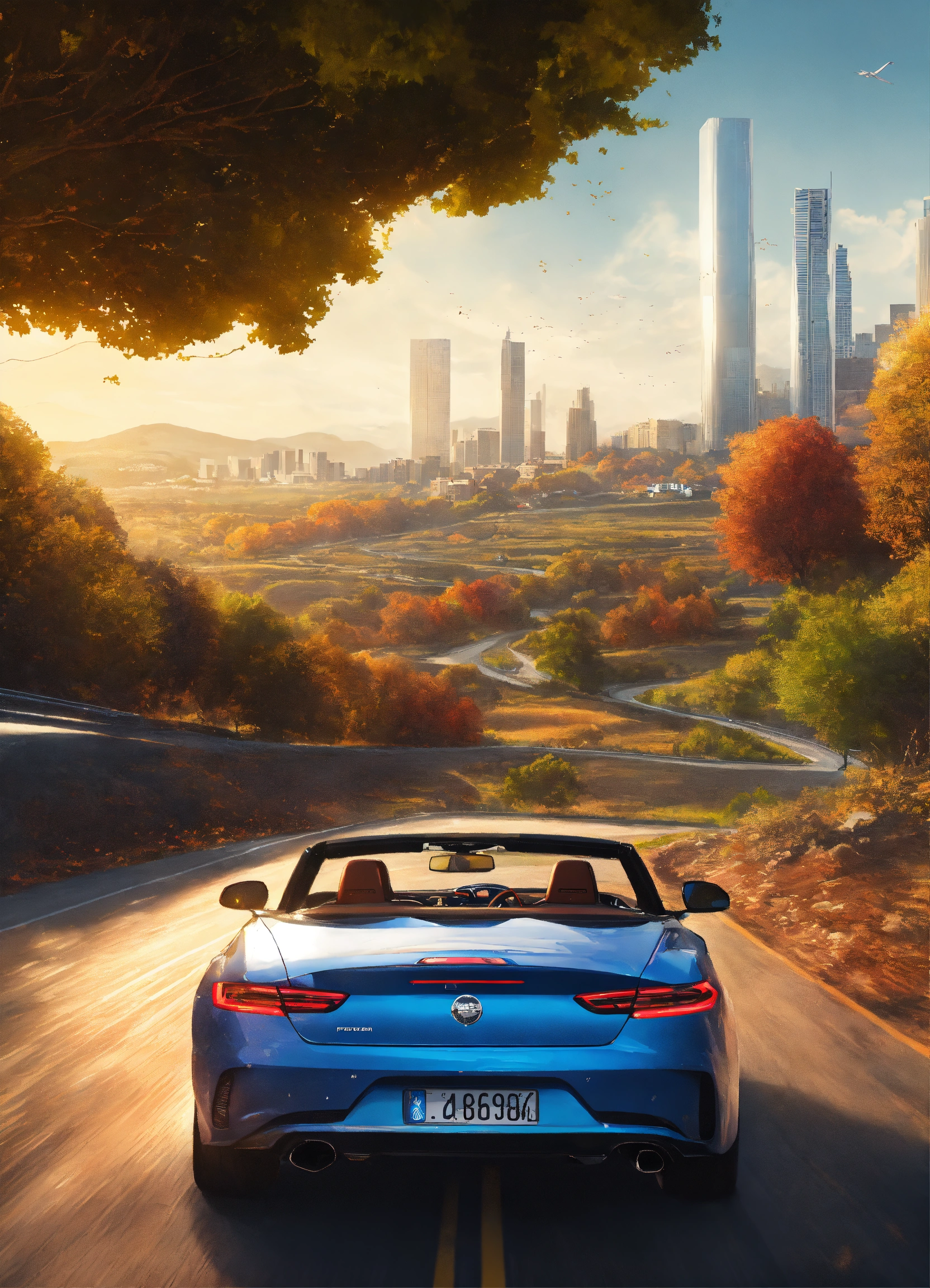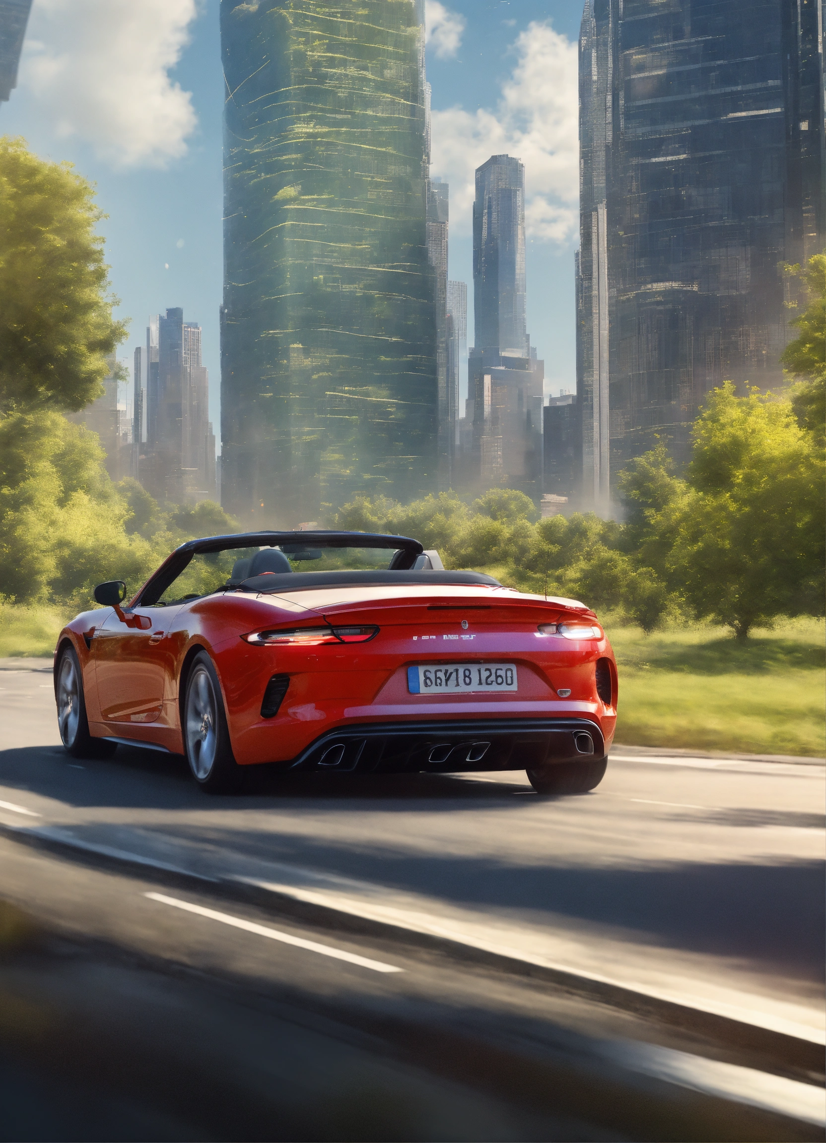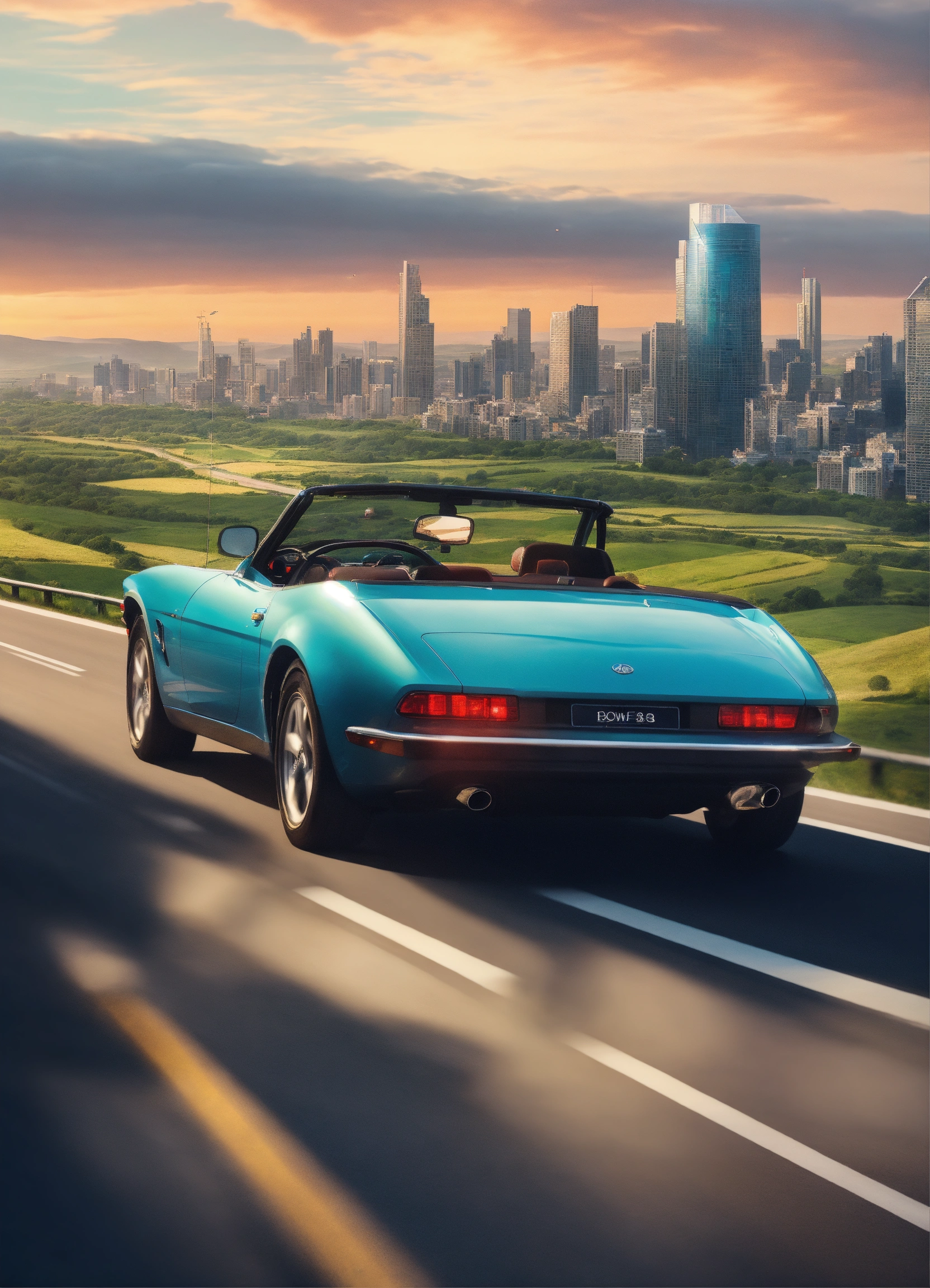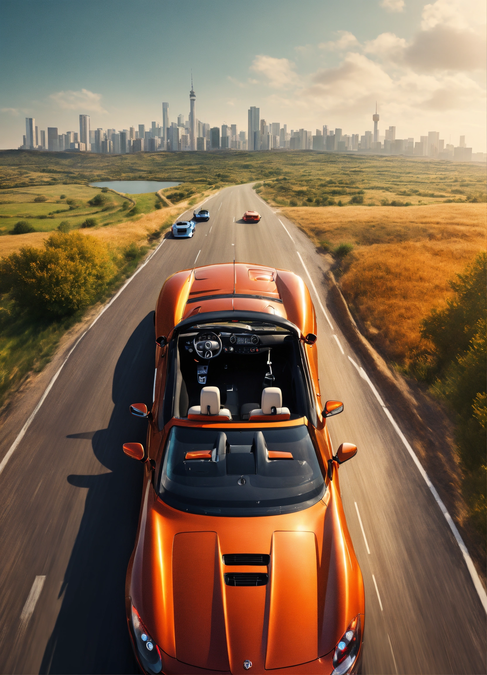 View from behind and slightly above, a driver in a convertible sports car is driving in the countryside, no tall buildings, blowing past and scattering screenshots of websites and logos, which are behind the car on the road, and powerpoints and ads, 8k, art station, 169, hyperrealism, web icons and graphic design icons floating around in background