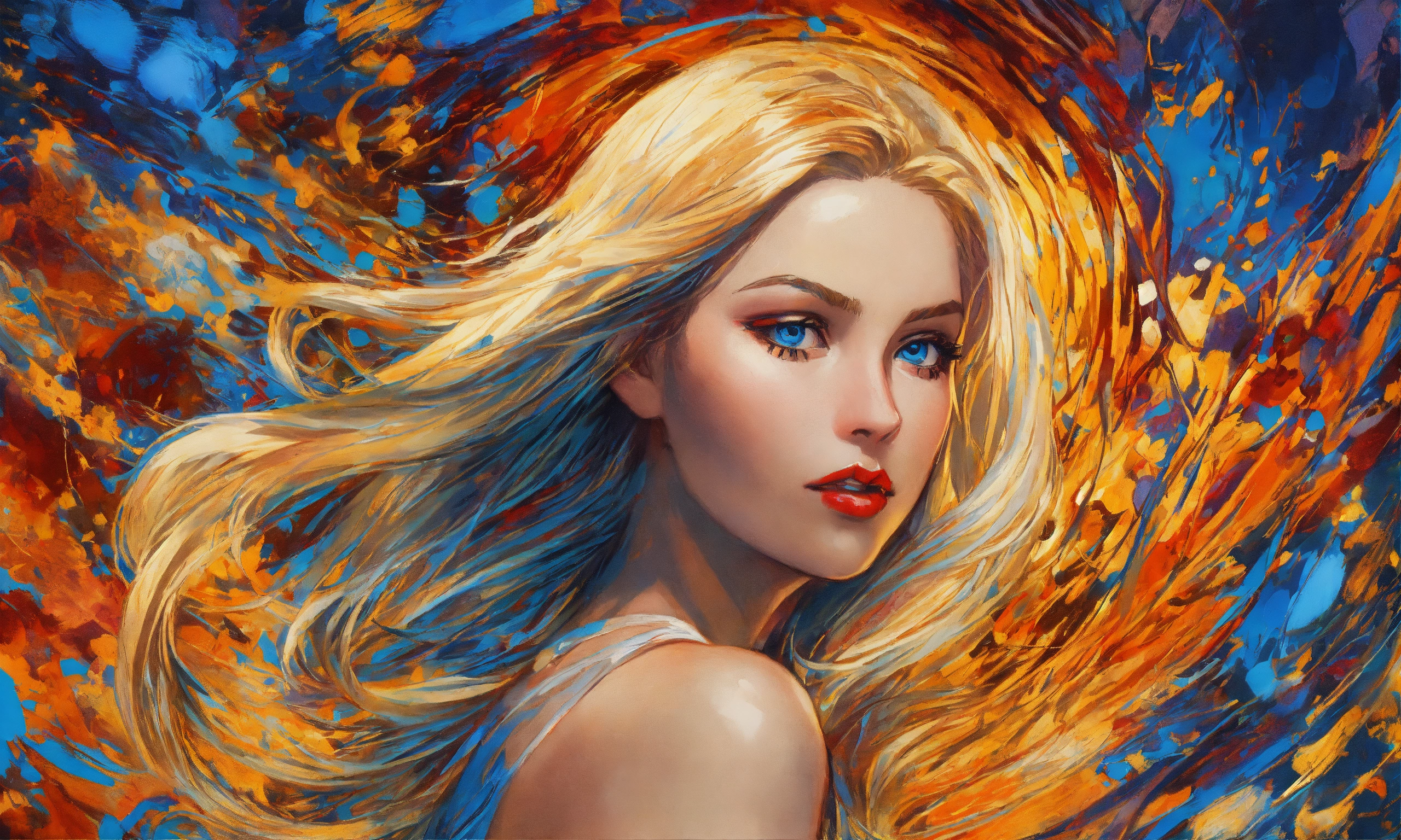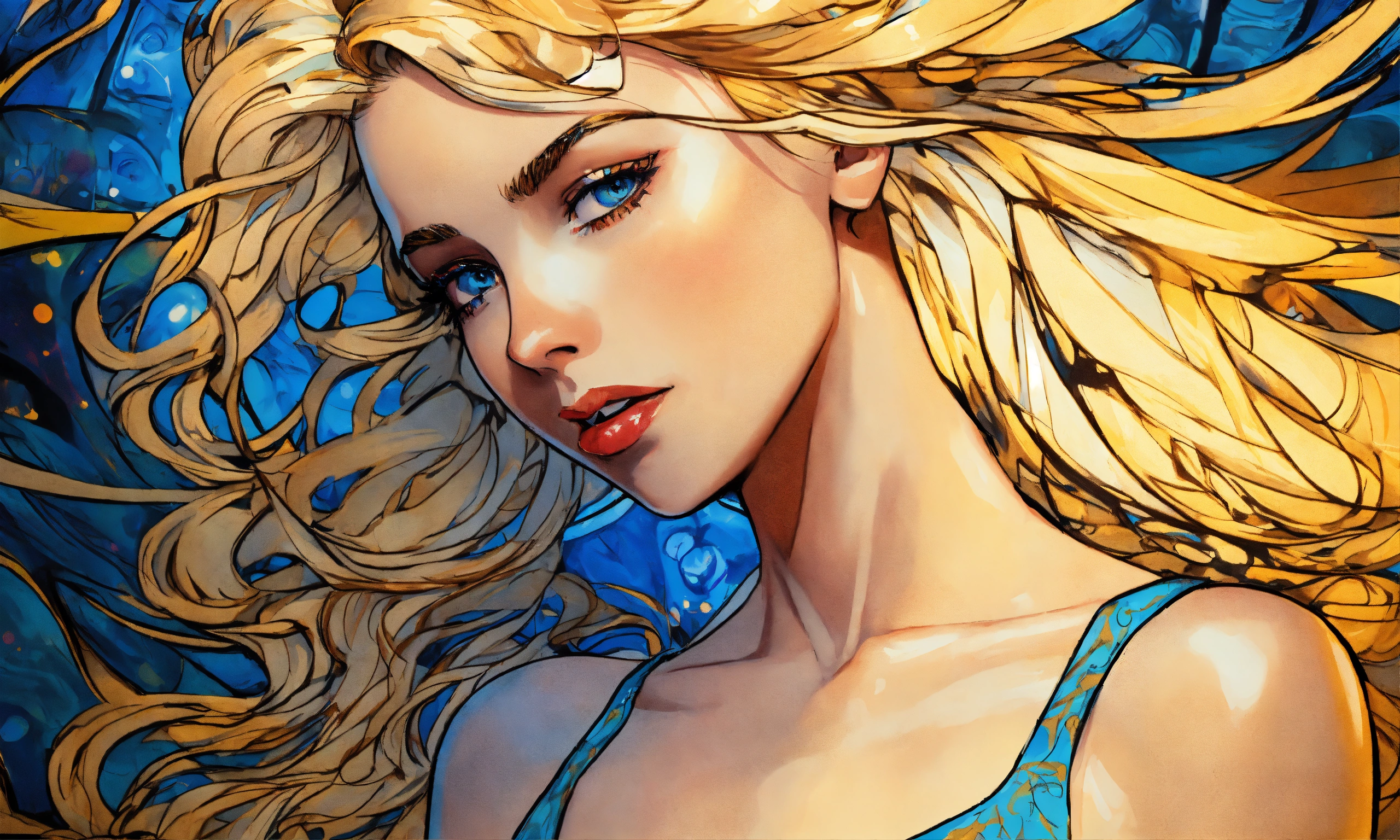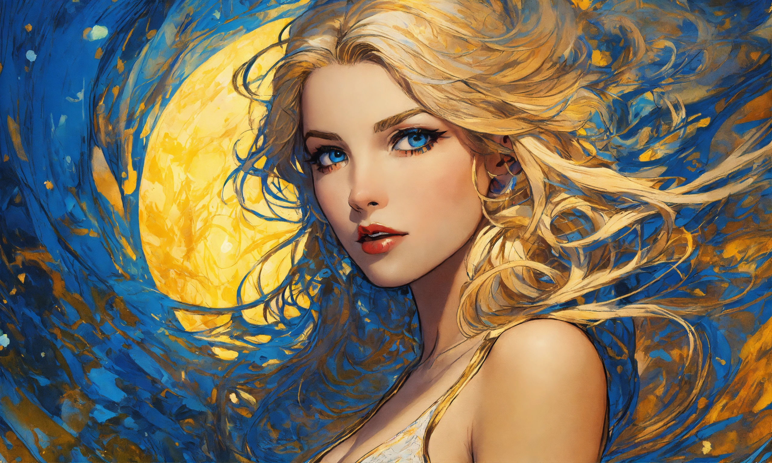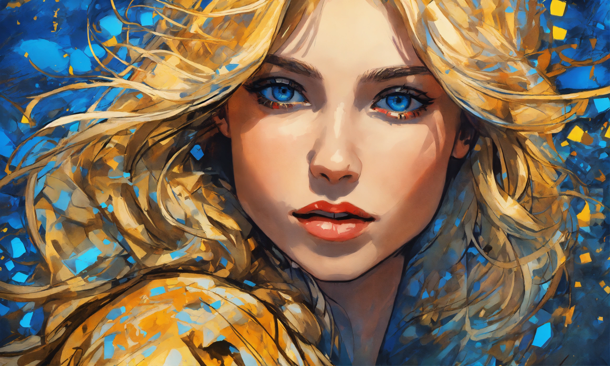 Pop art, romantic beautiful mysterious enchanting blonde angelic female, blue eyes, hazel eyes, concept art, sharp focus, intricate, highly detailed, smooth, dim incandescent light, art by jackson pollock, comic book art style, robe.