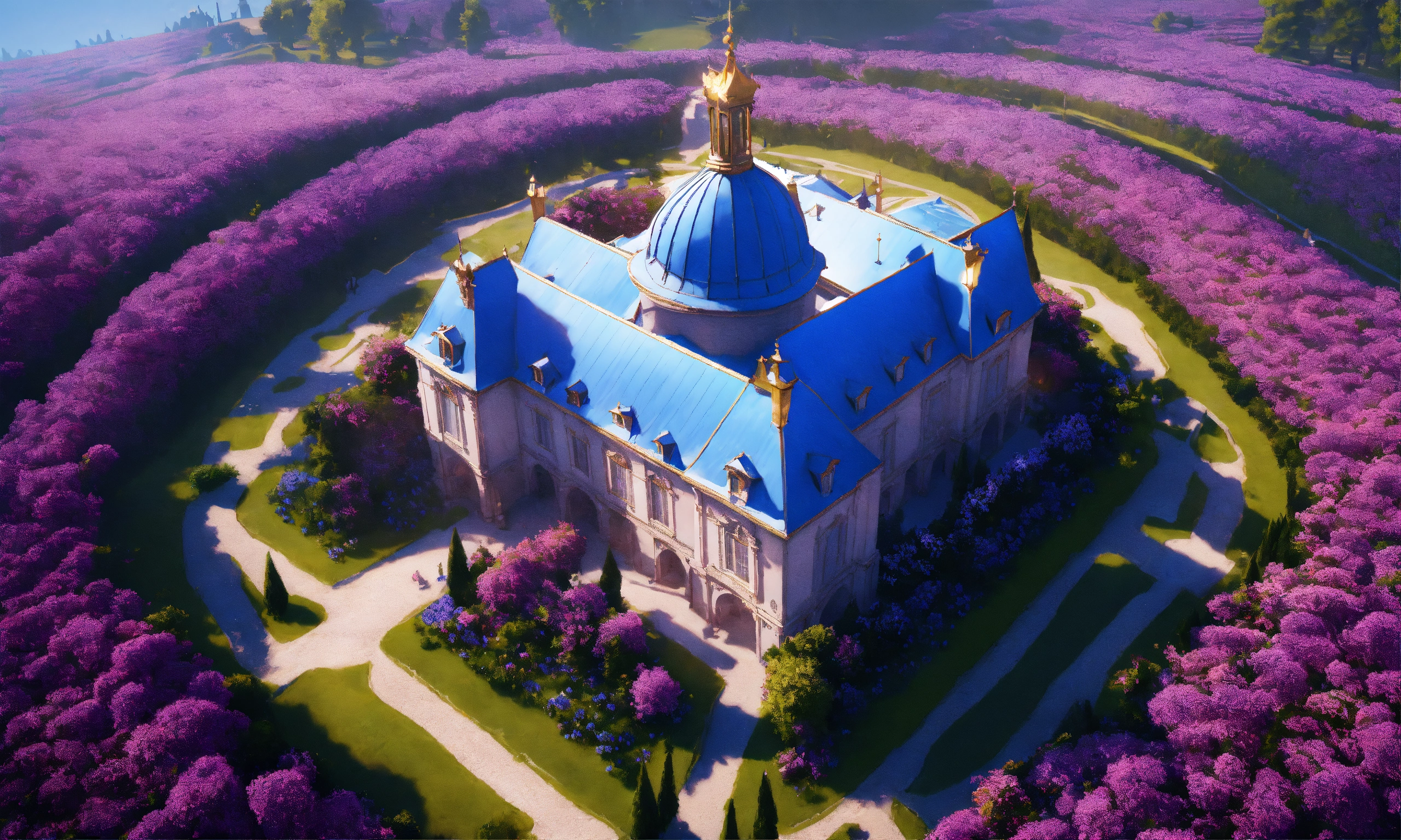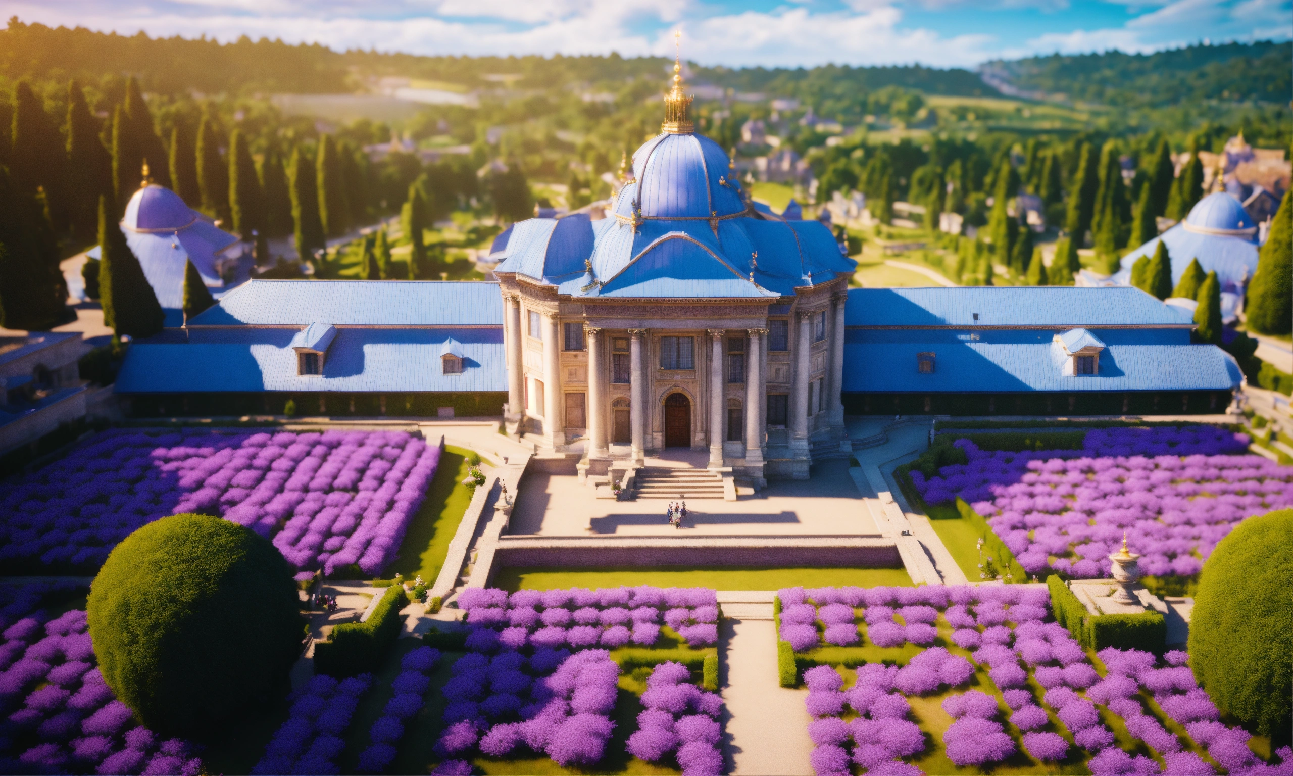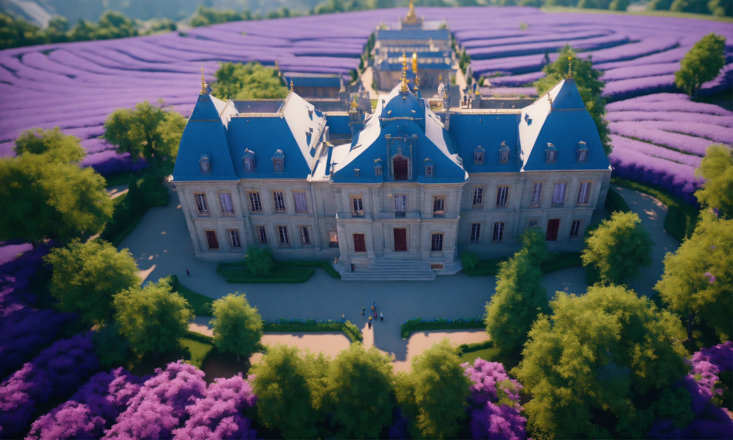Overhead view of a royal palace with a light blue roof surrounded by purple flower fields in france, 8k, unreal engine
