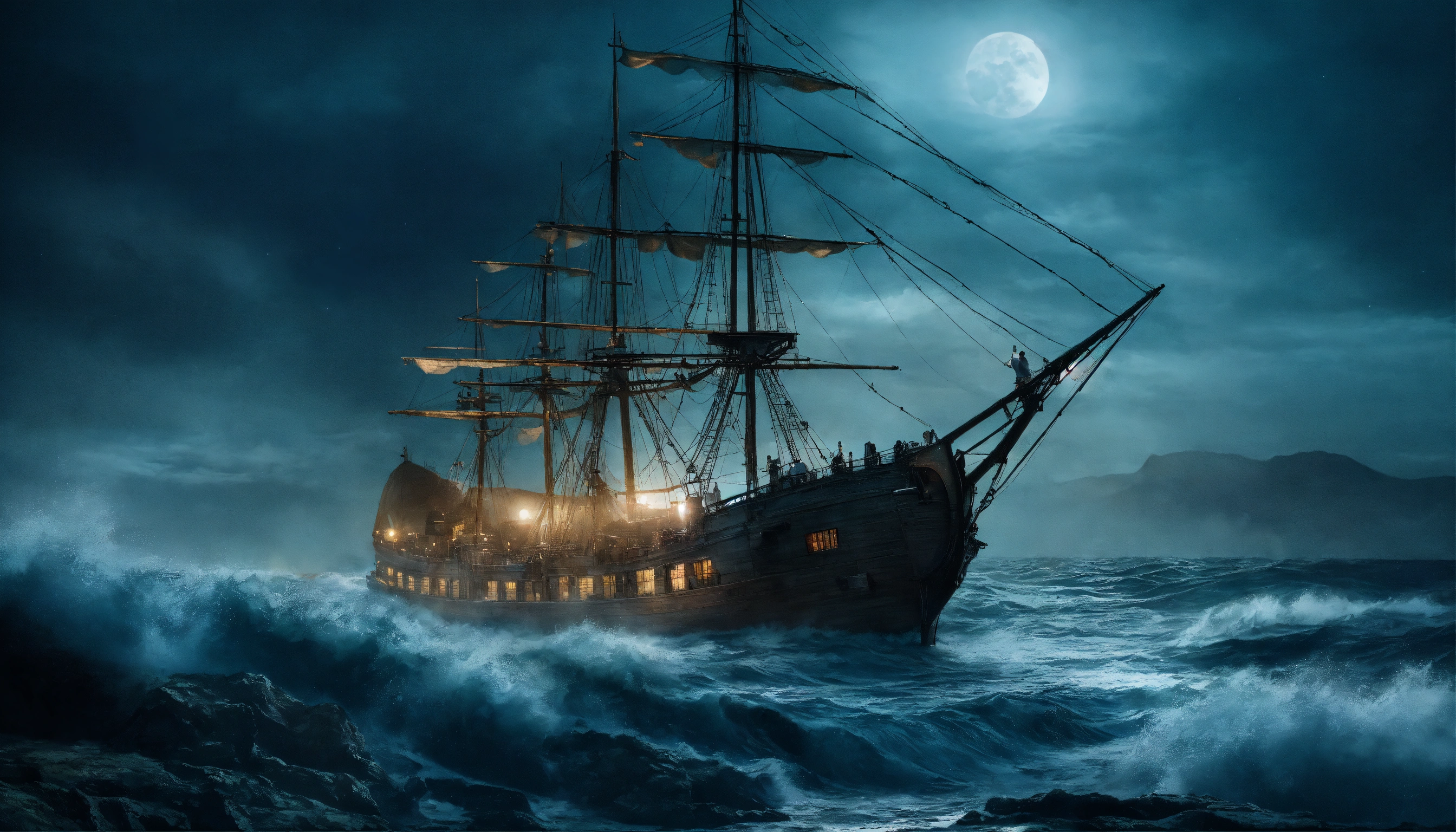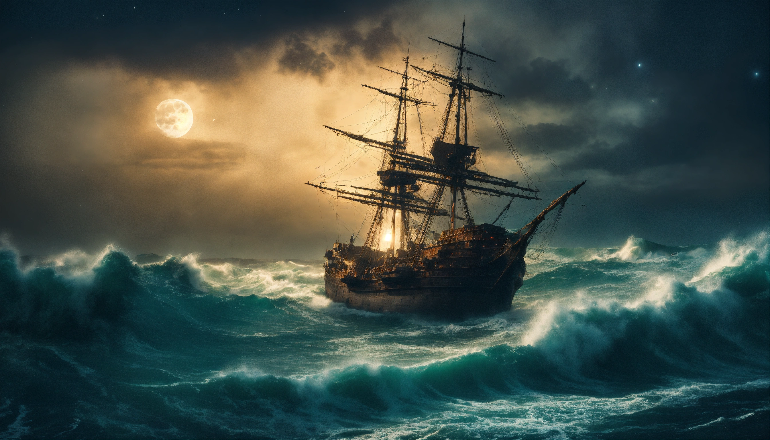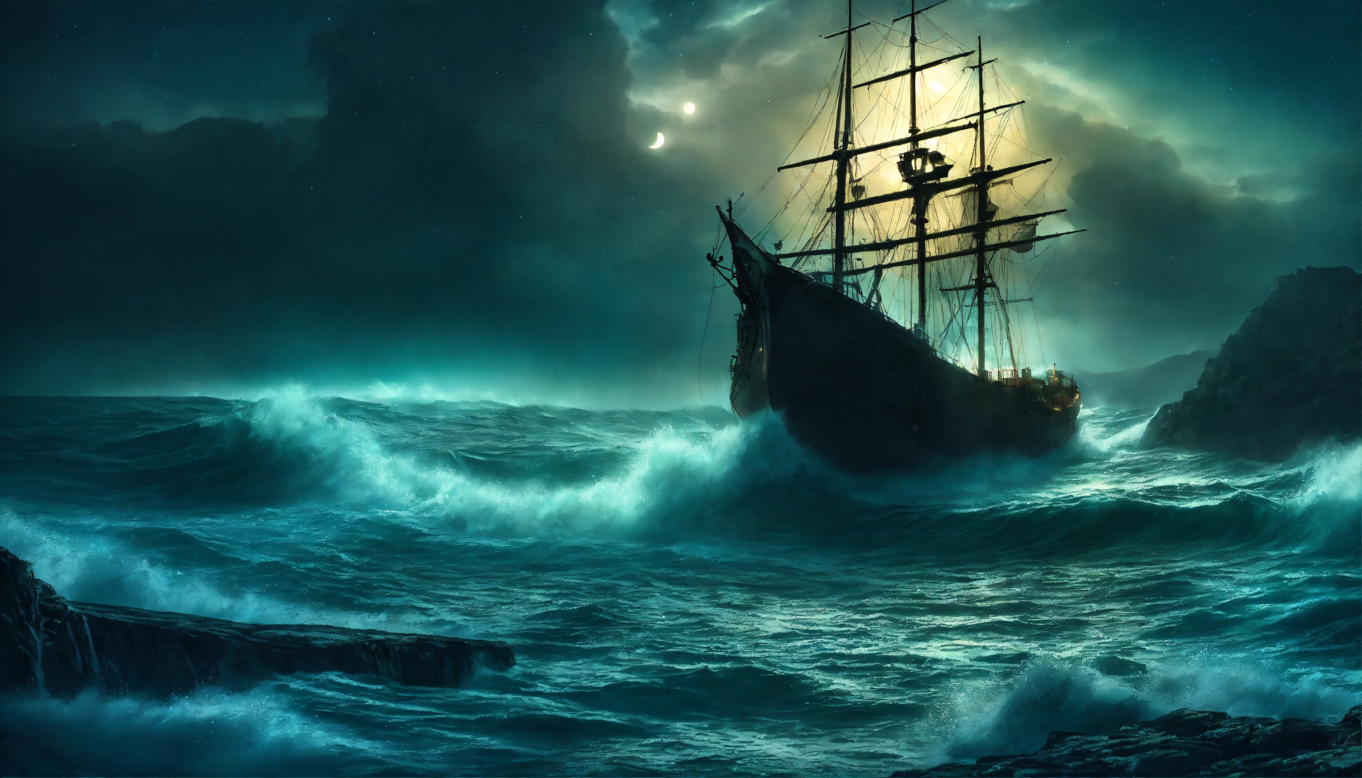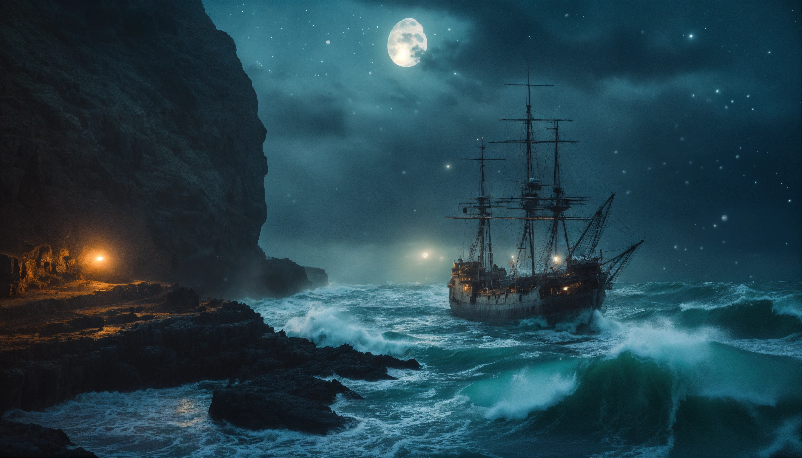 Rocky coast, old ship sinking, night, mermaids in the water swiming around the ship, photography, ethereal, moonlight, rough sea big storm, big waves, aerial shot