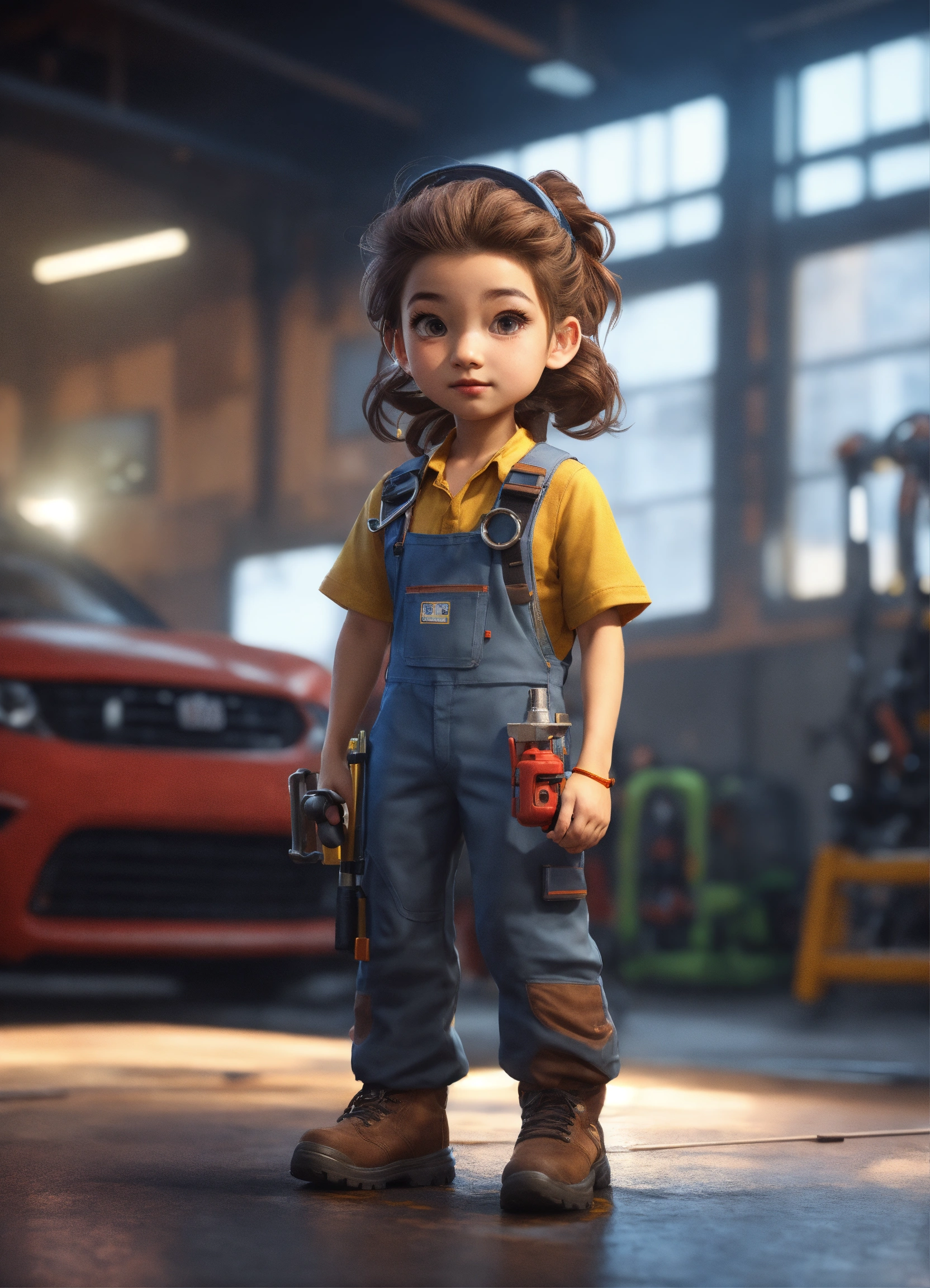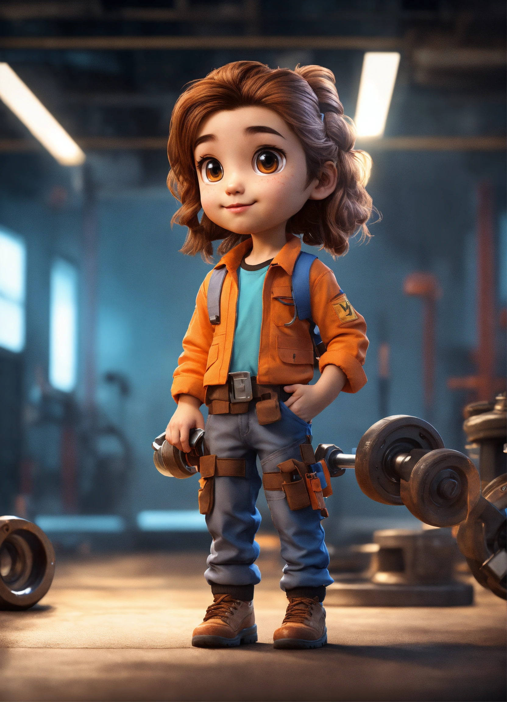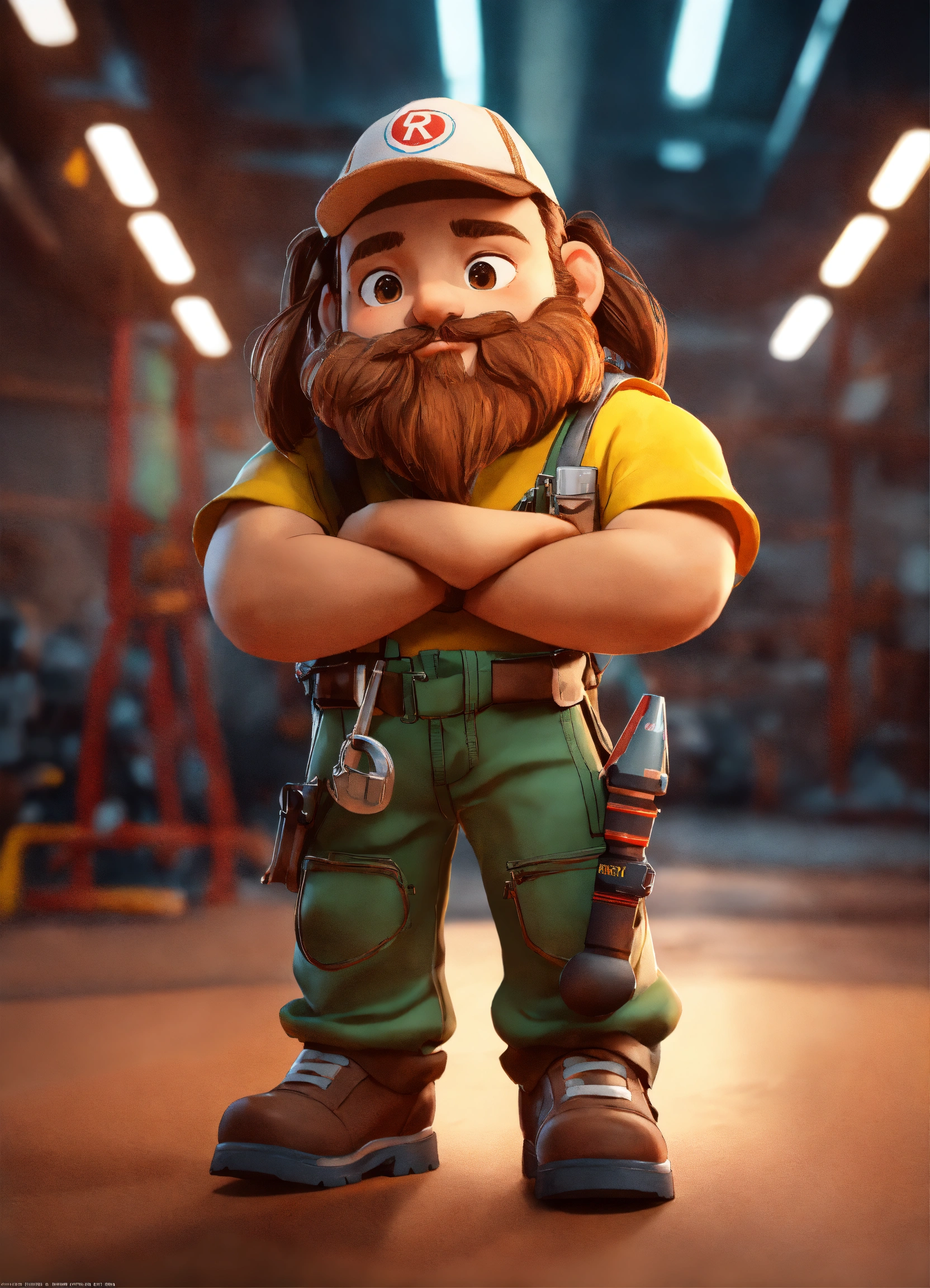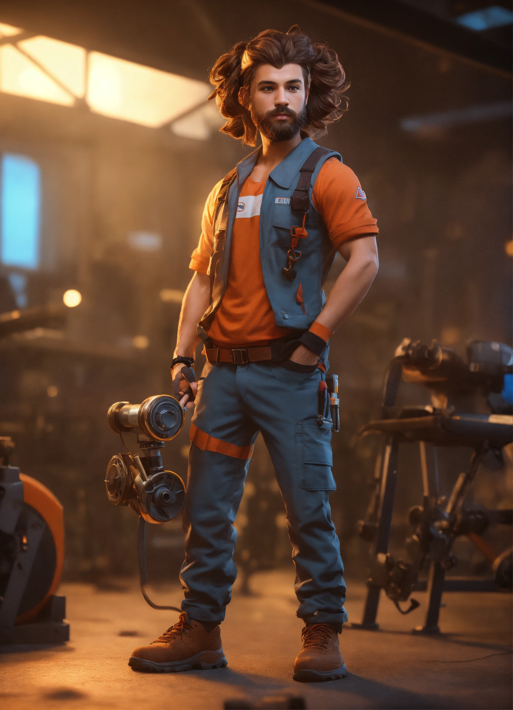 Full-body 4d photographic image dressed as a mechanic, holding a wrench, of a cute male chibi boy with very long hair, has a tail in her hair, a bun, and a beard, brown hair color, realistic and vivid colors, rendered in octane, standing out on artstation, artistic photography, hyperrealistic concept art, soft, natural, and perfect volumetric cinematic light, in ultra-high definition (uhd) with a background in a gym