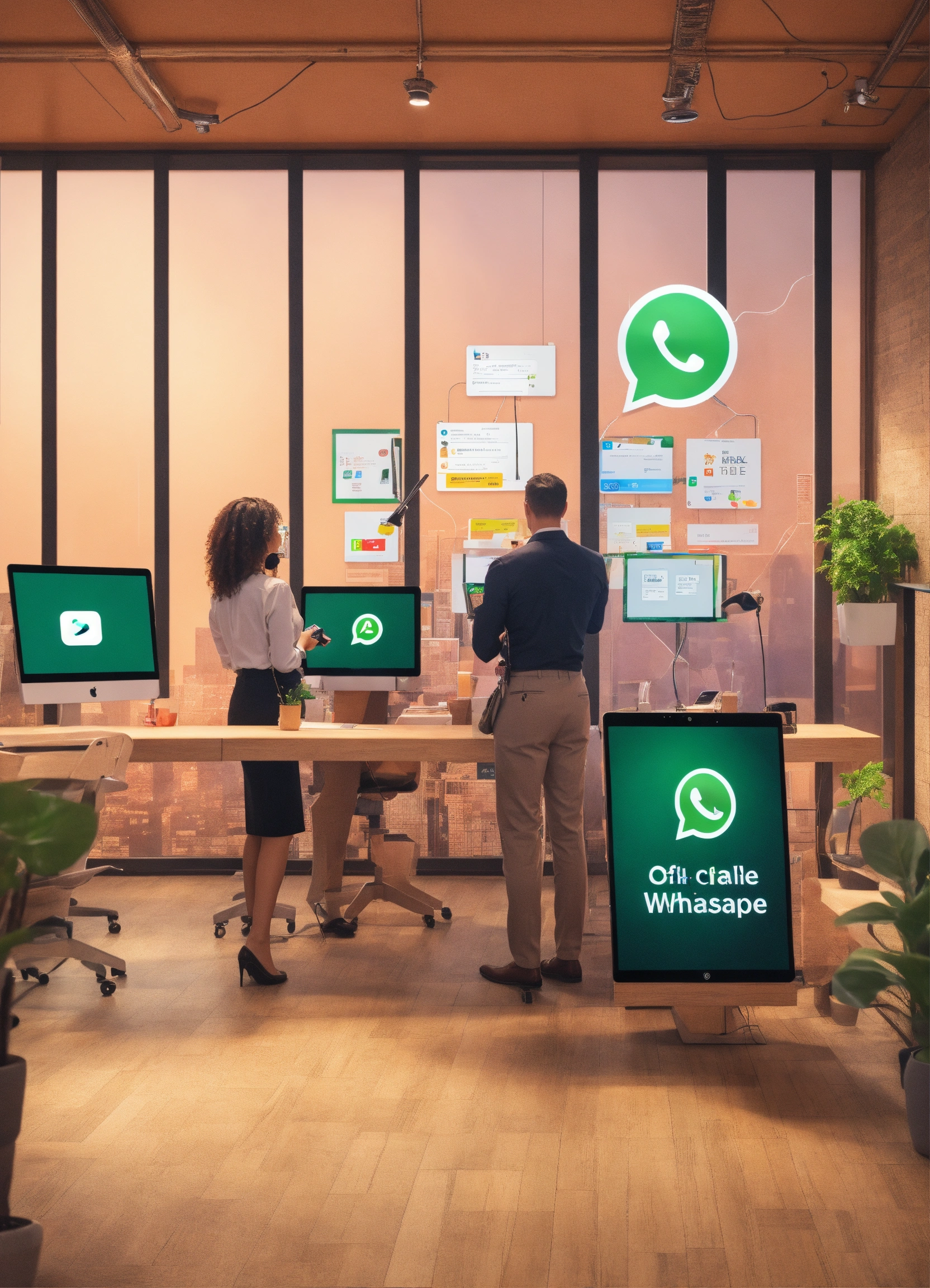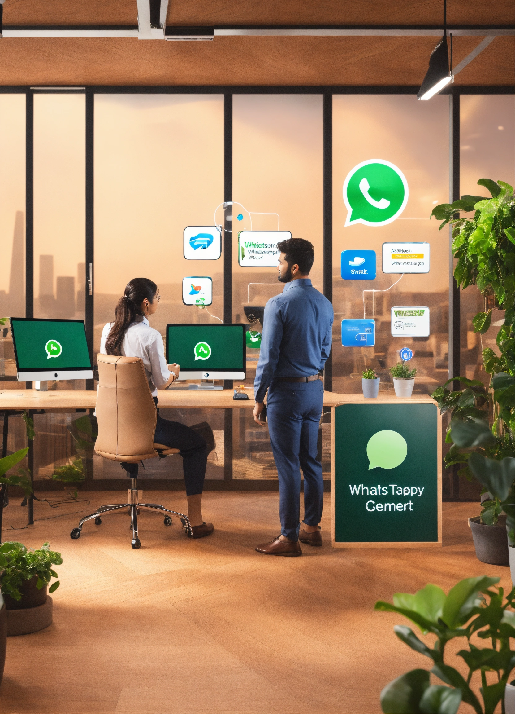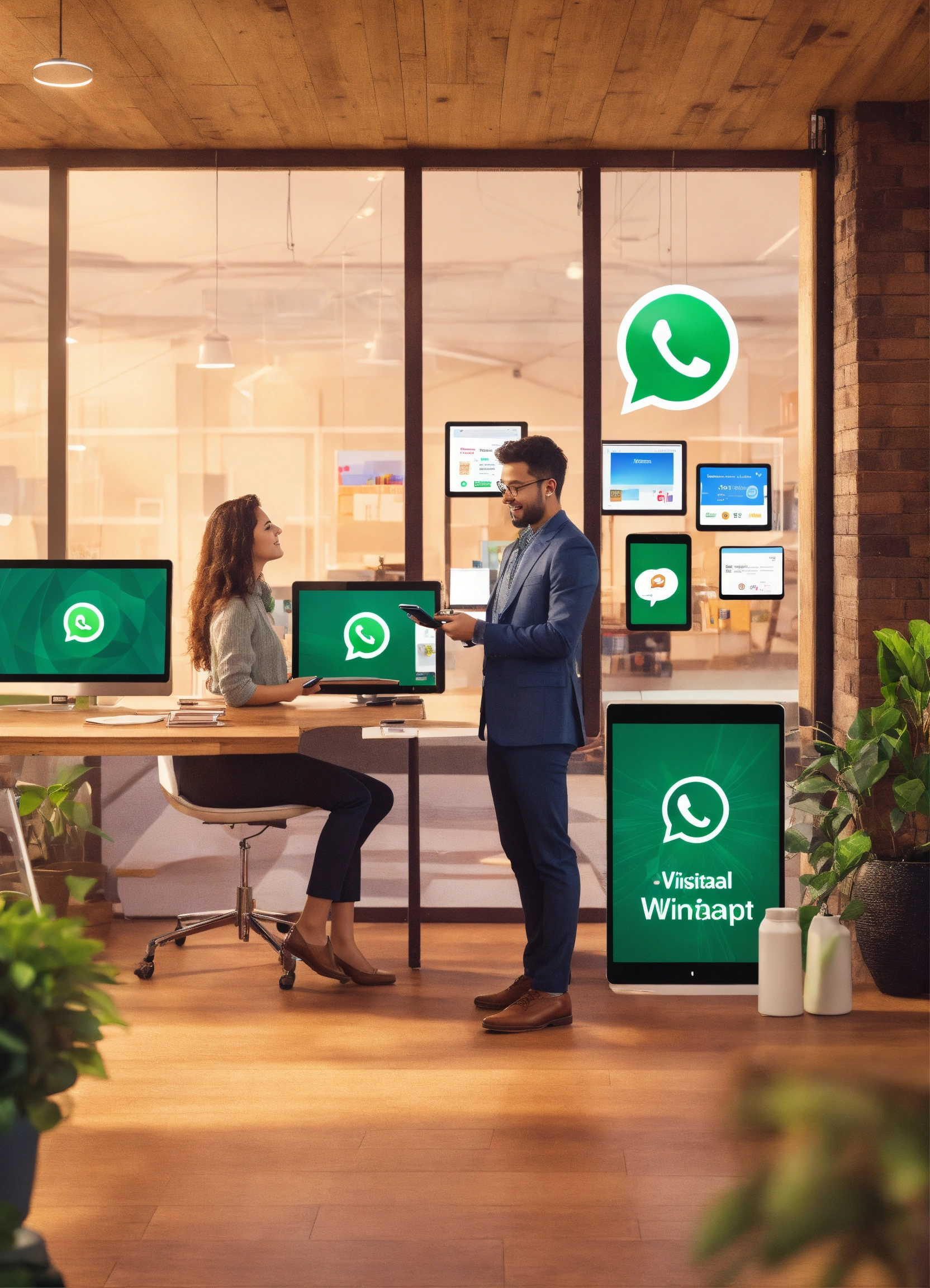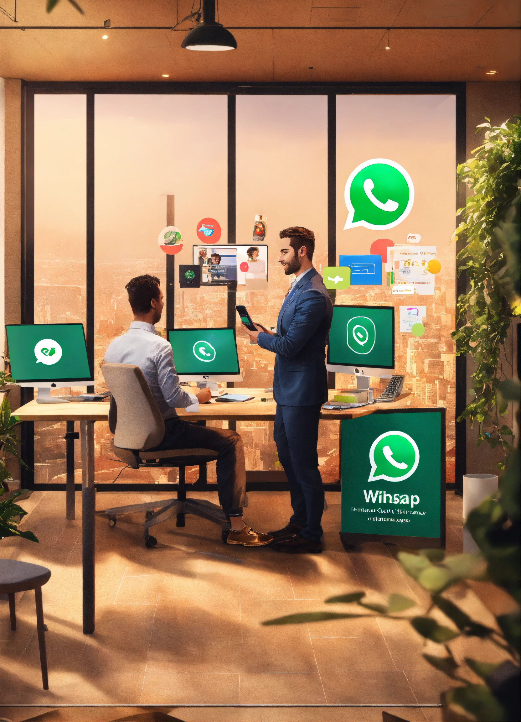 Create an office where a person gives attention to a customer, where there is a cell phone, a visual demonstration tablet, giant monitor, and whatsapp logo