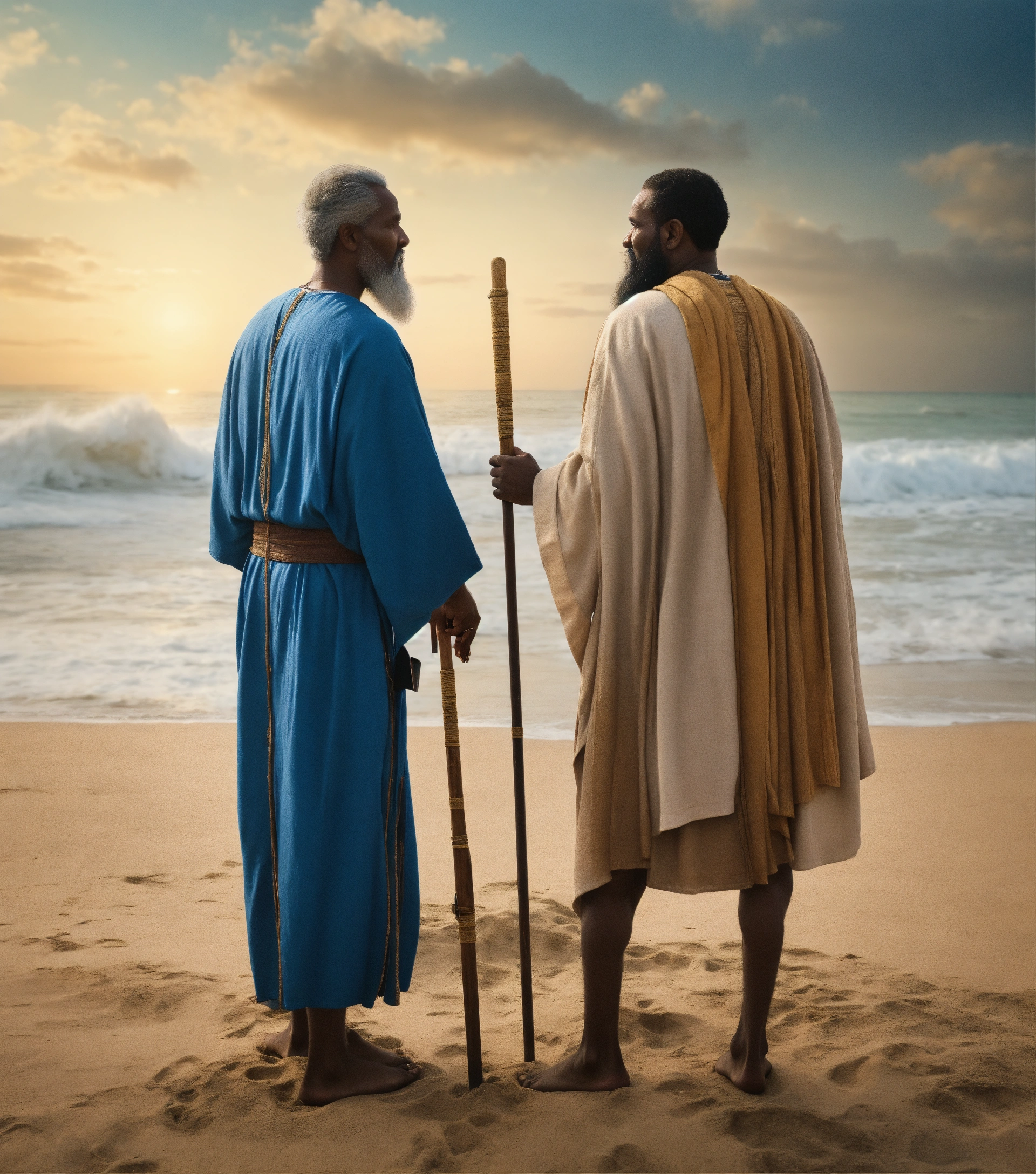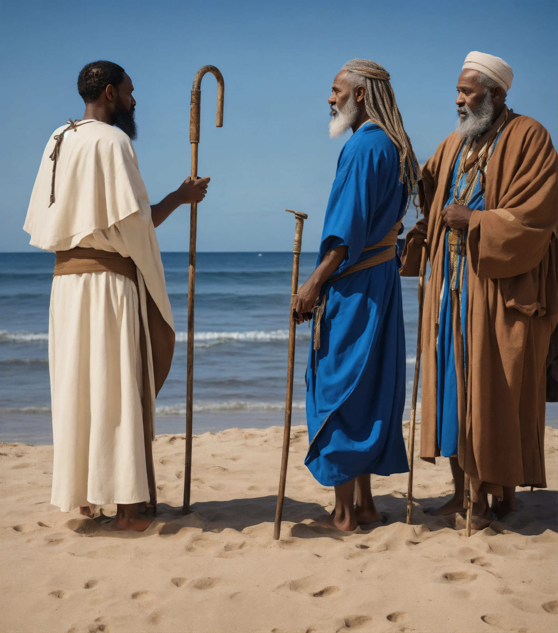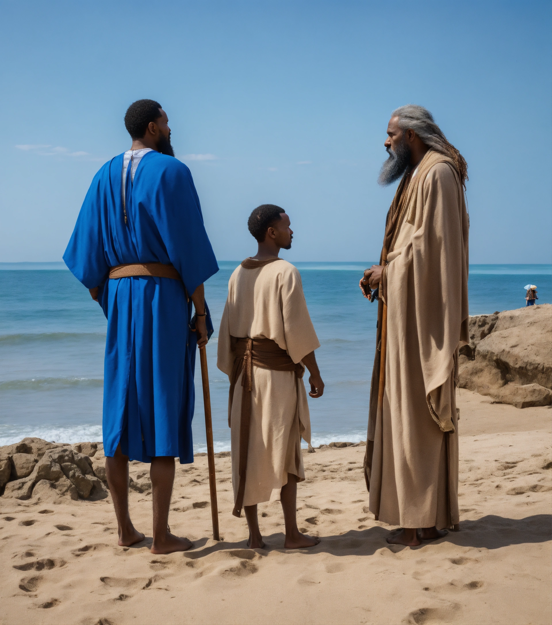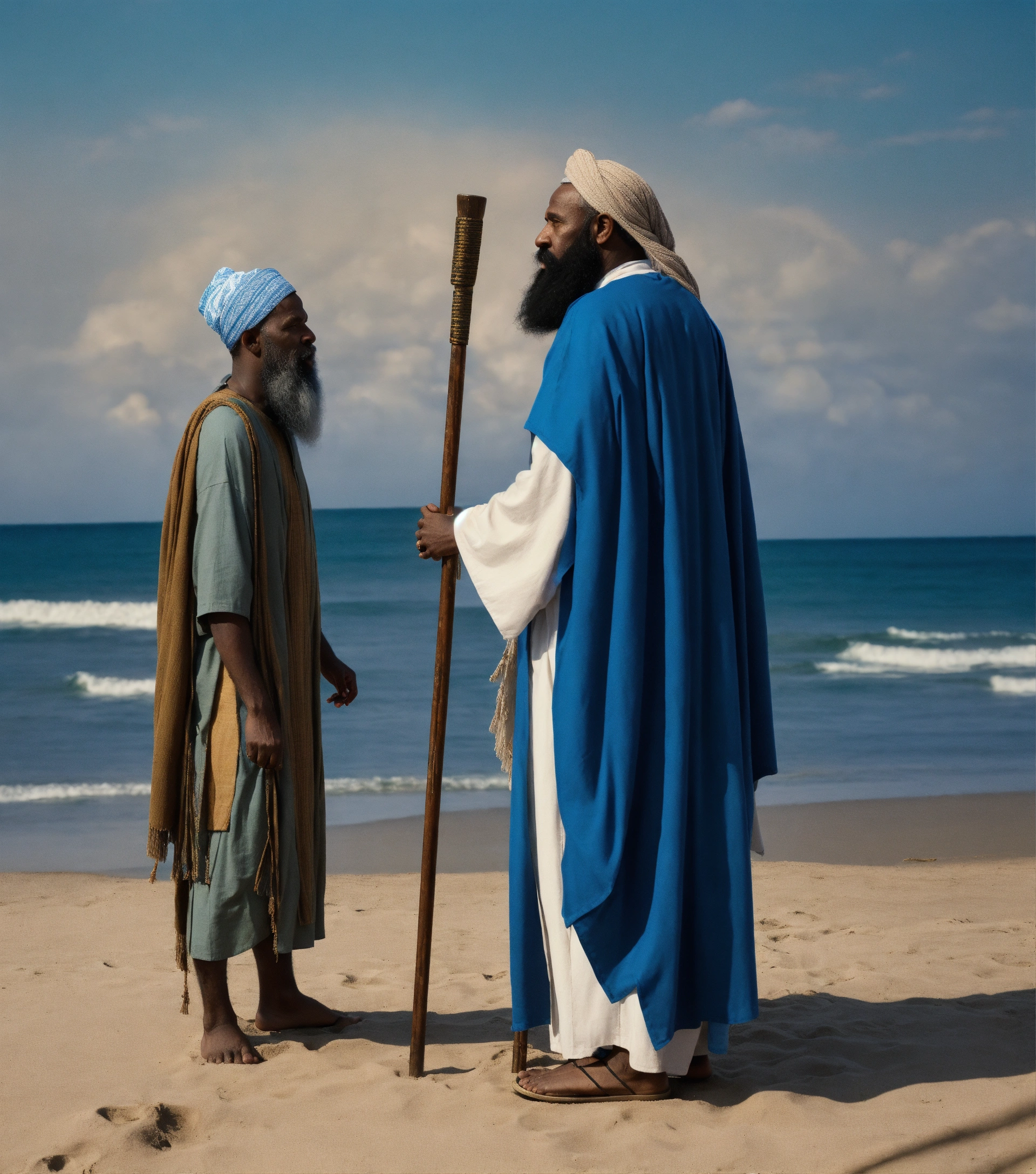Cinmatic, view from the back, moses prophet meet another prophet infront of the beach alone, standing in front of each other talking, both are middle eastren complexions, both have white beard, both of them holding old canes, moses is wearing blue, others wearing white, there is a young boy following them