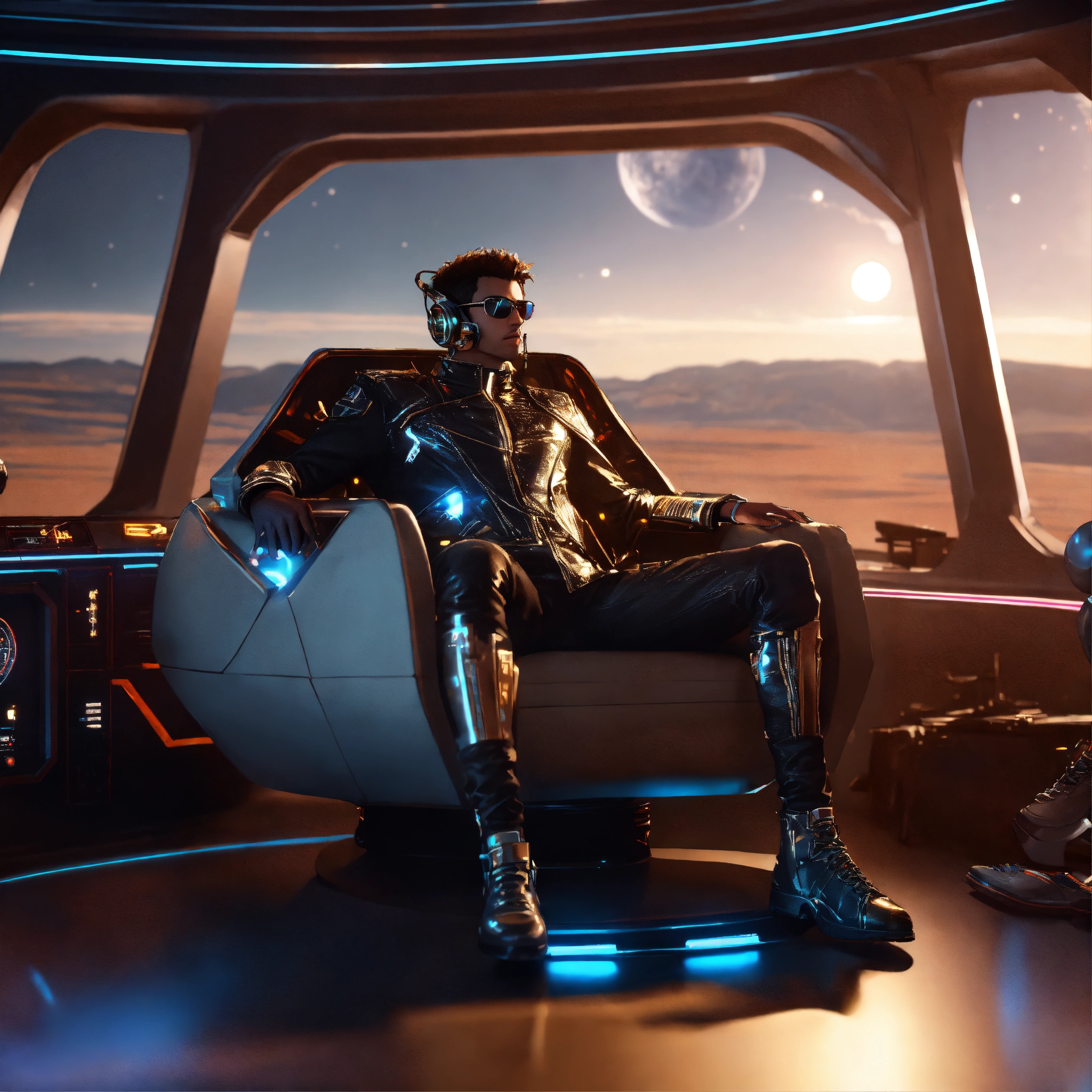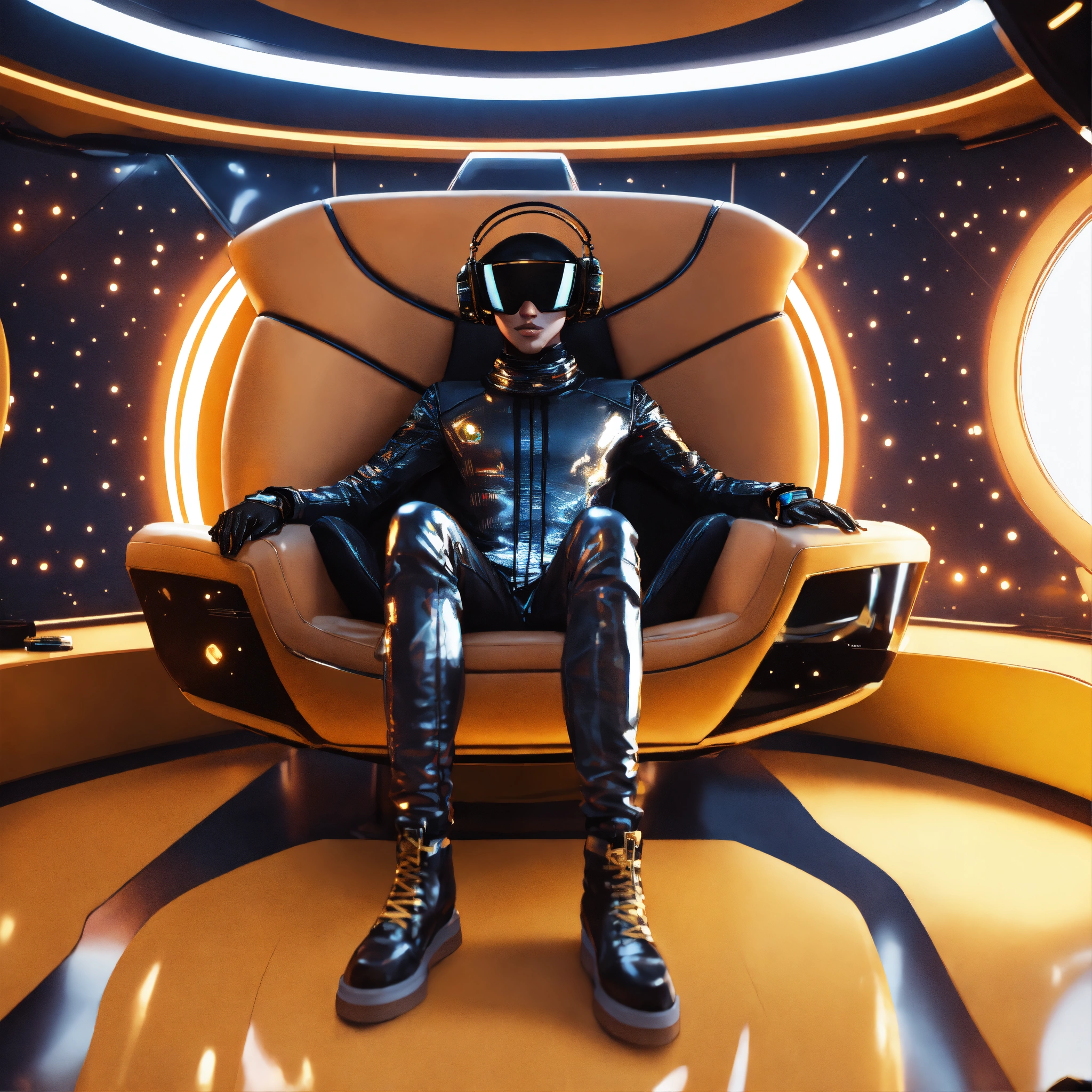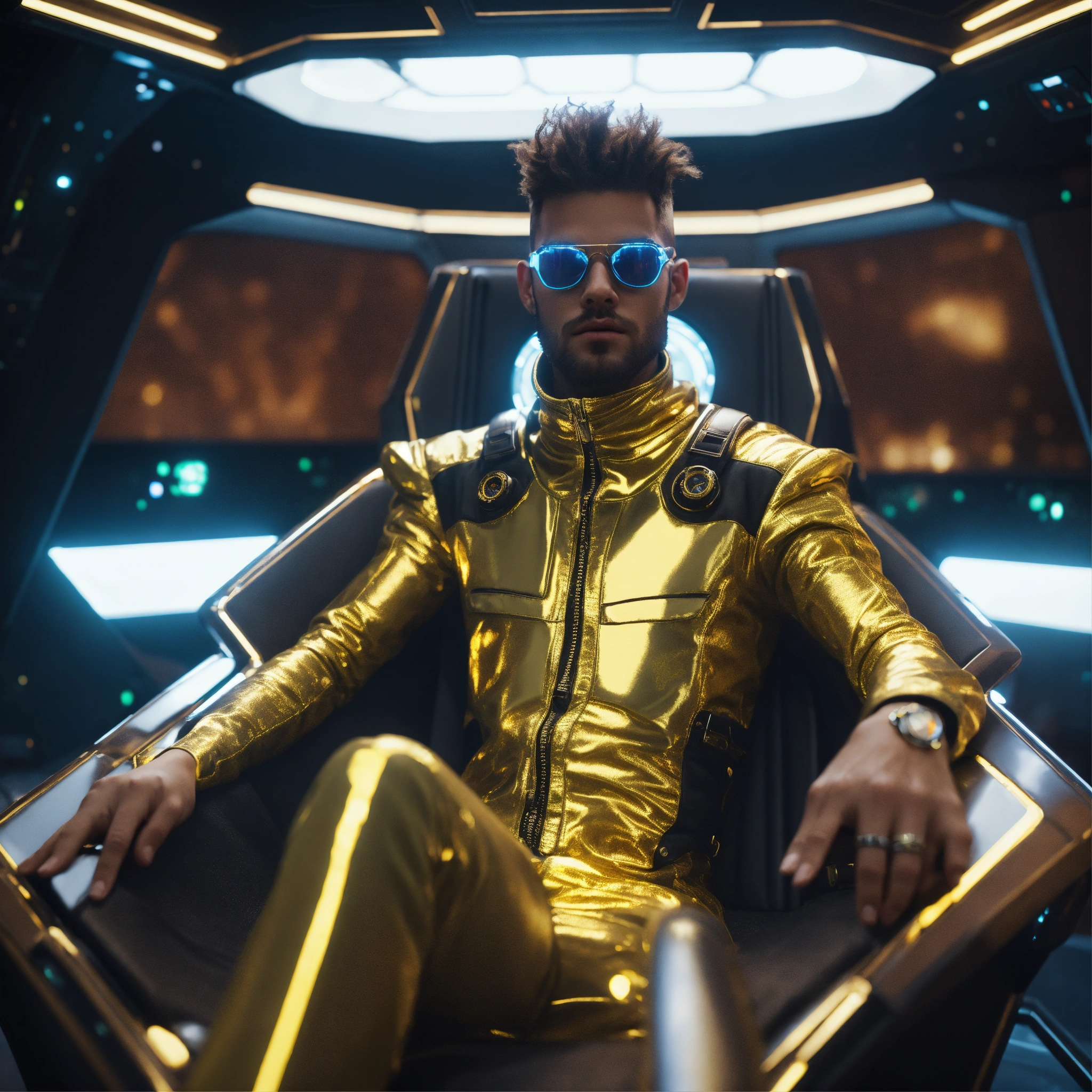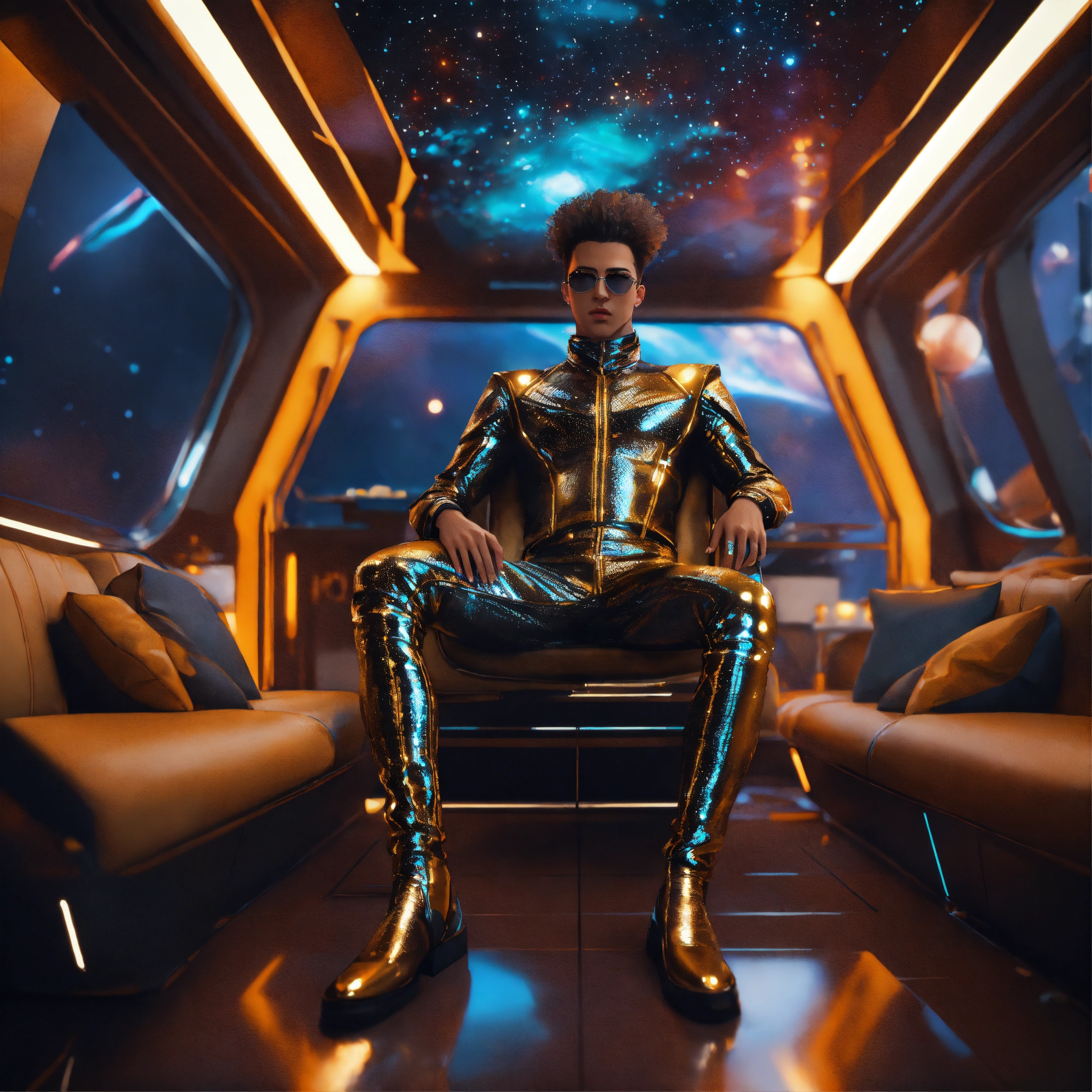 Zoom out of a alien male rockstar wearing cool space fashion is lounging in a luxurious futuristic space yacht, realistic, futuristic, sci-fi, 8k, unreal engine