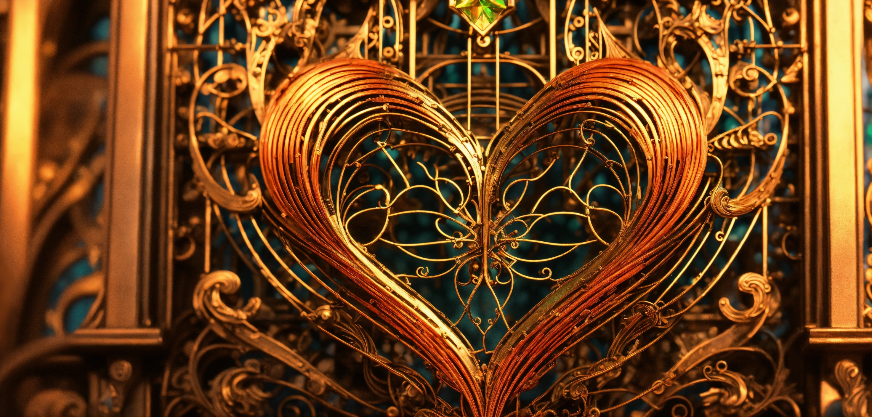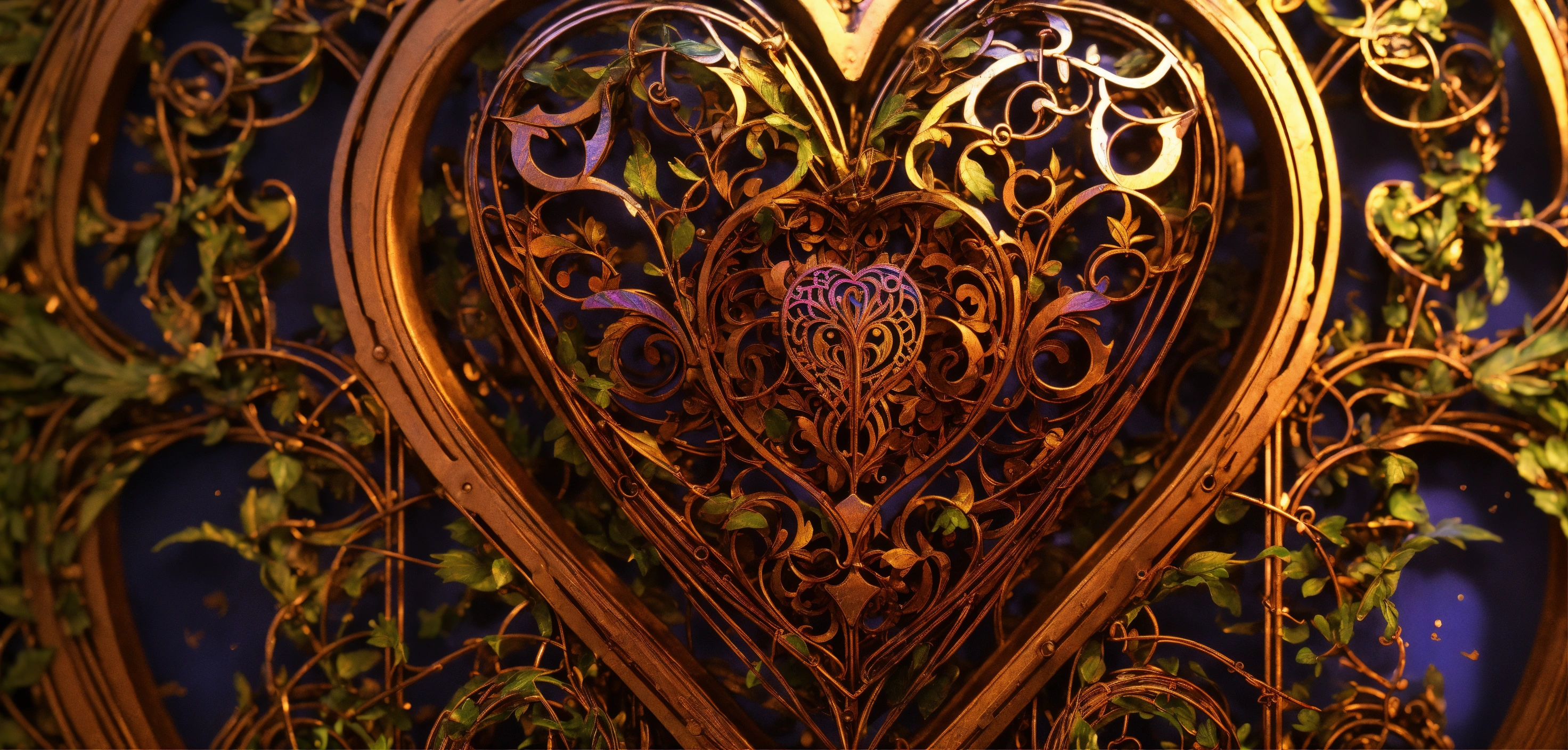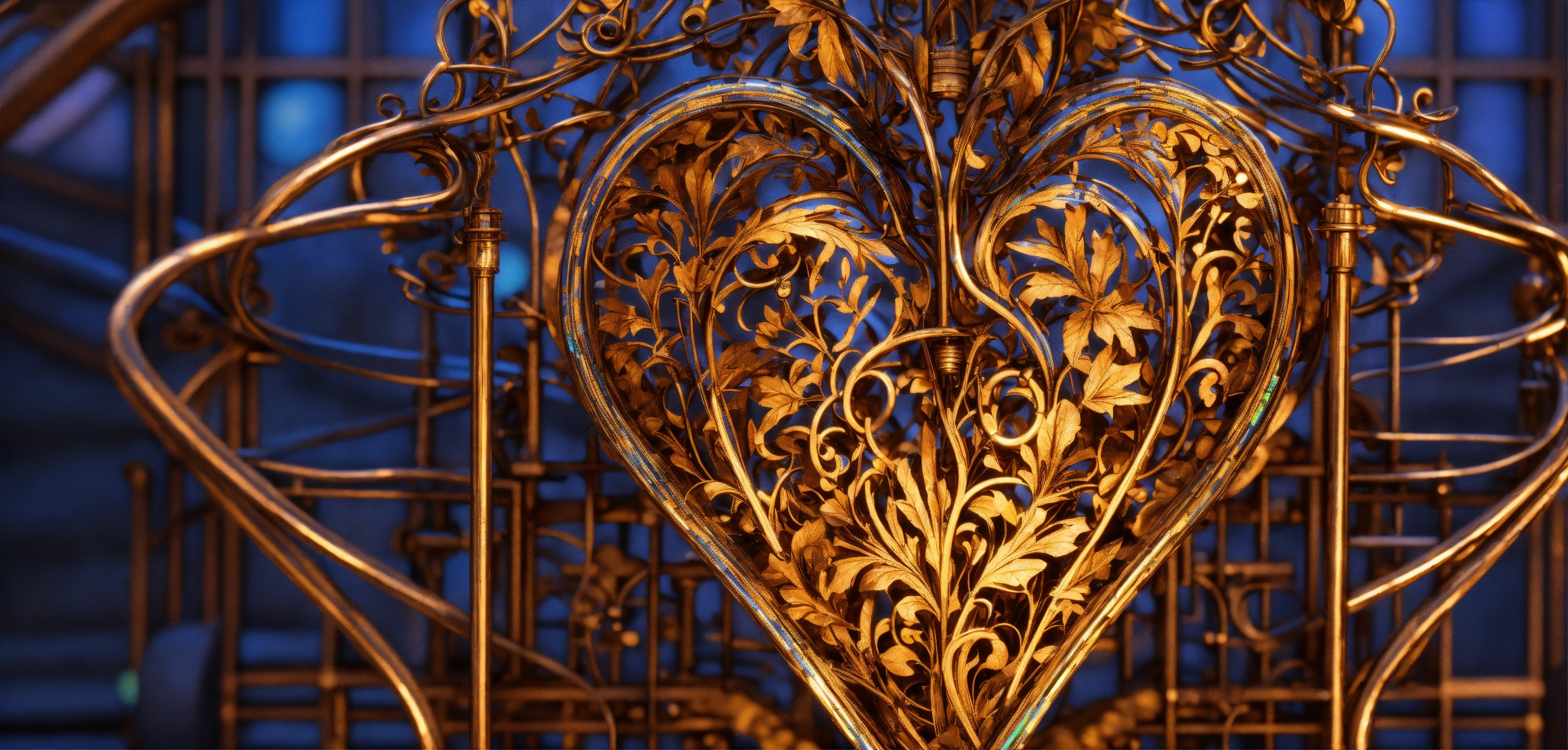 Realistc metal, heart, wire, realist ornamental, realist music symbol, g clef upright by the gates of heaven, grid, steampunk by walter crane and william morris, closeup, twisting leaves, realistc tiny fine realist flowing lines, abstract psychedelic, 8 k, artstation, neon, front