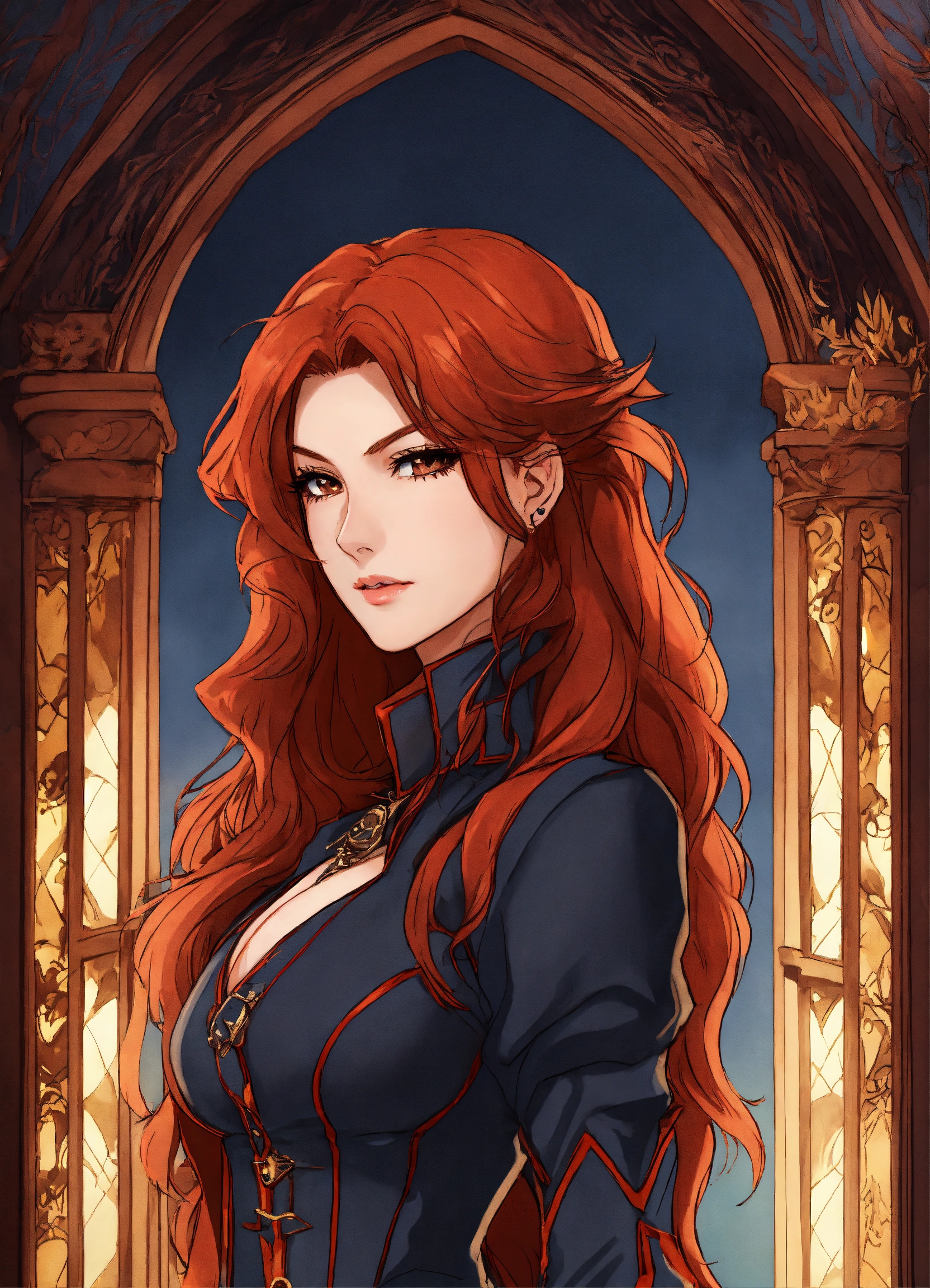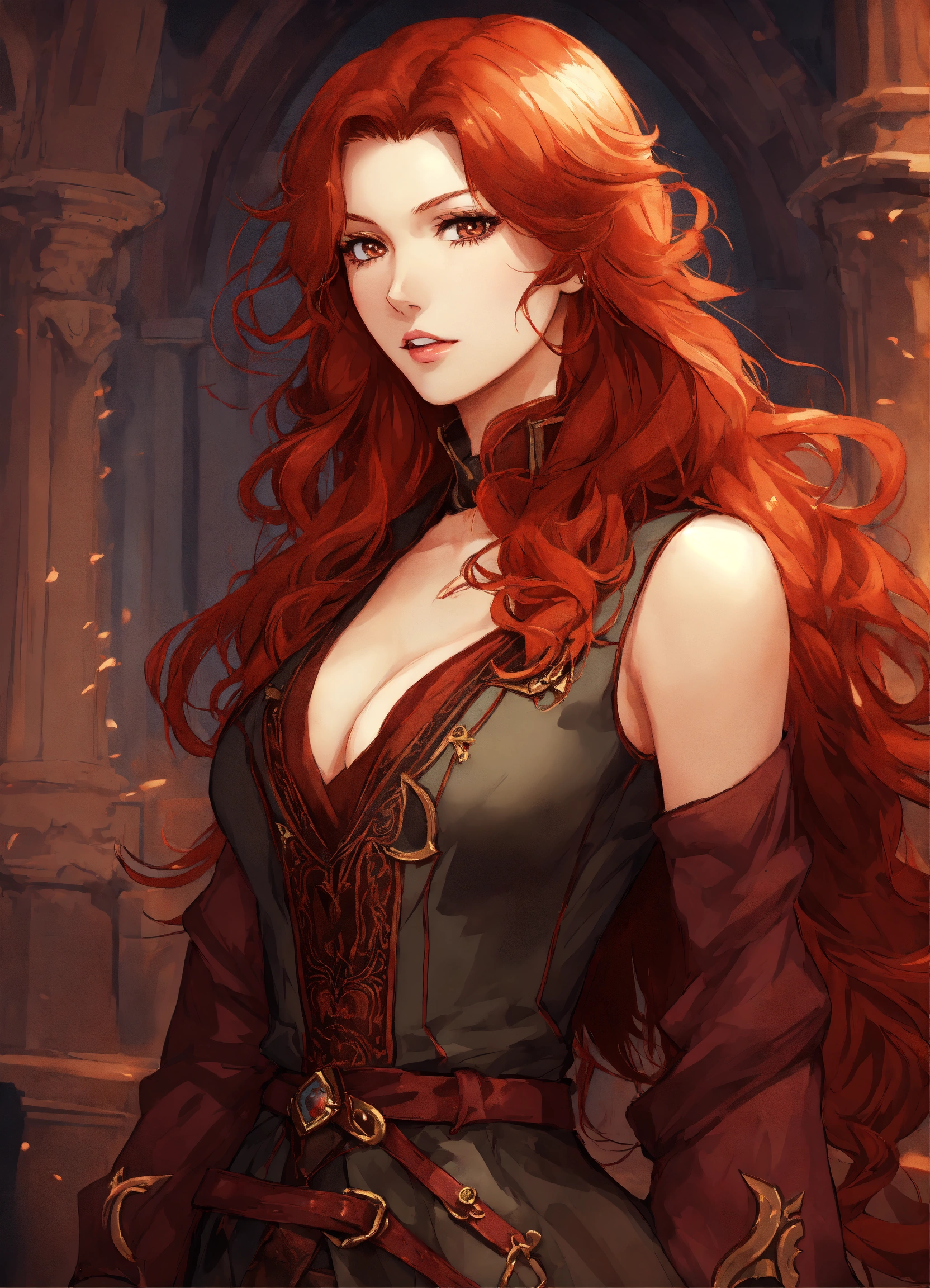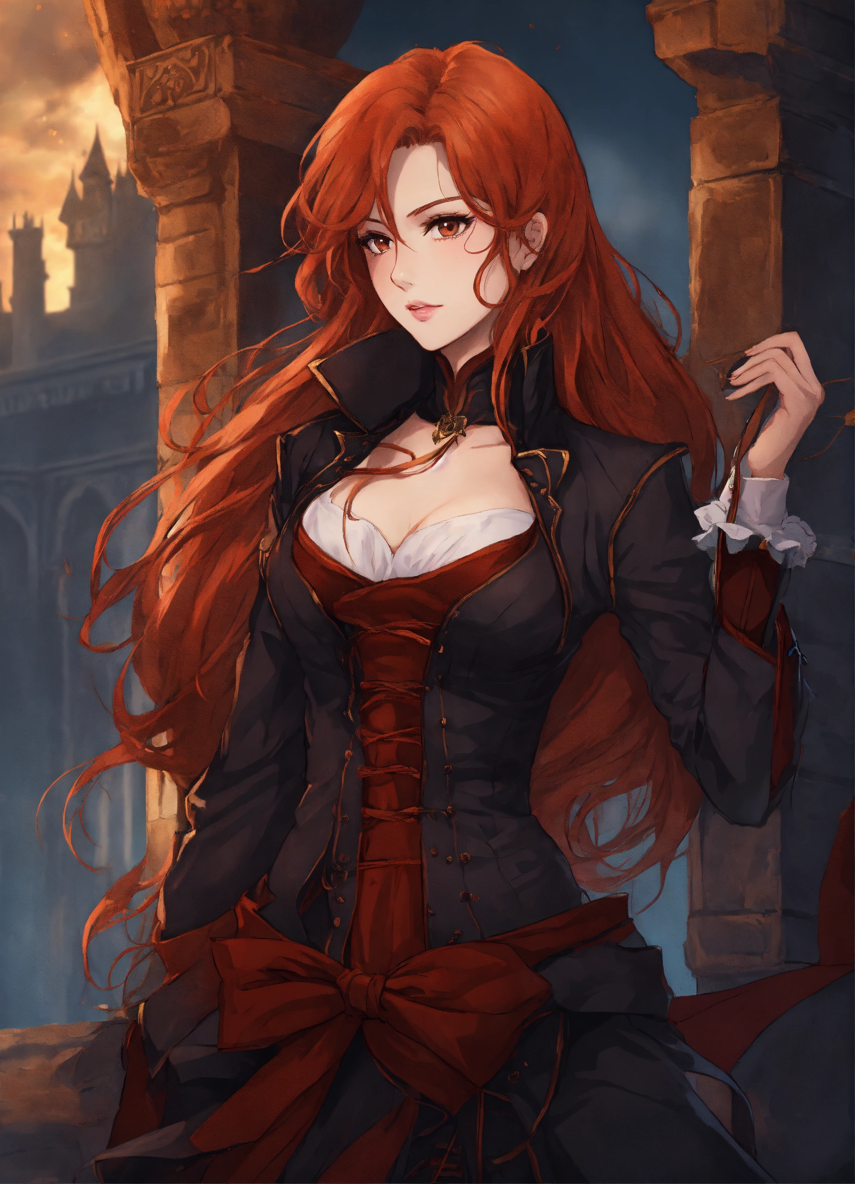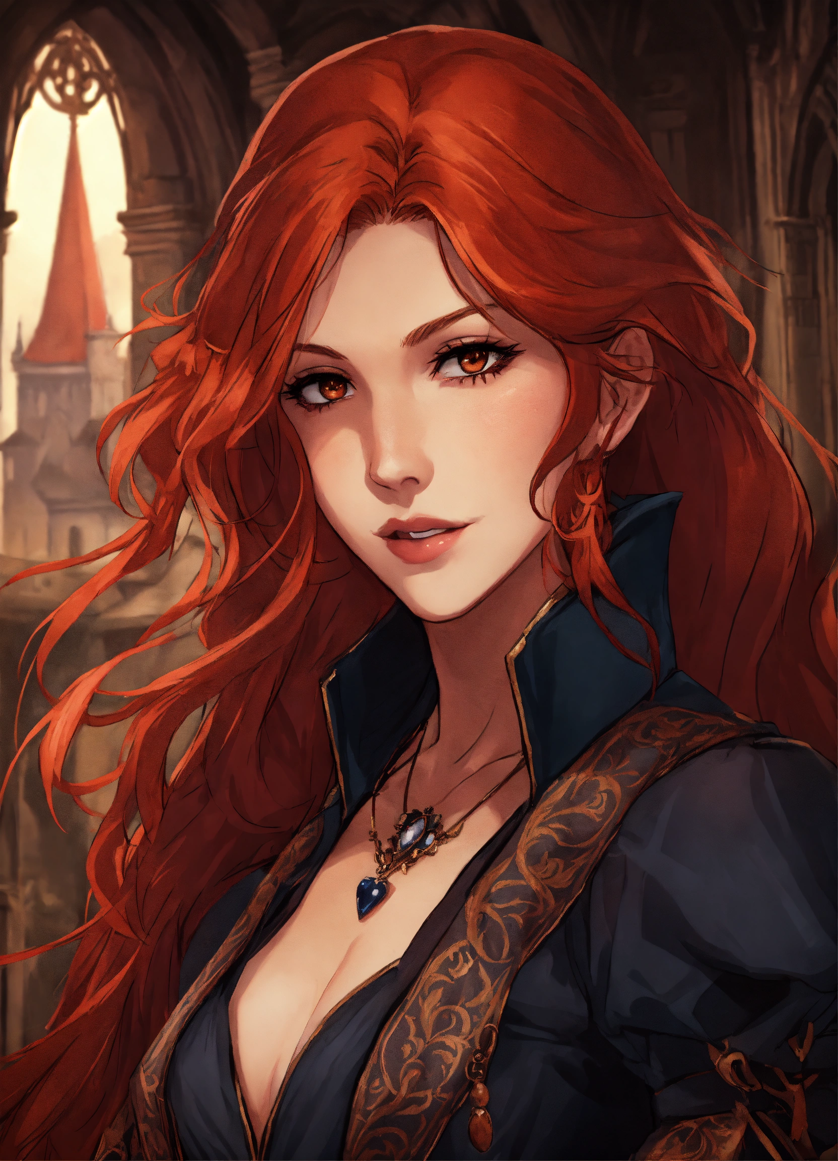 Beautiful redhead woman in the style of anime castlevania, castlevania, anime, brown eyes, manga, detailed, dark clothes, dress