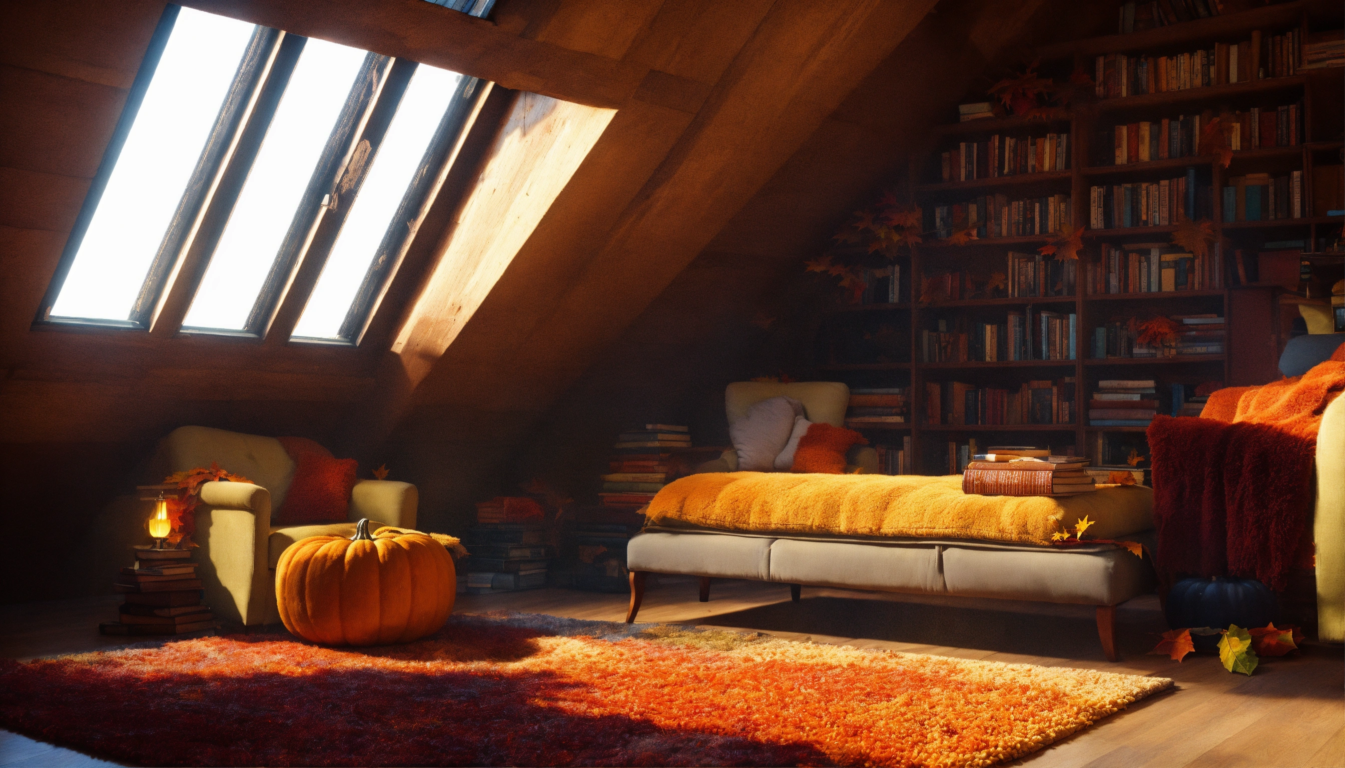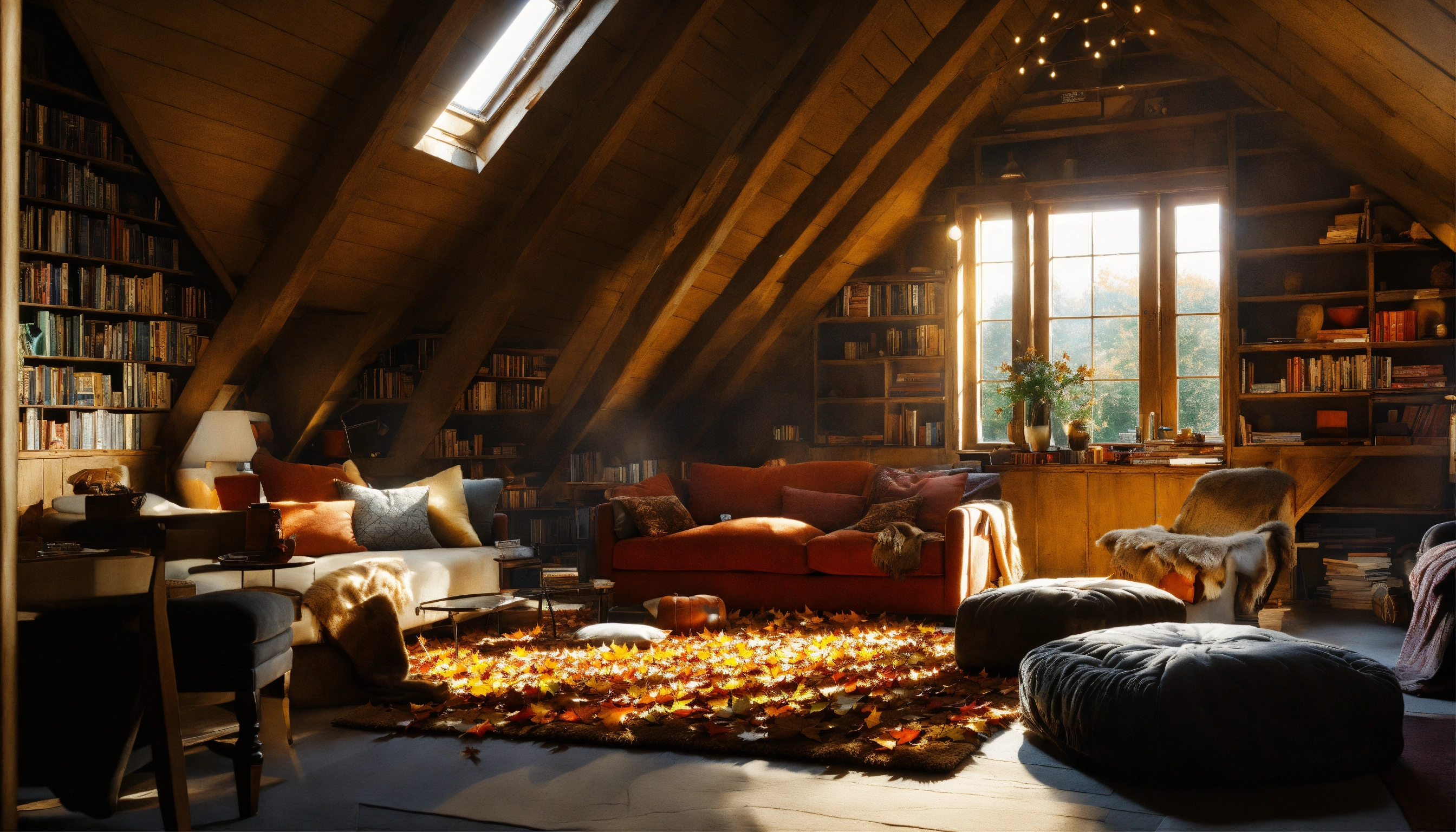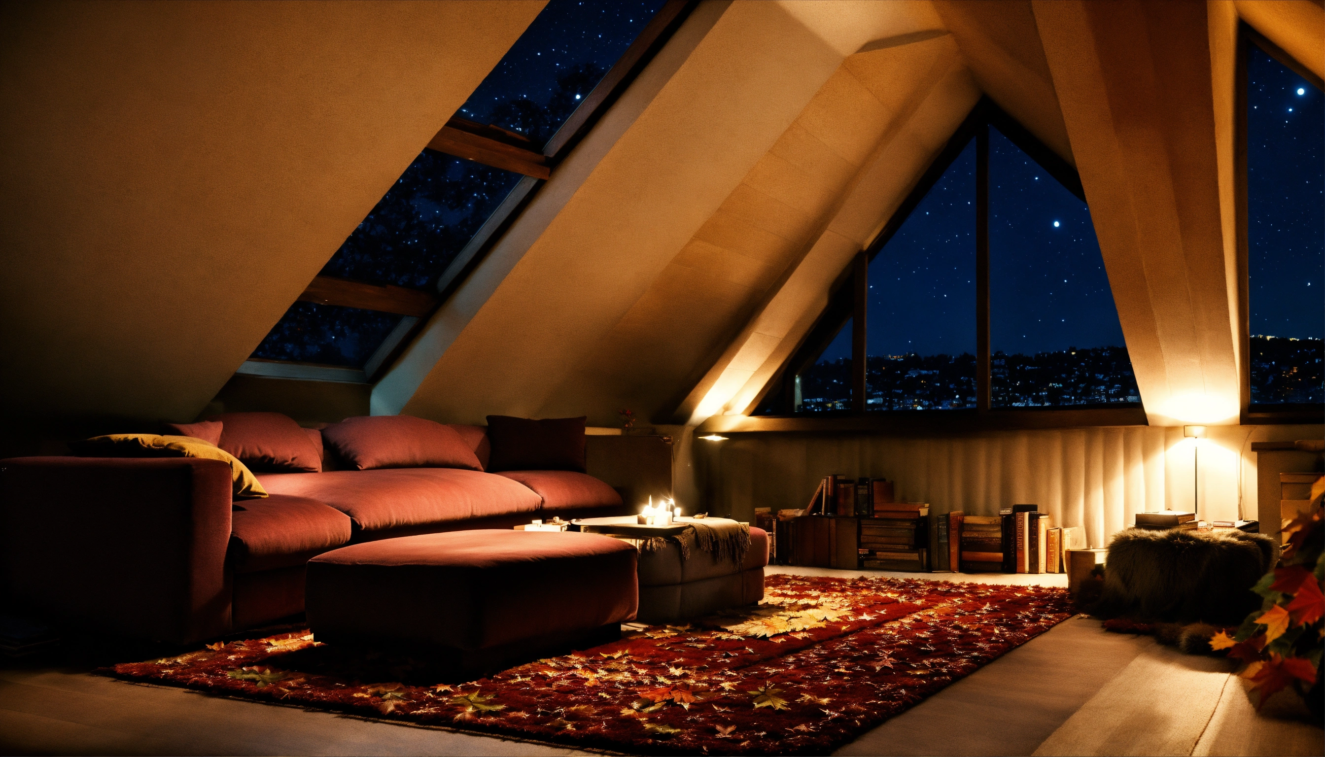 Attic sitting room fall leaves colors dark night ceiling stars fluffy rug books