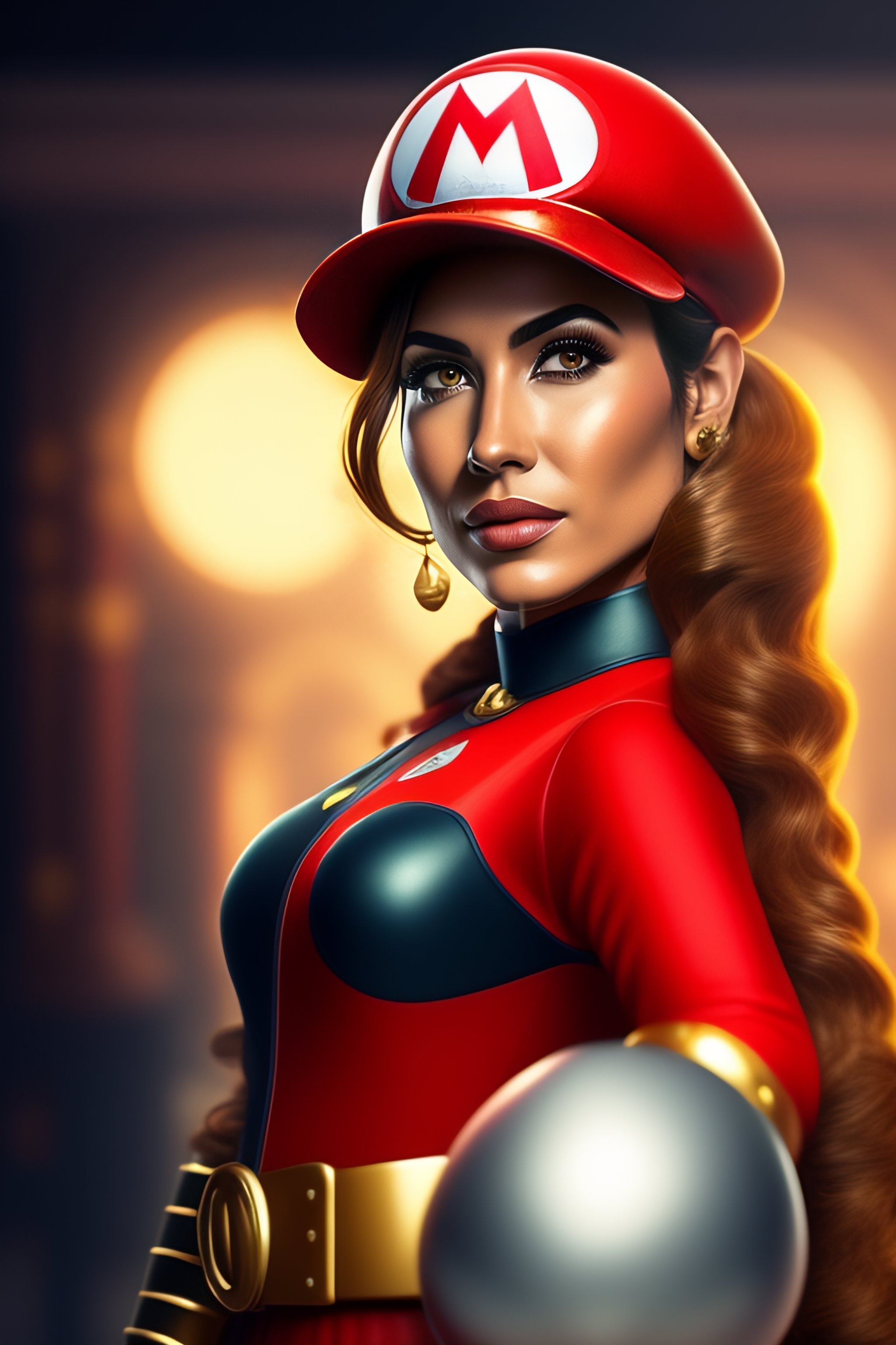 A depiction of mario as a female character, by ahmed hassan, pexels contest winner, updated costume, super mario bros. theme, gender representation, strong expression, realistic style, reinterpretation of a classic character, honoring diversity, positive representation
