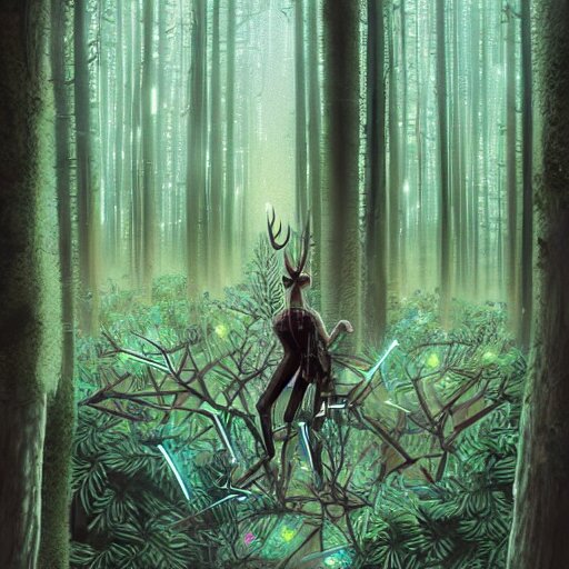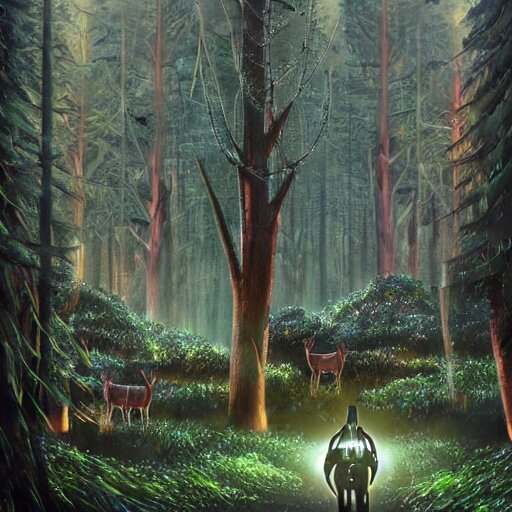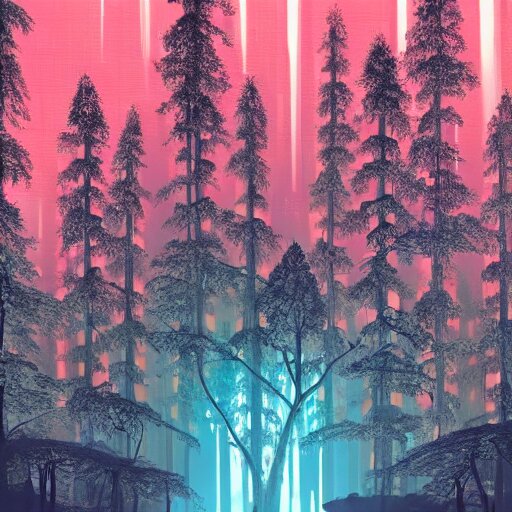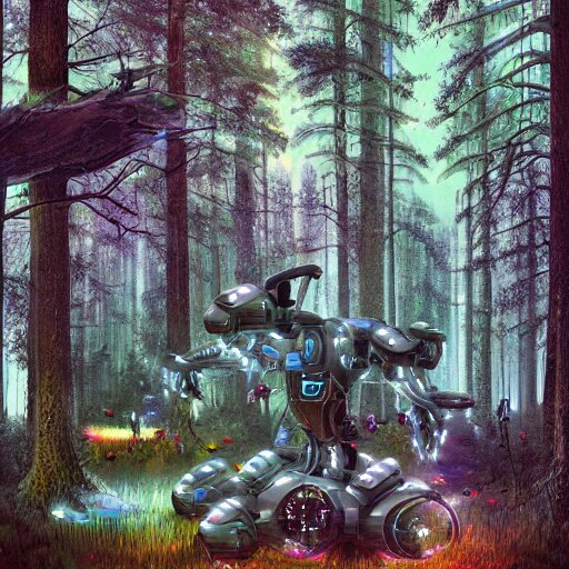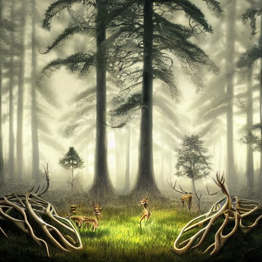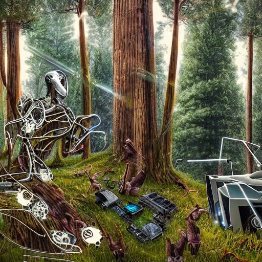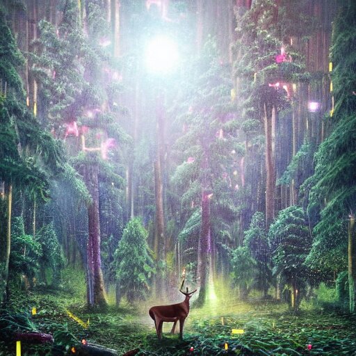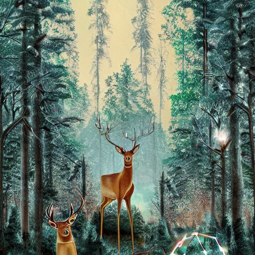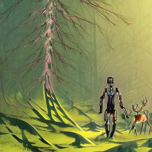 A cybernetic ecology. joined back to nature, all watched over by machines of loving grace. a cybernetic forest filled with pines and electronics where deer stroll peacefully past computers as if they were flowers with spinning blossom oil on canvas, masterpiece, trending on artstation, featured on pixiv, cinematic composition, dramatic pose, beautiful lighting, sharp, details, hyper-detailed, hd, hdr, 4k, 8k