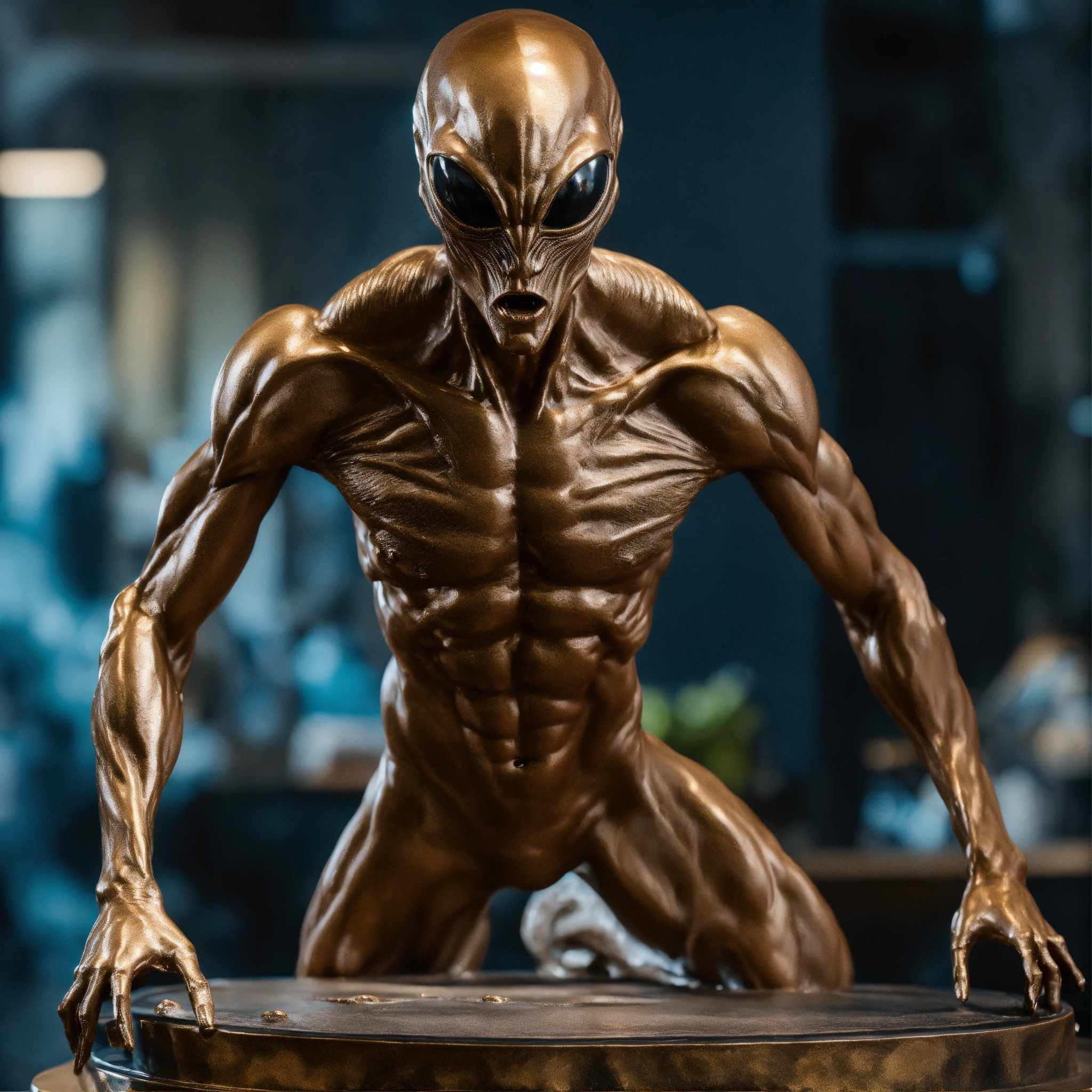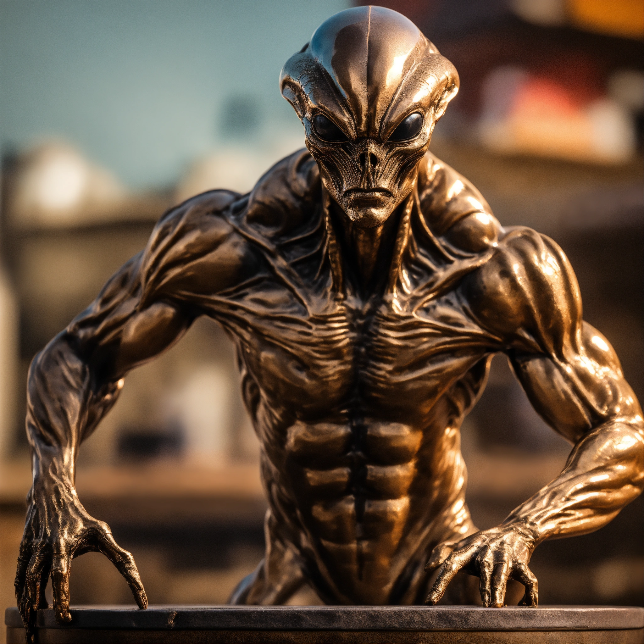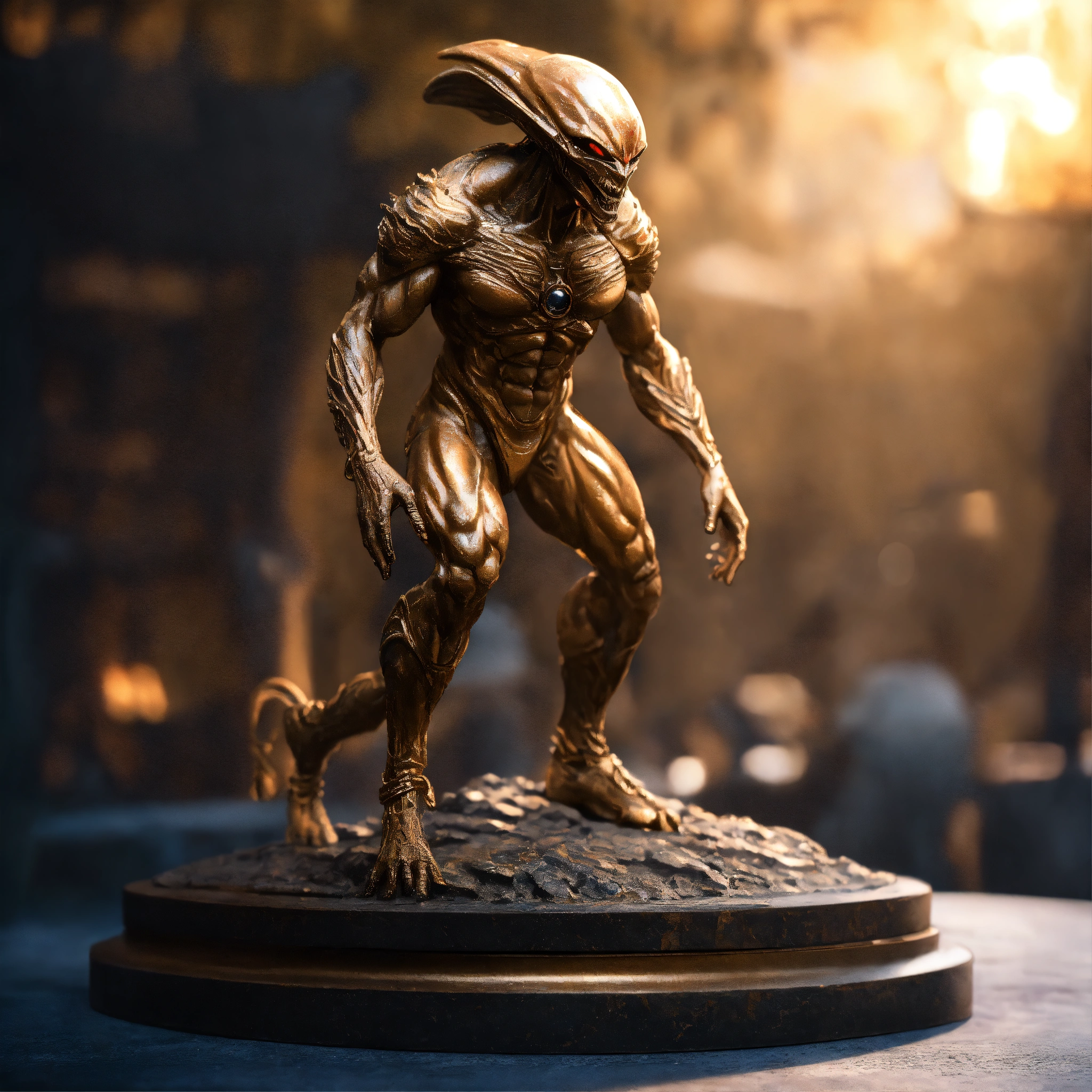 Full body sculpture of an alien, male, muscular, scary, powerful, strong, in bronze type resin on top of a base in realistic high definition 8k photography type
