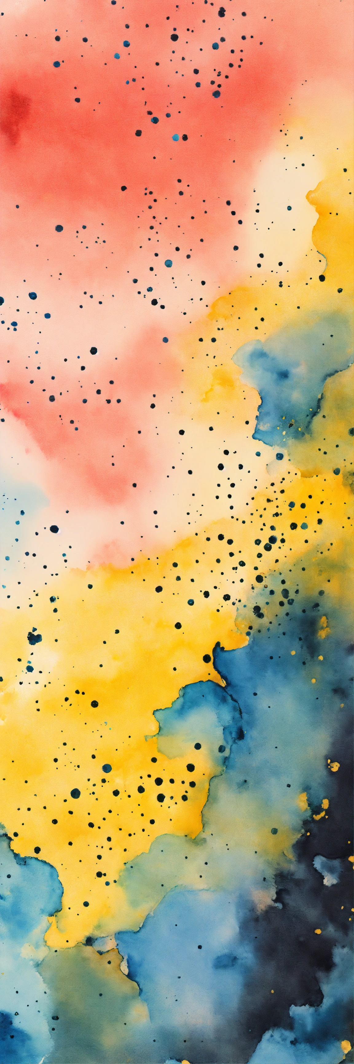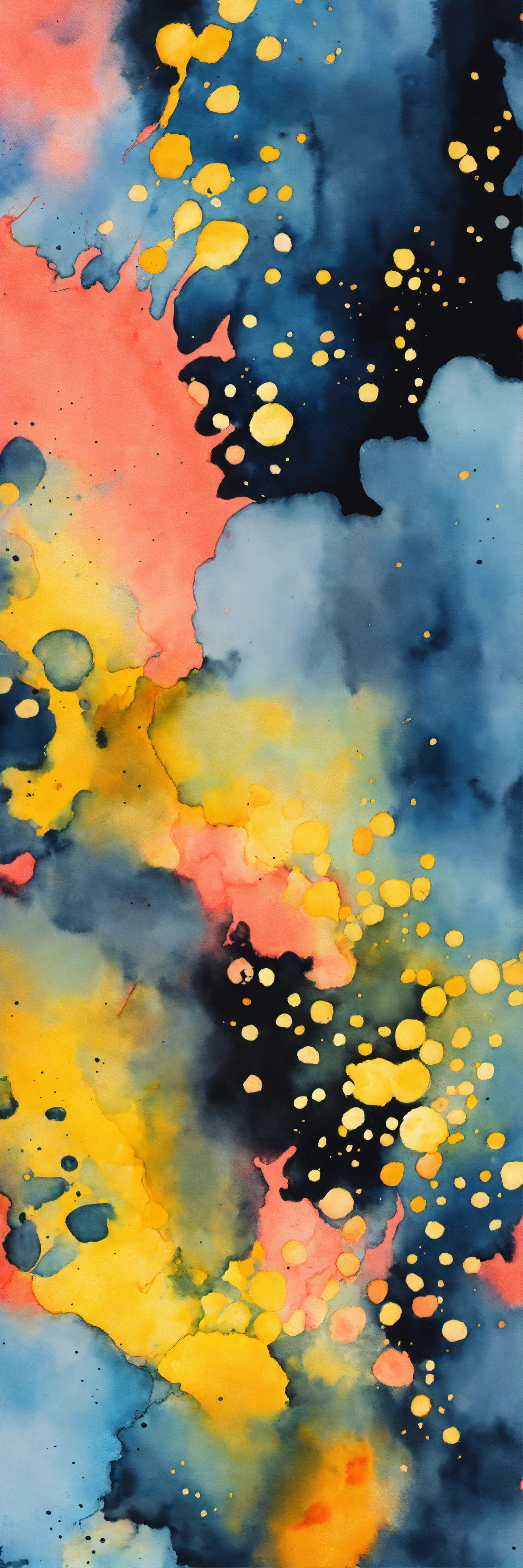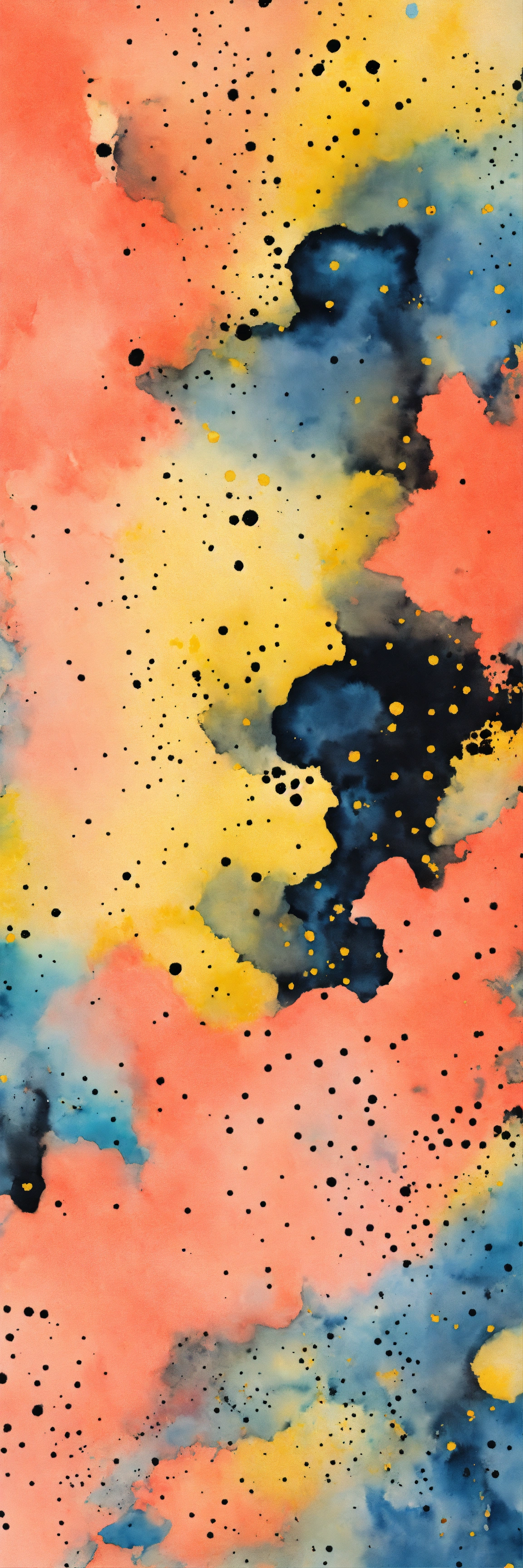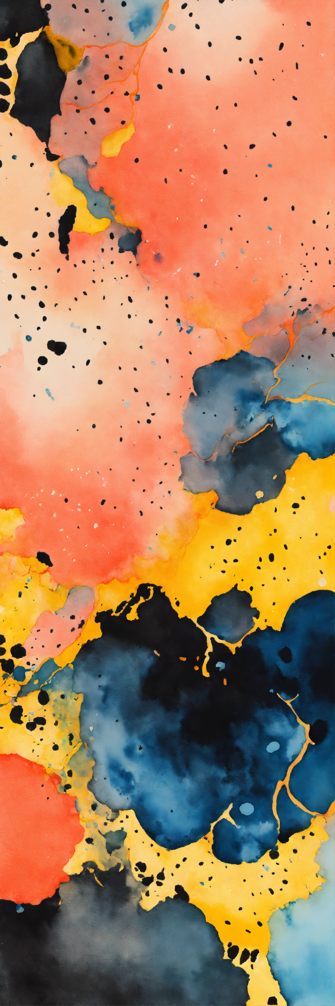 Abstract coral and yellow and blue watercolor splatters with contour black