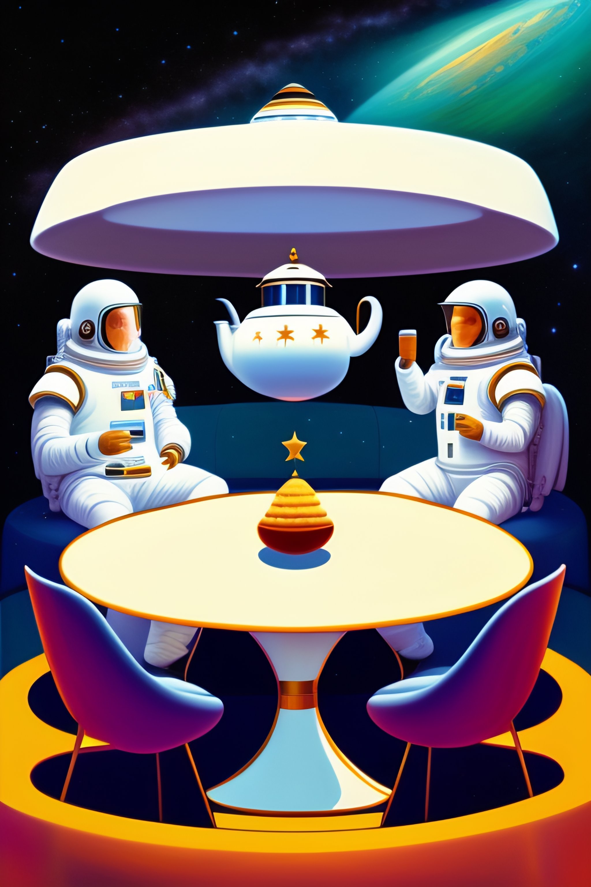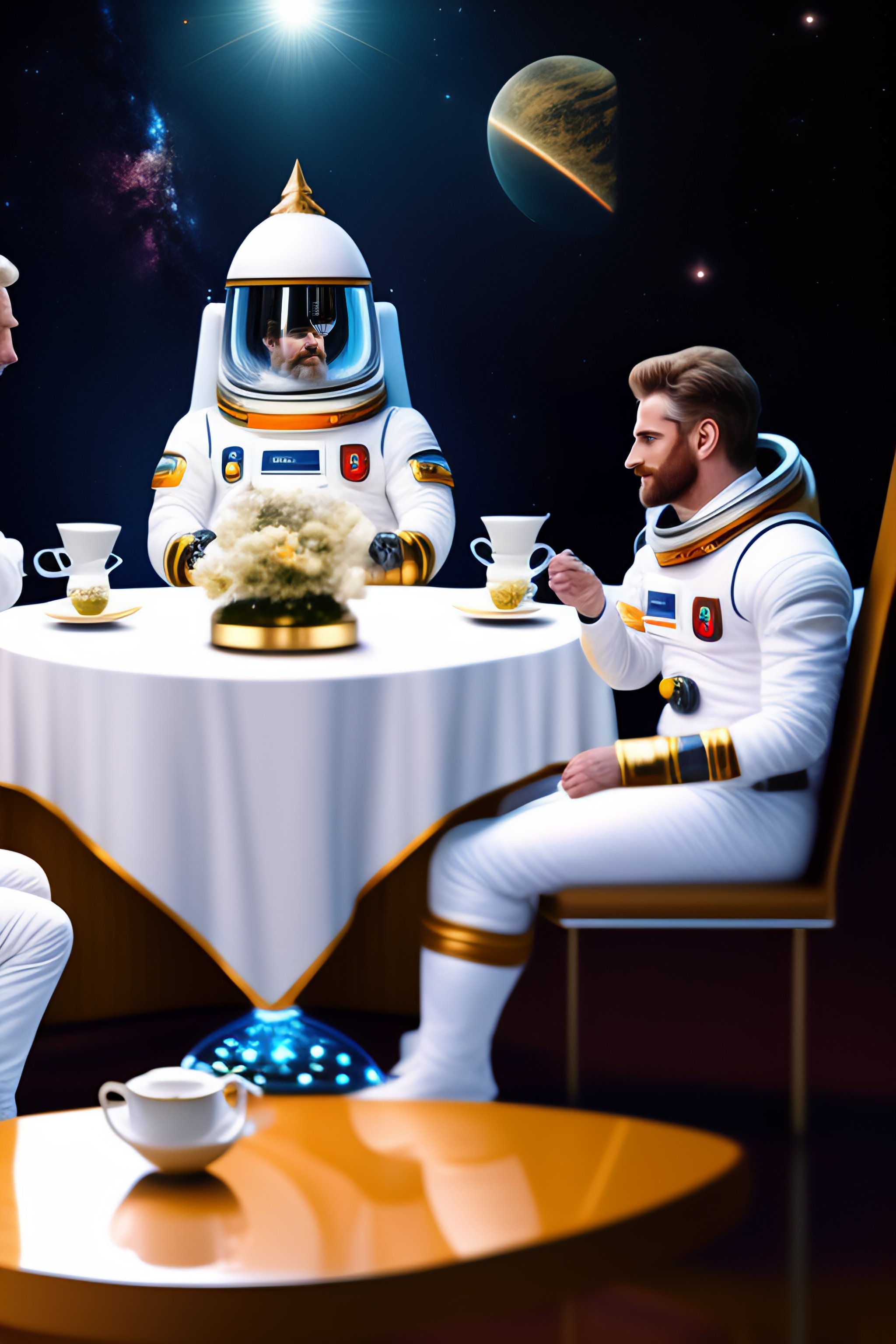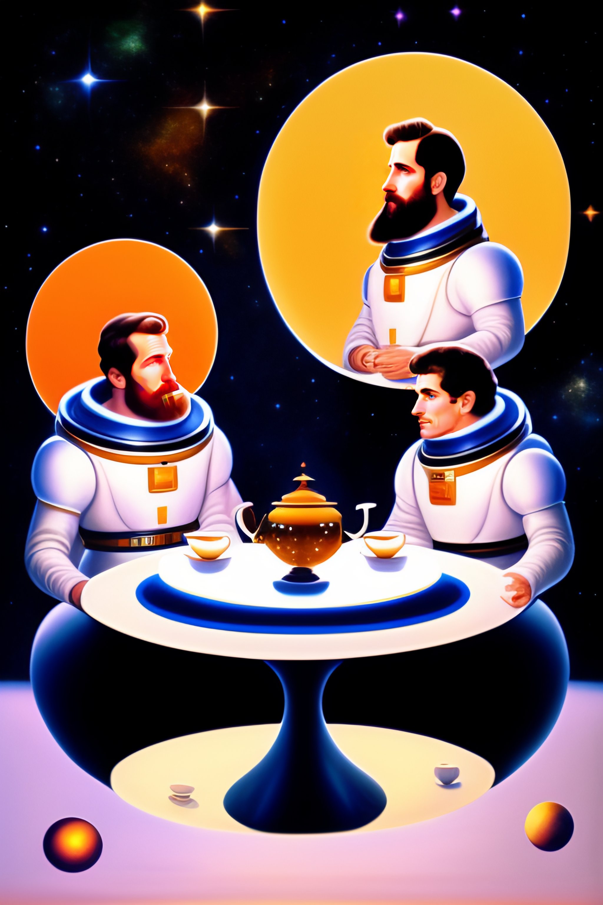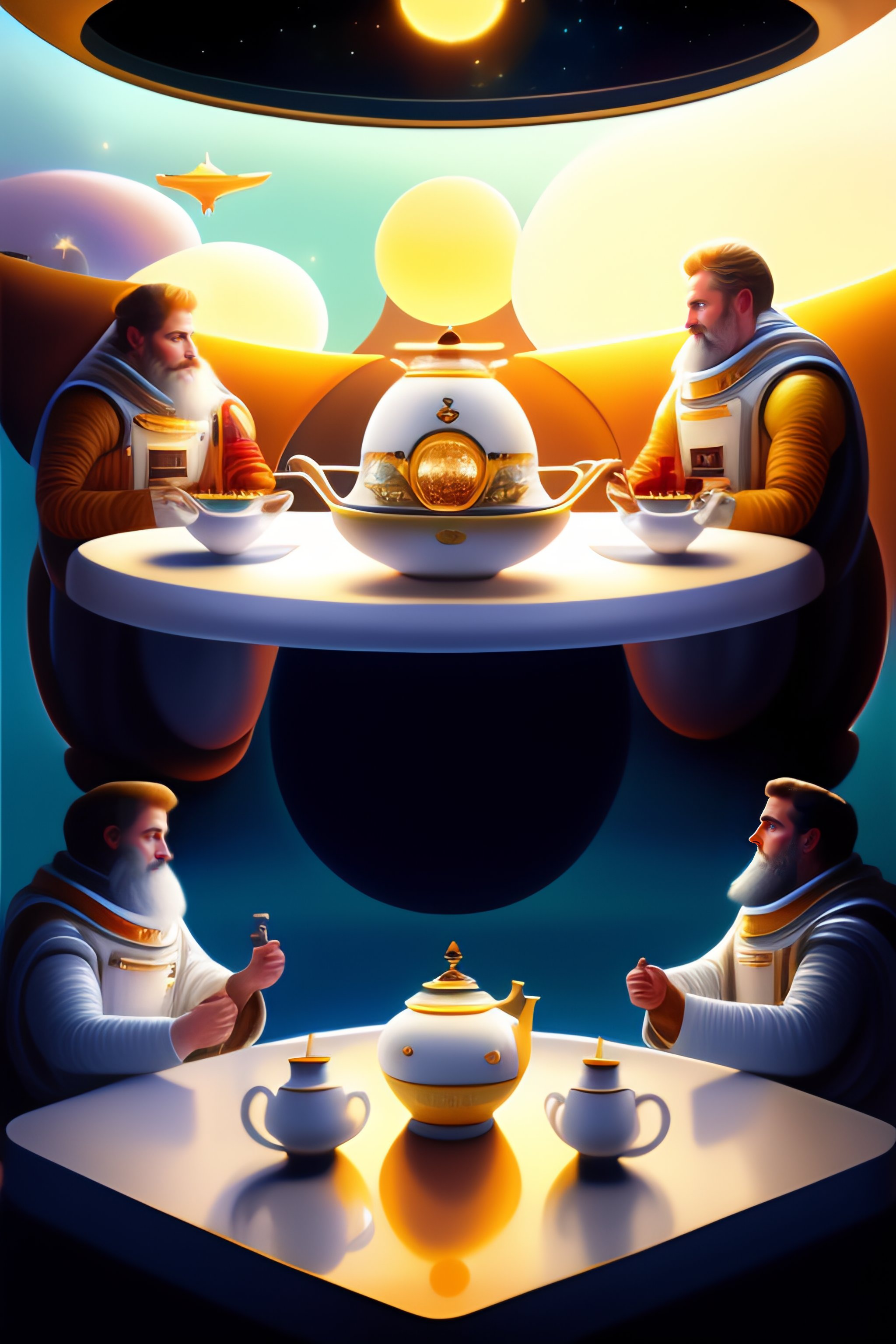Three white men are drinking tea in a space shuttle. one of them is the god with a long white beard. two others are astronaunts having space suits on but without helmets. illuminators, stars. a big futuristic kettle and a vase full of jem are in the middle of the table which they are sitting at.
