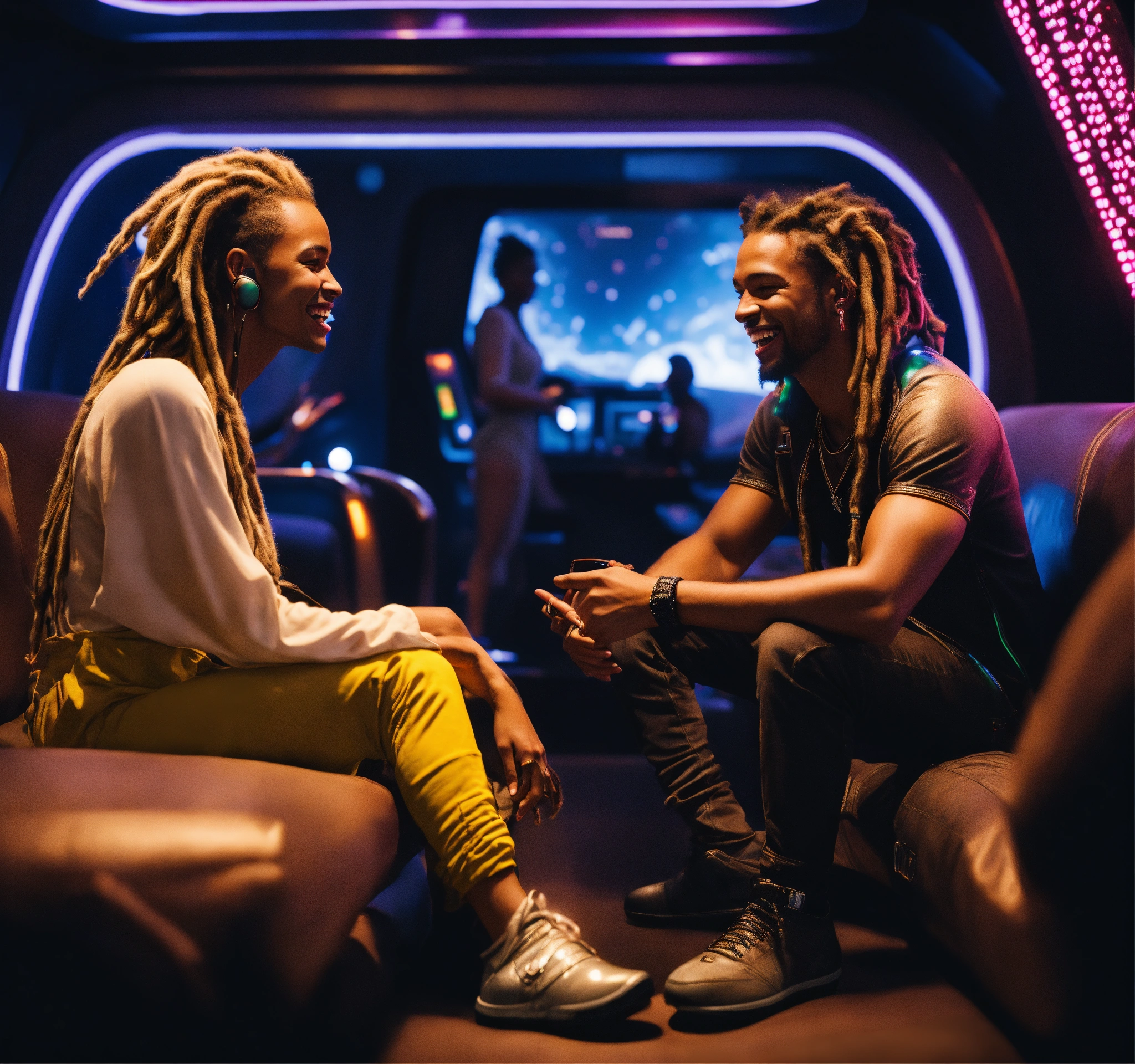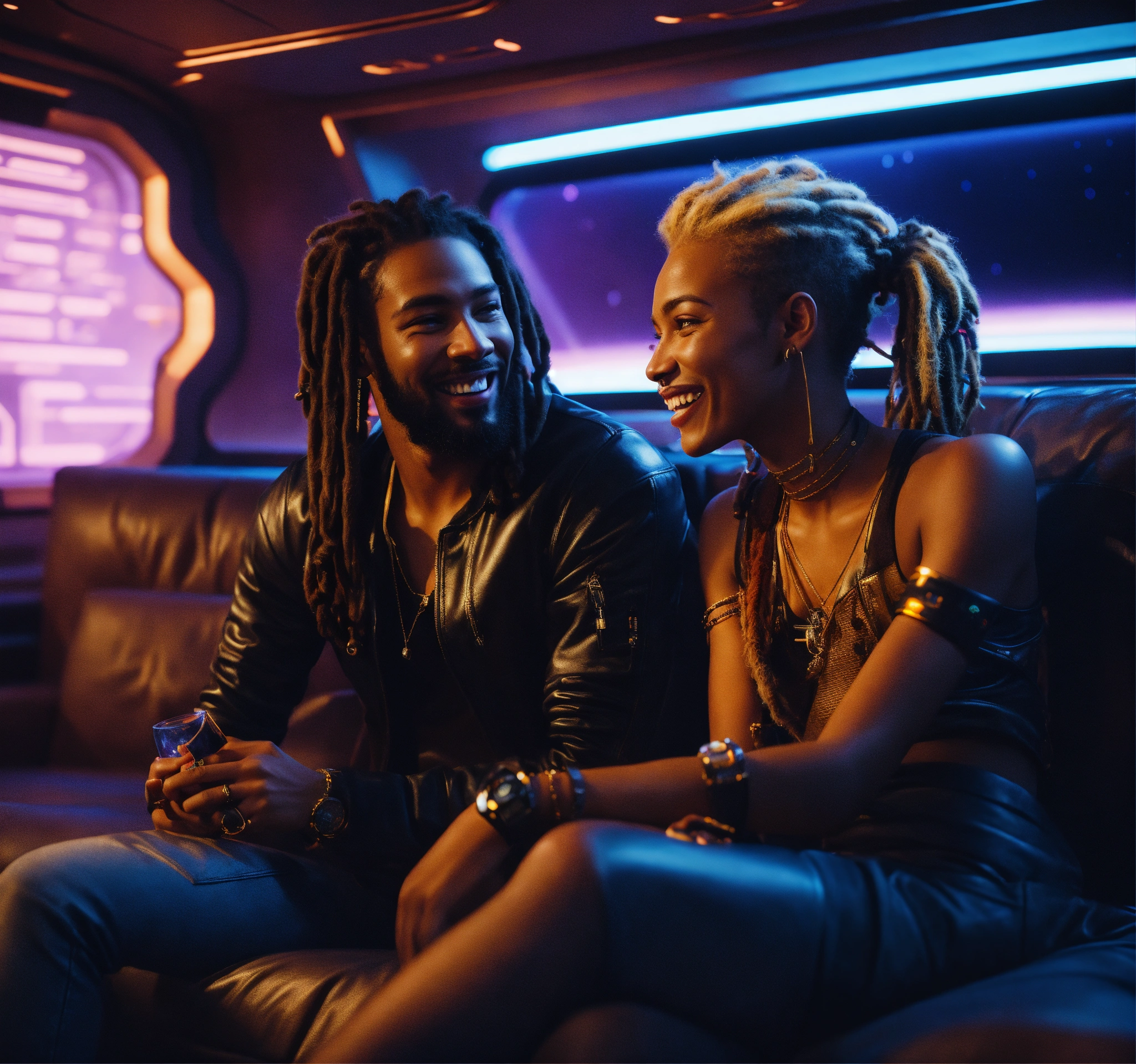 Scruffy caucasian blonde dreadlock male rockstar talking to beautiful black girl, laughing in the dark lounge on a luxurious hi tech space space yacht, realistic, futuristic, sci-fi, 8k, unreal engine