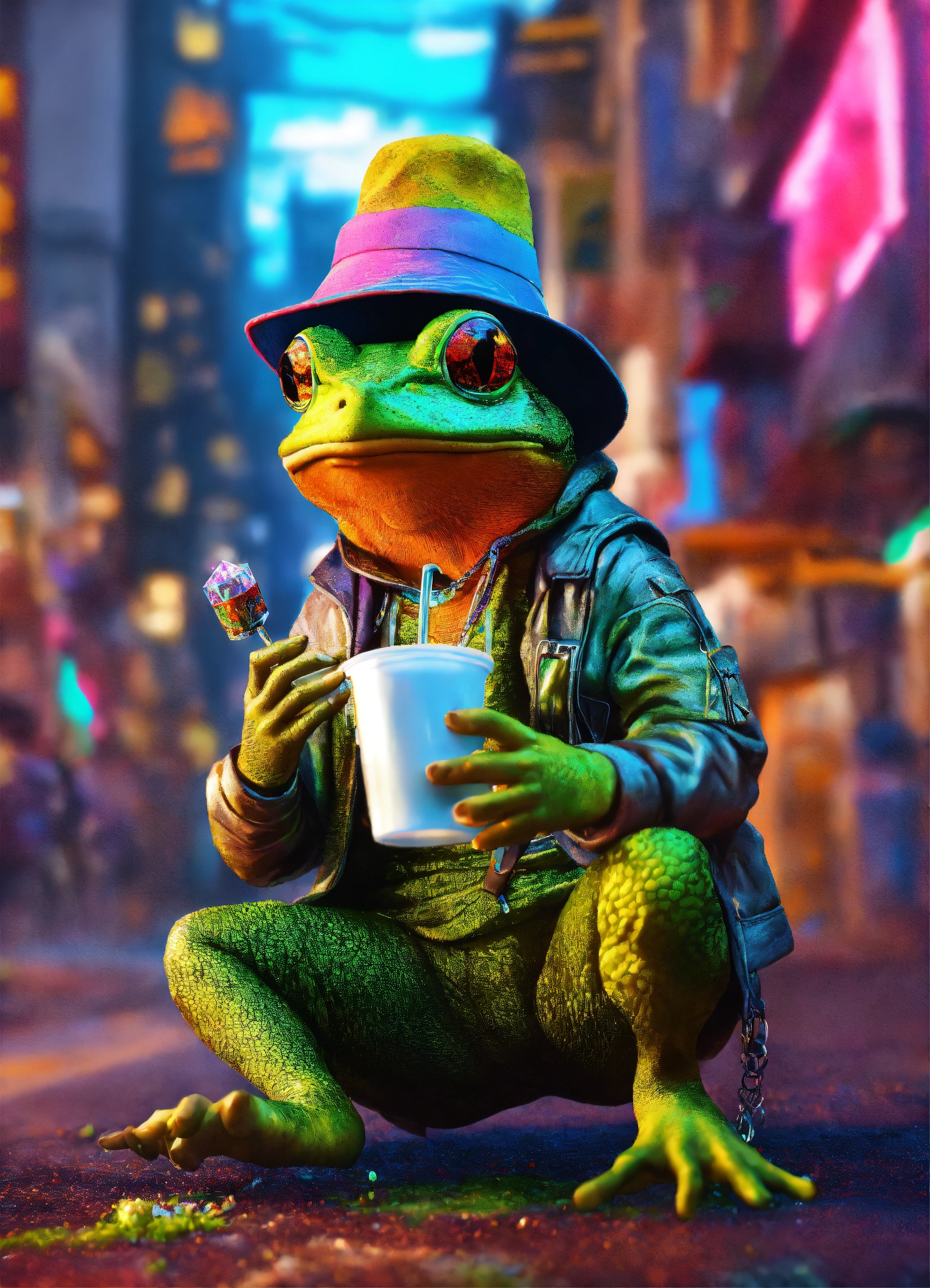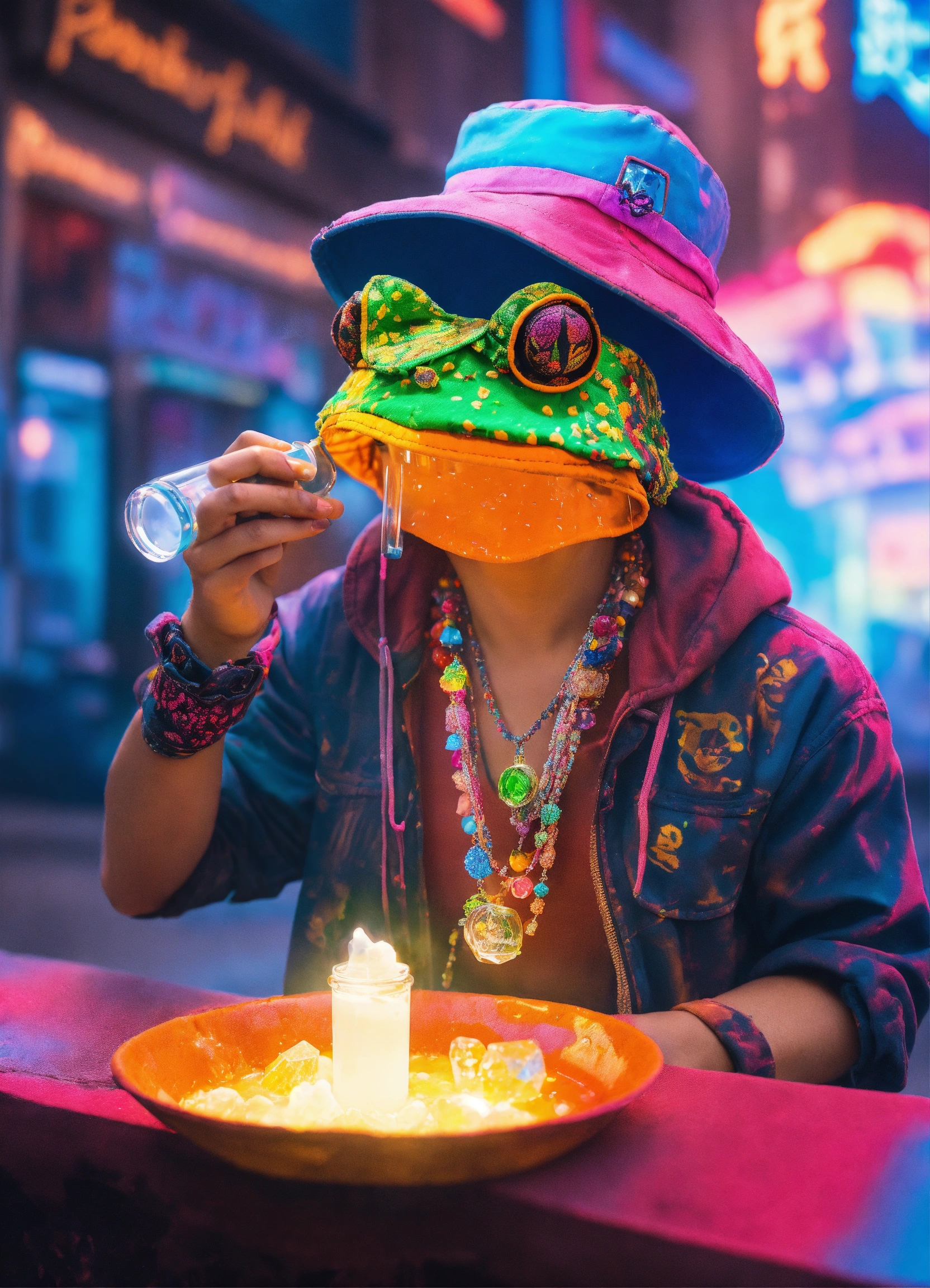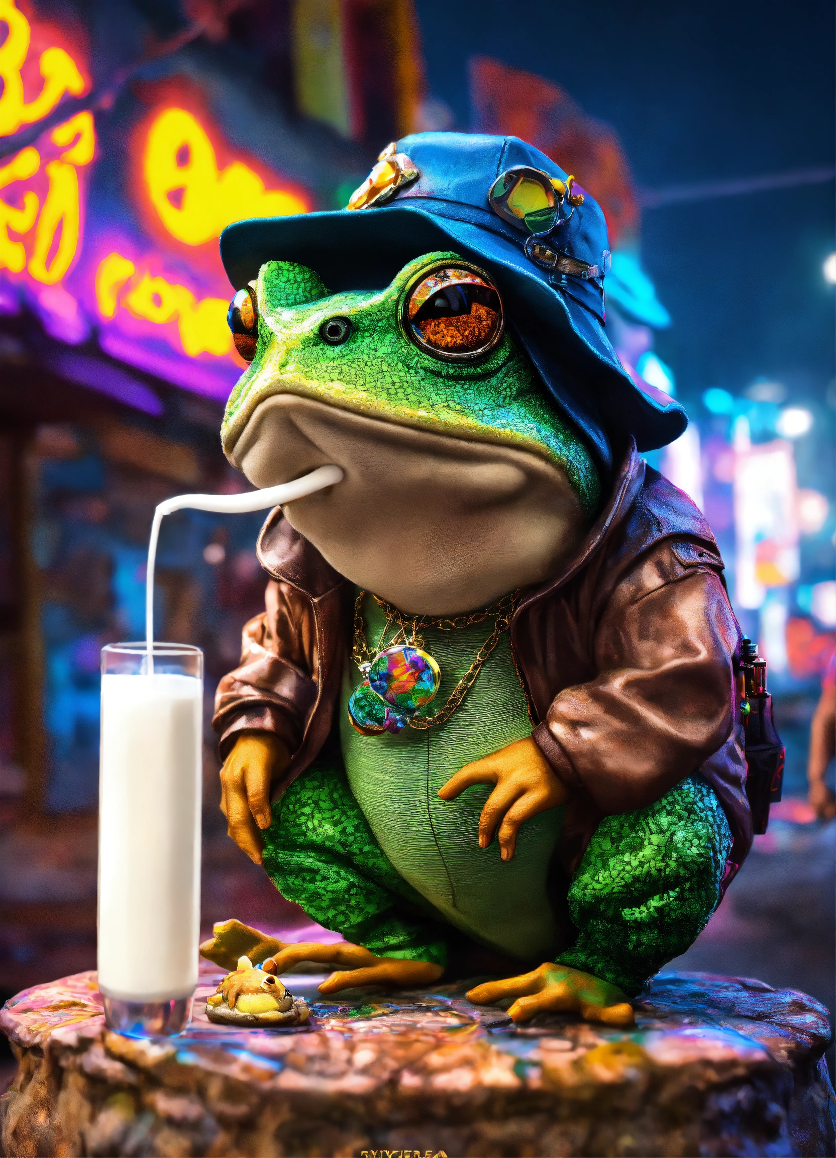 A toad drinking milk slice of life anime, cyberpunk colorado festival raver toad, crystal hemp necklace, bucket hat, of a person in urban street wear, psychedelic dmt clothing, vaping crystals photorealistic, volumetric lighting, 8k, highly detailed
