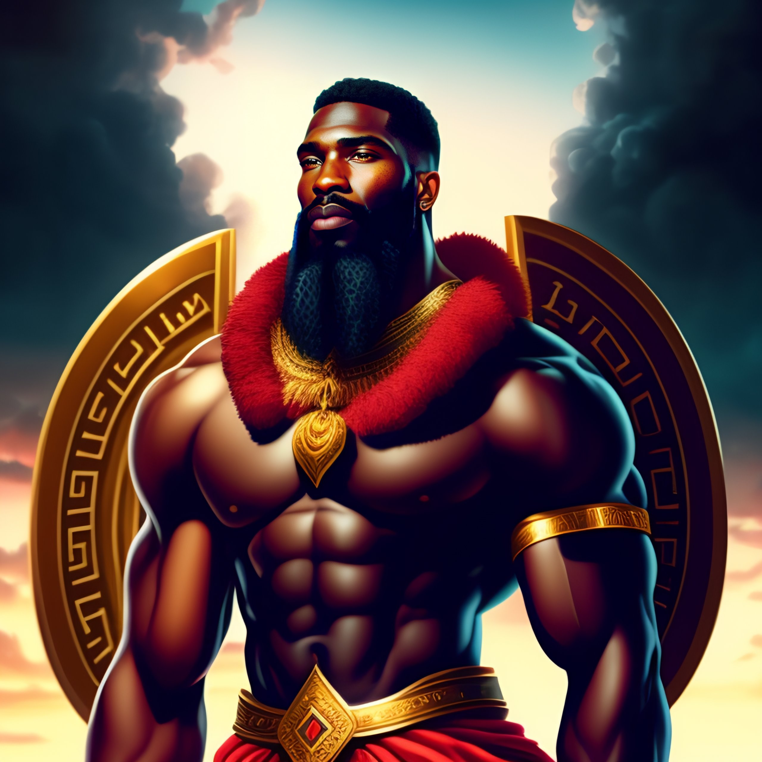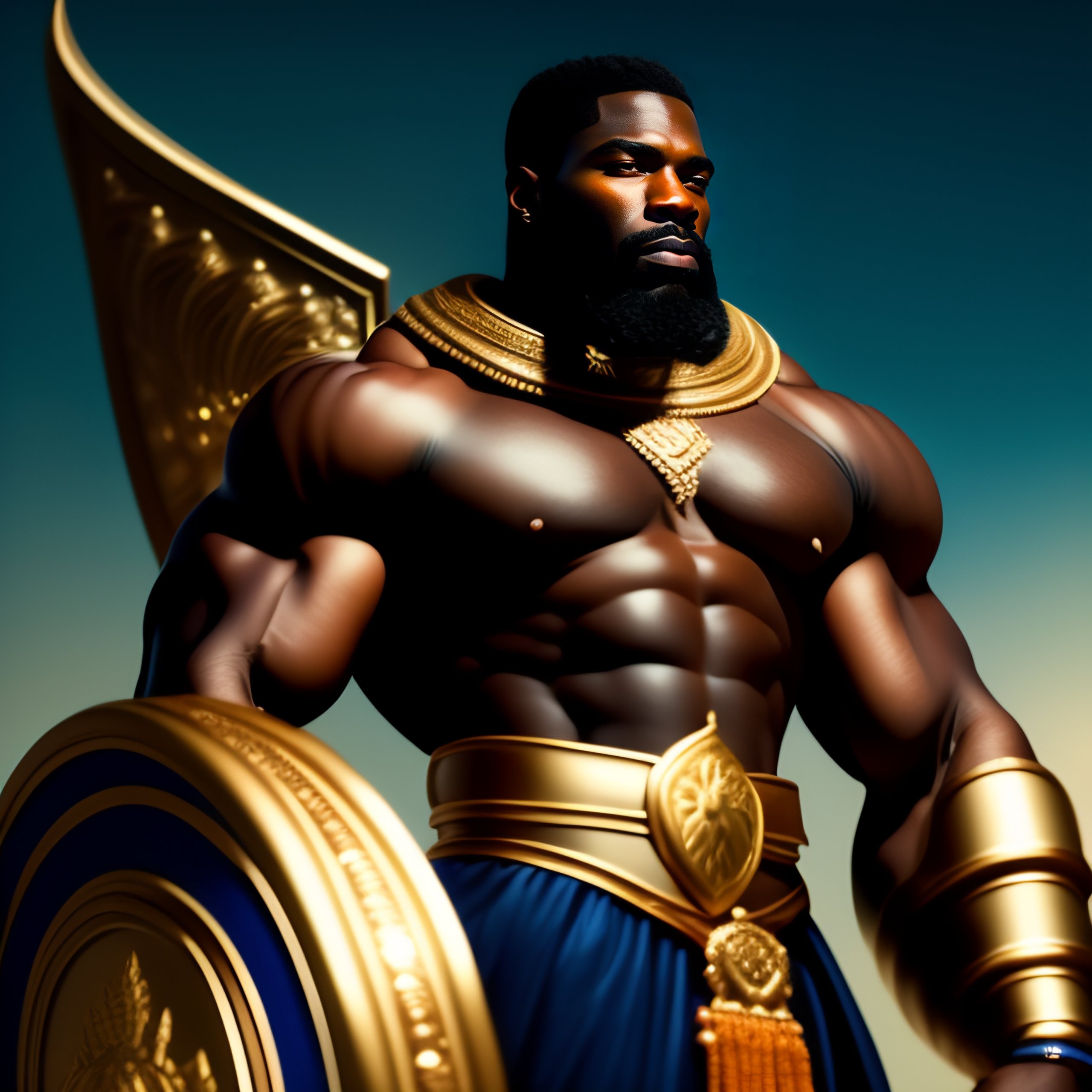 Muscular bearded african american men, on mount olympus, greek mythology style, with shields, with swords