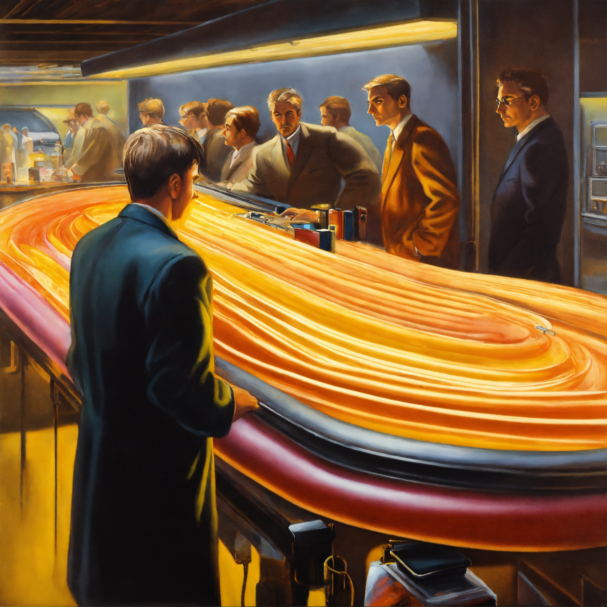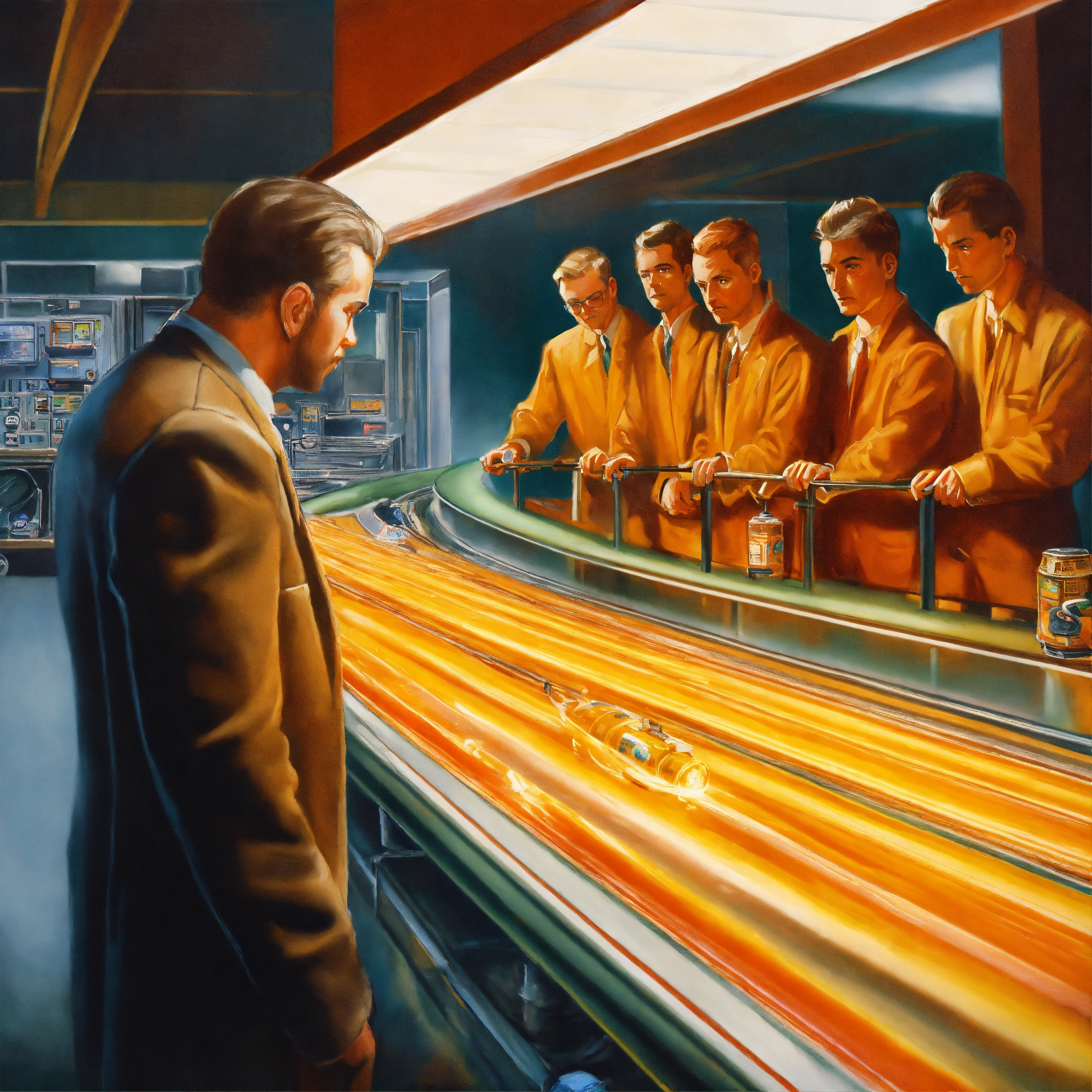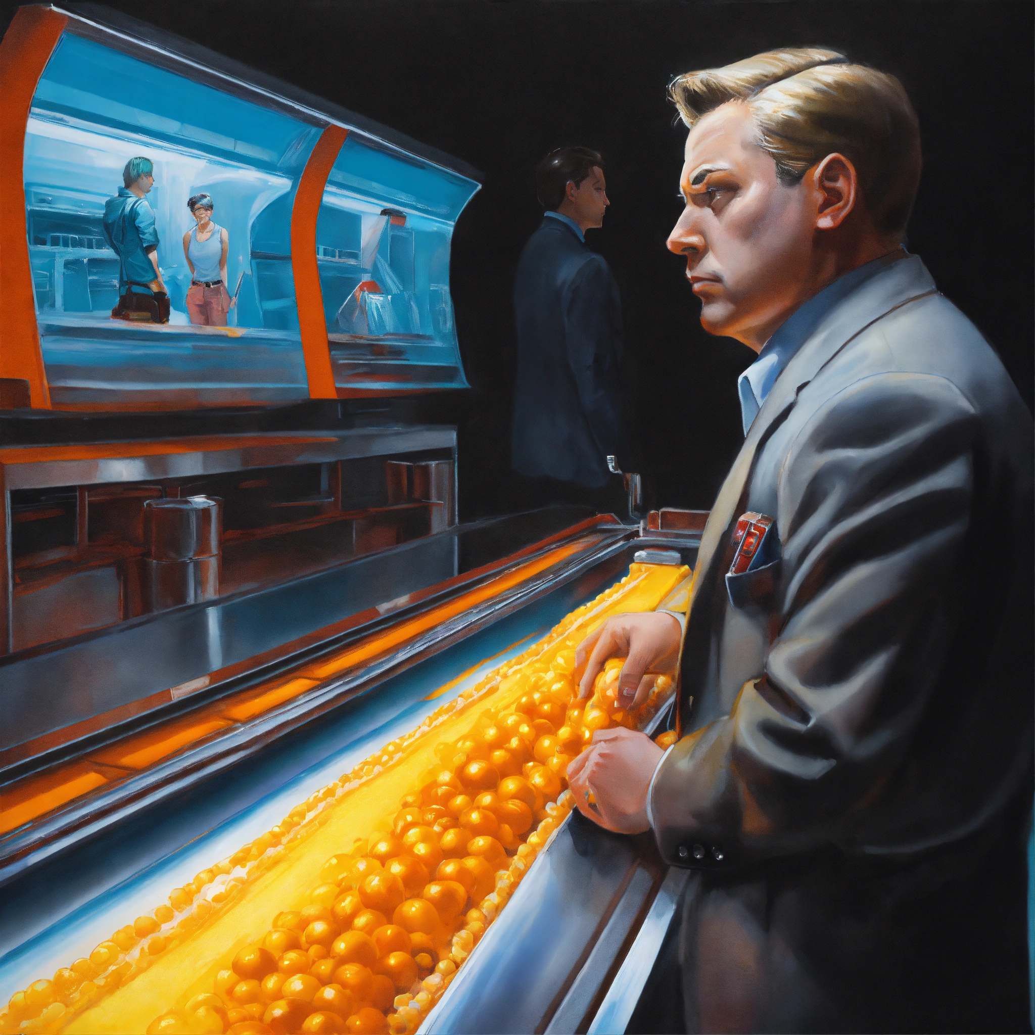 The controller-men watching conveyor belt, he looks at the product very attentively, there is a glowing product on the belt, painted by francis bacon, surrealism, airbrush, stanley artgerm, very coherent, analog