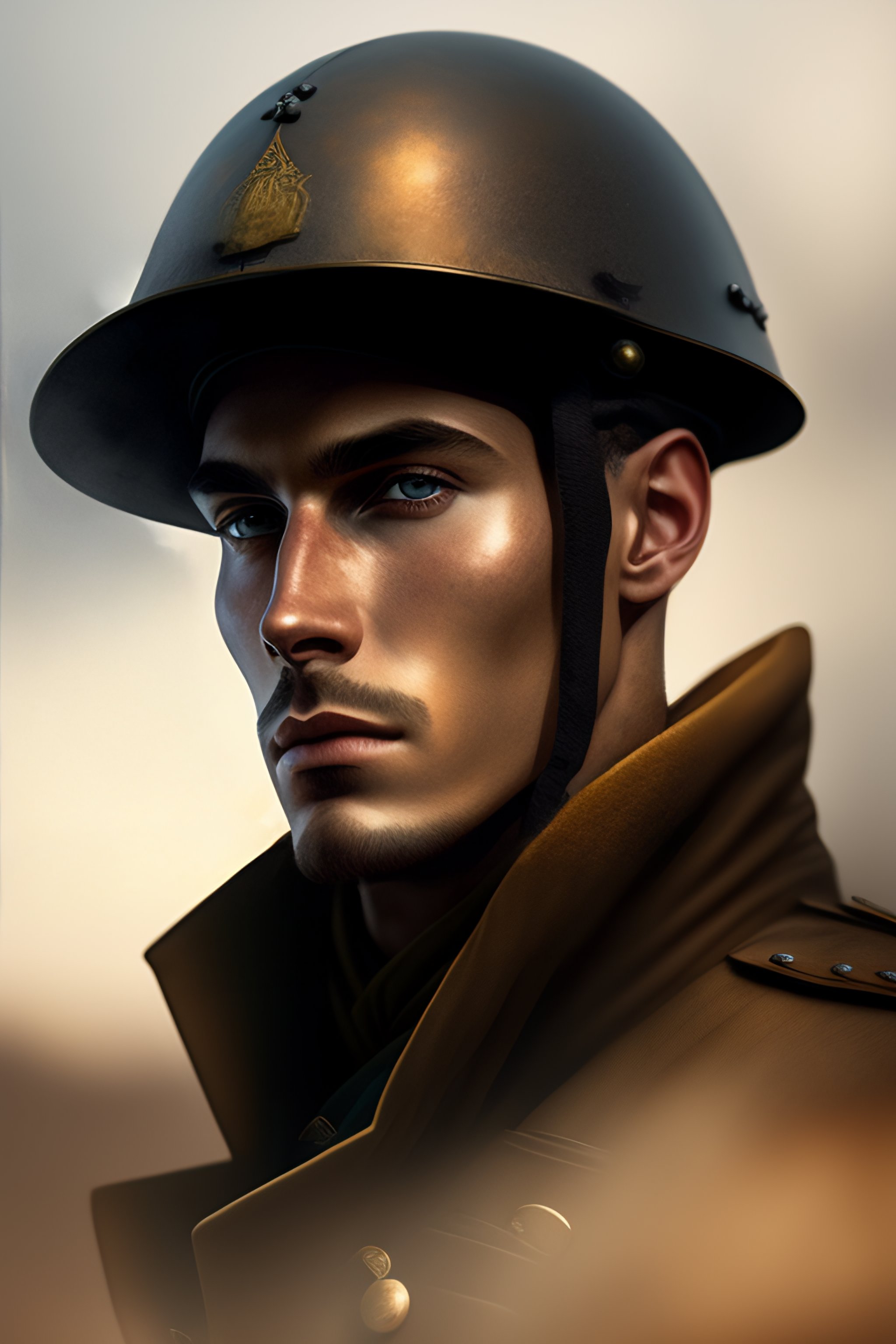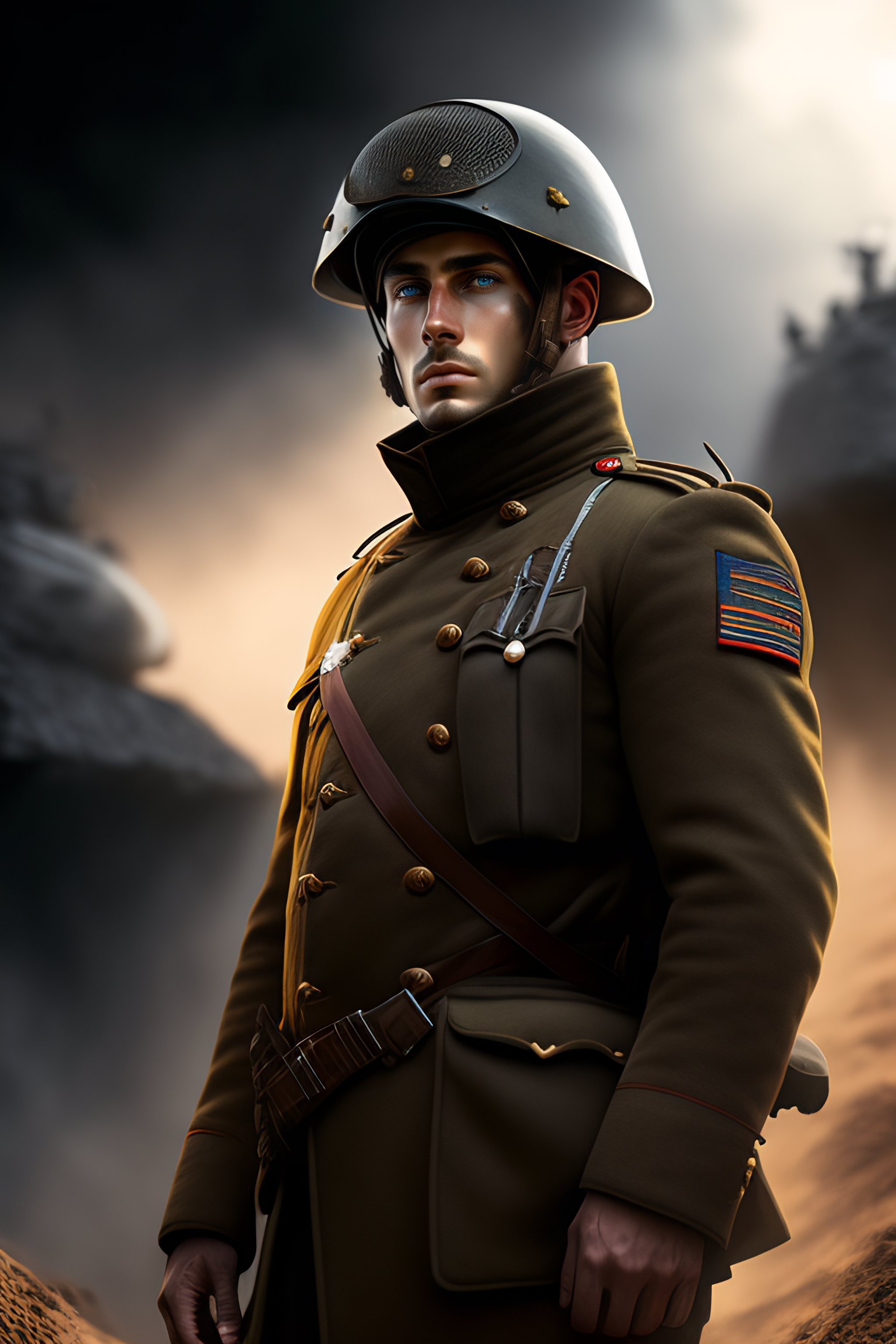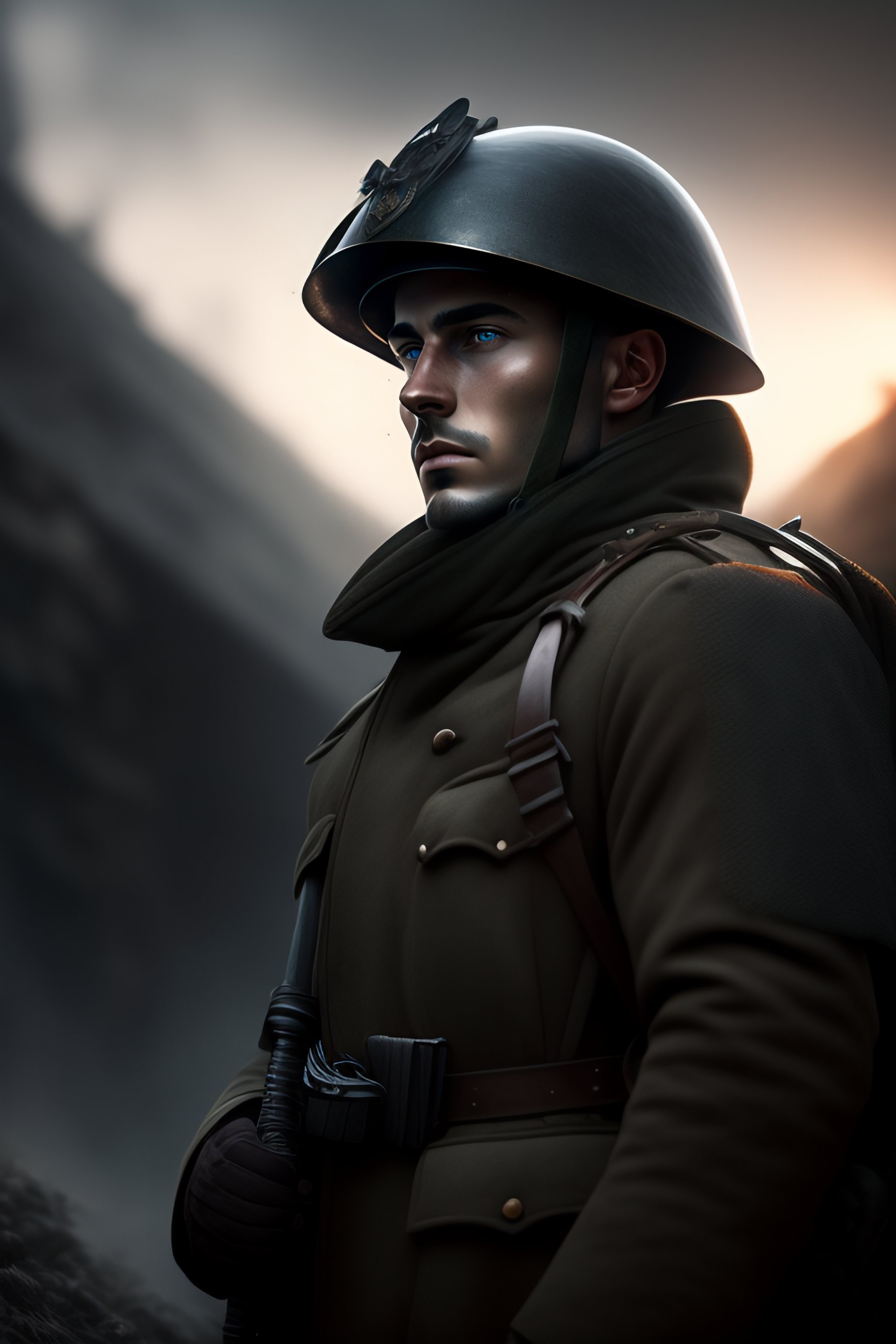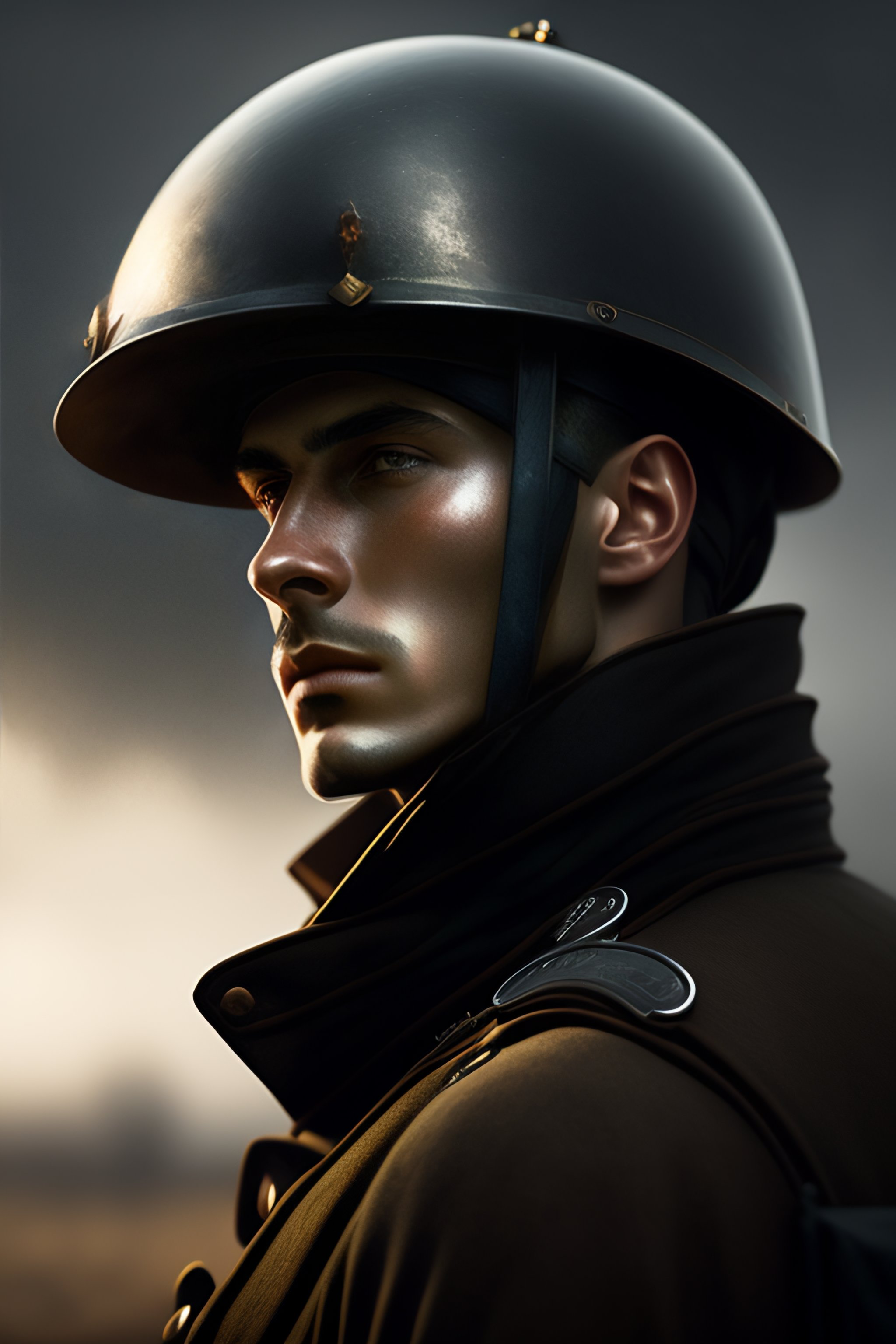 Ww1 trench soldier with helmet portrait, digital art photorealistic hyperdetailed, dark shadows, volumetric lightining by greg rutkowski