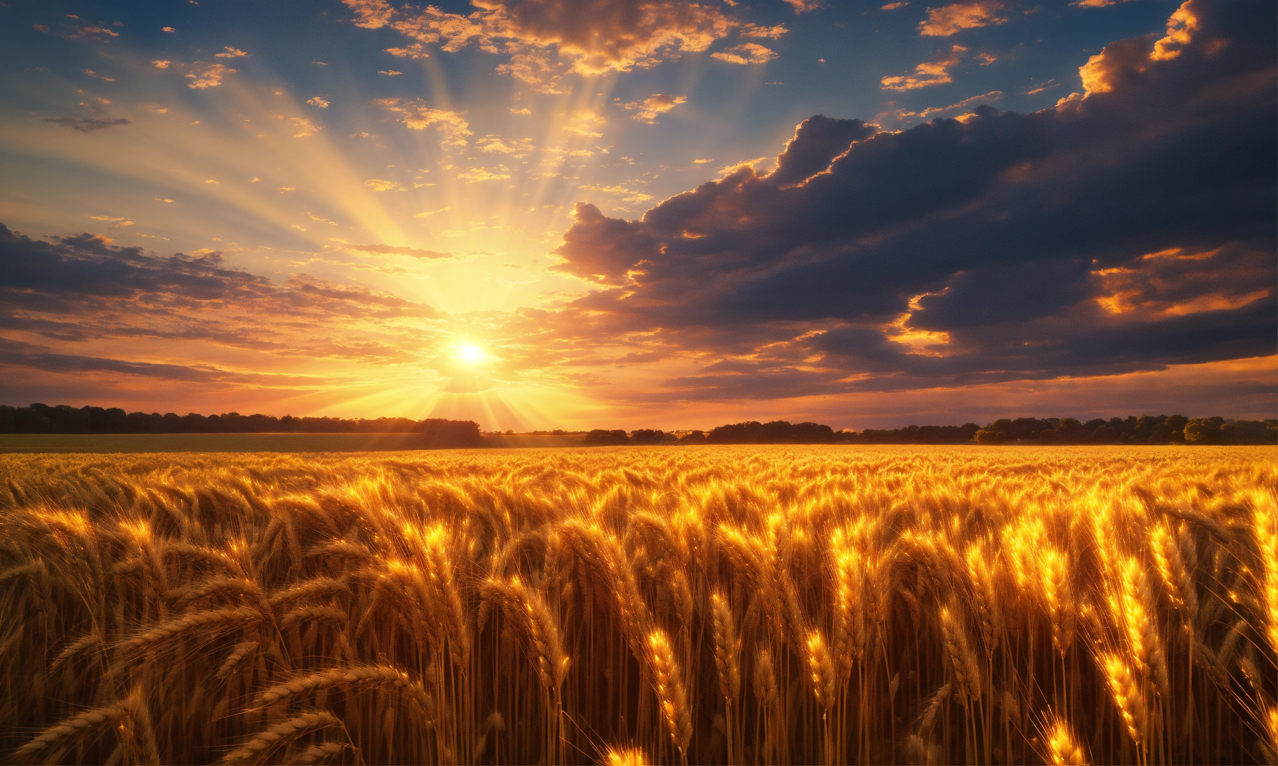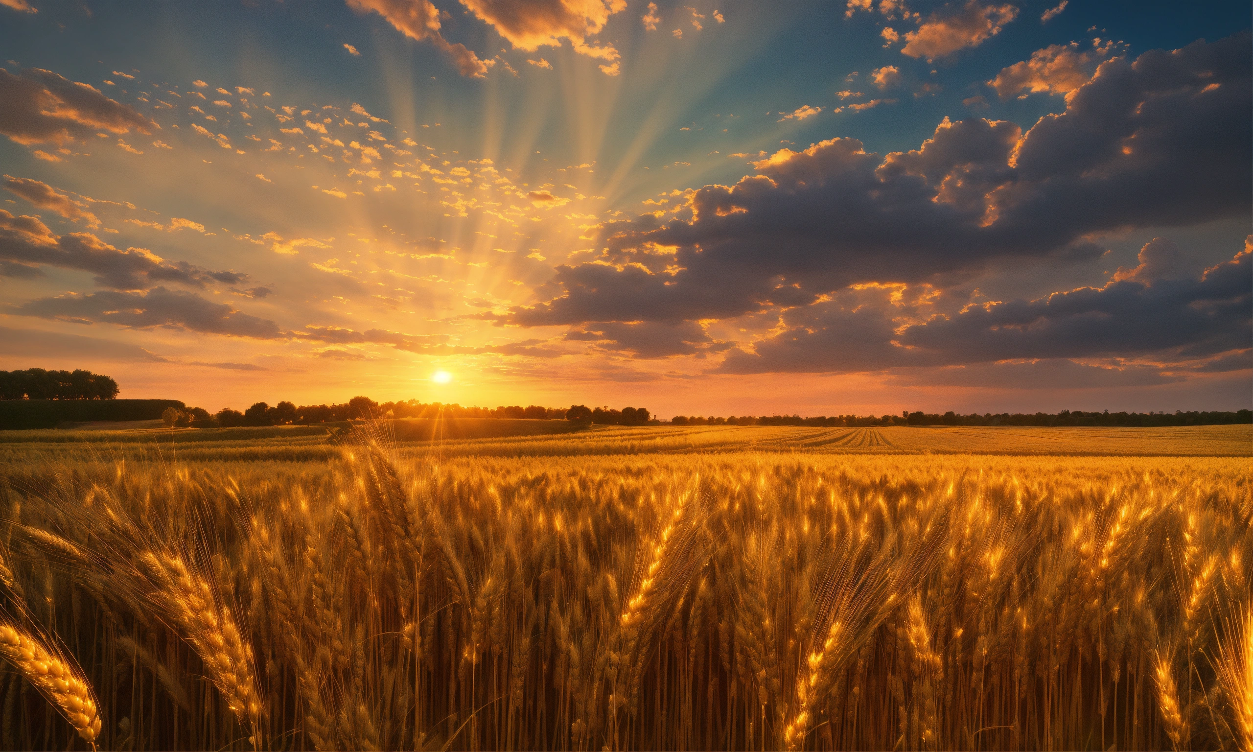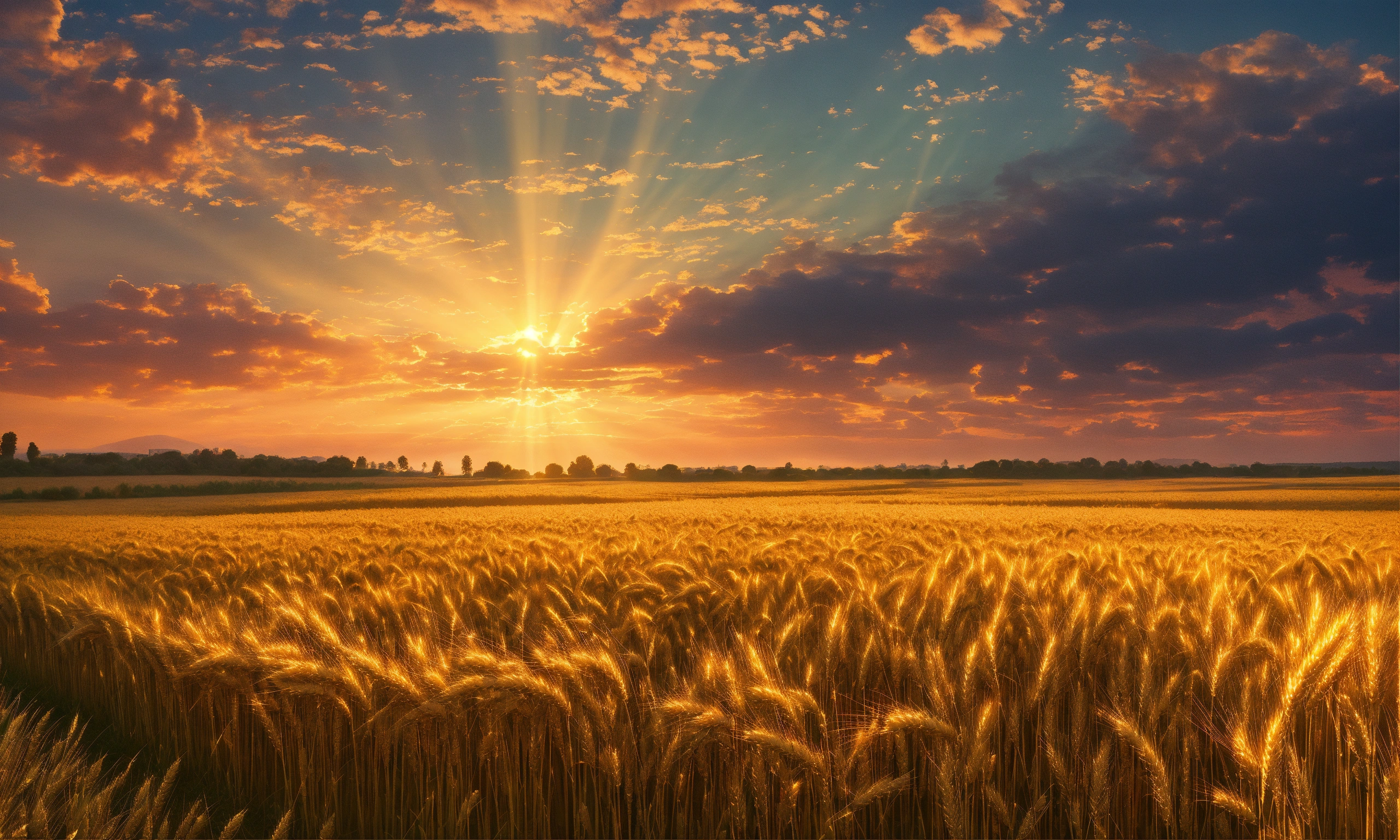 Wheat field with rays of sunlight, lots of clouds, 4k, art nouveau style, sunset colours, very detailed