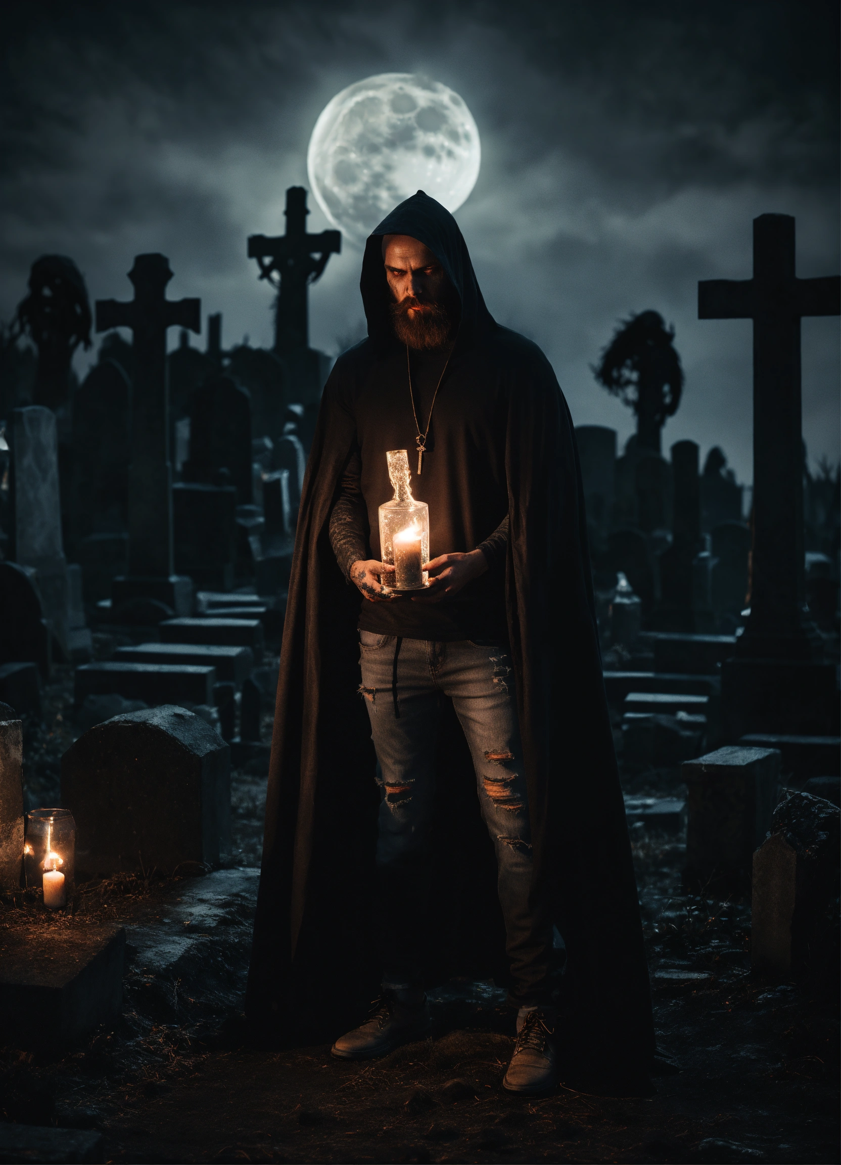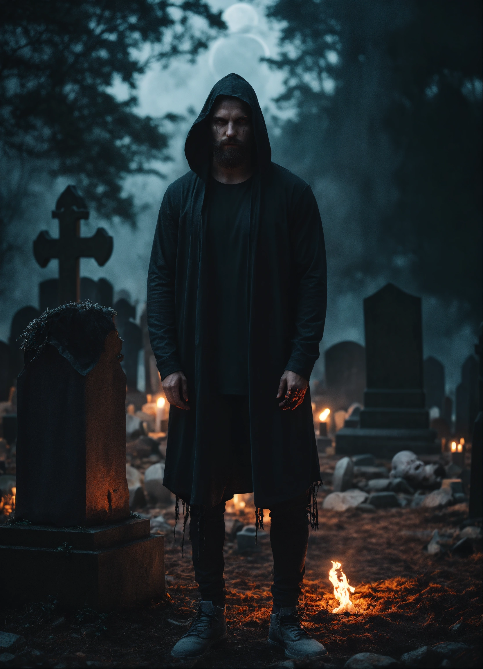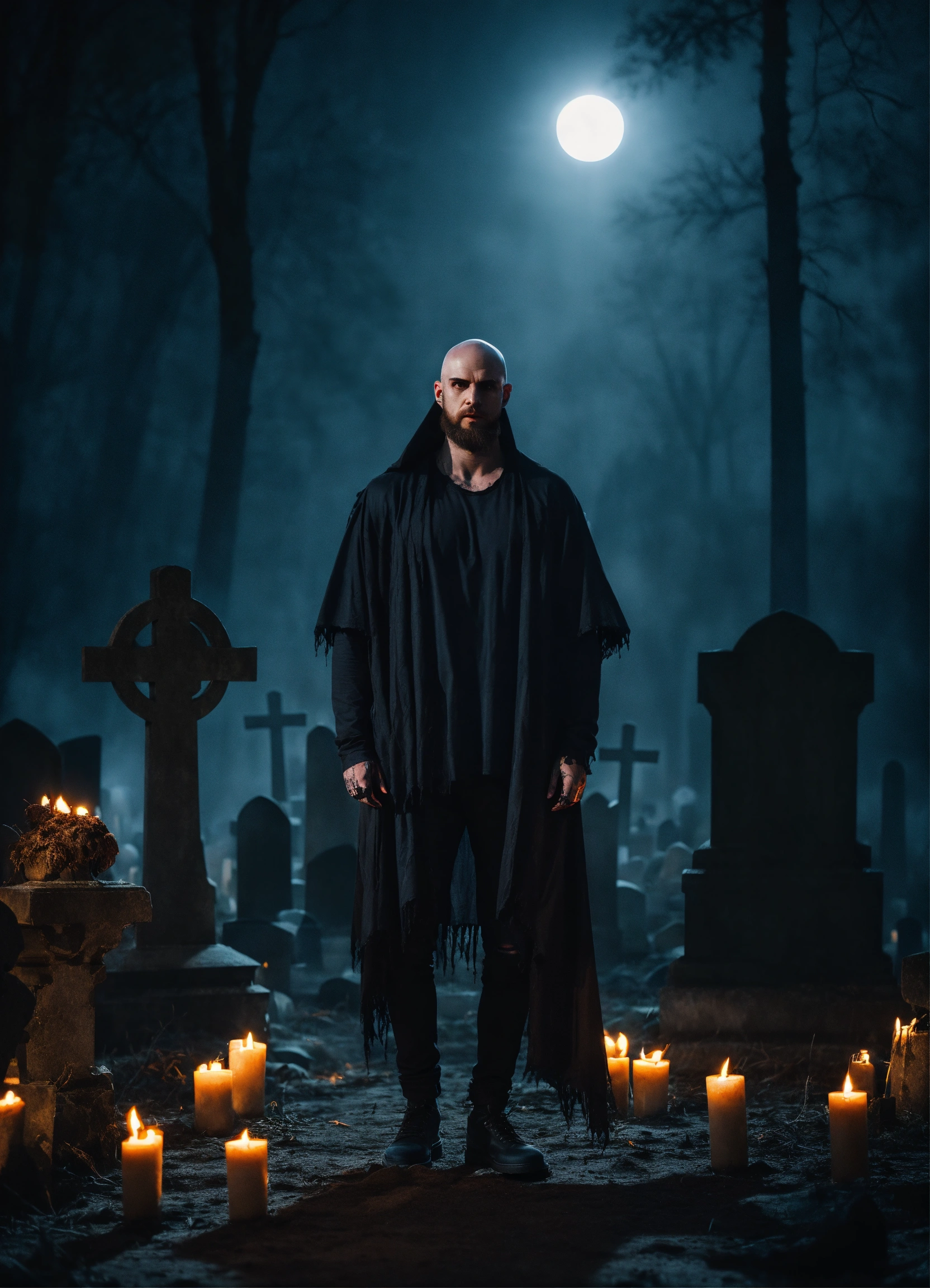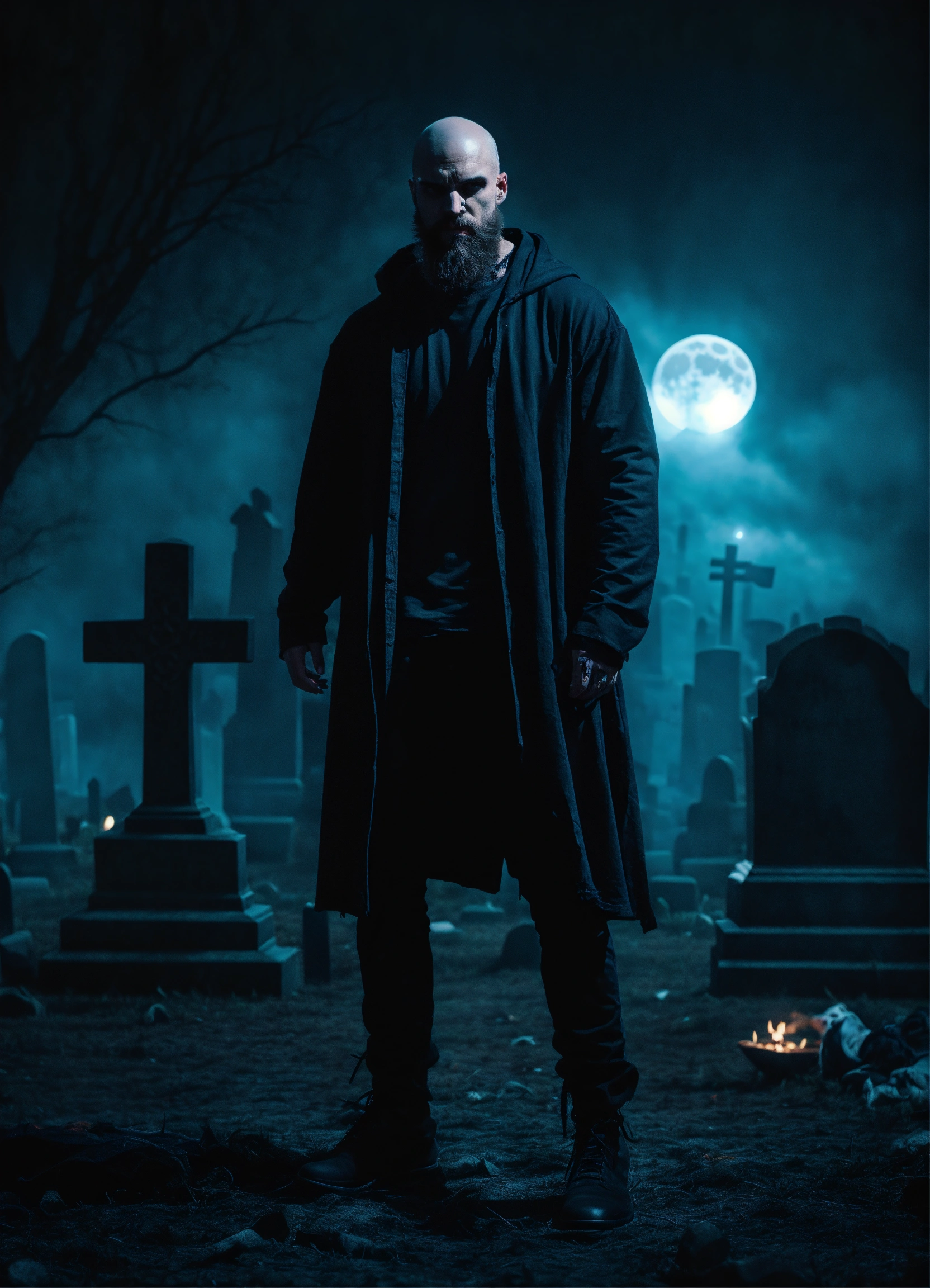A young bald man with beard 8k modern day 2023 clothing blank t shirt and ripped jeans 8k a horrifying scene depicting a demonic ritual in a moonlit graveyard, with ghouls emerging from the shadows and an eerie, cloaked figure invoking dark forces