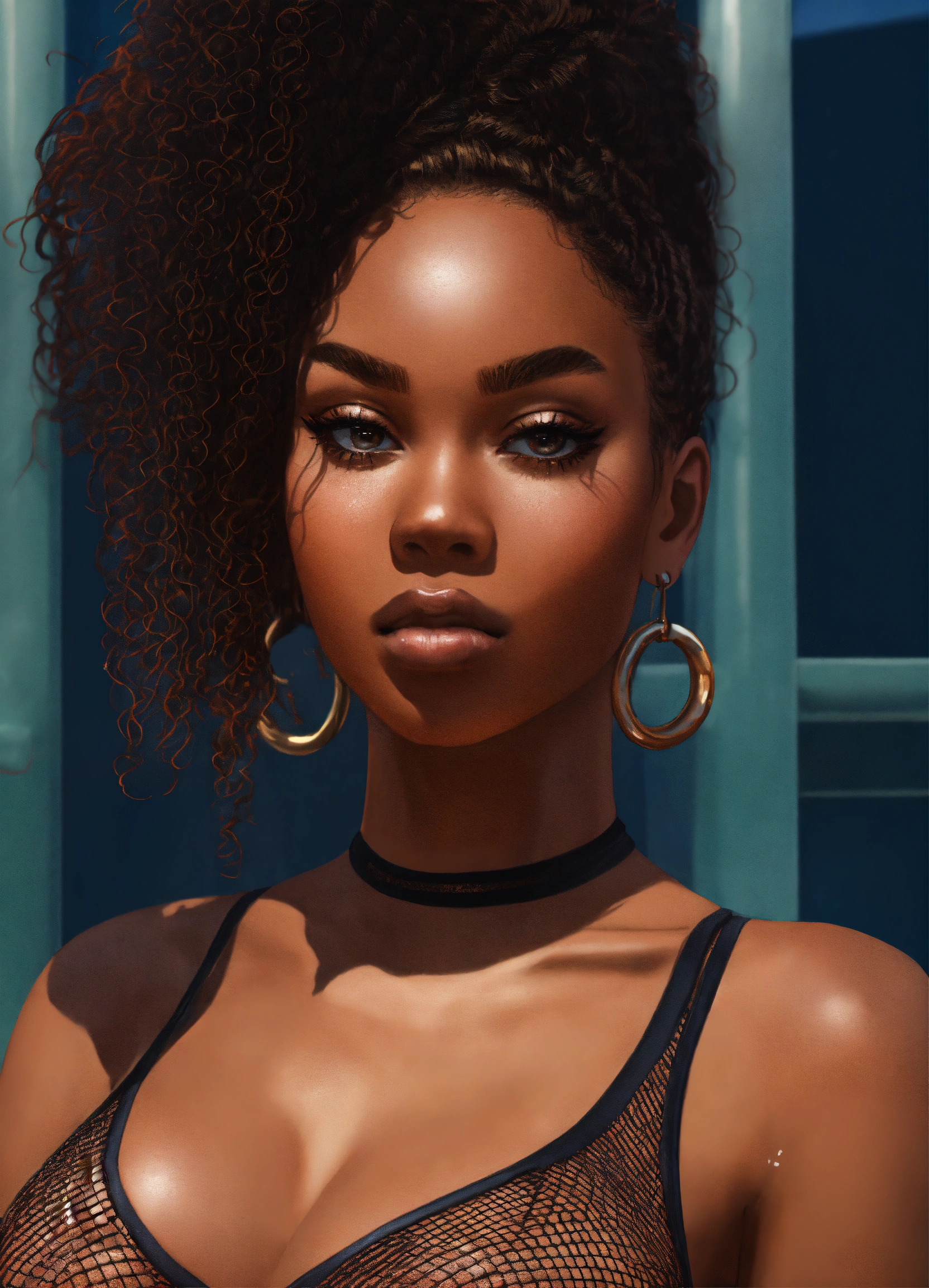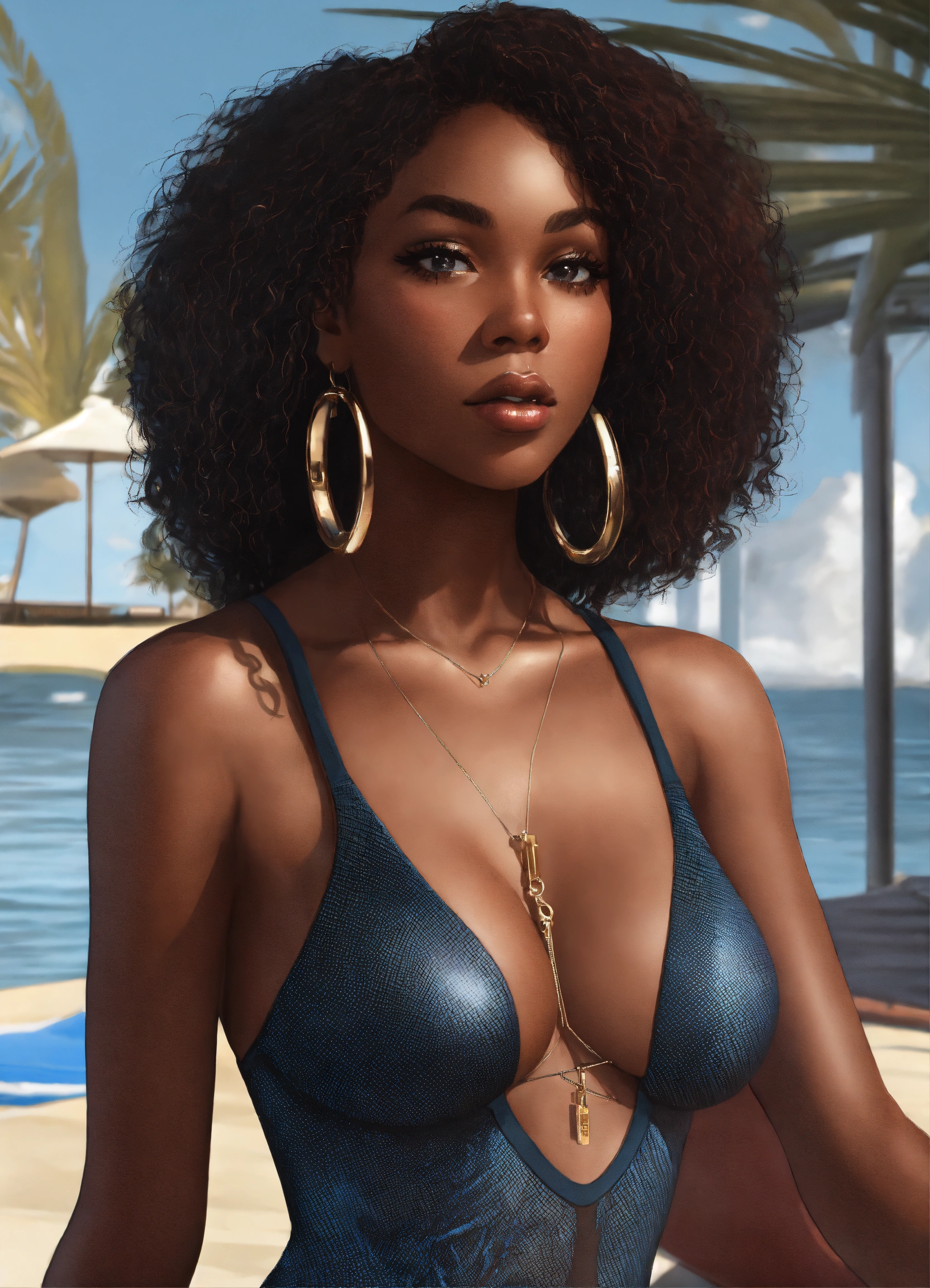 Black woman, beauty, big jugs, aesthetic, beautiful, fishnet thin swimsuit, cartoonish style with hyperrealistic face, modern, in the style of lexica aperture v2