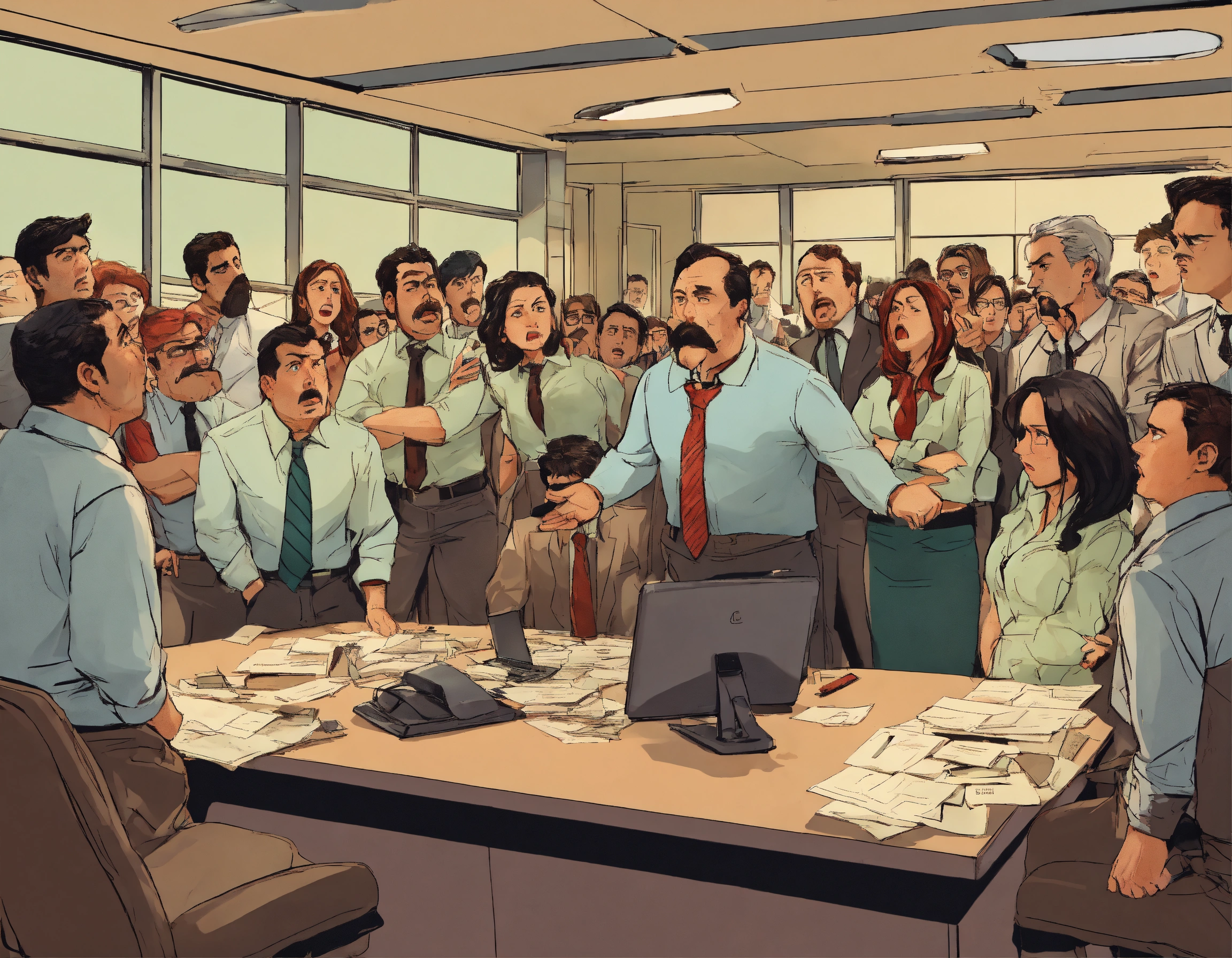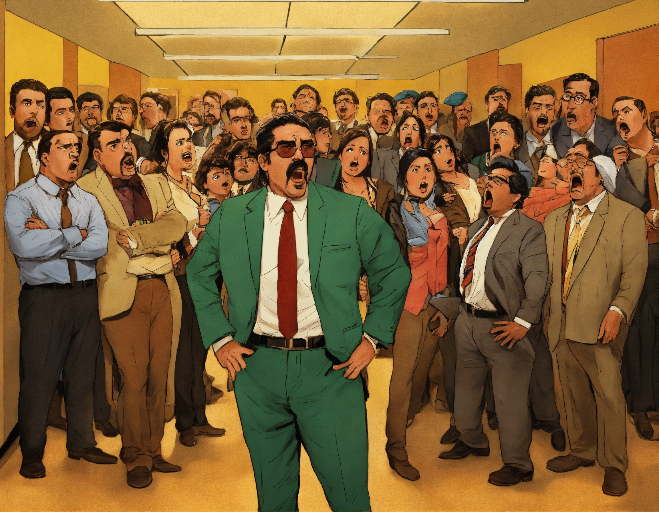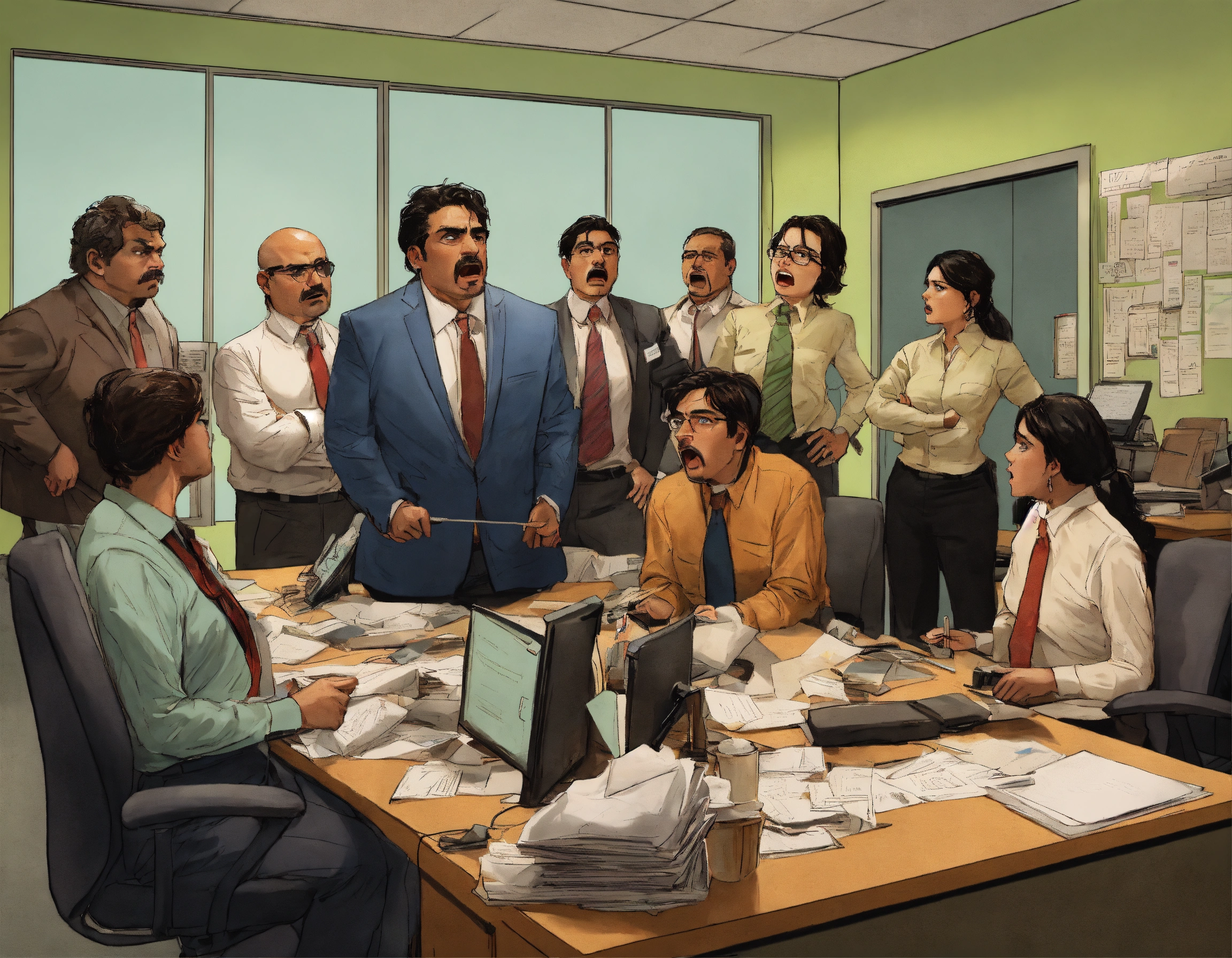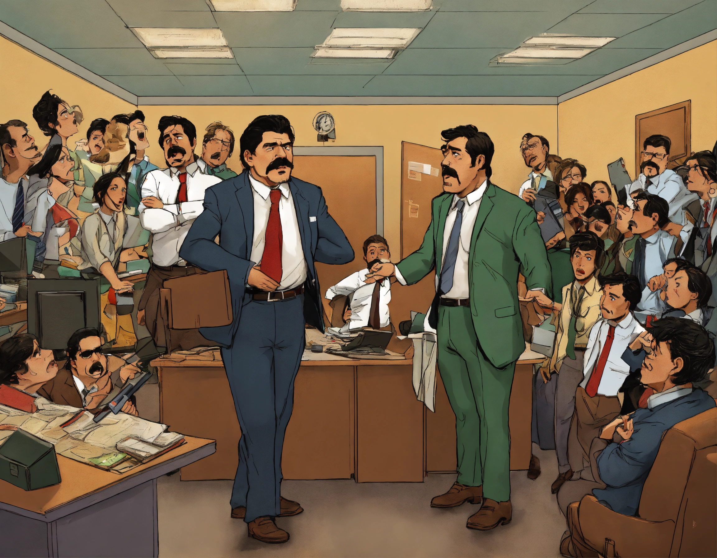 "depict a scene in an office where a mexican boss stands at the center, trying to direct 25 employees, both male and female. each employee is looking in a different direction, leading to a chaotic yet comical tableau. the boss's expression is a mix of exasperation and determination."