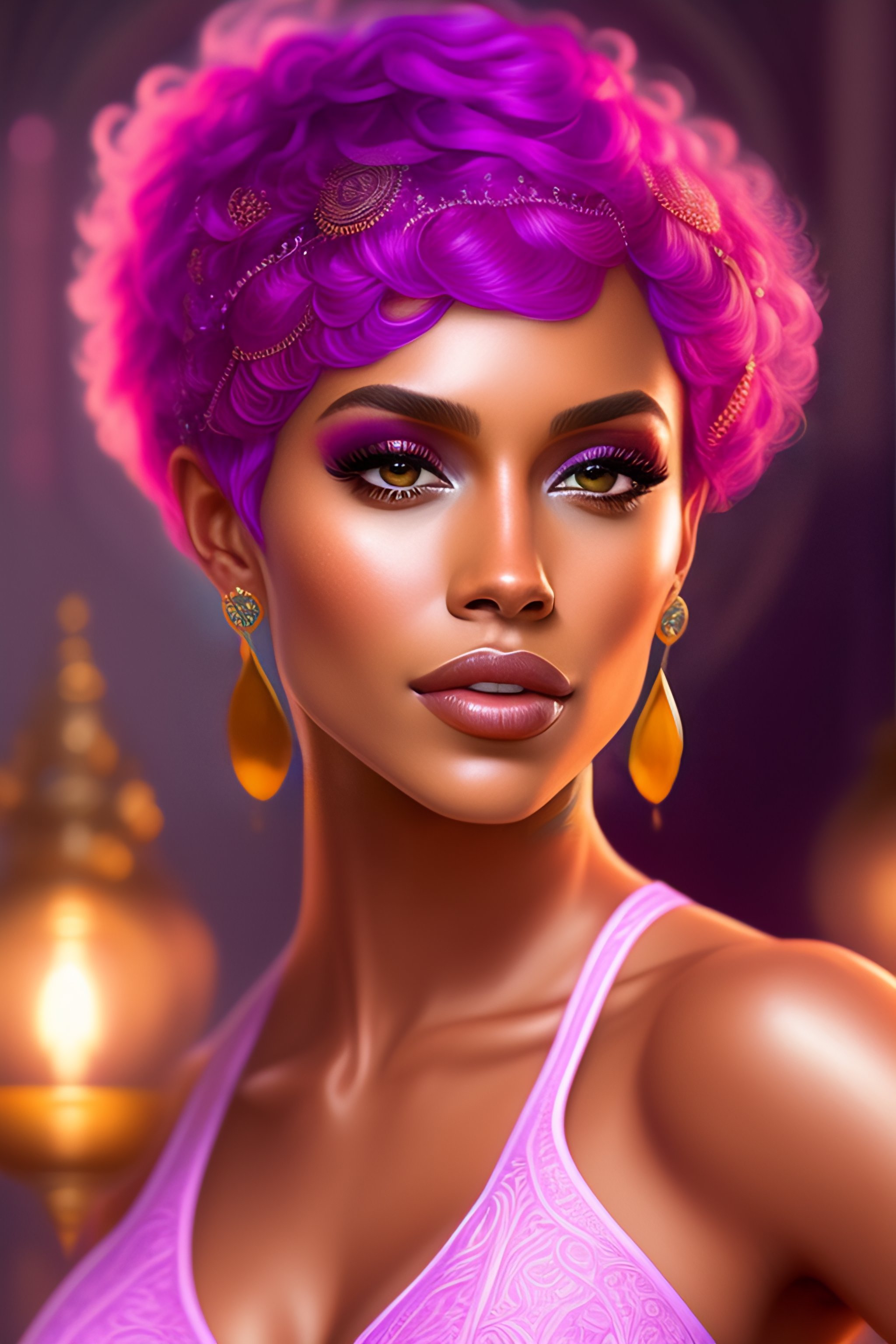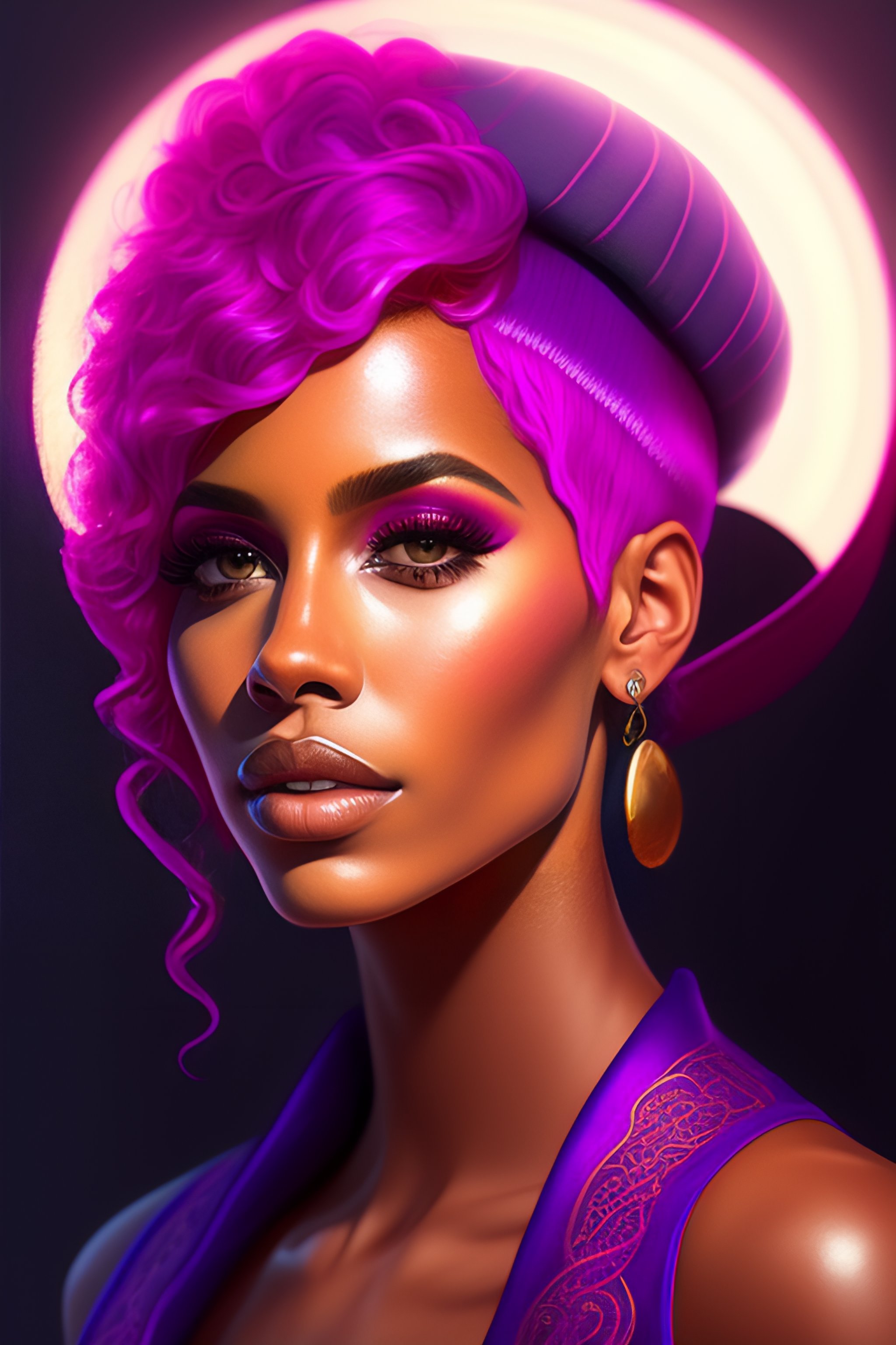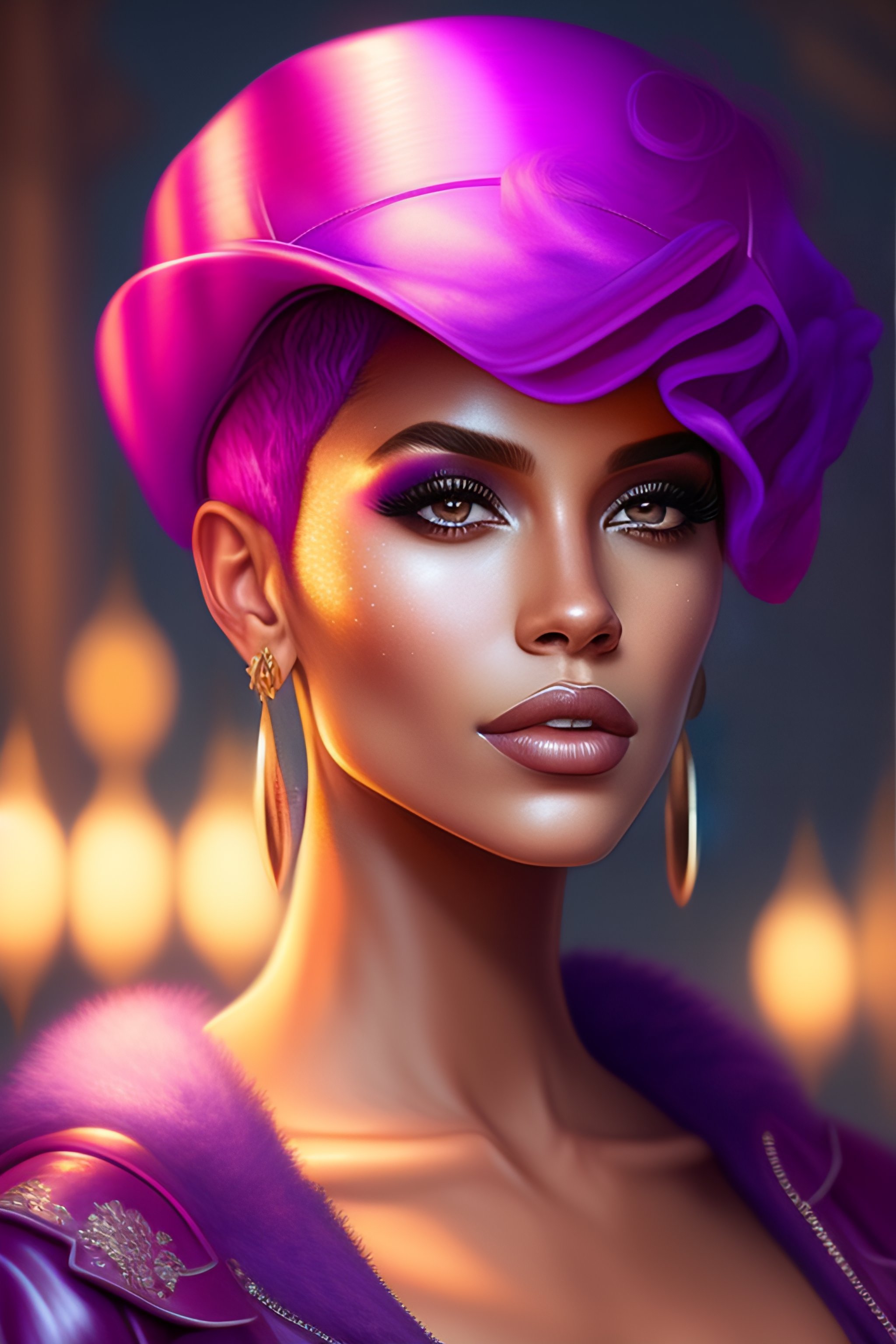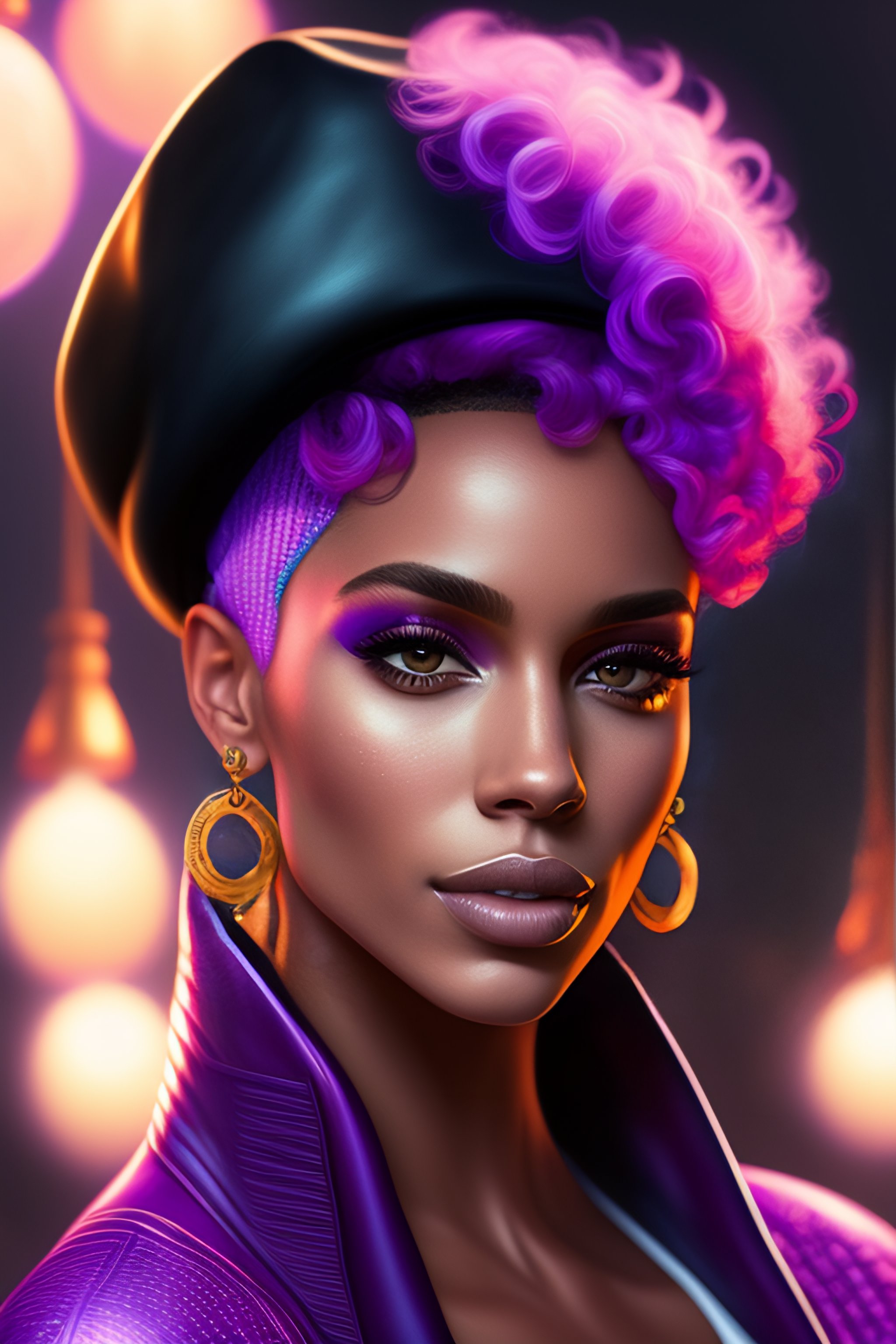 Portrait of vanessa morgan with bright pink hair, curly pixie cut hair, wearing a purple breton cap, breton cap, hoop earrings, intricate, elegant, glowing lights, highly detailed, digital painting, artstation, concept art, smooth, sharp focus, illustration, art by wlop, mars ravelo and greg rutkowski