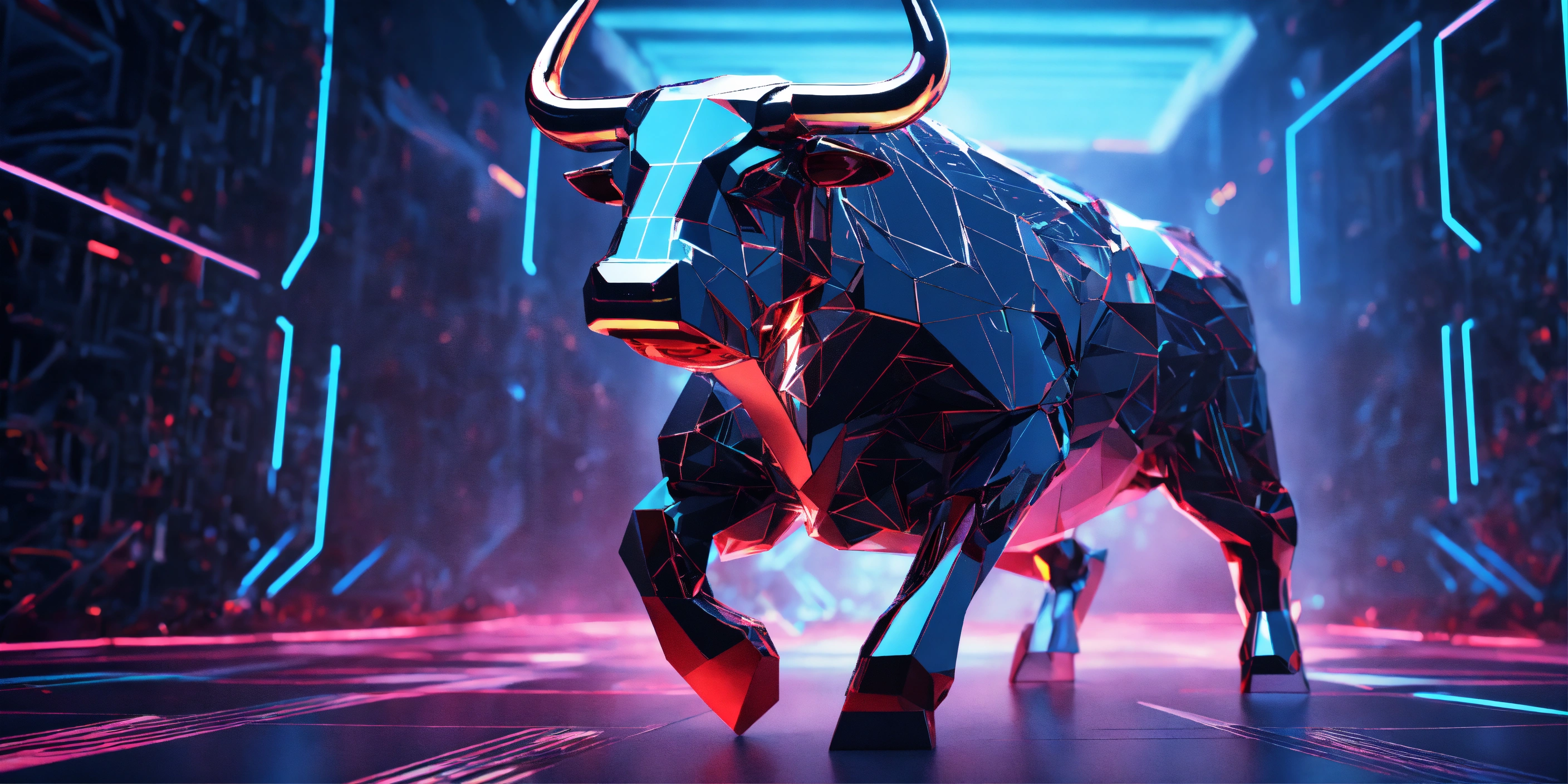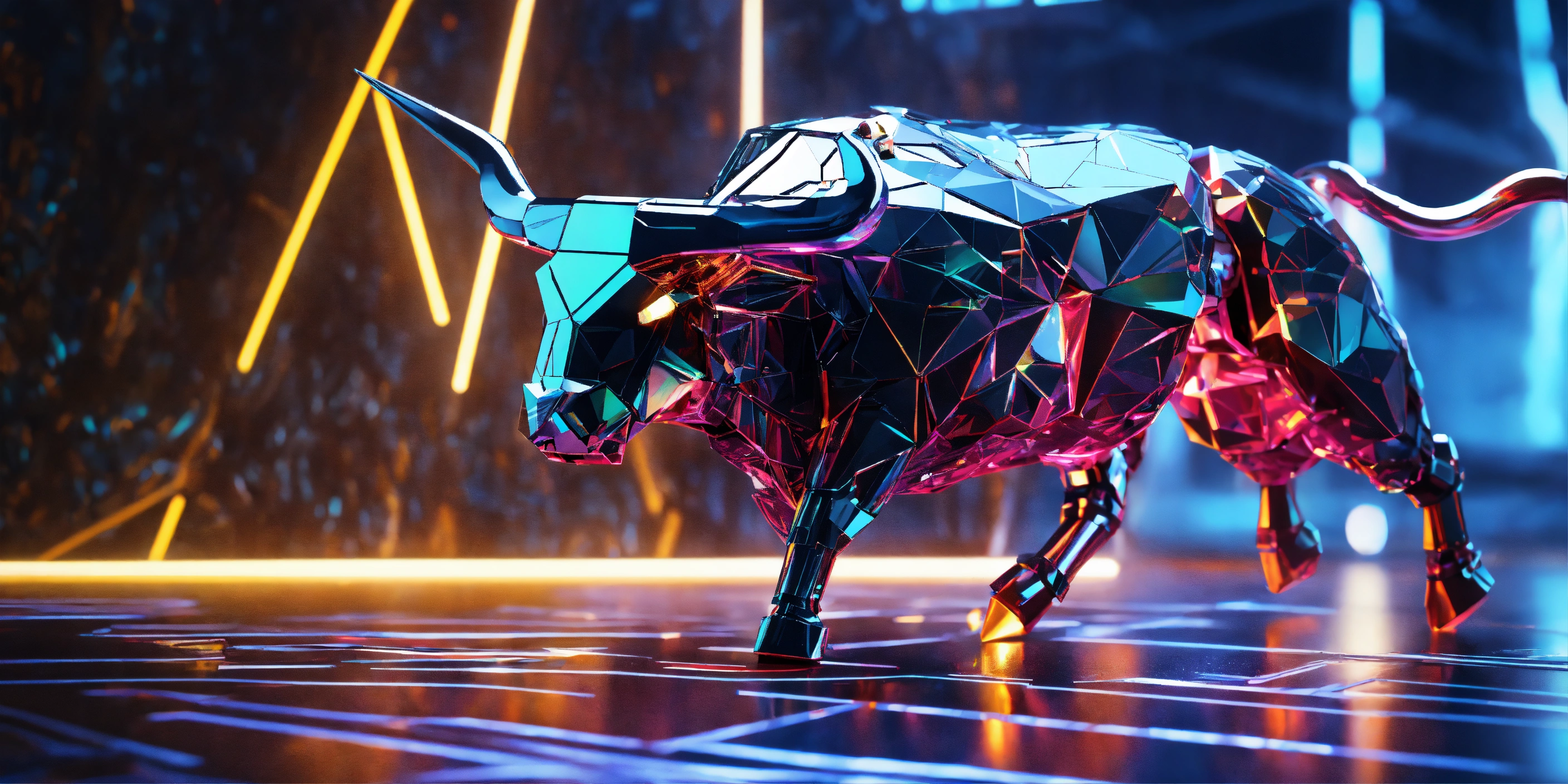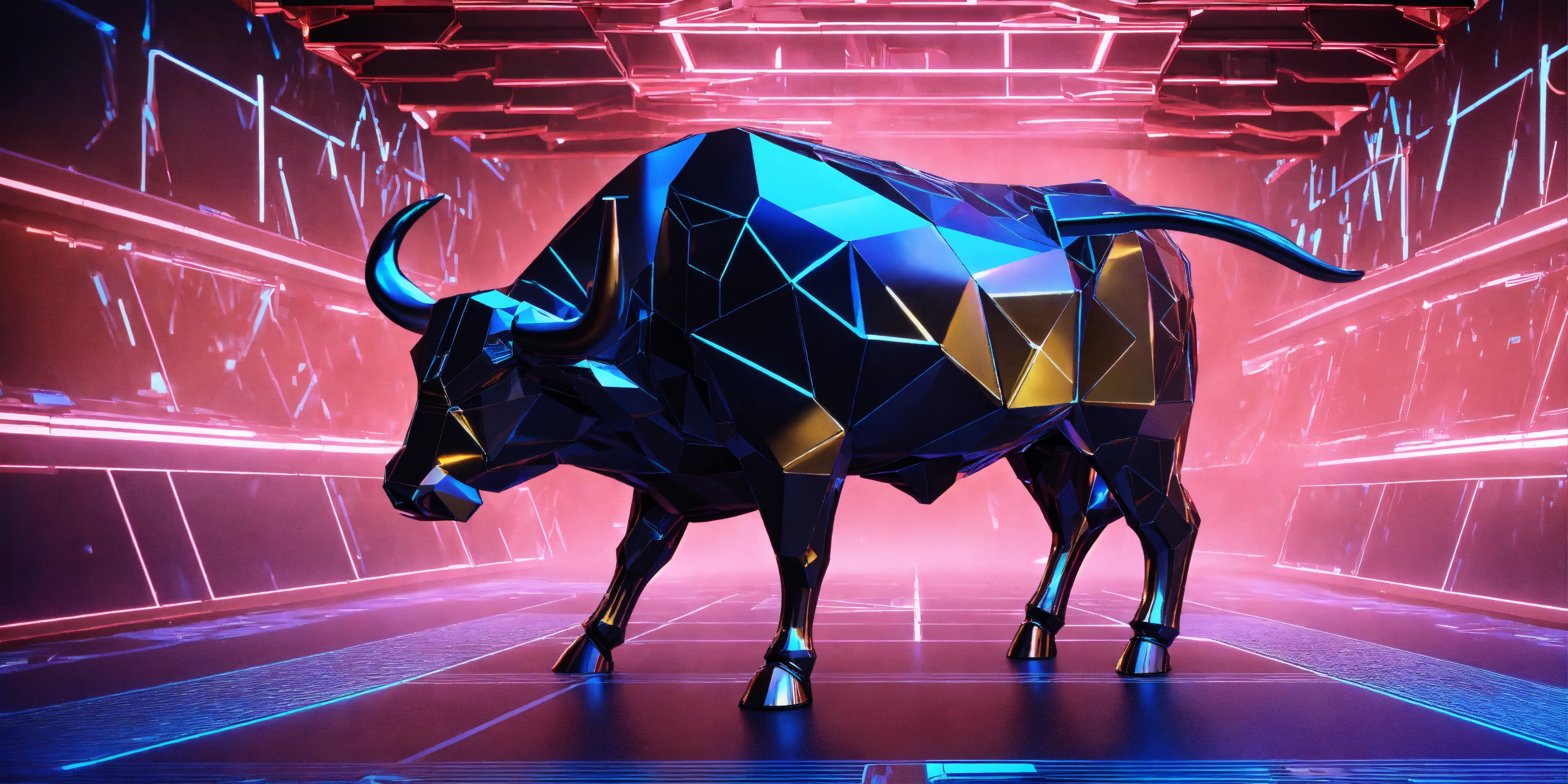 Metallic geometric aggressive black bull muscular running, geometric shapes, 3d render, holographic control center, computer code background