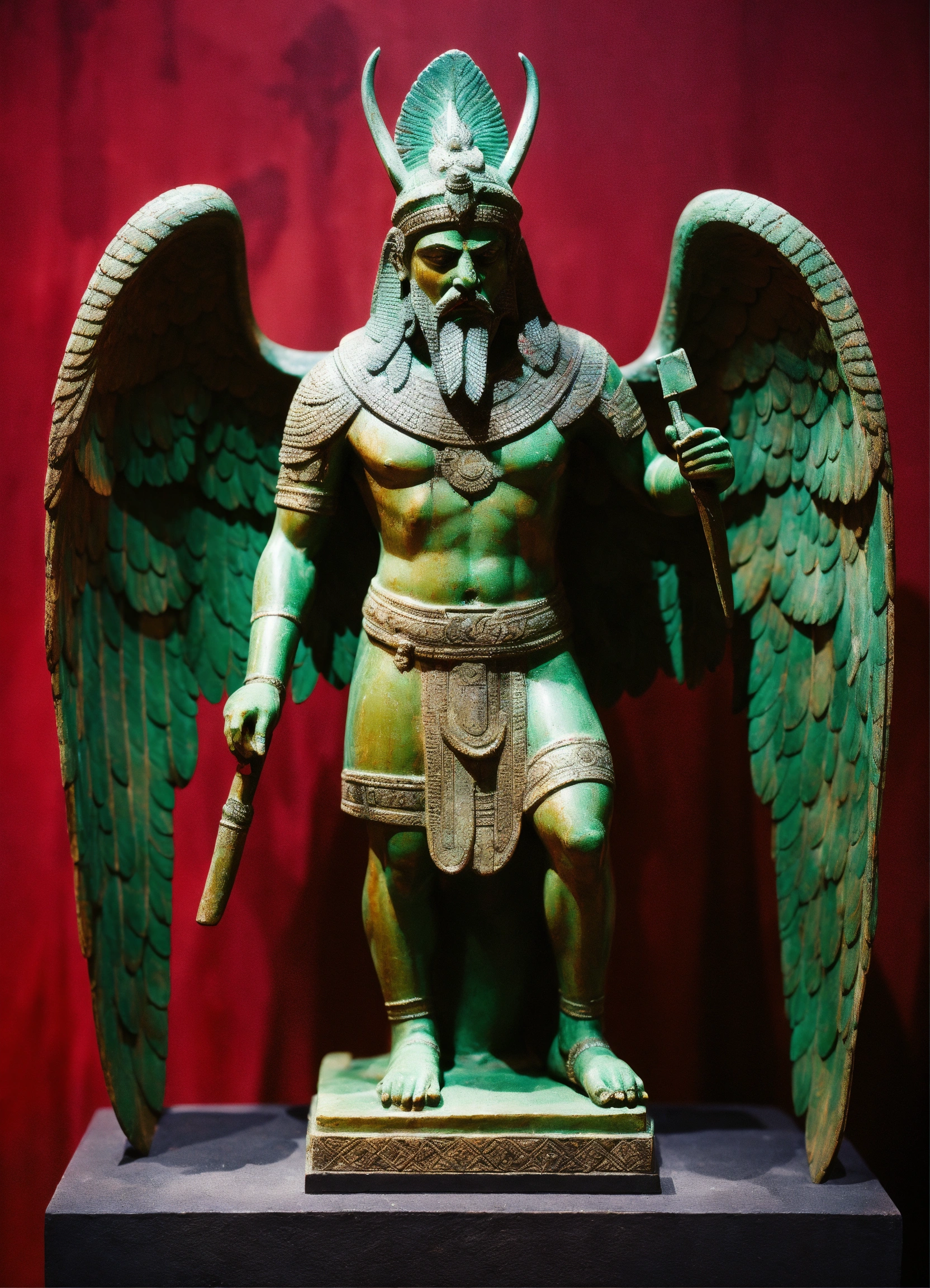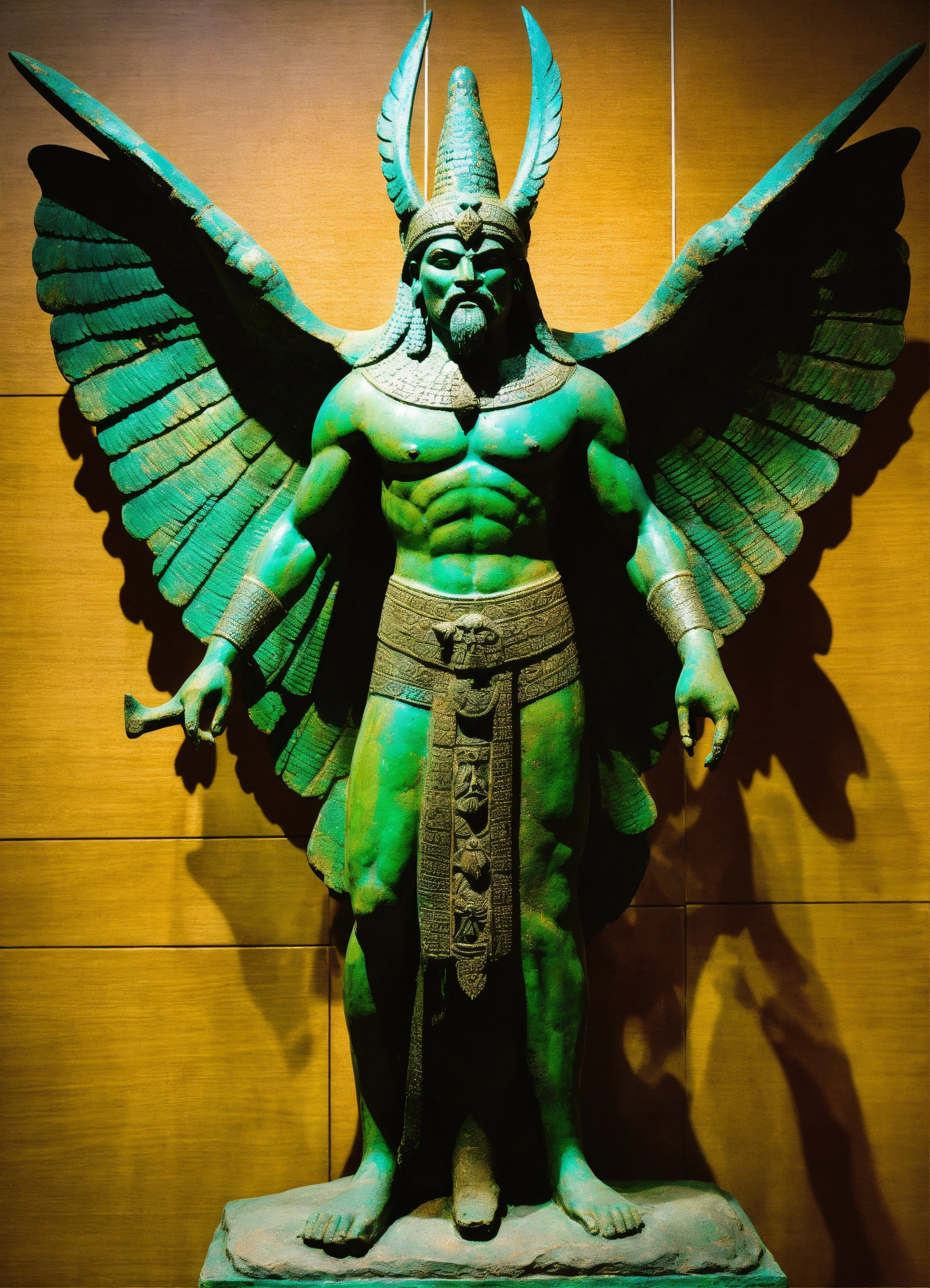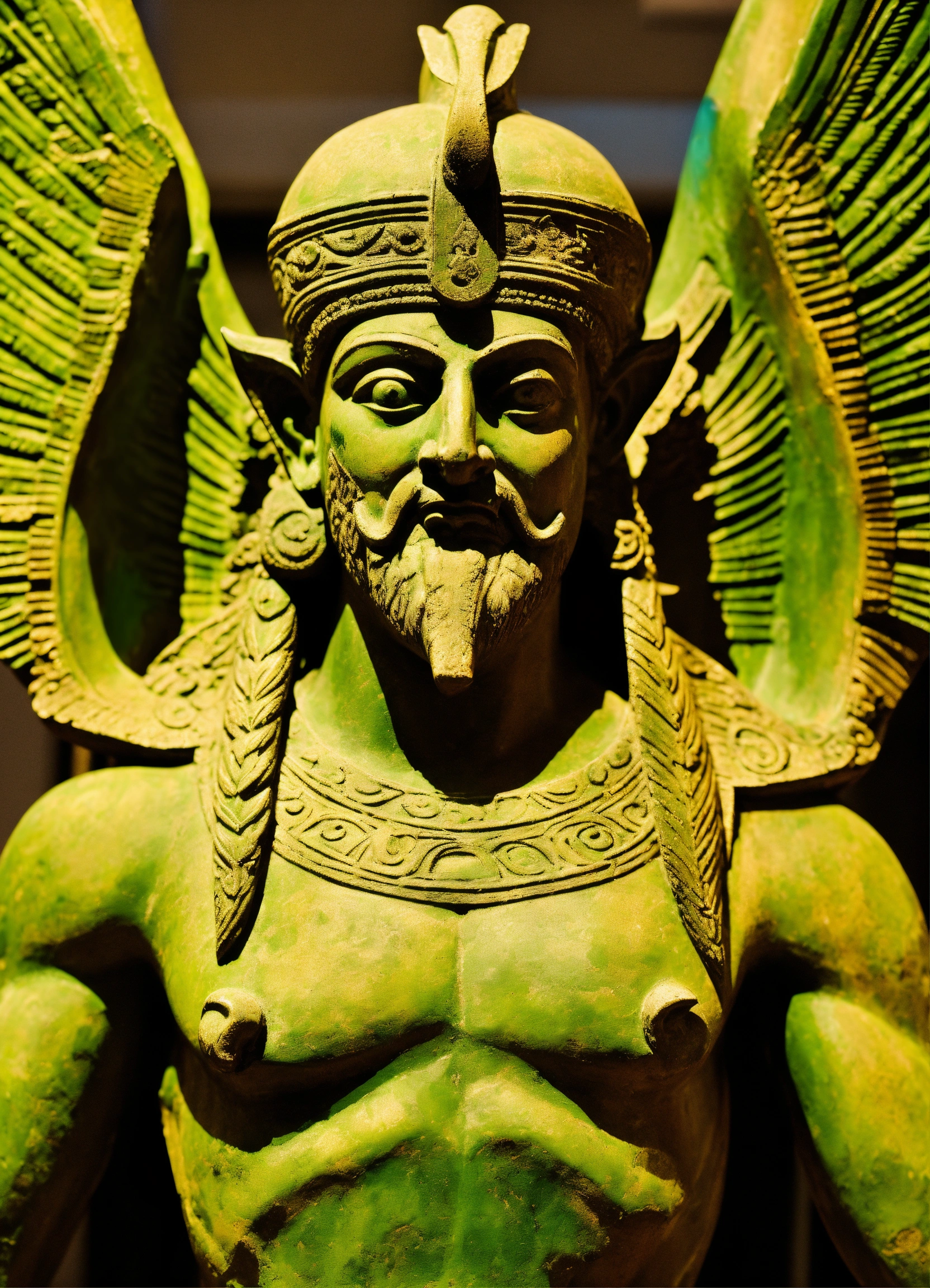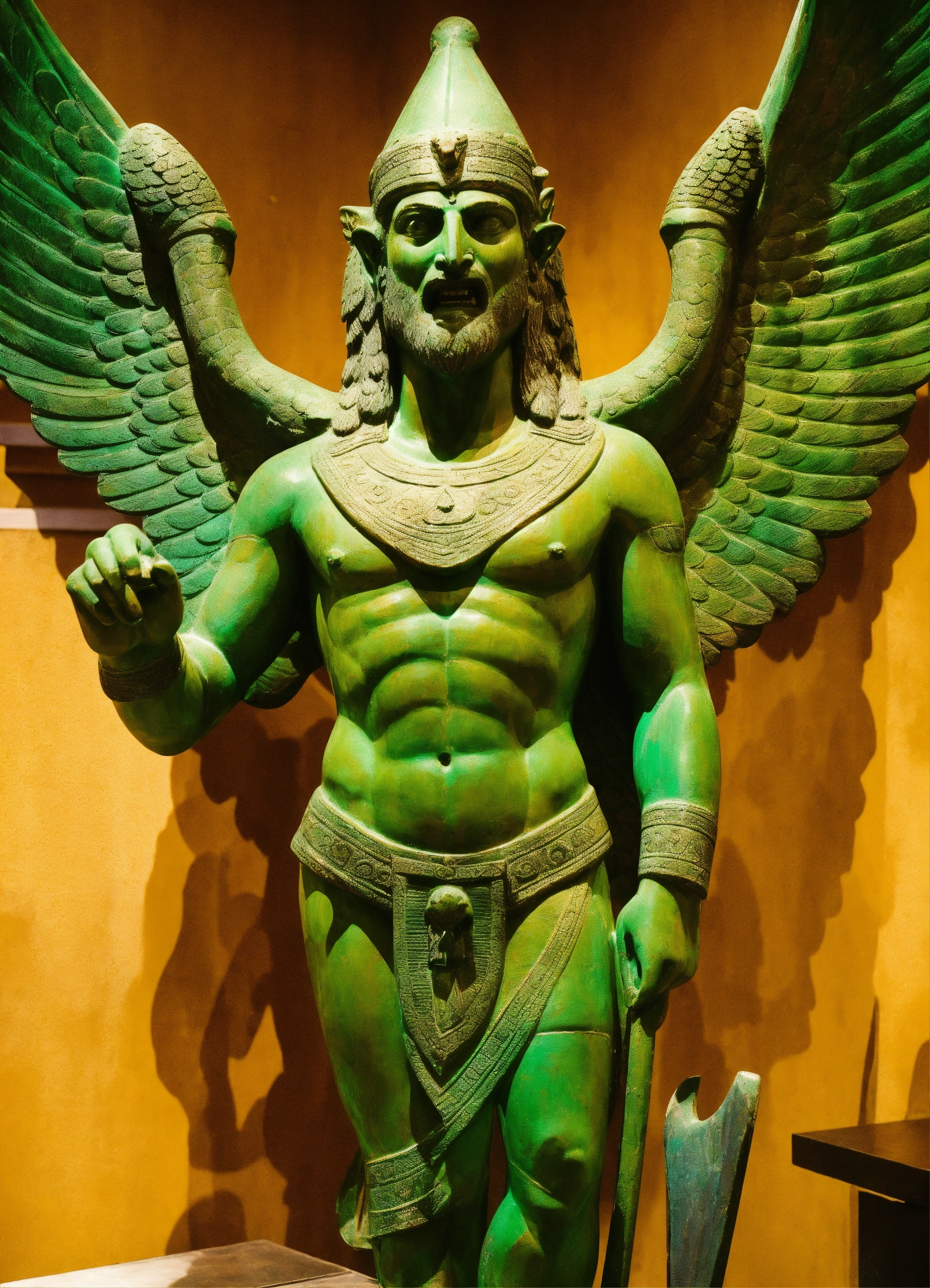 Greenish statue of an assyrian demon, evil expression and evil look, one arm pointing up and the other pointing down, his wings on his back are those of an eagle