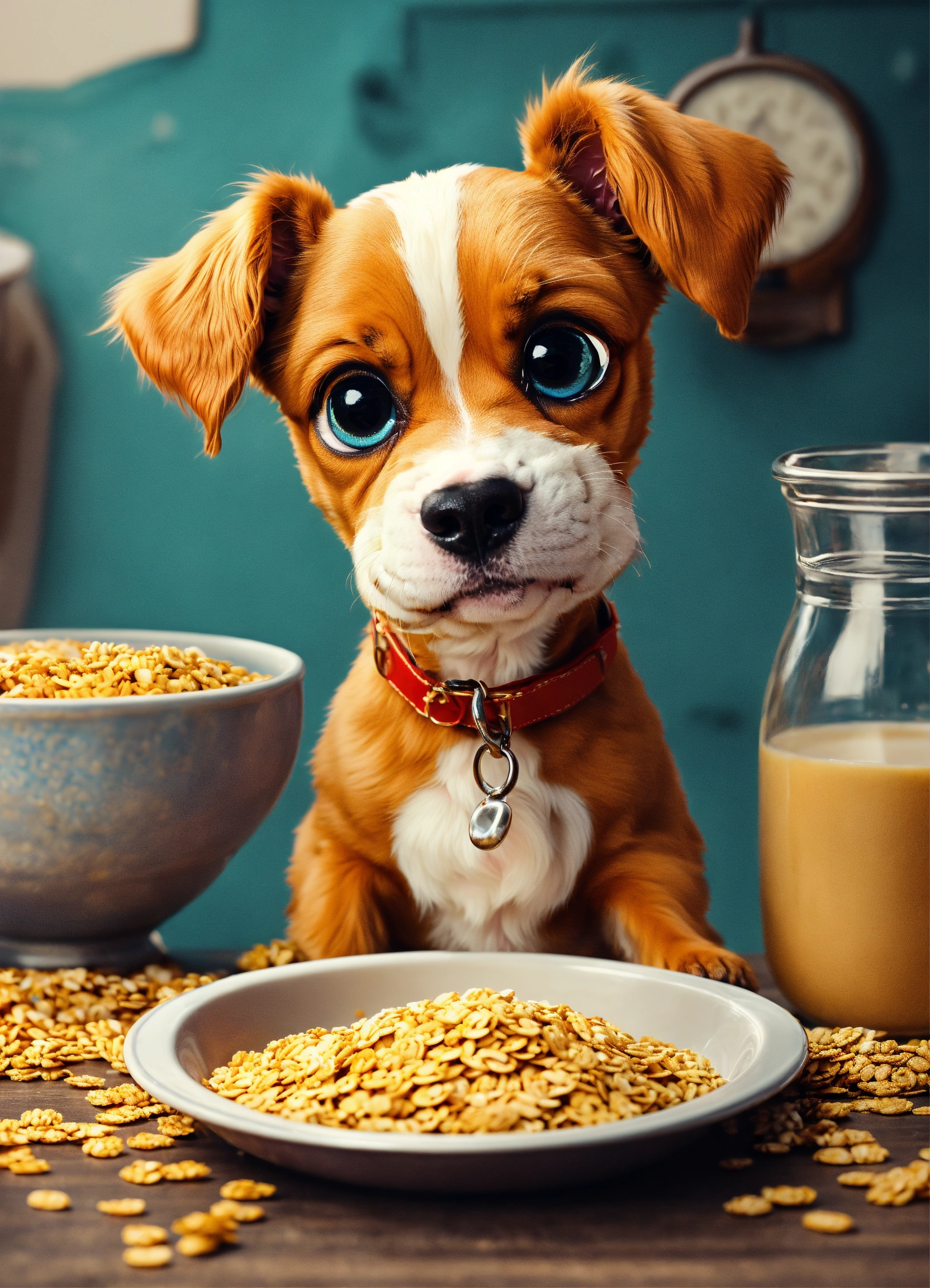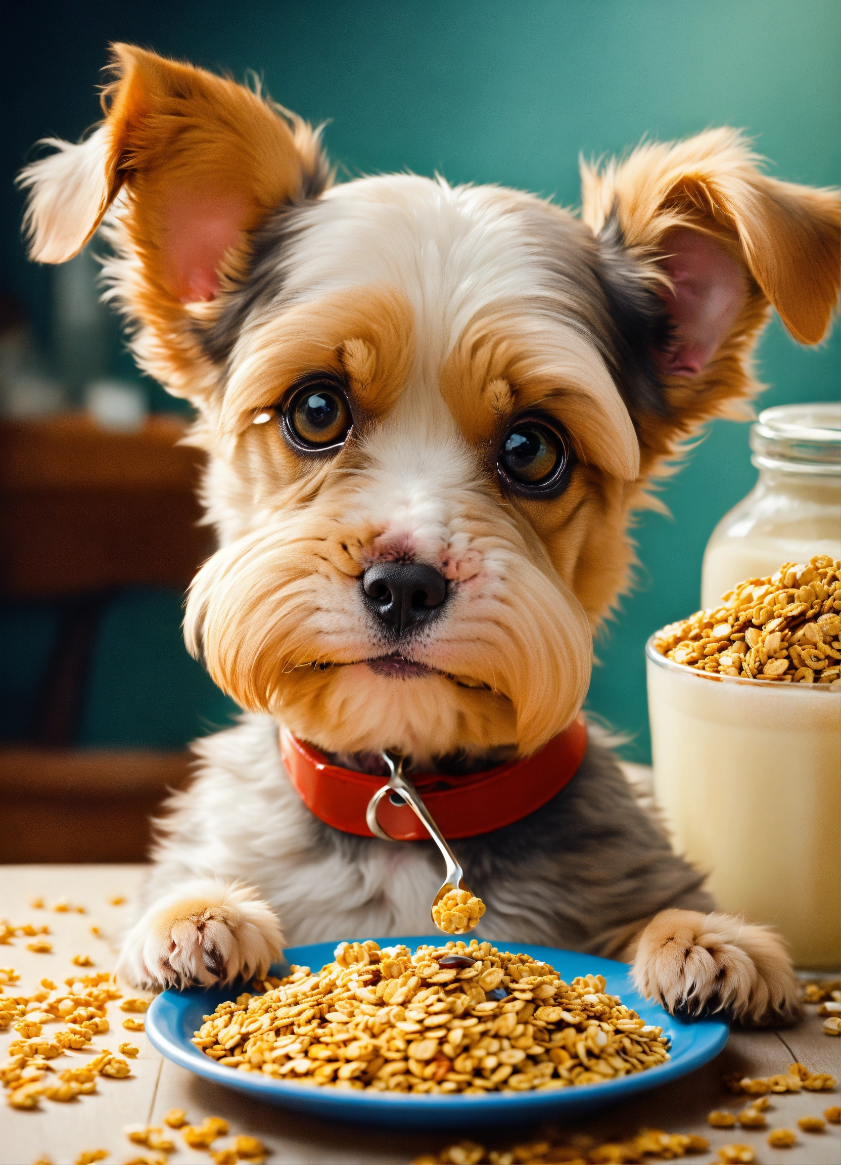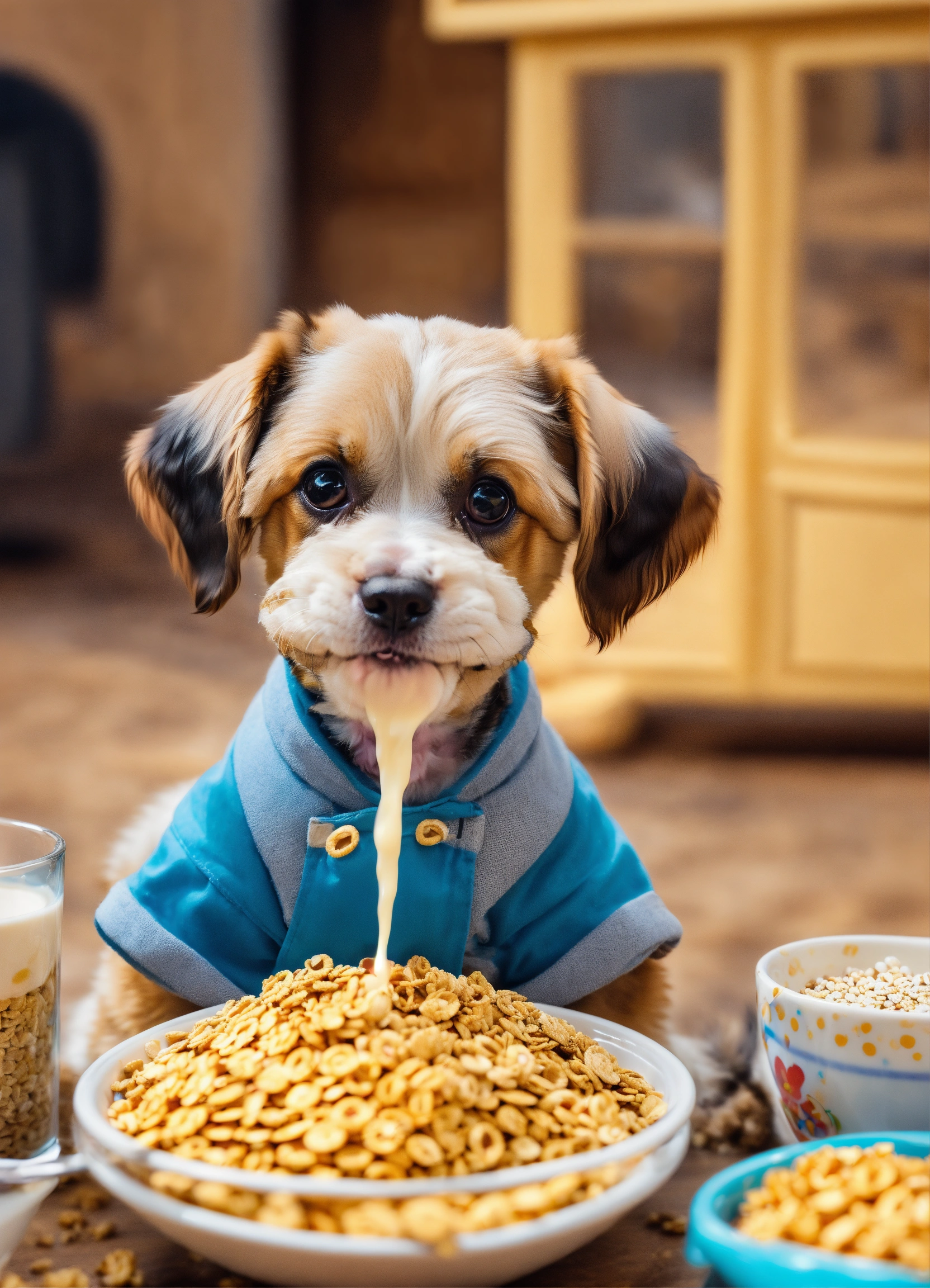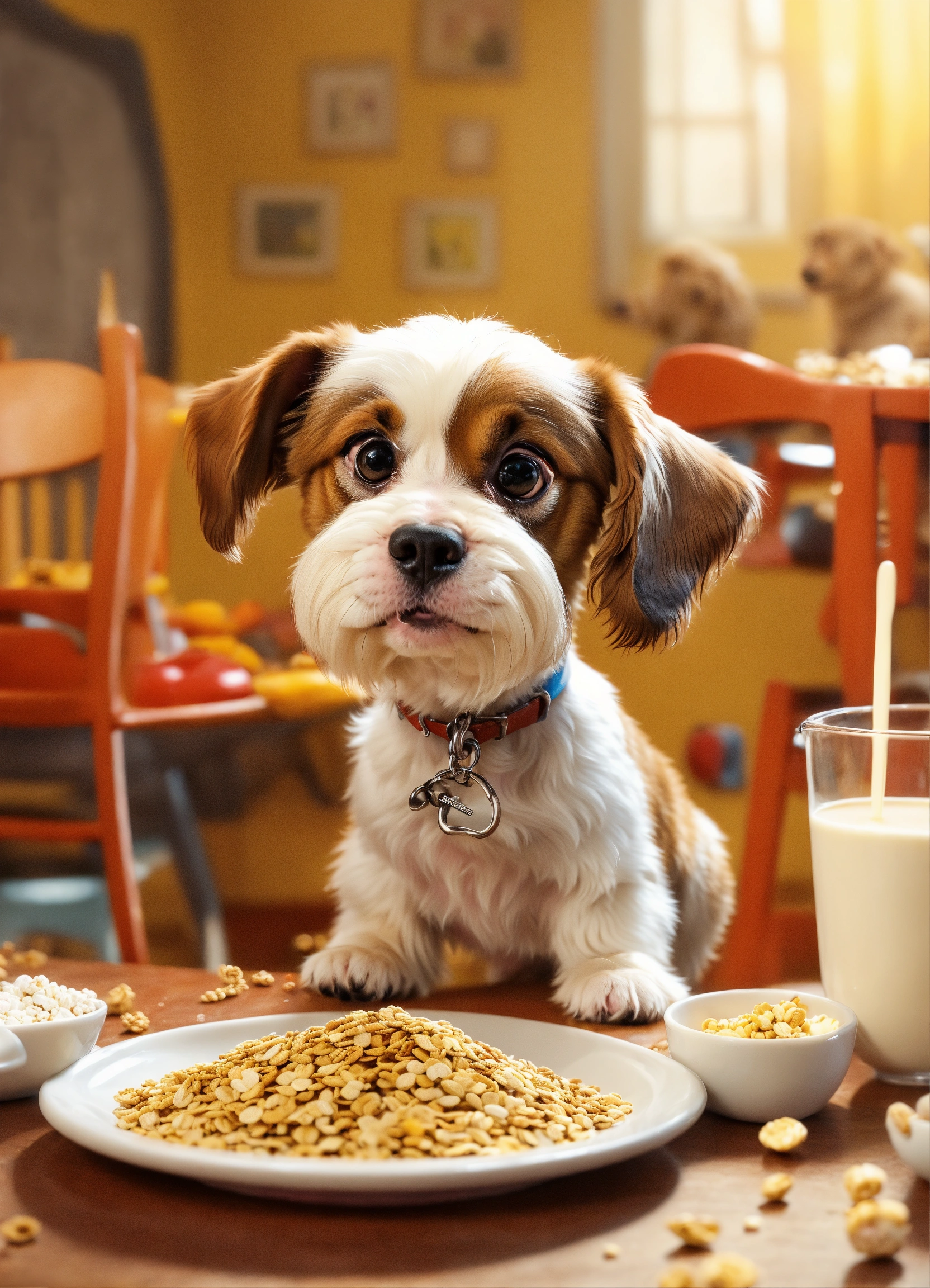 A cute adorable little dog with big eyes, eating messy, cereals with milk by hergé, perfect coloring, 8k