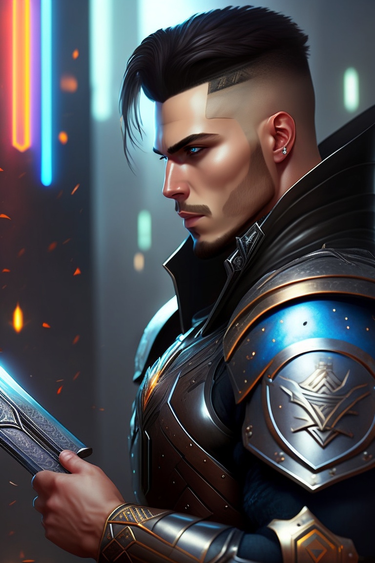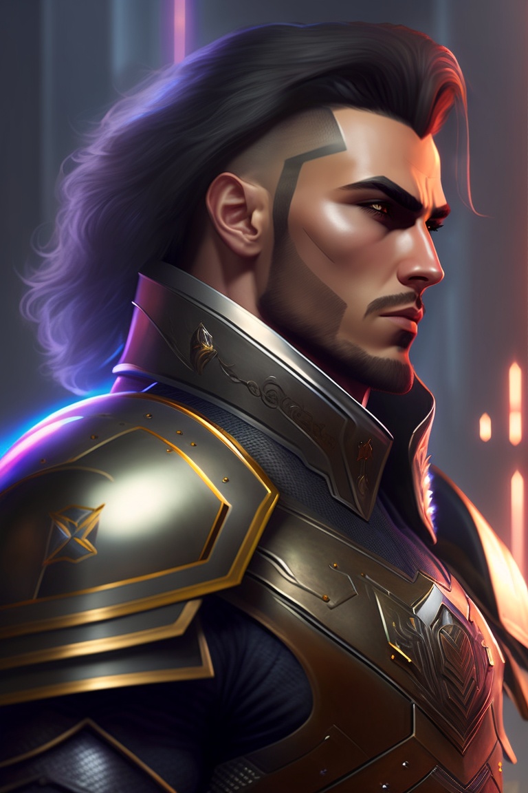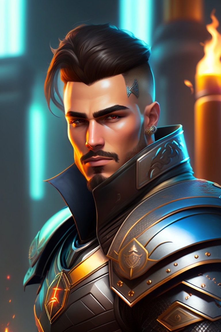 Cyberpunk, gaz, saracen, dark swordsman handsome black-haired warrior, knight fantasy men in plate armor guy in armor. gas magician, spiritist, signs, symbols, runes