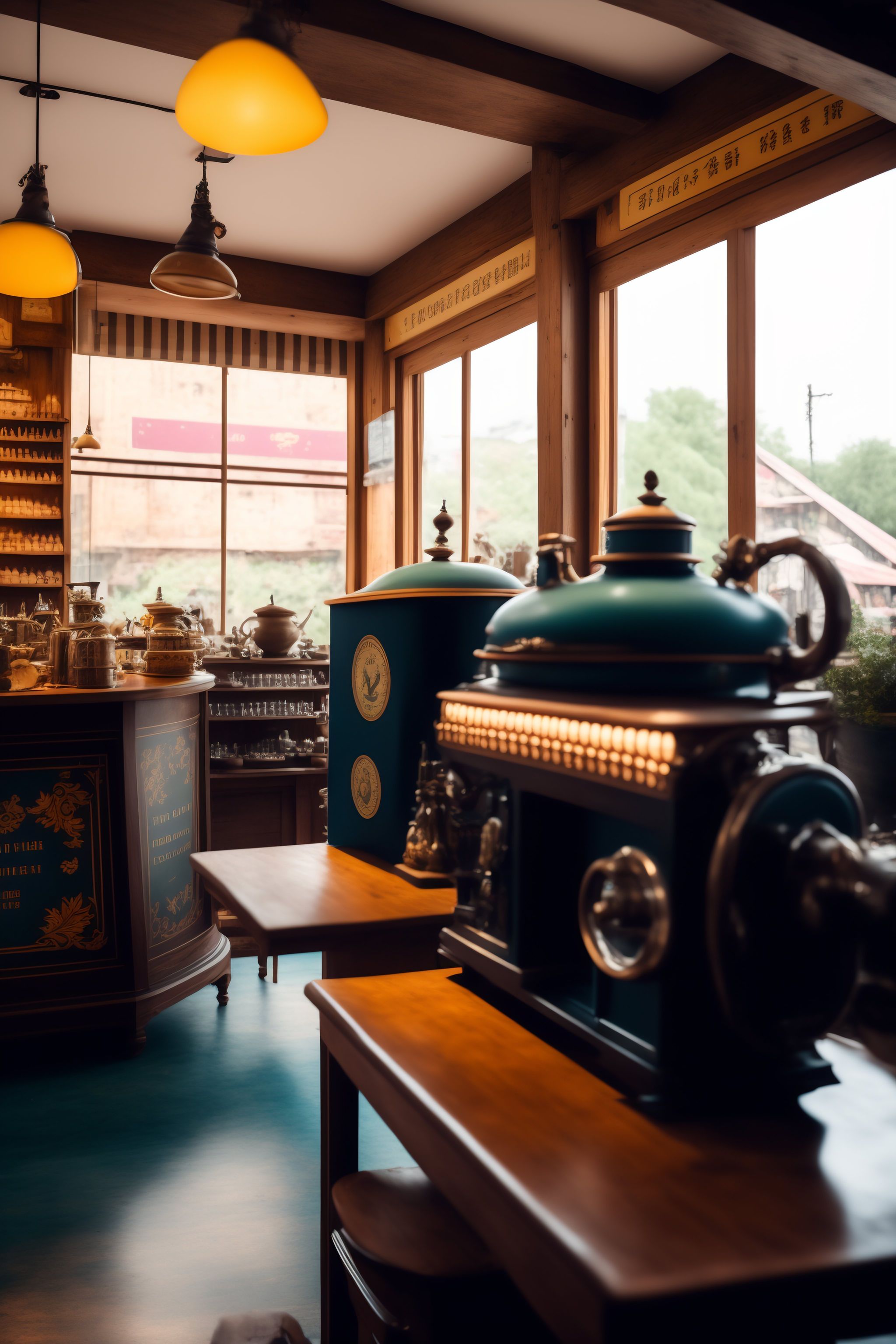 Inside view of an old tea shop which also has old sewing machines