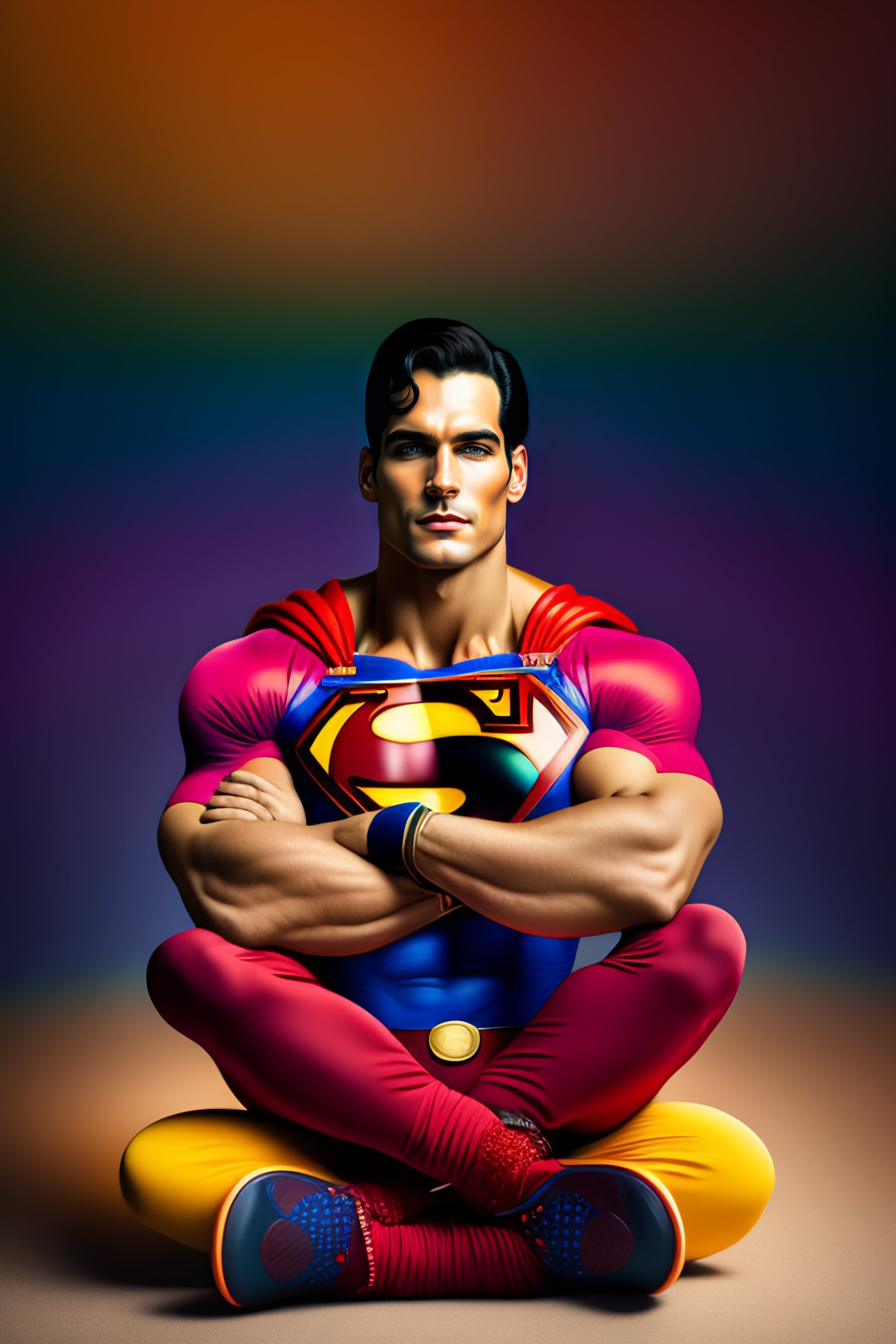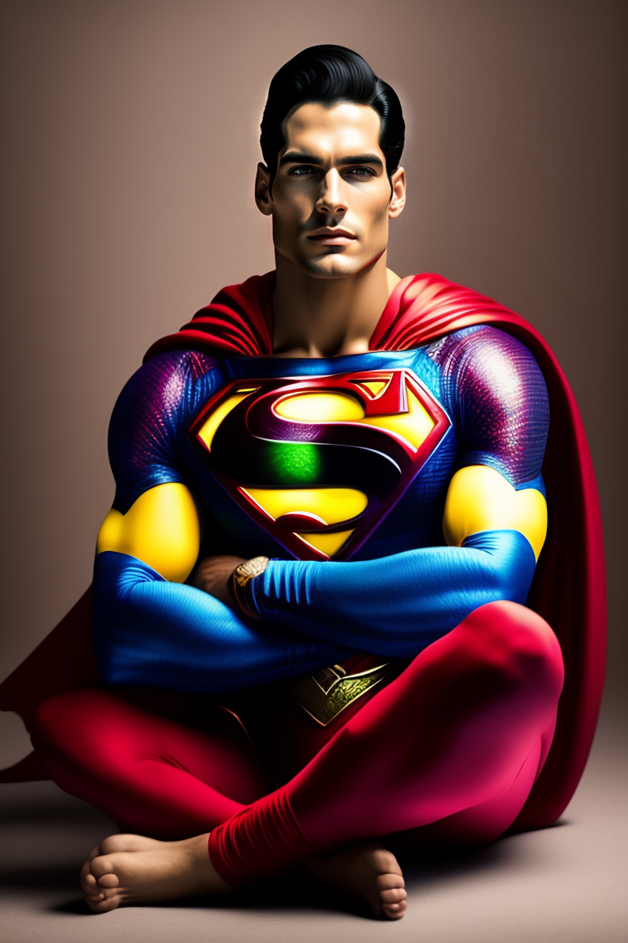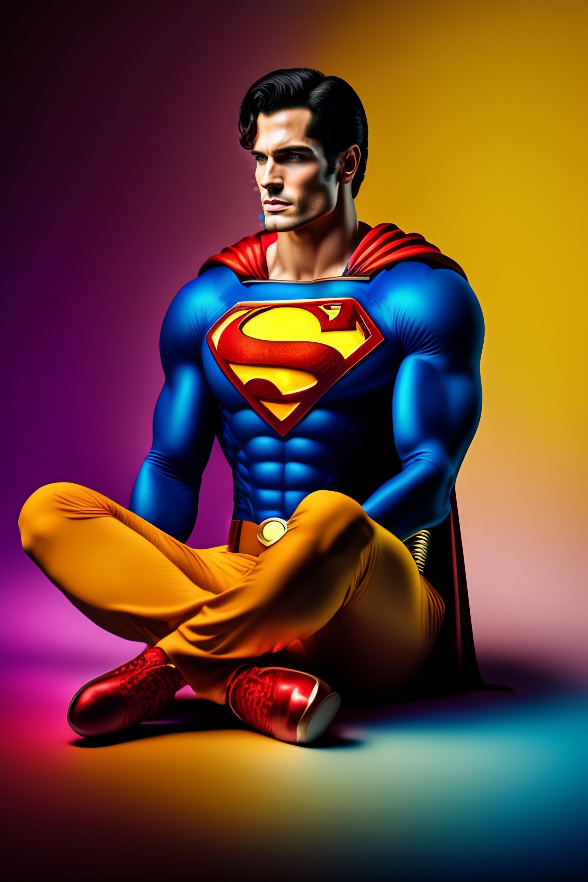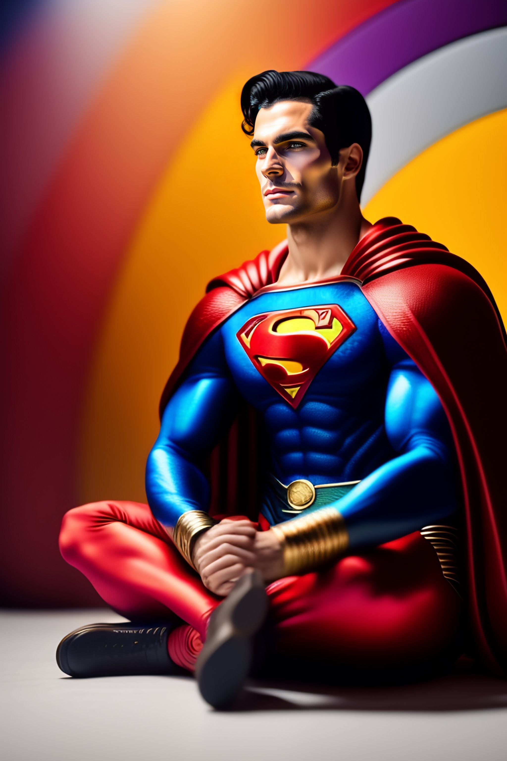 Full length photograph of superman sitting down sit head in his hands colourful like a photo and fine details with a white background