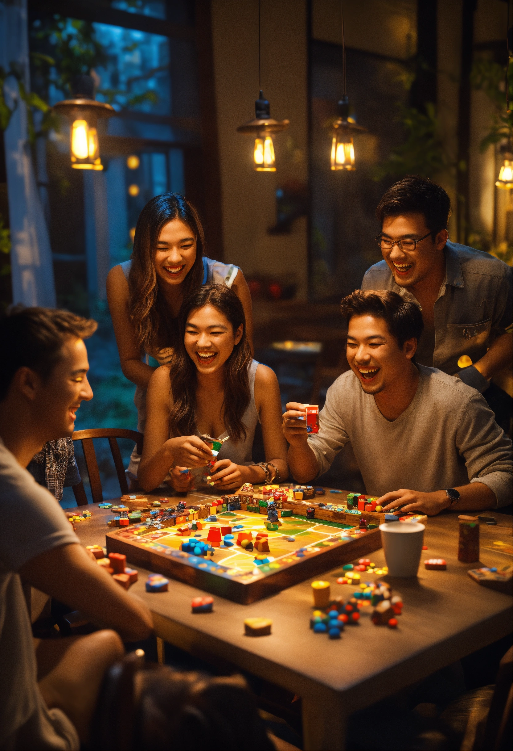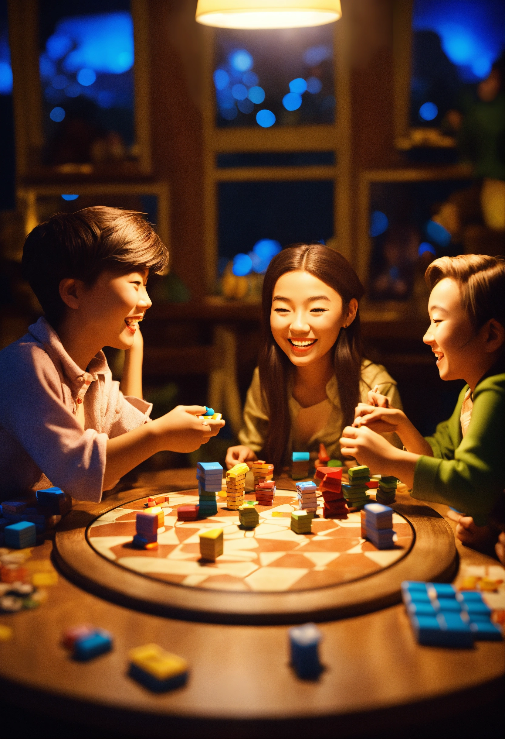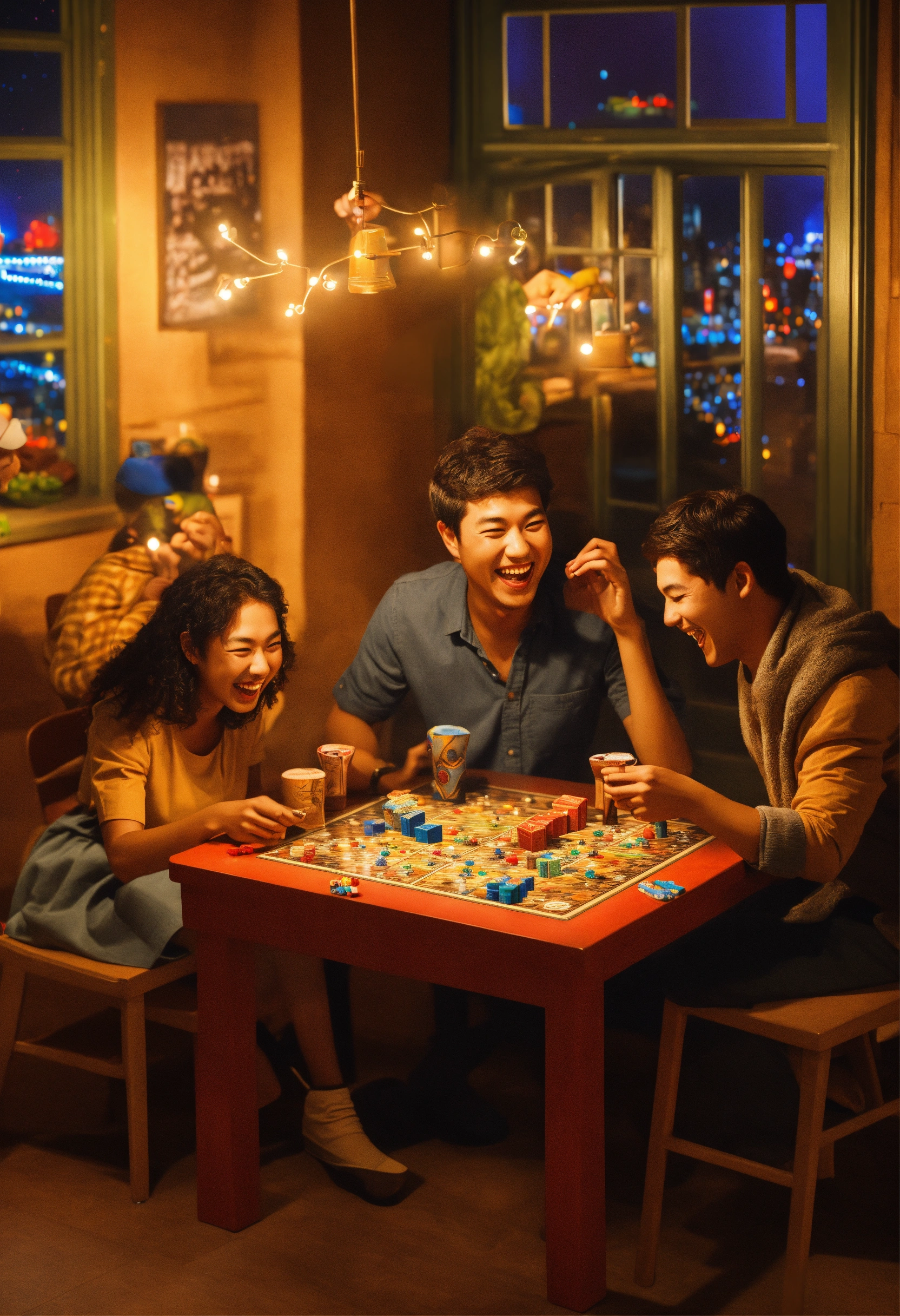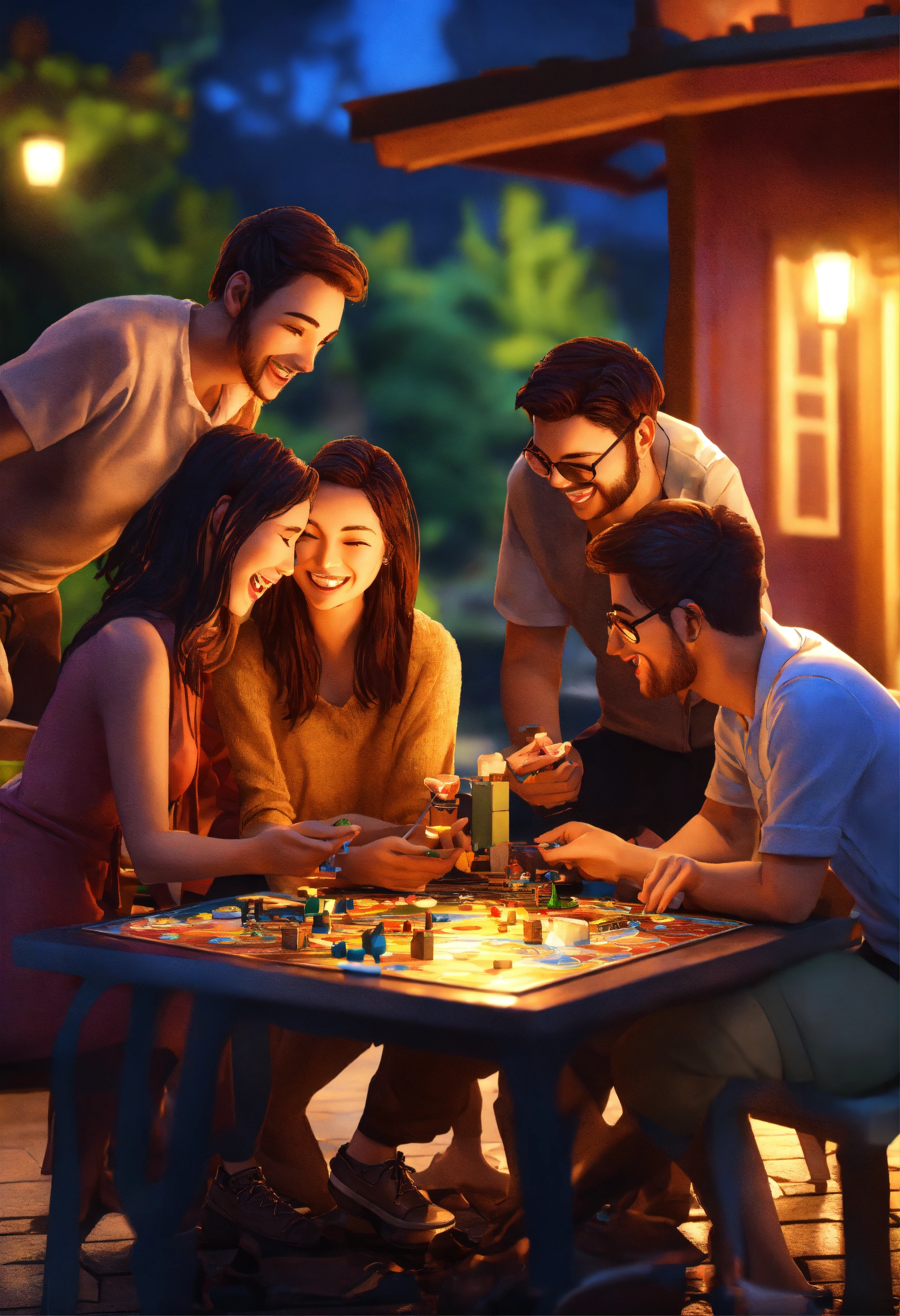 3d art 3 friends playing board game by night lot of laugh around a table of 3 table with other people