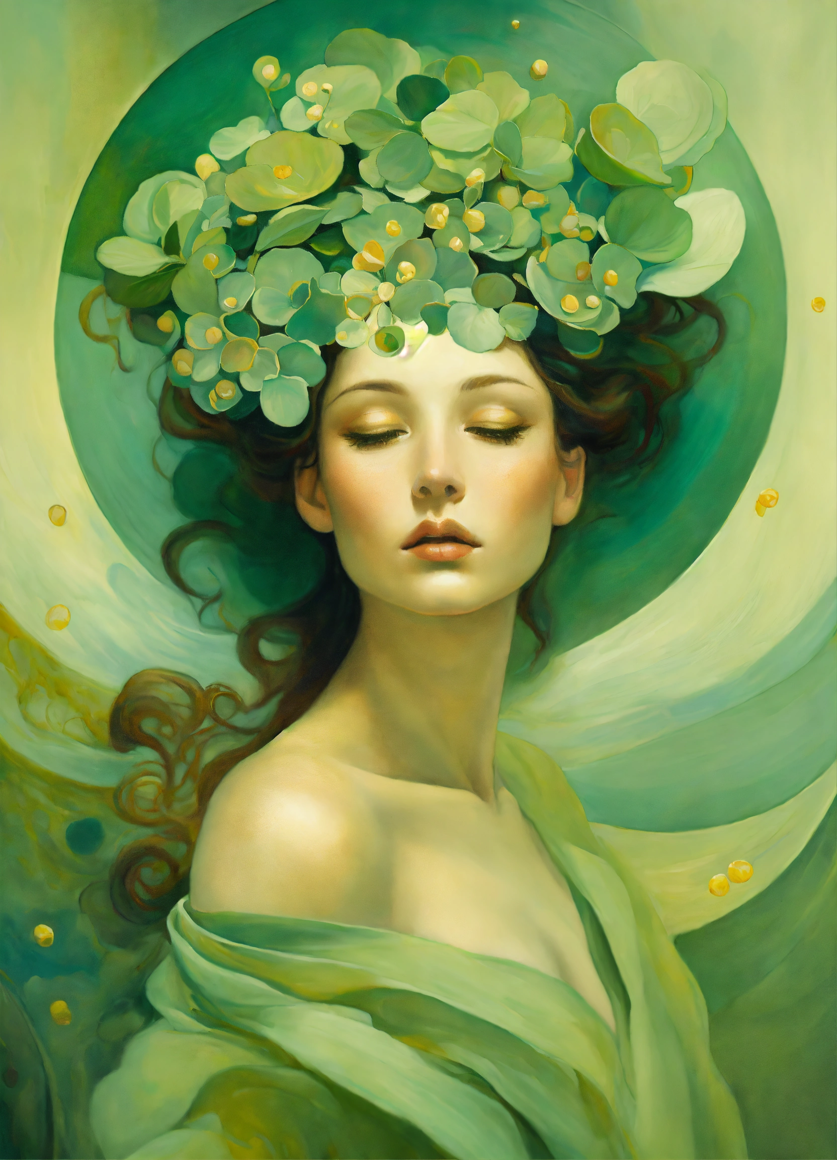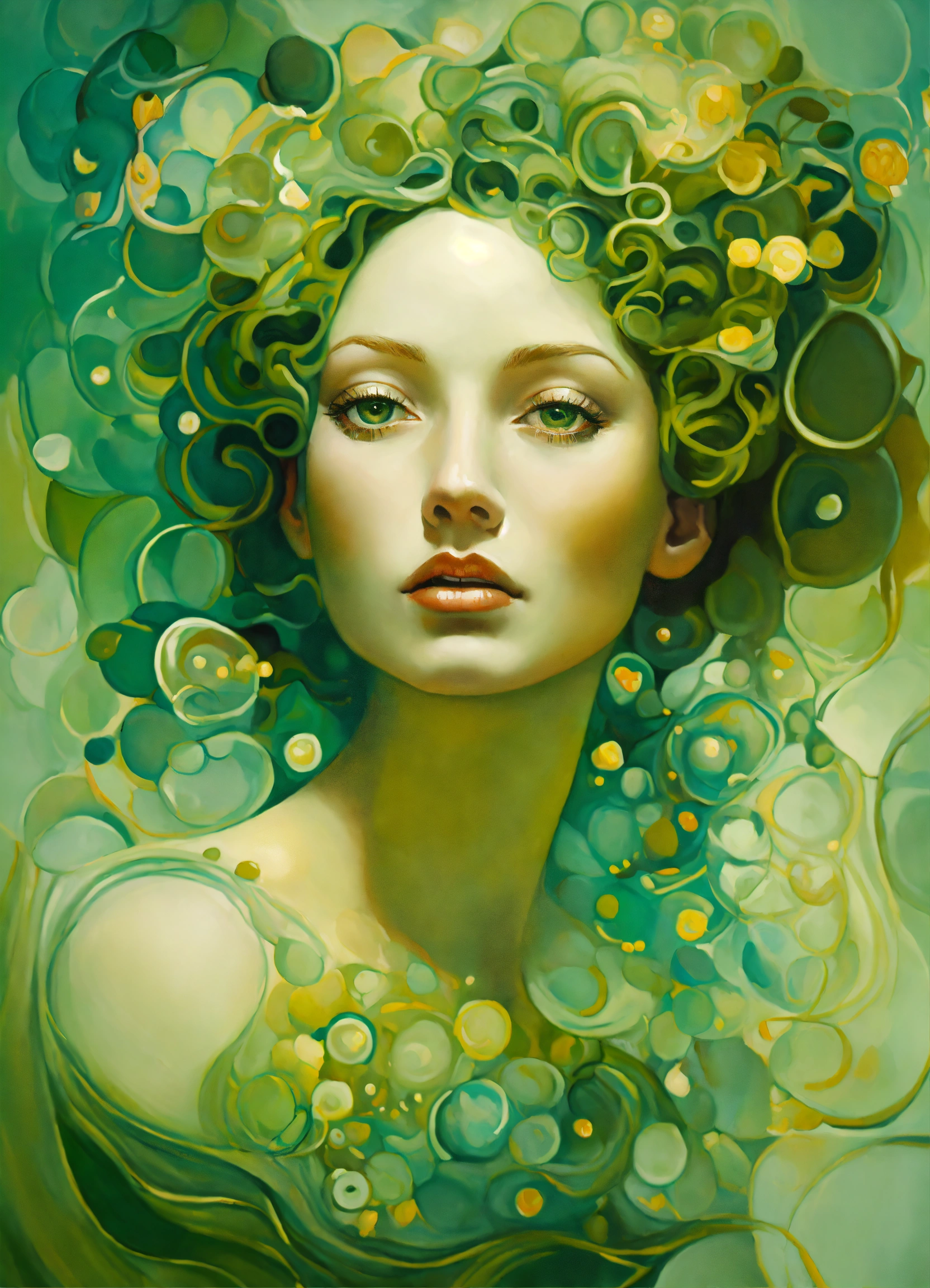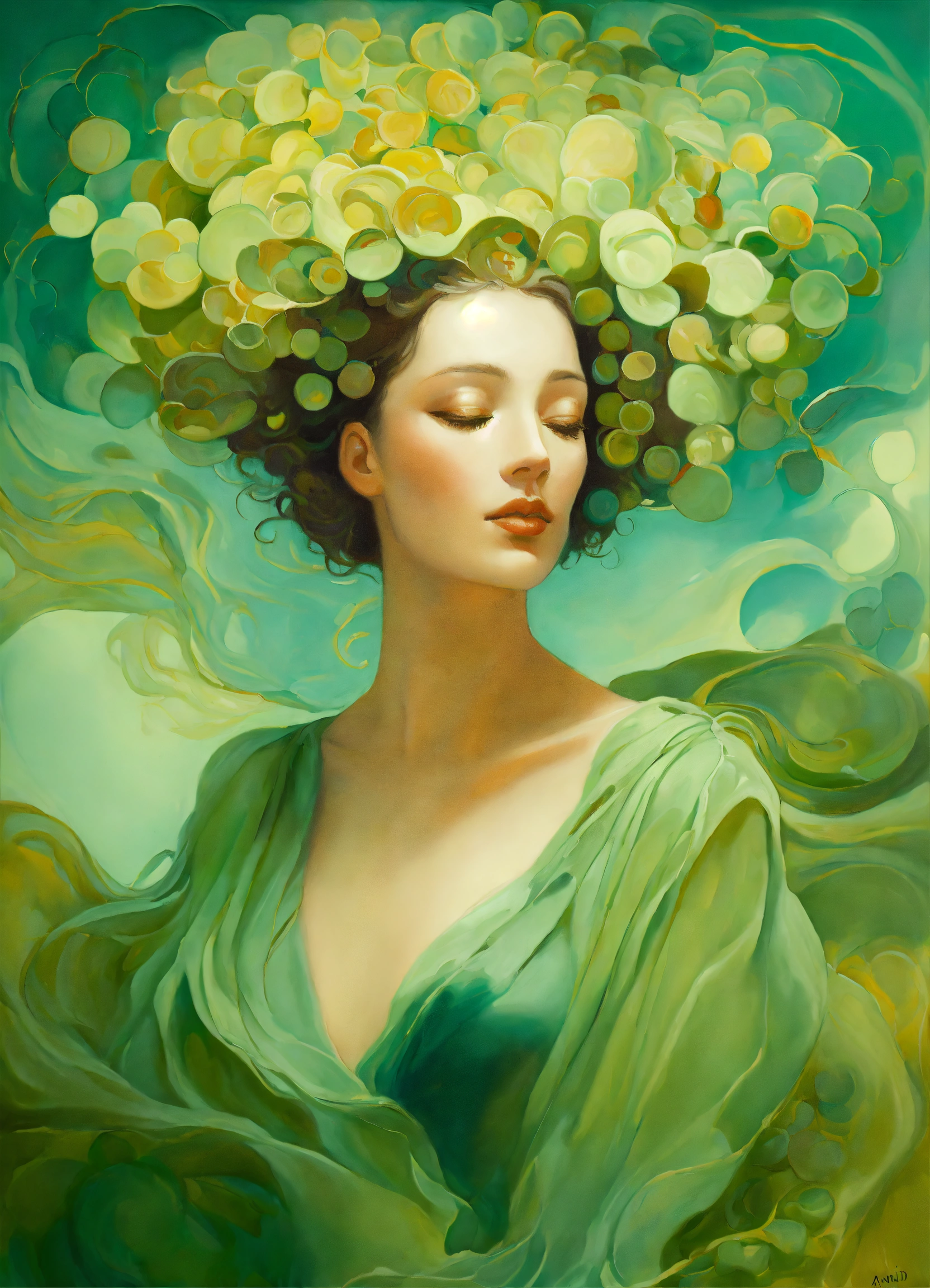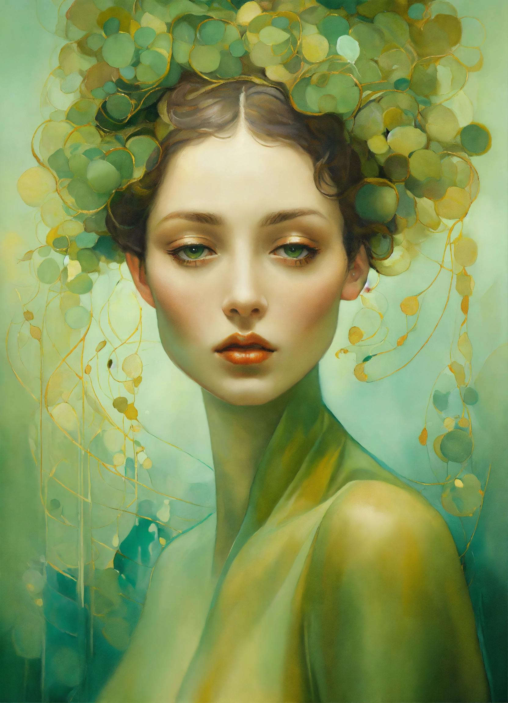Oil painting surreal abstract figure, sage green, by salvador dali, by gustav klimt, joyful, by anna dittman, by gustav klimt