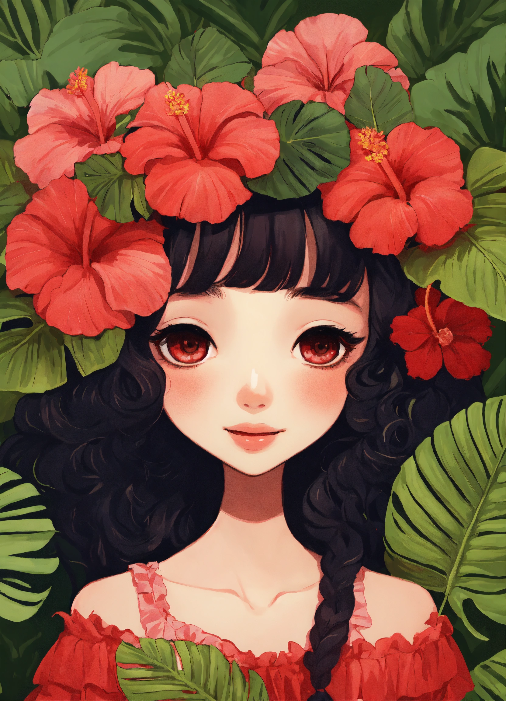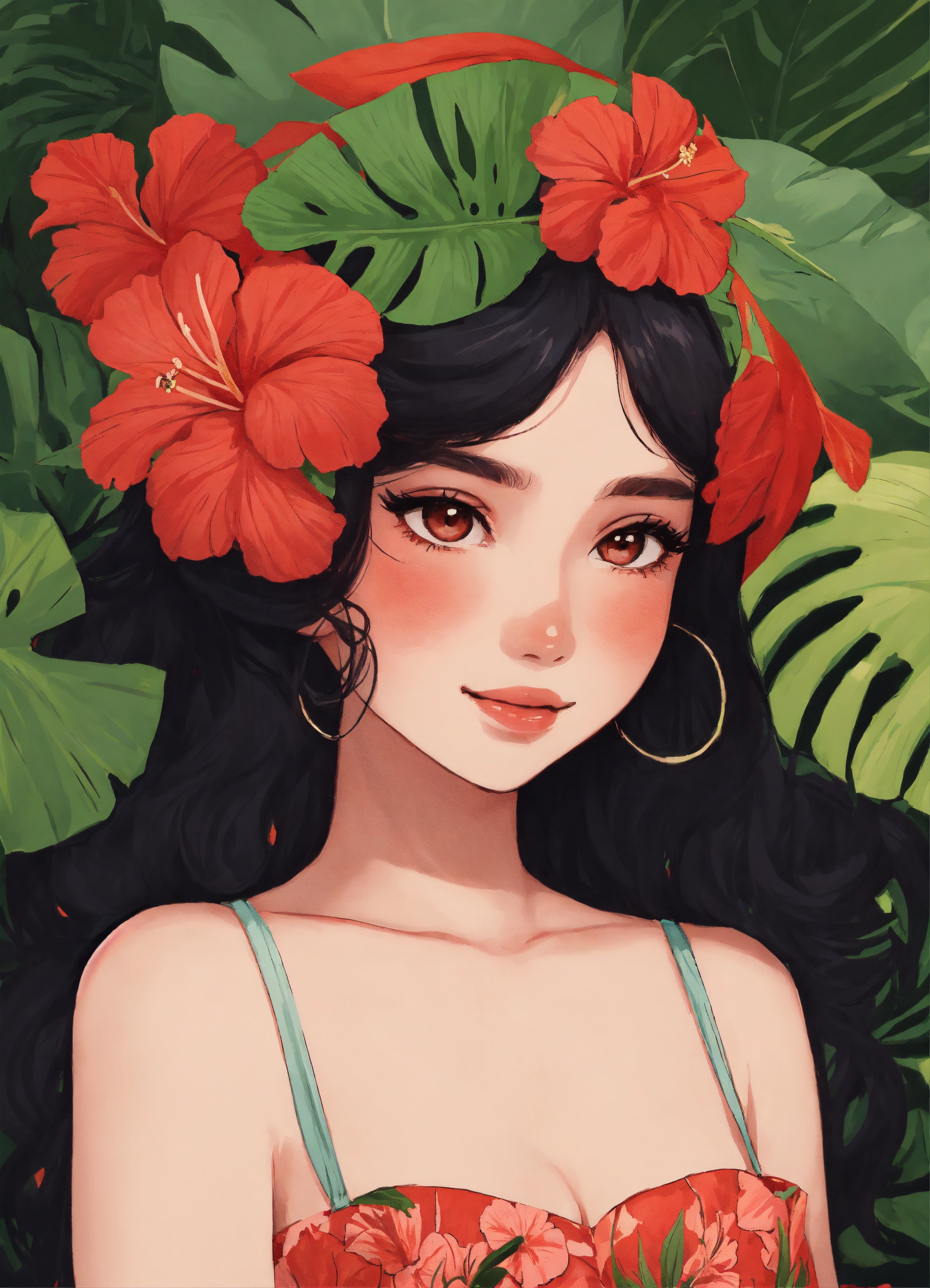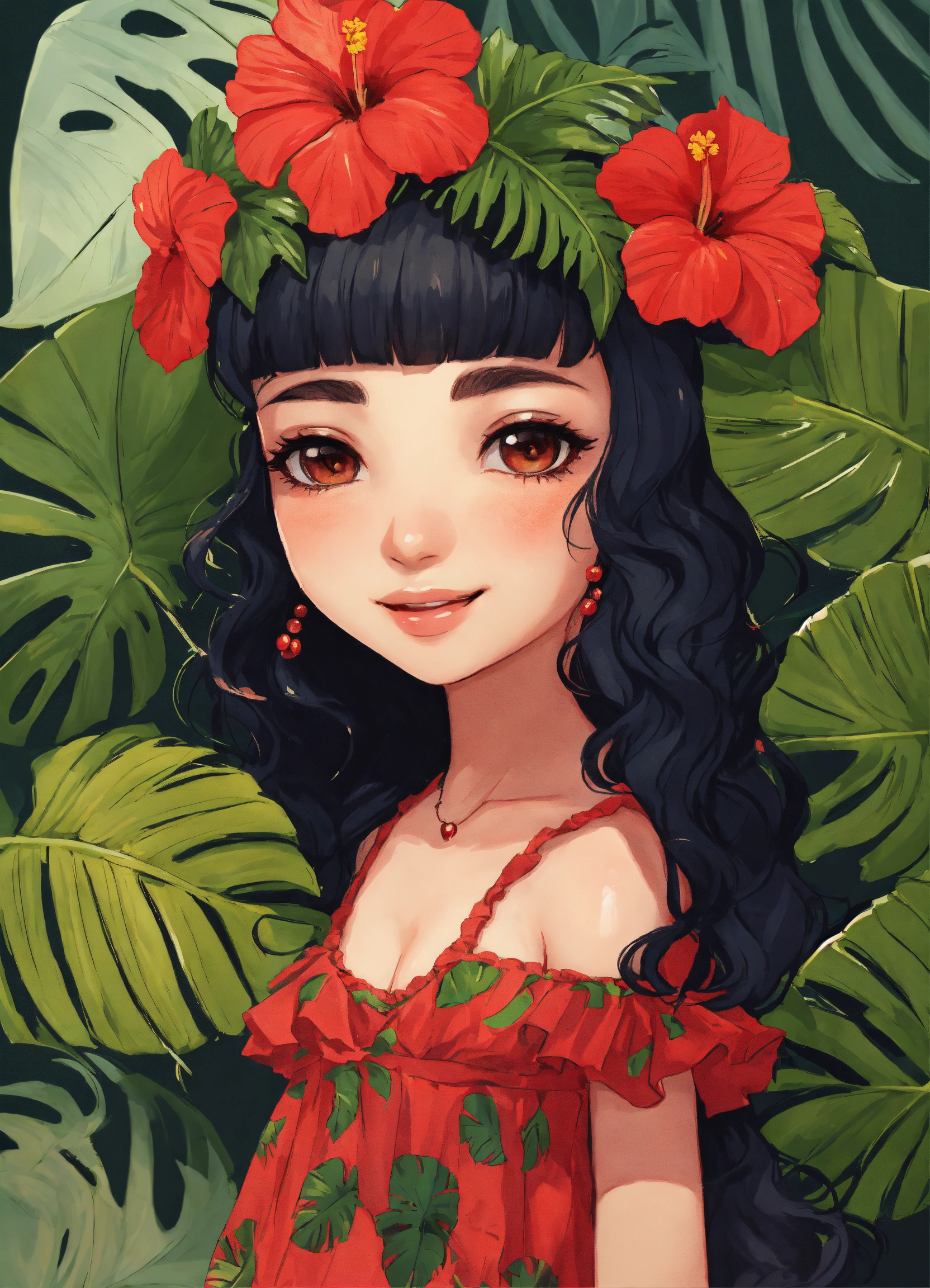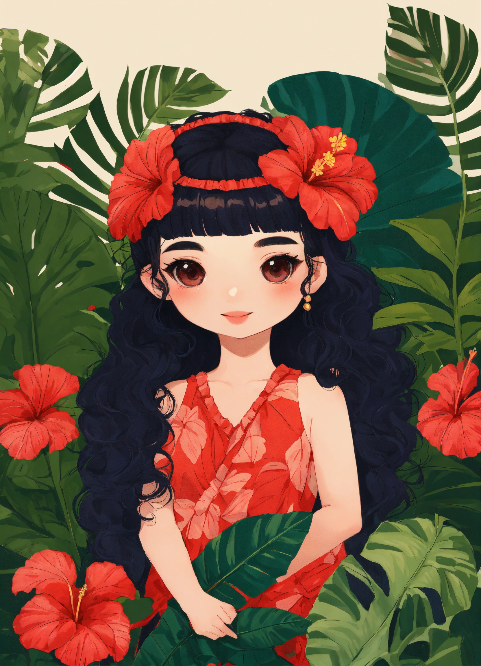Cute cute for three girl illustration, girl with a hibiscus headdress on her head, she has a red frilly cloth wrapped around her chest, she wears a skirt made of ti leaf, shy smile, the background is a monstera, black hair