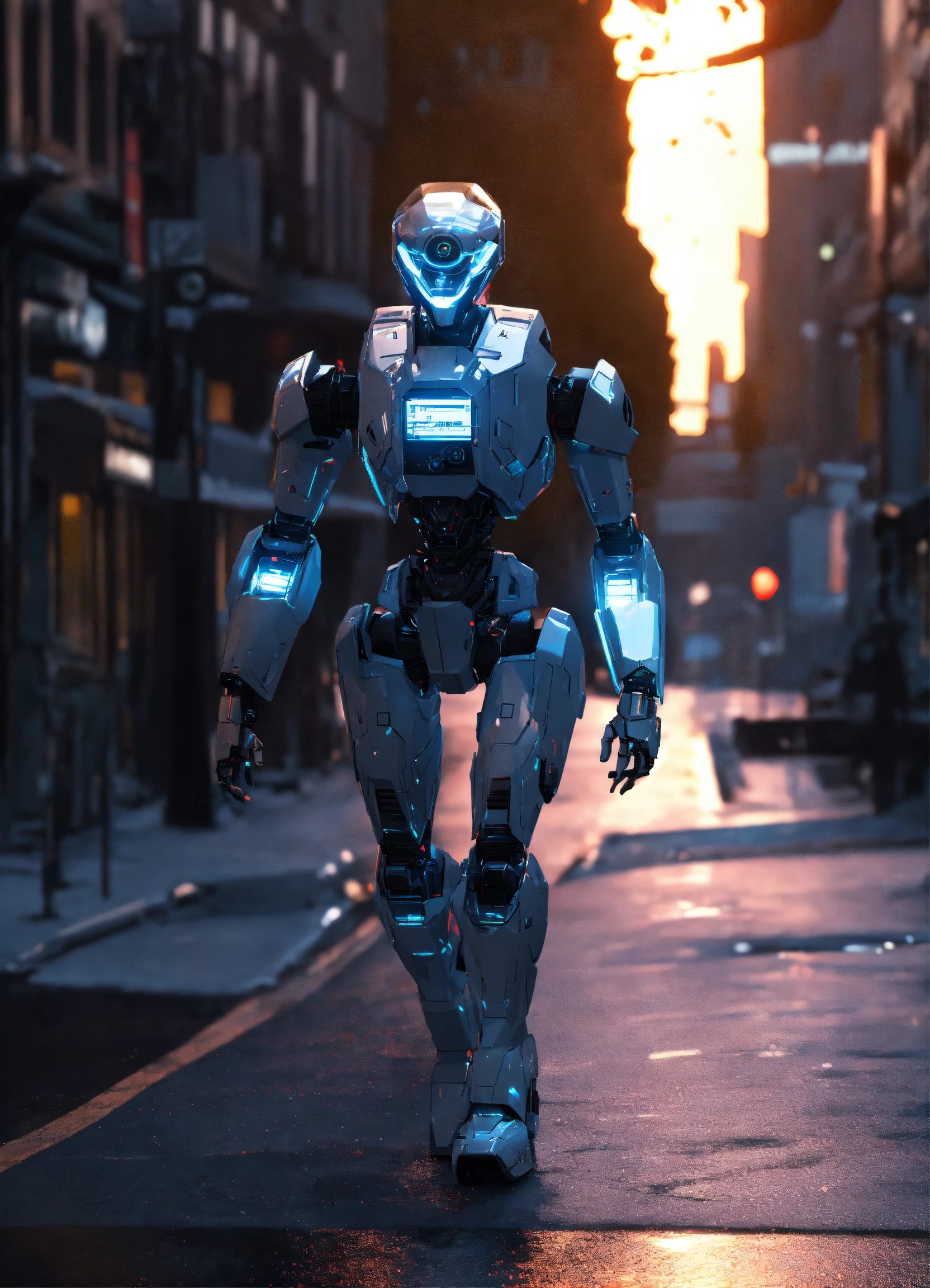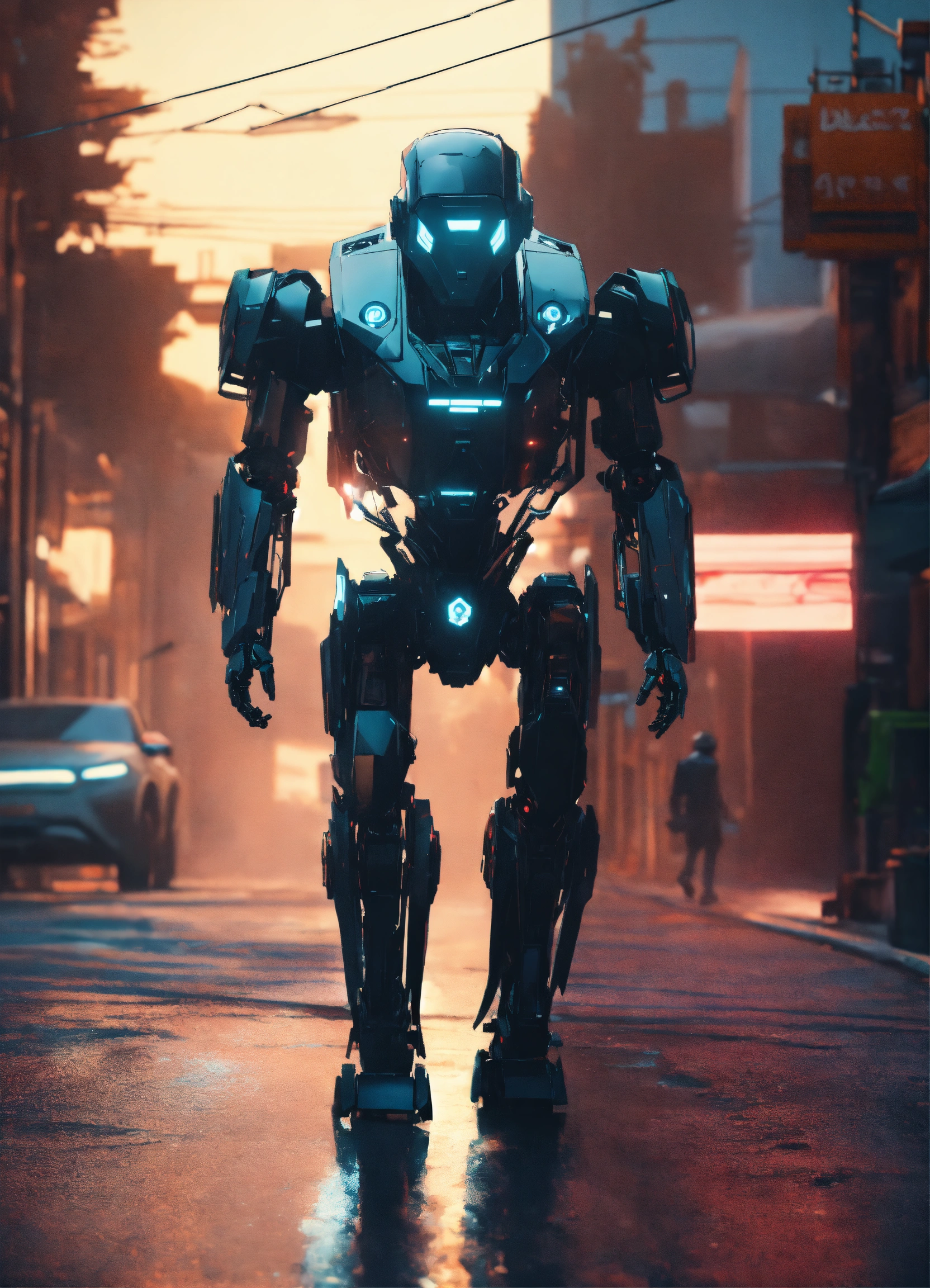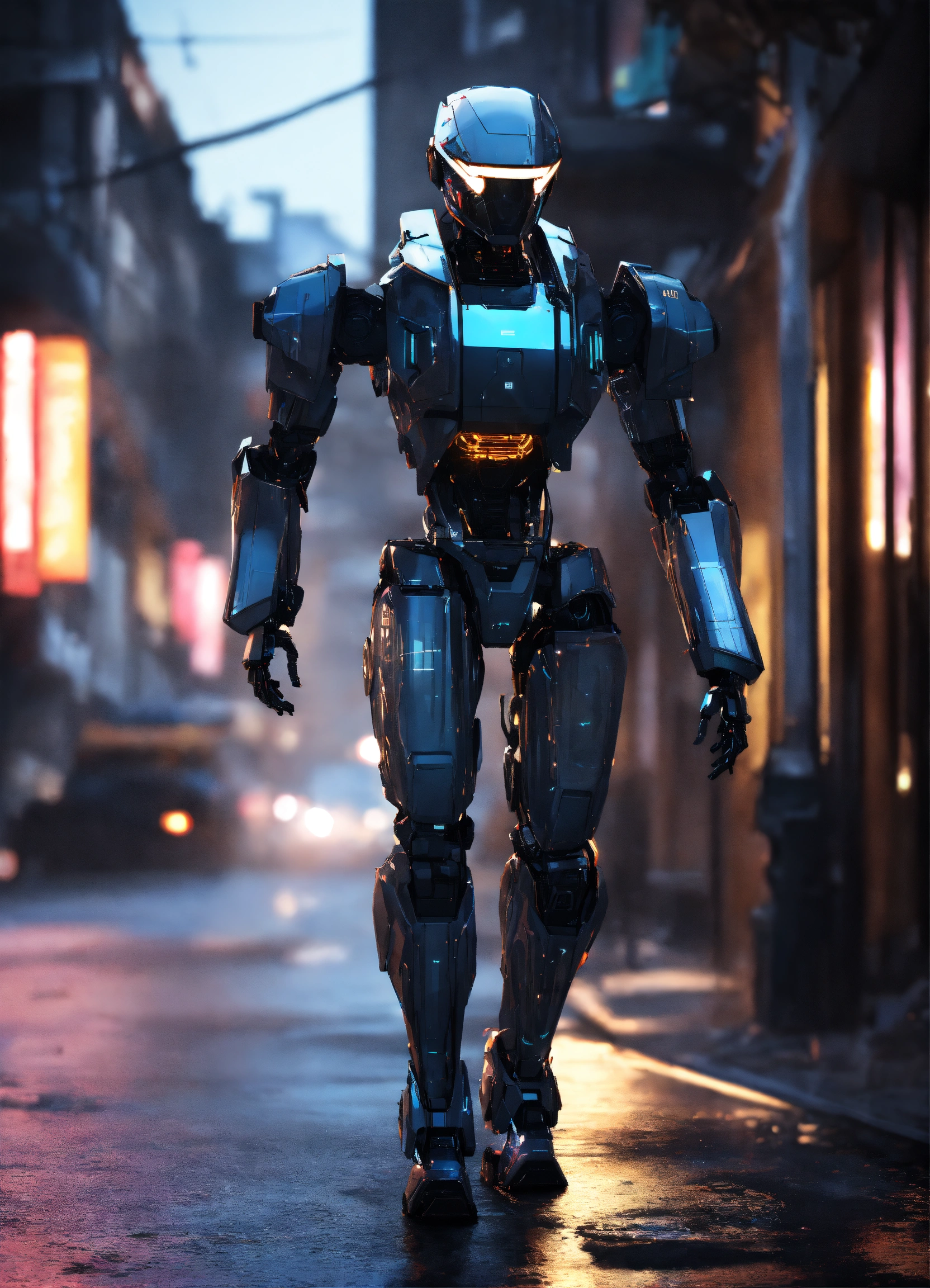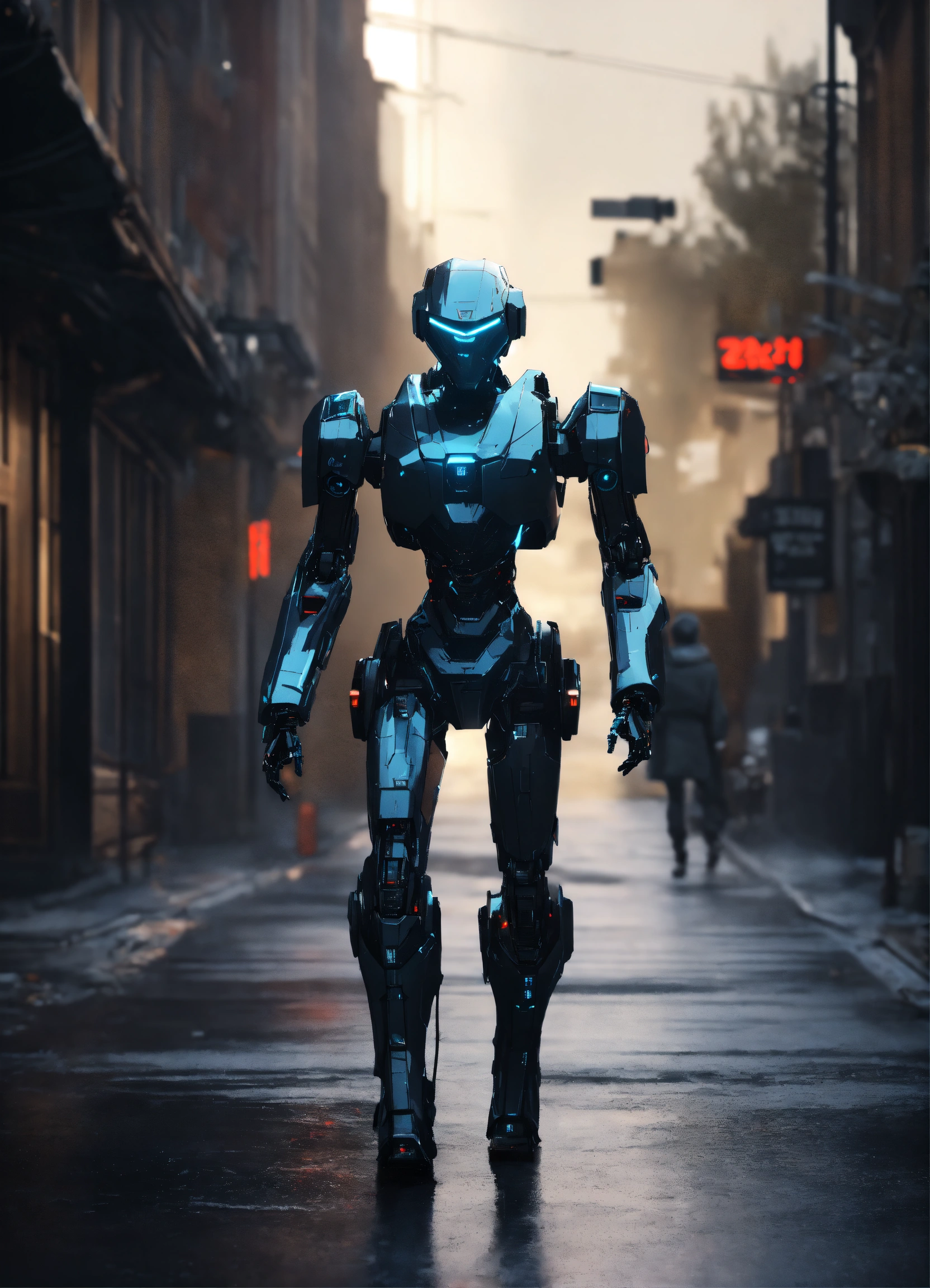 Dark aesthetic, a translucent sci-fi robot walking down the street, polycarbonate frame, stunning unreal engine render, 8k environment