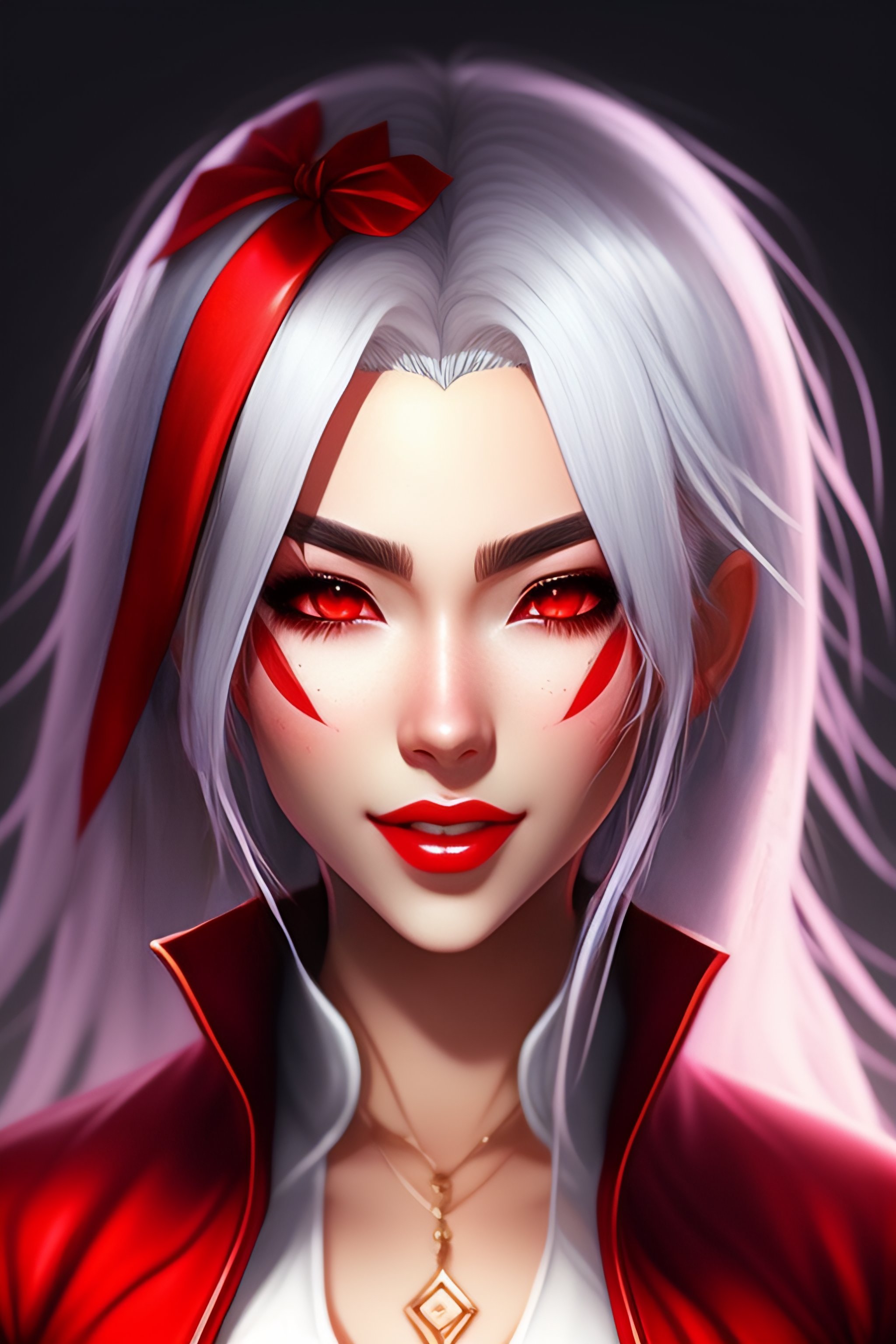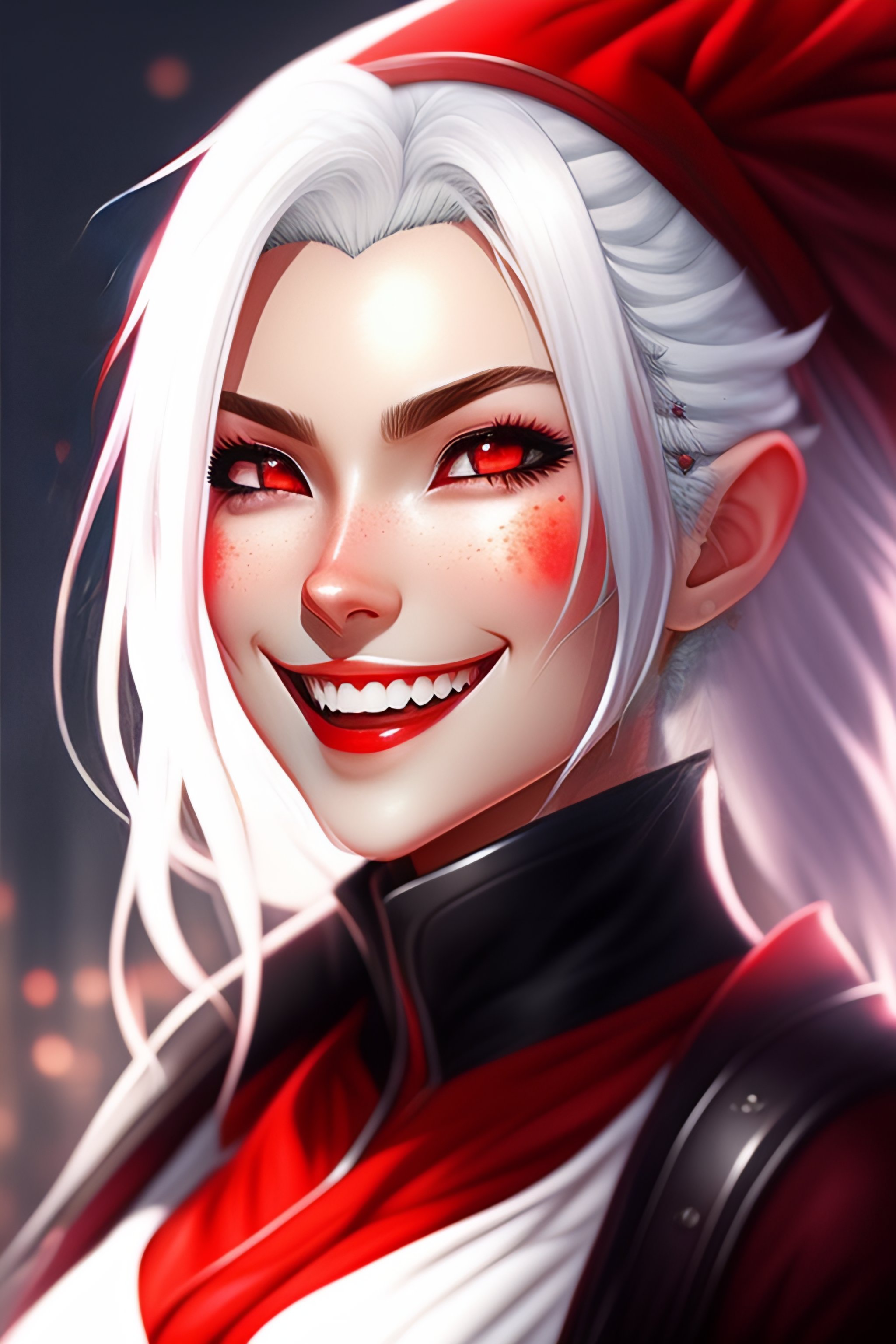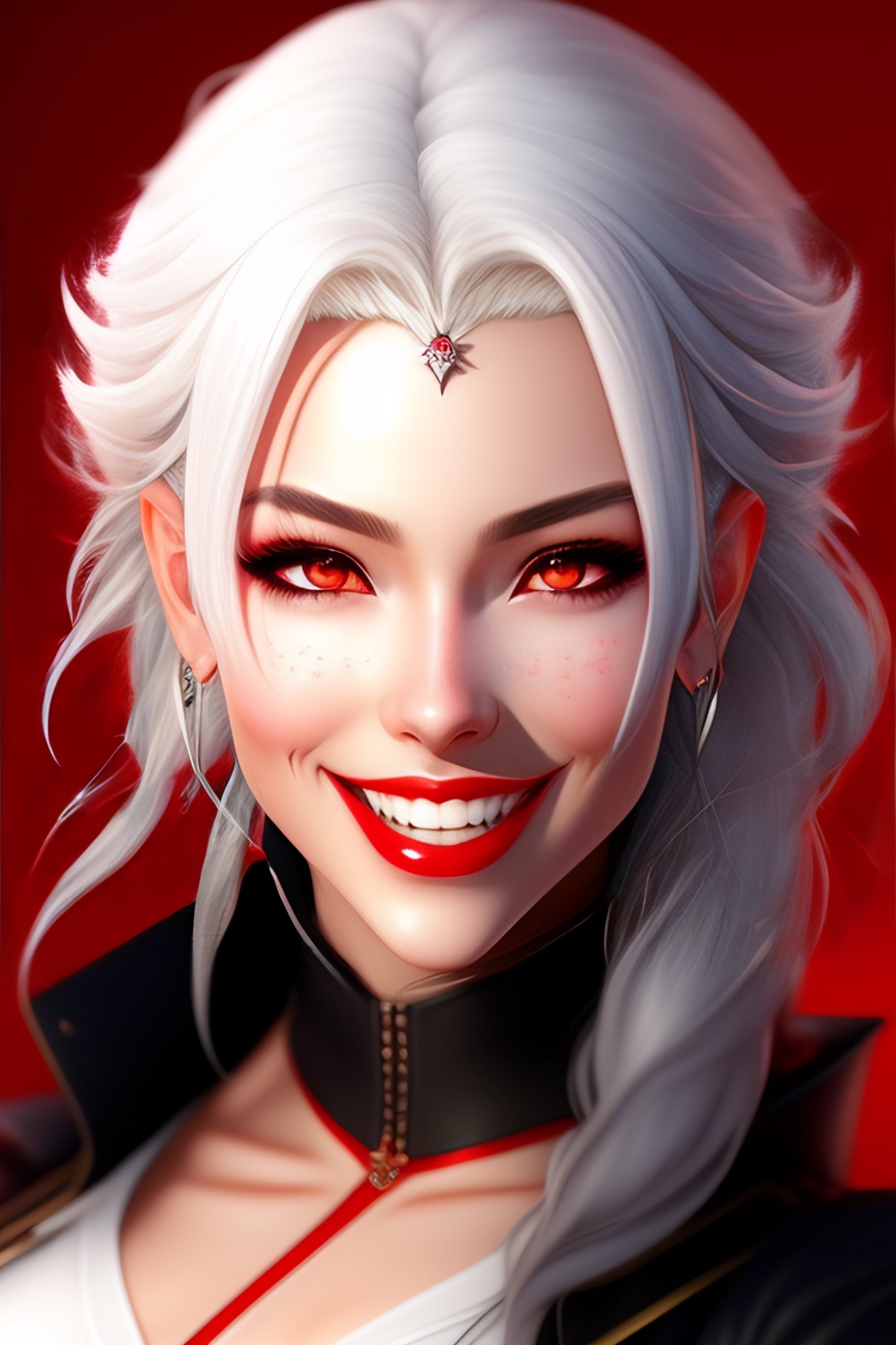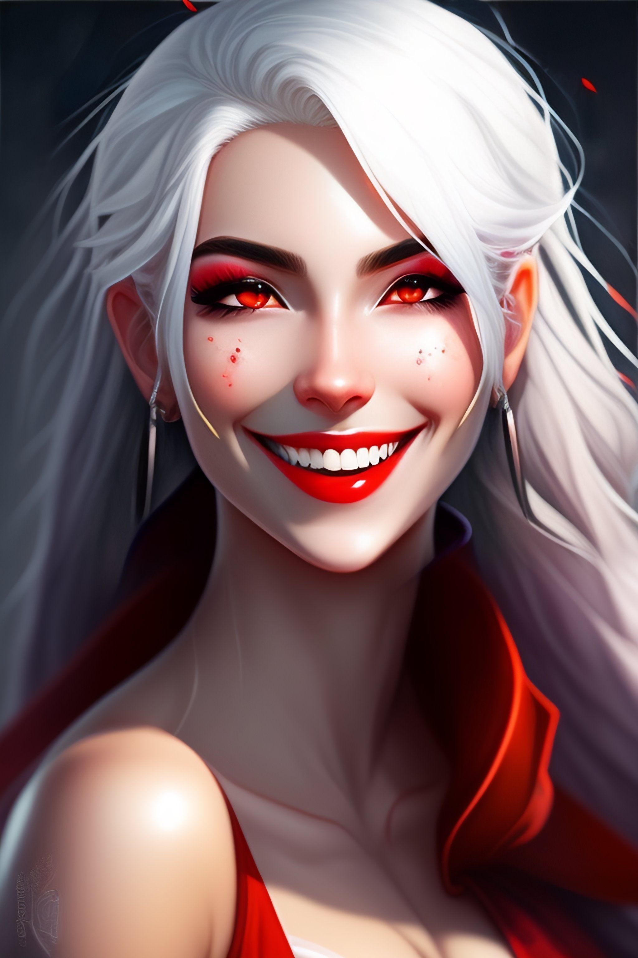 Anime girl with white hair and red eyes, open mouth, vampire teeth, red eyes, happy, looking up, grayscale with red iris