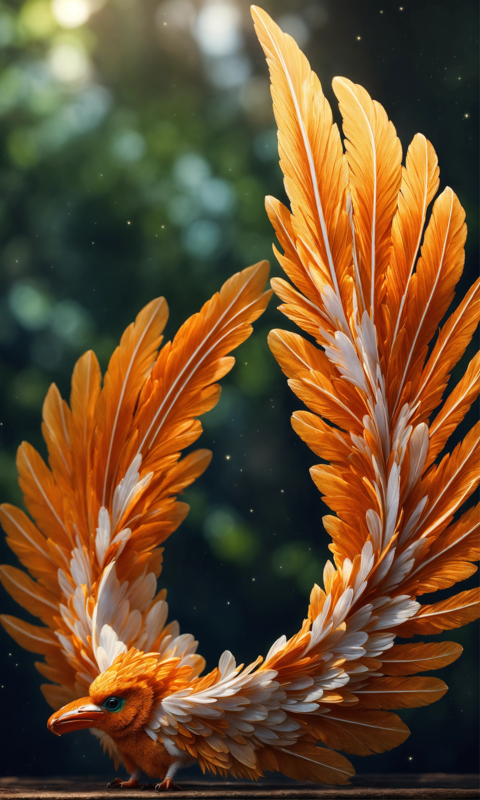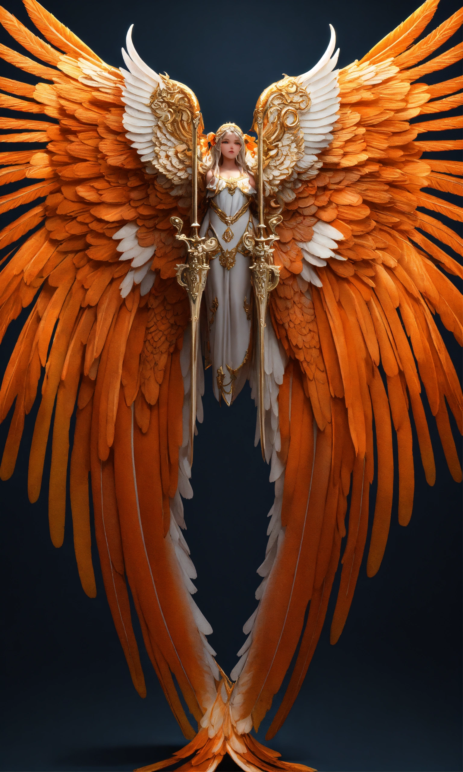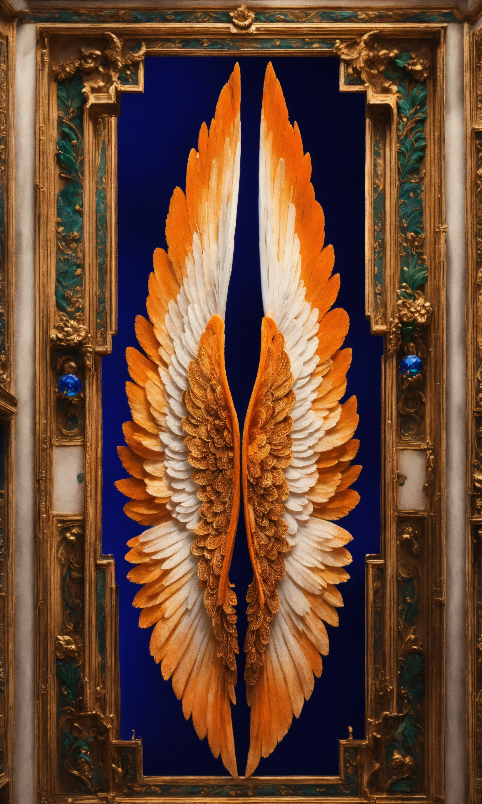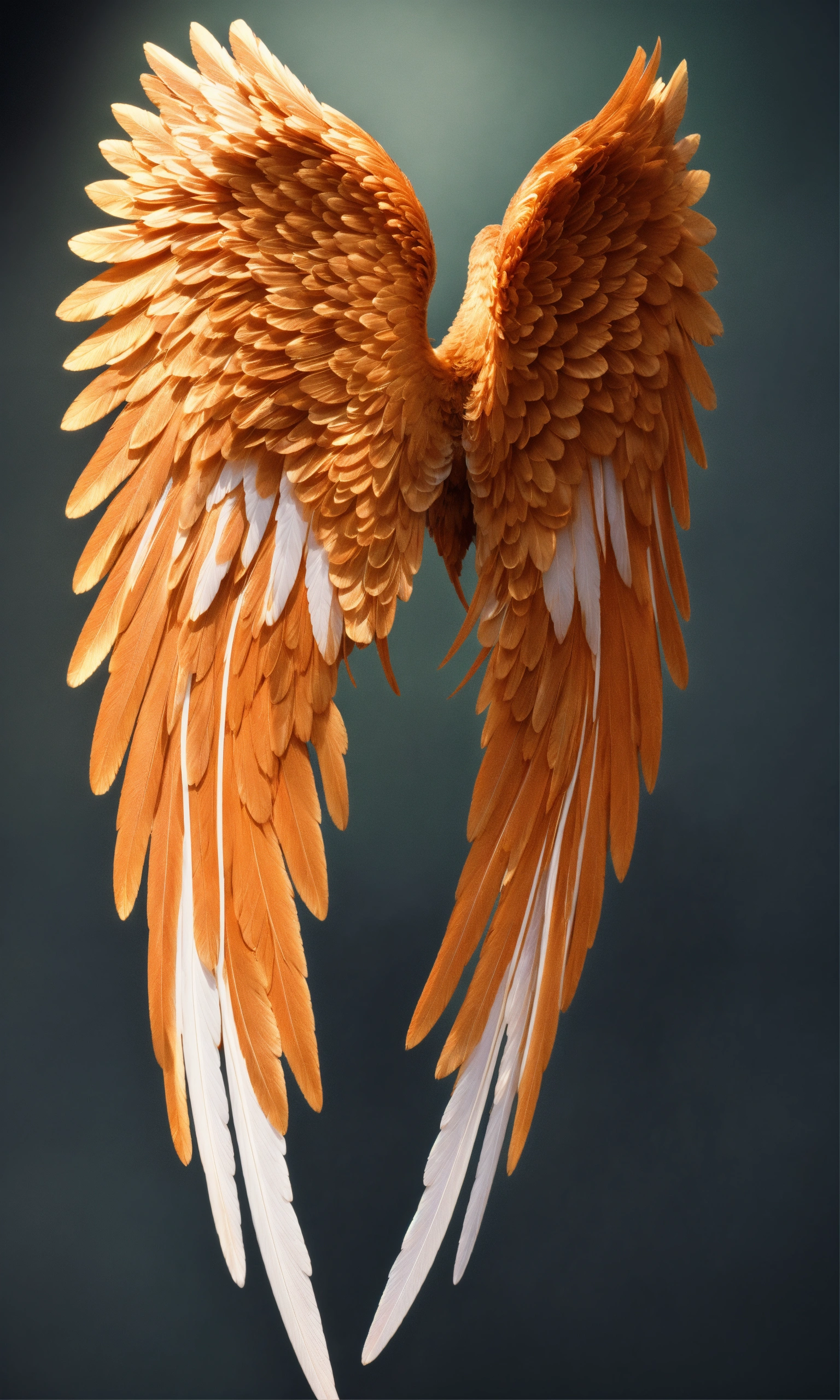 Beautiful and perfect small angel wings in orange with white, detailed and defined and at the same time some golden details. just a pair of small, complete orange wings with white. hyper-detailed and hyper-realistic wings. wings with a slight decoration in shades of green and white. small wings complete both the right wing and the left wing, the background is dark blue, 3d, masterpiece. hd. realism. high resolution. high quality. digital art. 8k