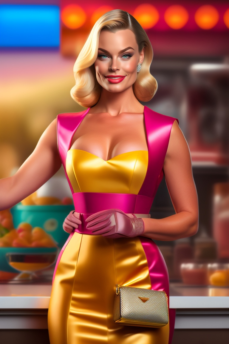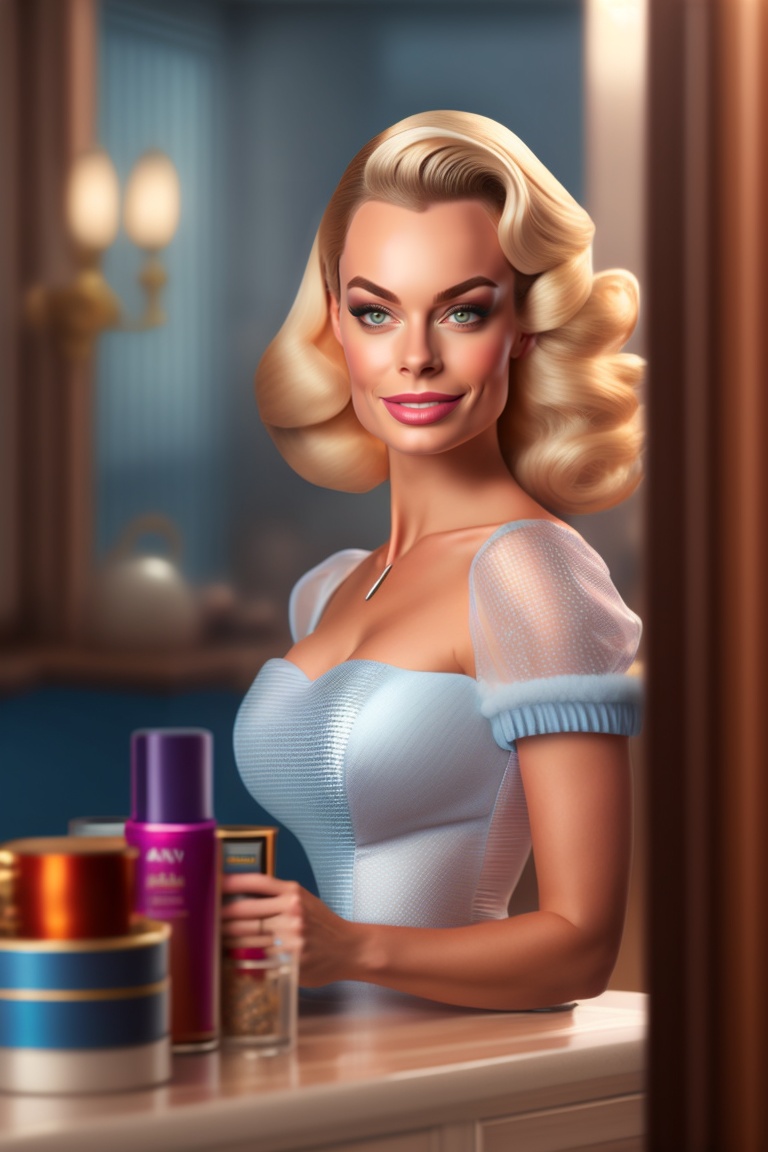 Margot robbie a barbie dressed like a housewife, product photography, photo realistic, 4k, hdr, behance, flickr, studio lighting, full body shot, product