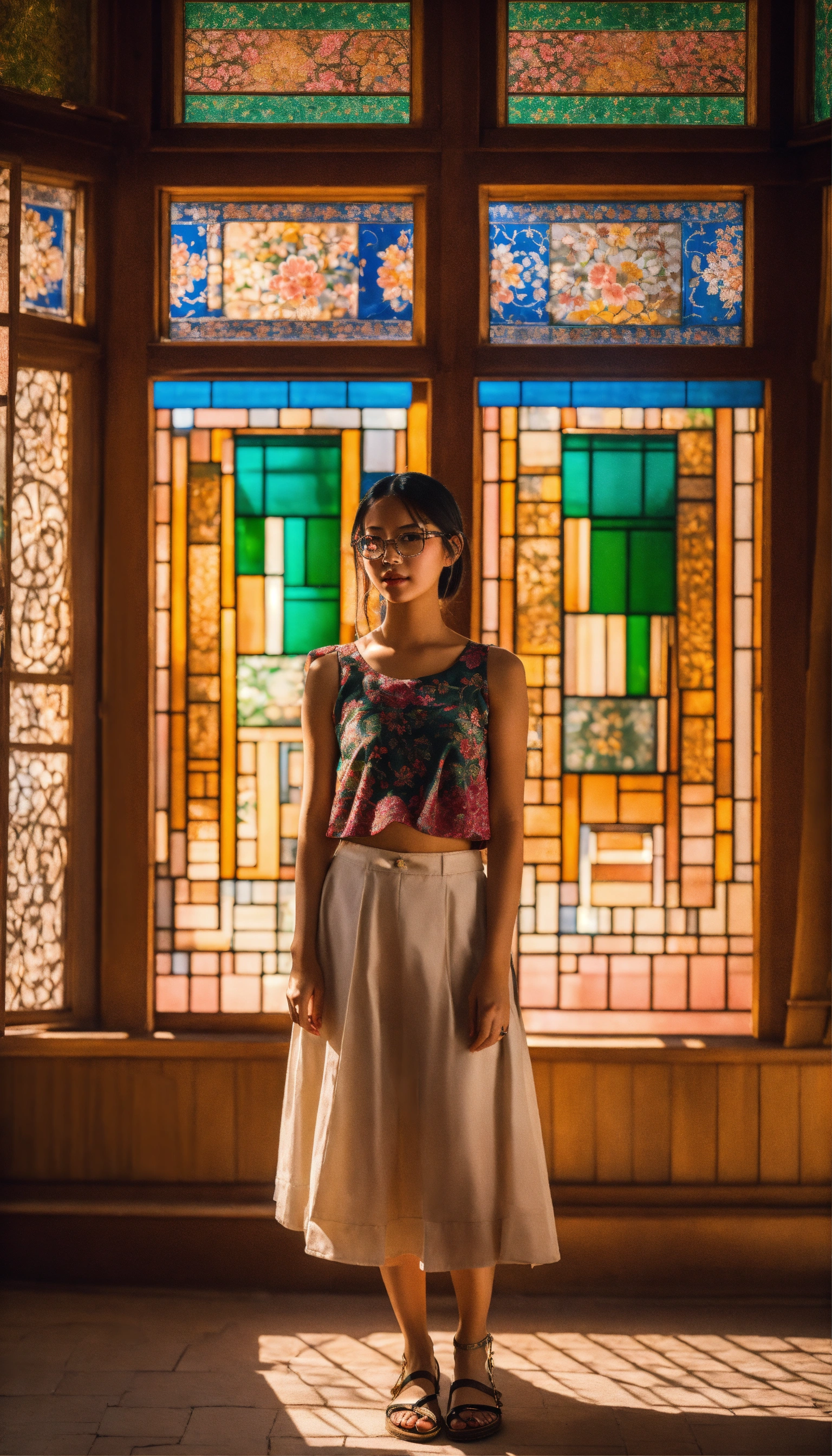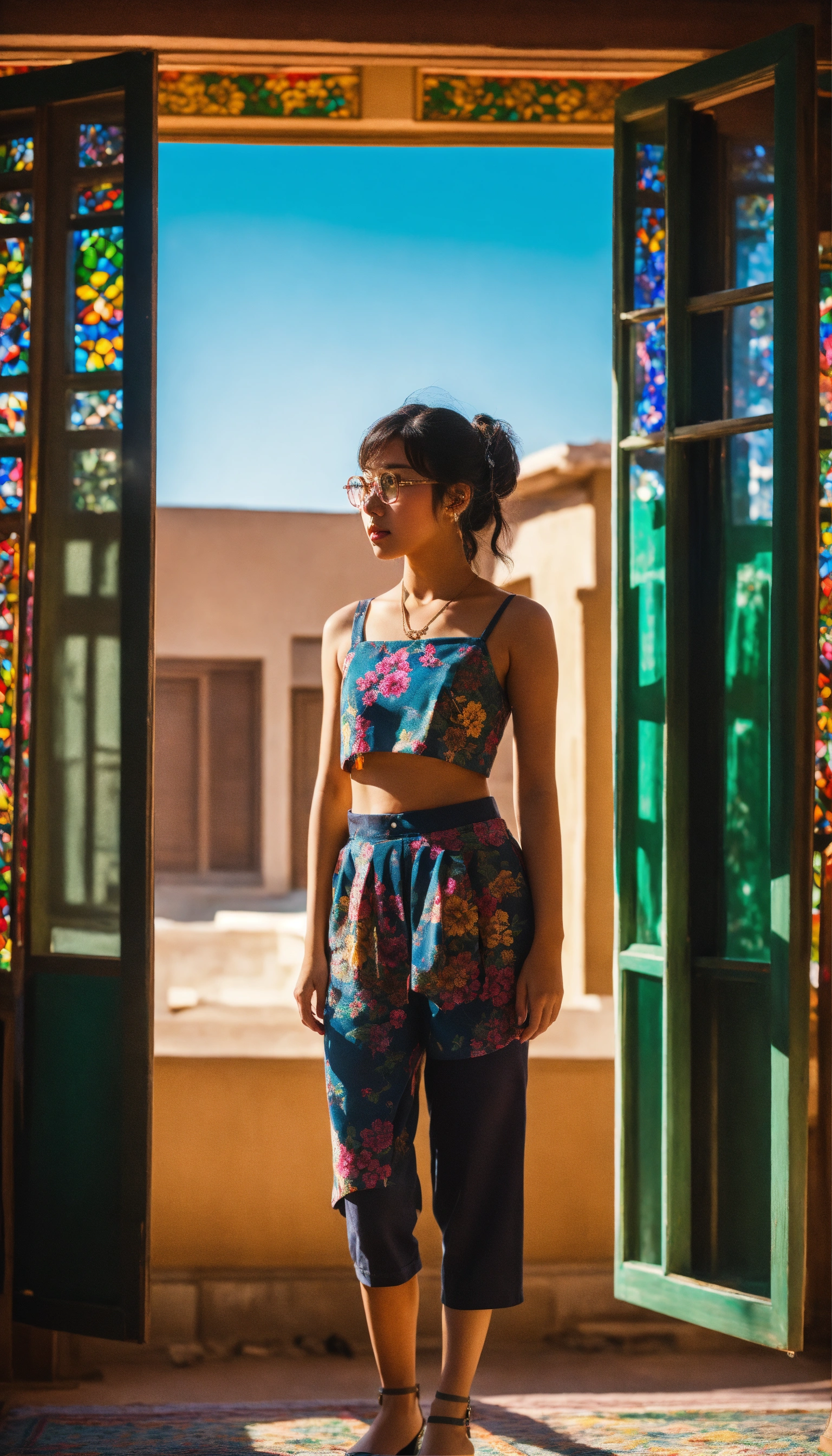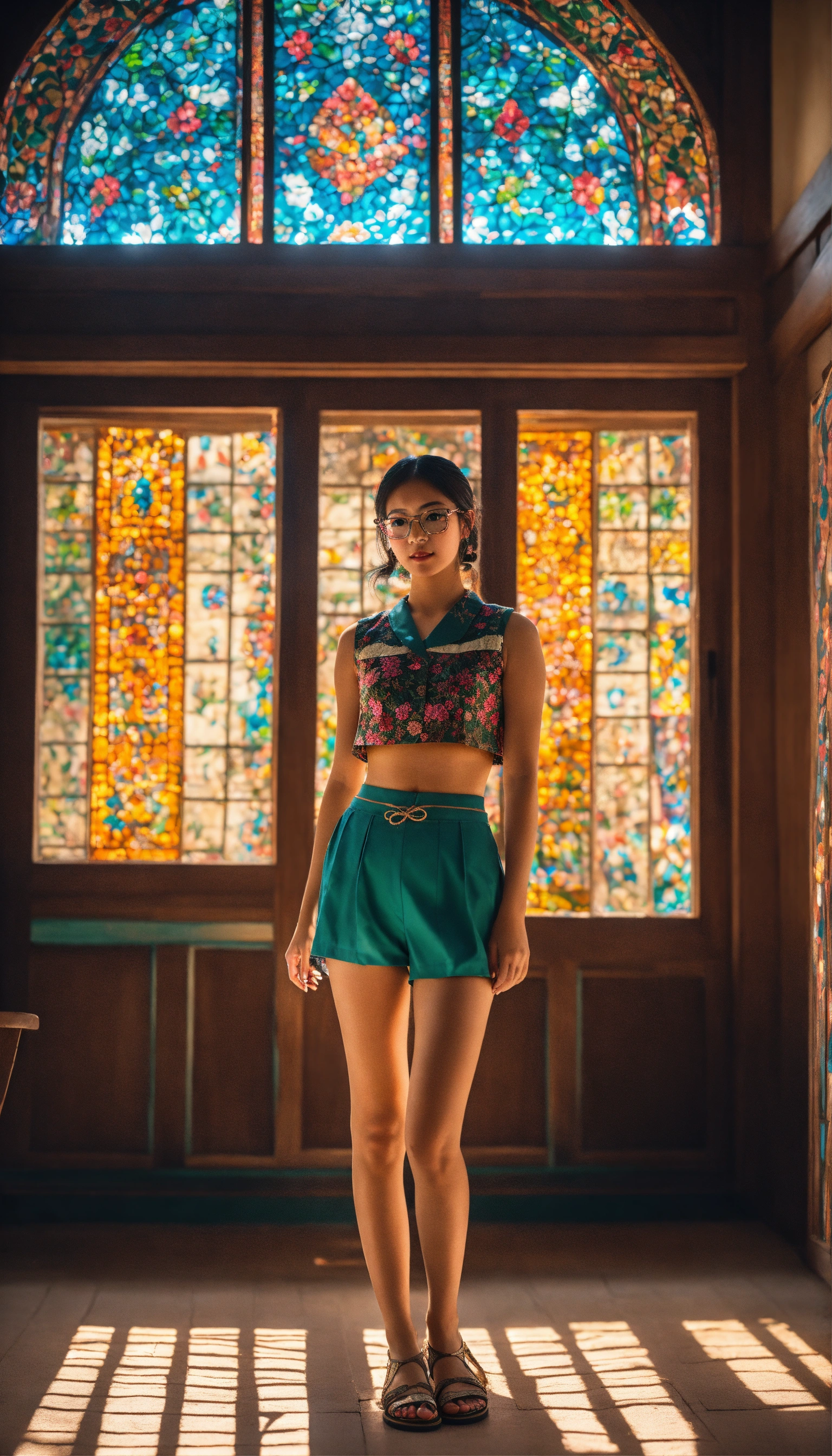 Portrait of a beautiful japanese schoolgirl wearing a crop top and a short with sandals, standing in a vintage house in yazd with colorful glasses on windows, highly detailed, 32k resolution, cinematic lighting, dramatic lighting, vertical shot, iranian architecture, persian culture background