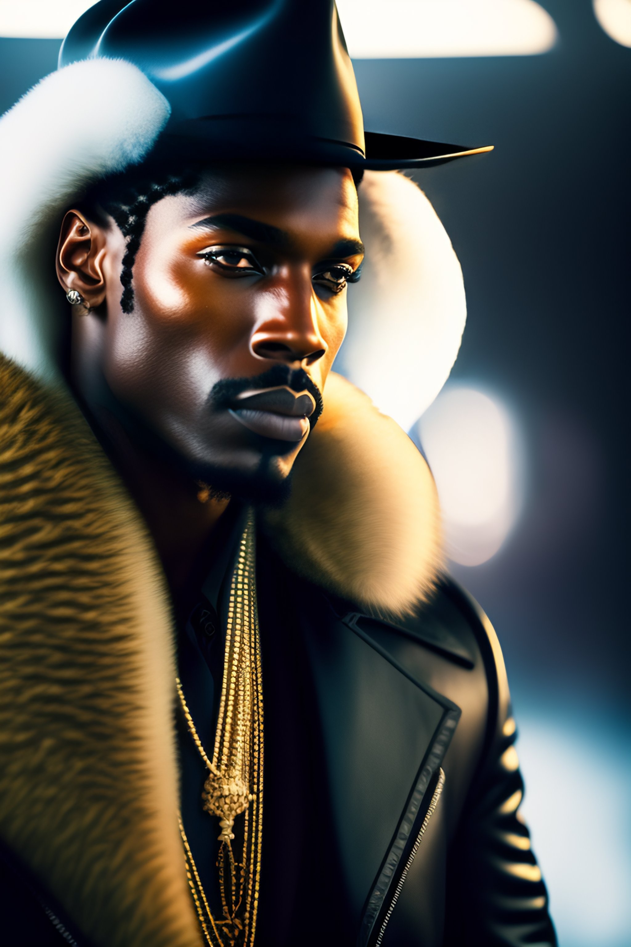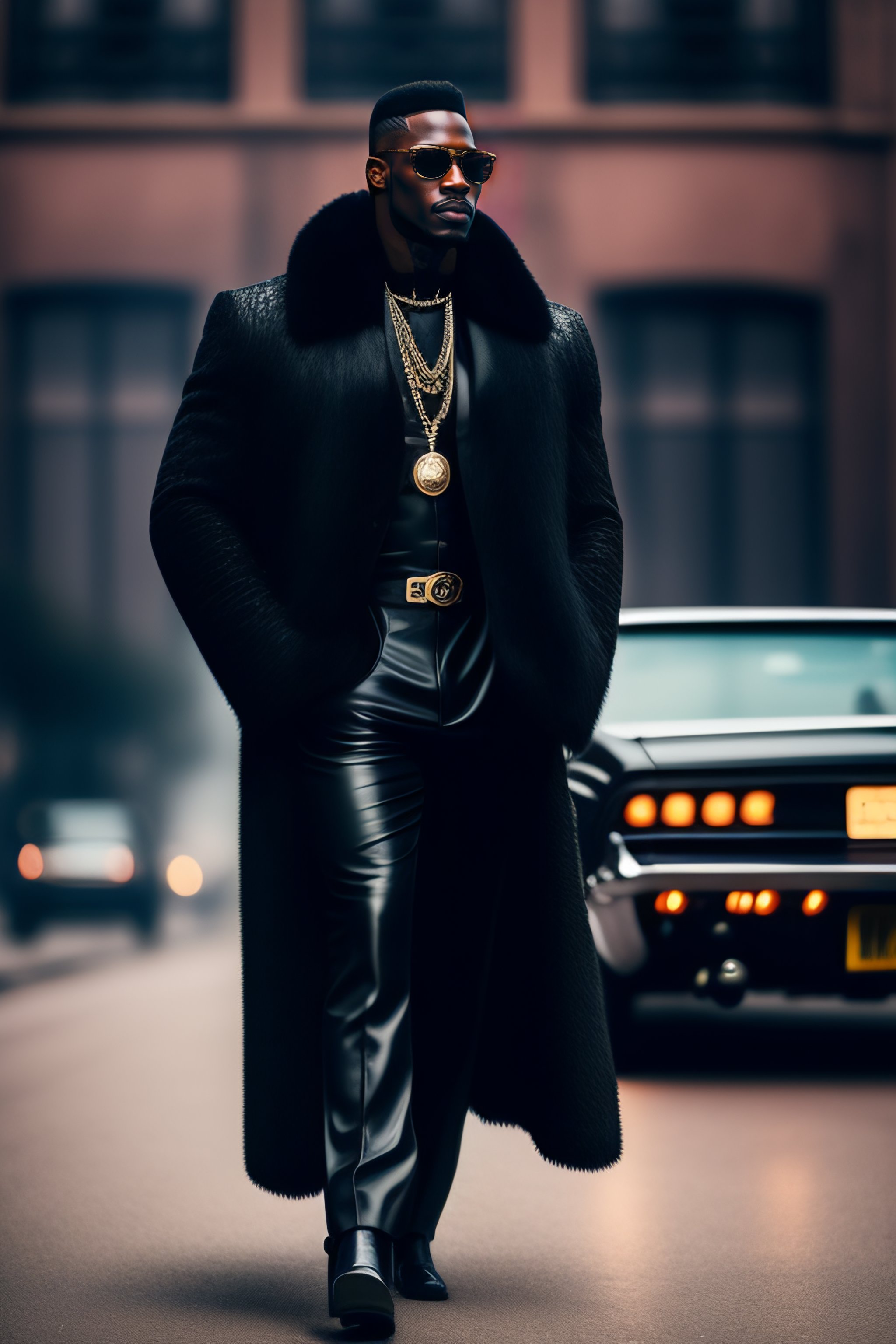 A real person in high quality photography picture looking like a black pimp with black leather clothes and a white fur coat and a big machine gun in his hand, in the style of american gangster movie, the look and feel should be more like 1972