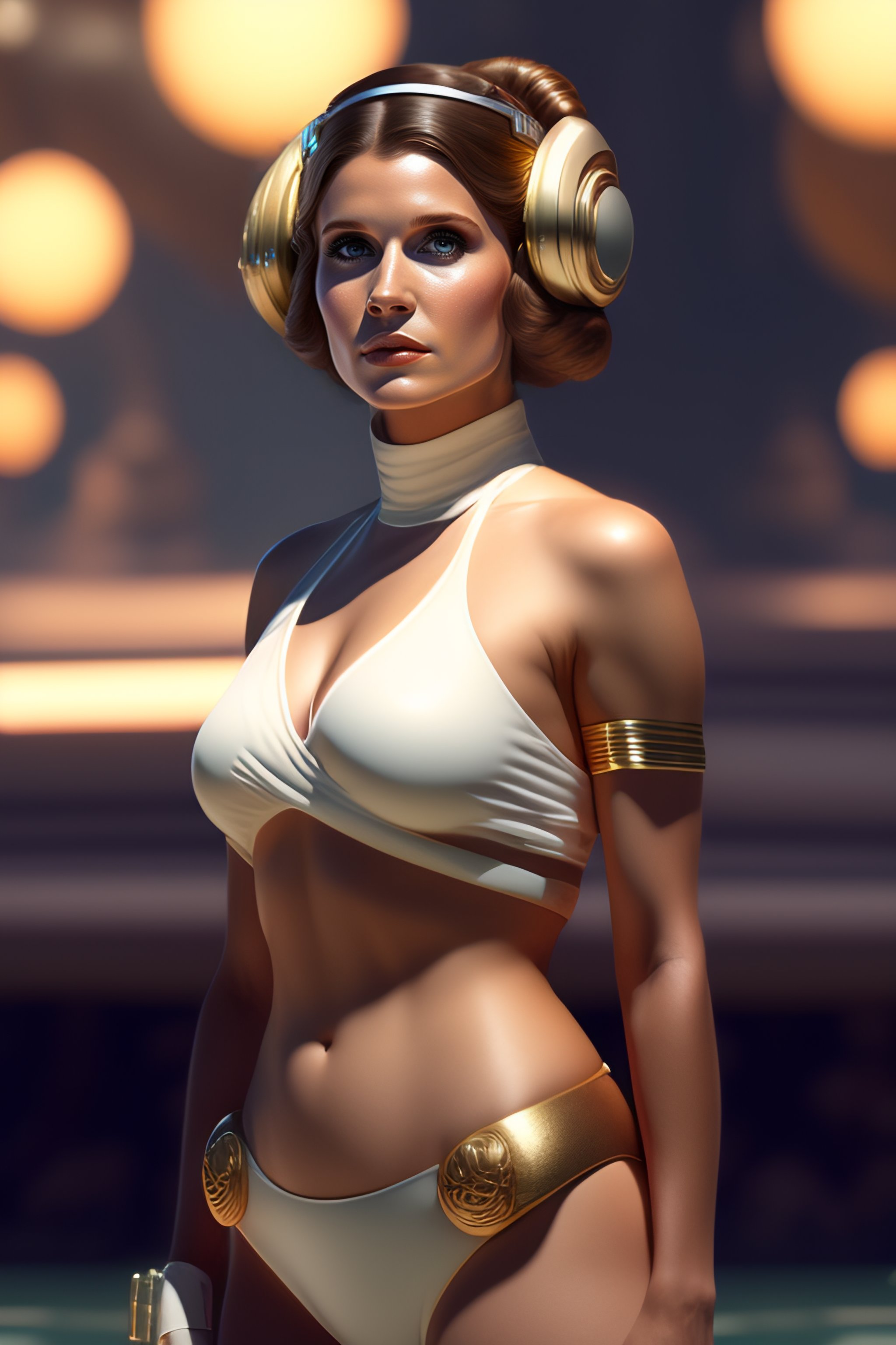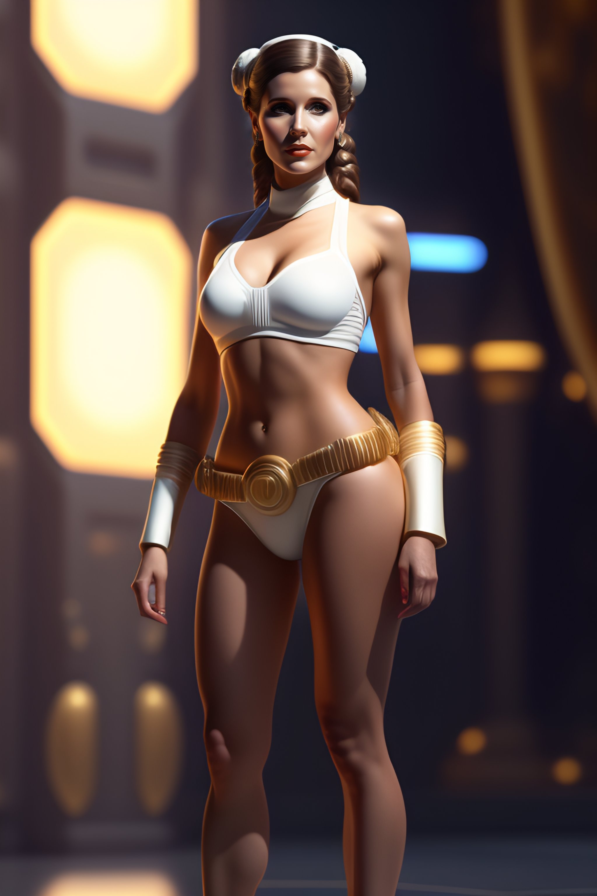 Bikini, full length, legs, young carrie fisher as princess leia, anatomy, bathed in light, highly detailed, photorealistic, artstation, smooth, sharp focus, illustration, unreal engine 5, 8 k, art by artgerm and greg rutkowski and edgar maxence