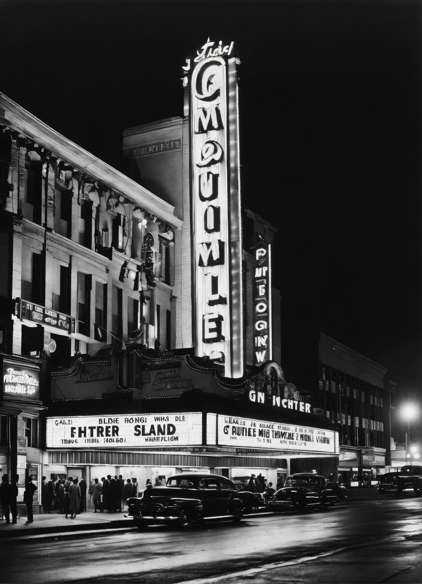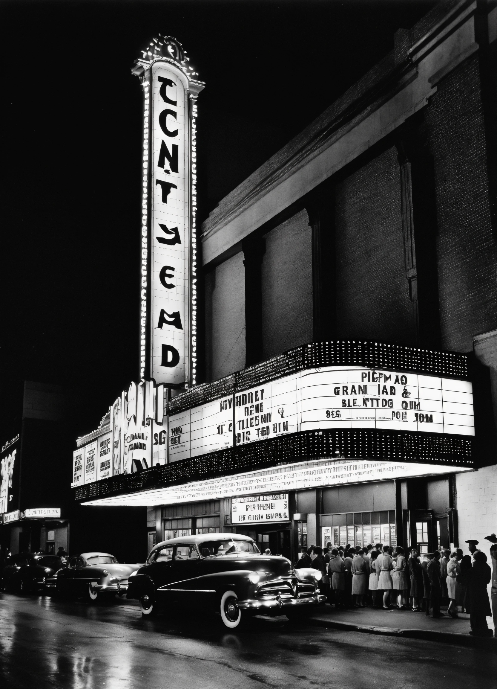 A black and white scene of a large grand movie theater on the left side of the image at night, in the 1950s. the theater is on a busy street with moving cars. above the theater is a large billboard advertising the movie. people are standing in line at the theater entrance. wide angle view.