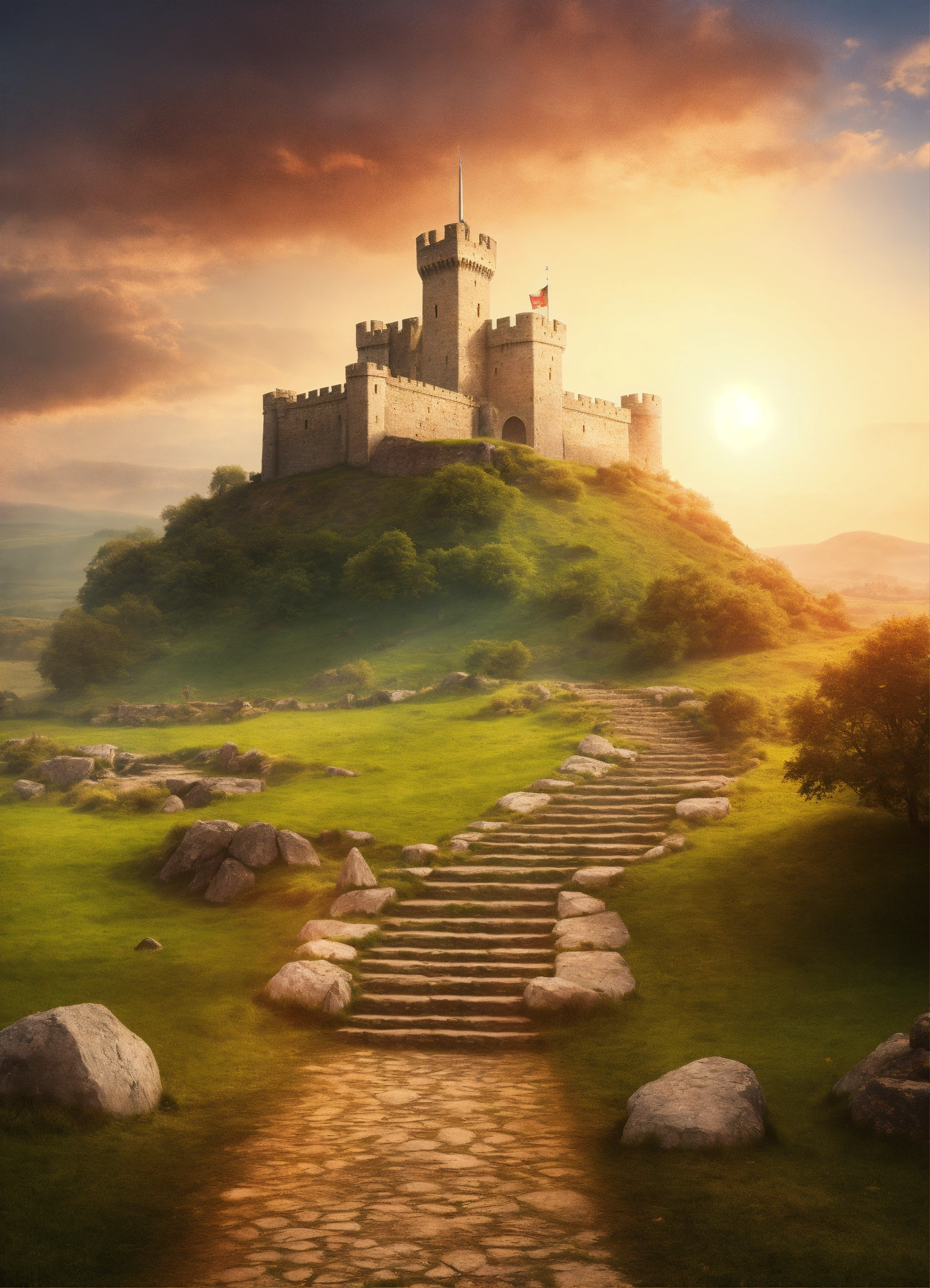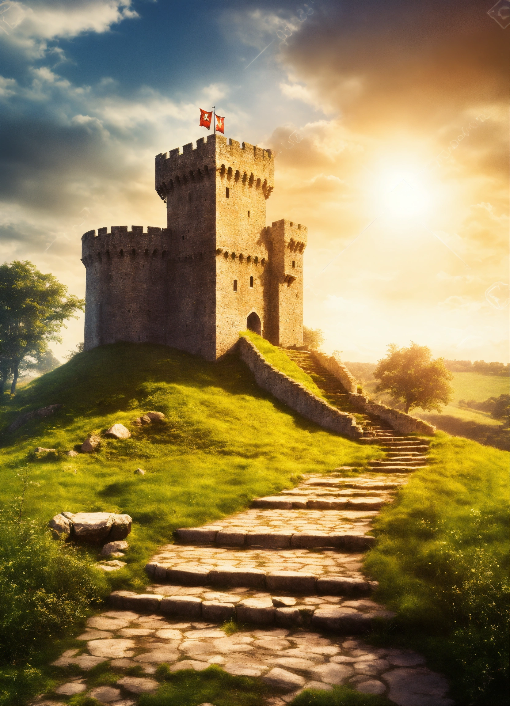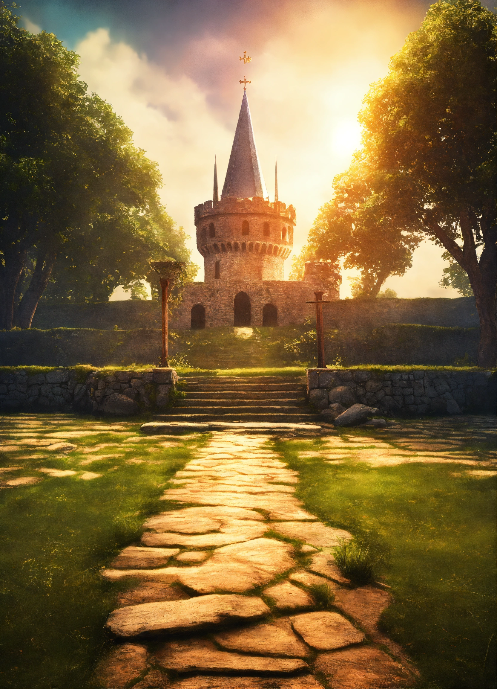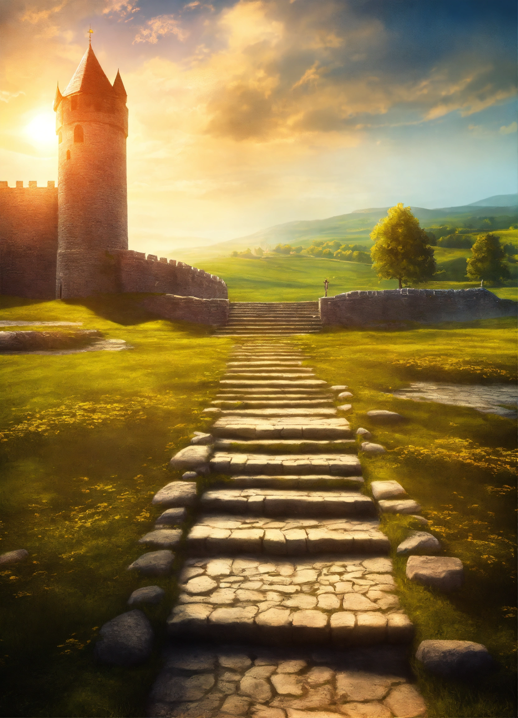 Create a design medieval background with fantasy lighting effects, create a captivating background scene of fantasy medieval training plain fields, training fields for warriors in swords fighting, wide area, sunny day, in left side the stone stairs to the kings tower