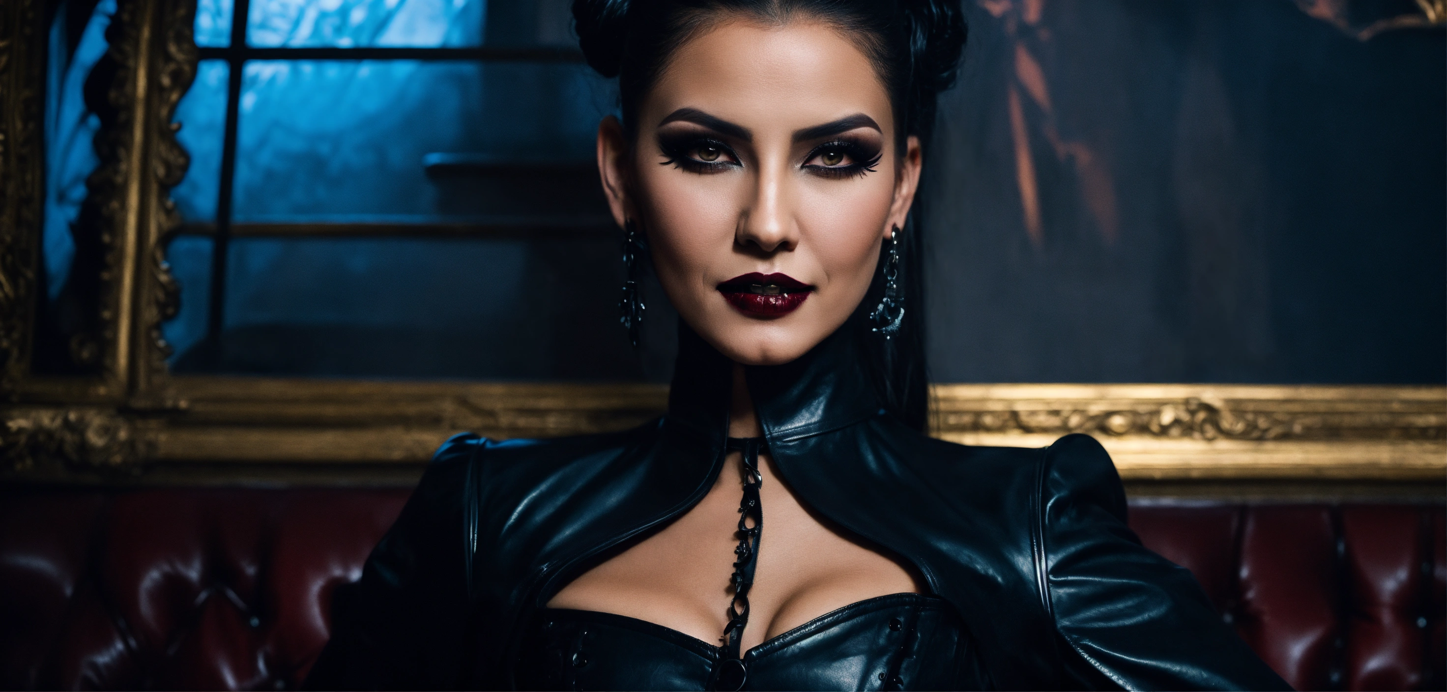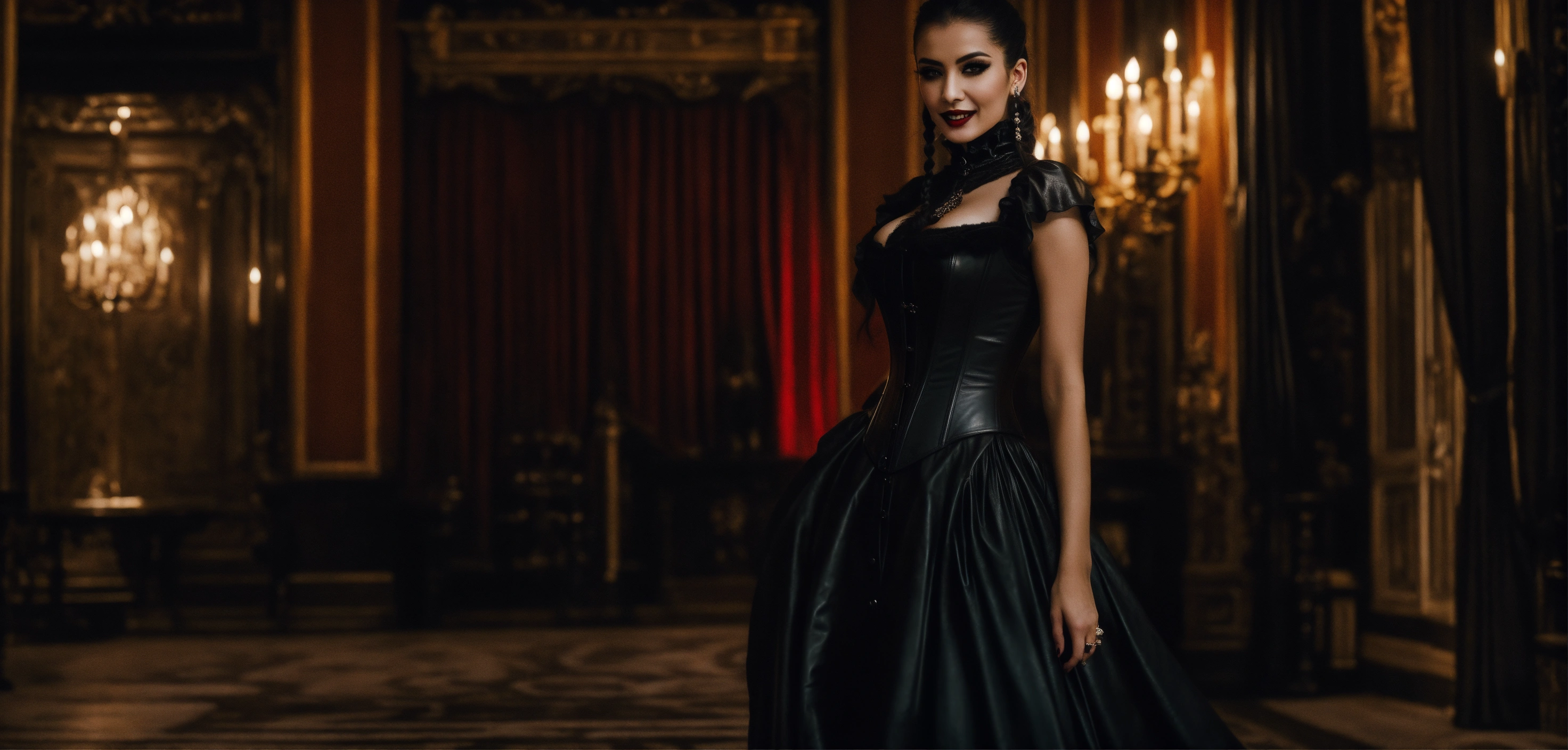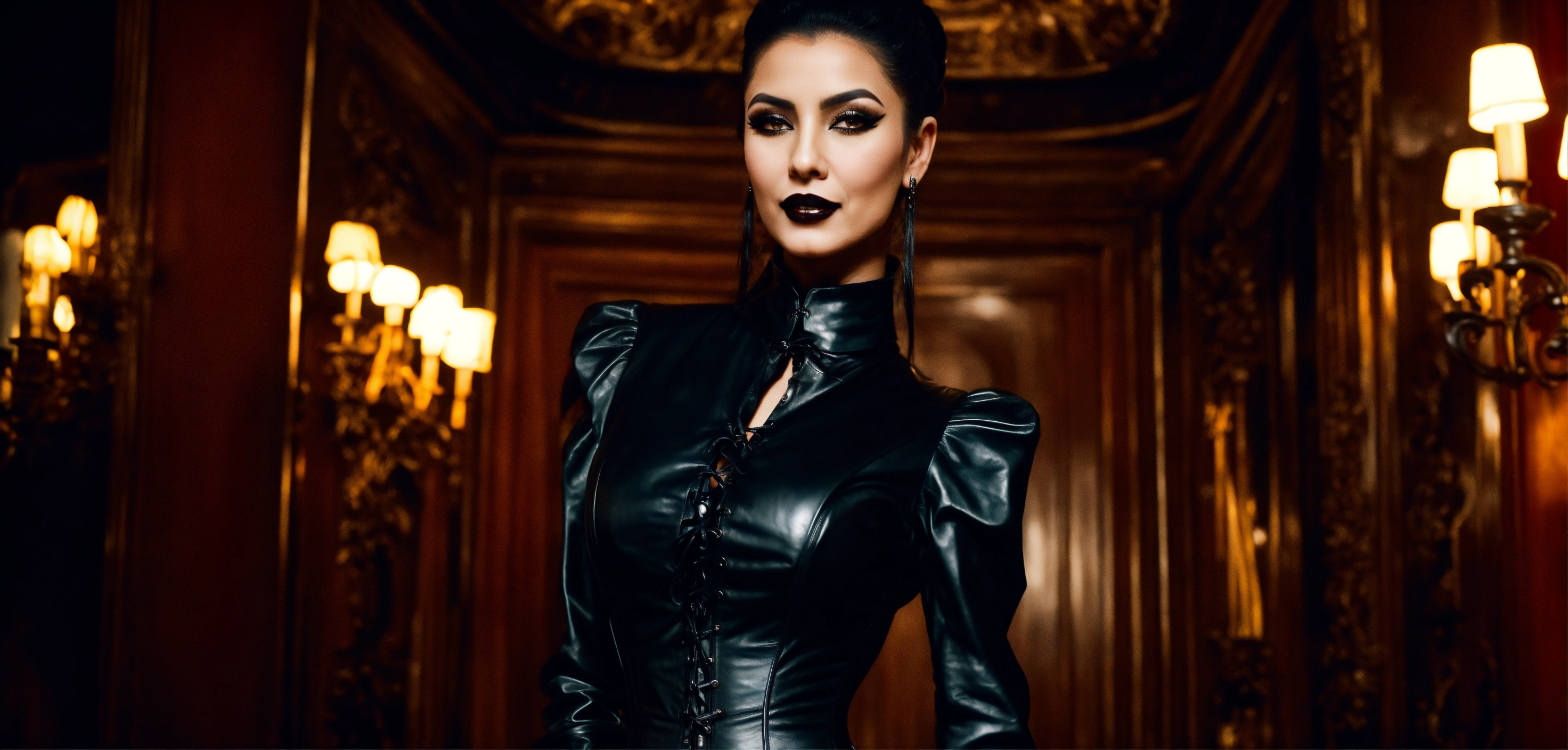 Cinematic look, stunning arab seductress woman fashion model, arrogant evil smile from above showing vampire teeth, black straight hair very high ponytail, black leather corset, long strict victorian governess wide black long leather shirt dress with long big puff sleeves and big buttons, mansion hall by night haze, eyeliner makeup, underworld vampire movie style
