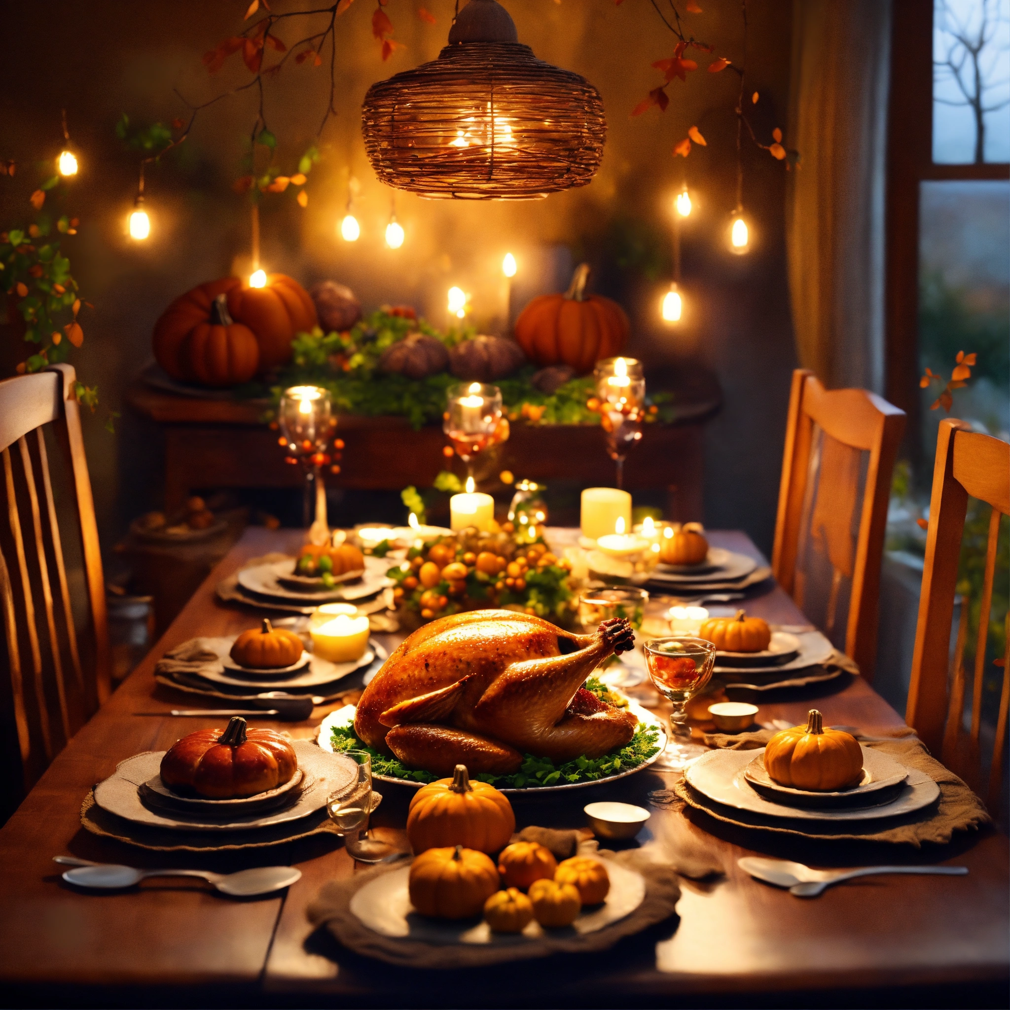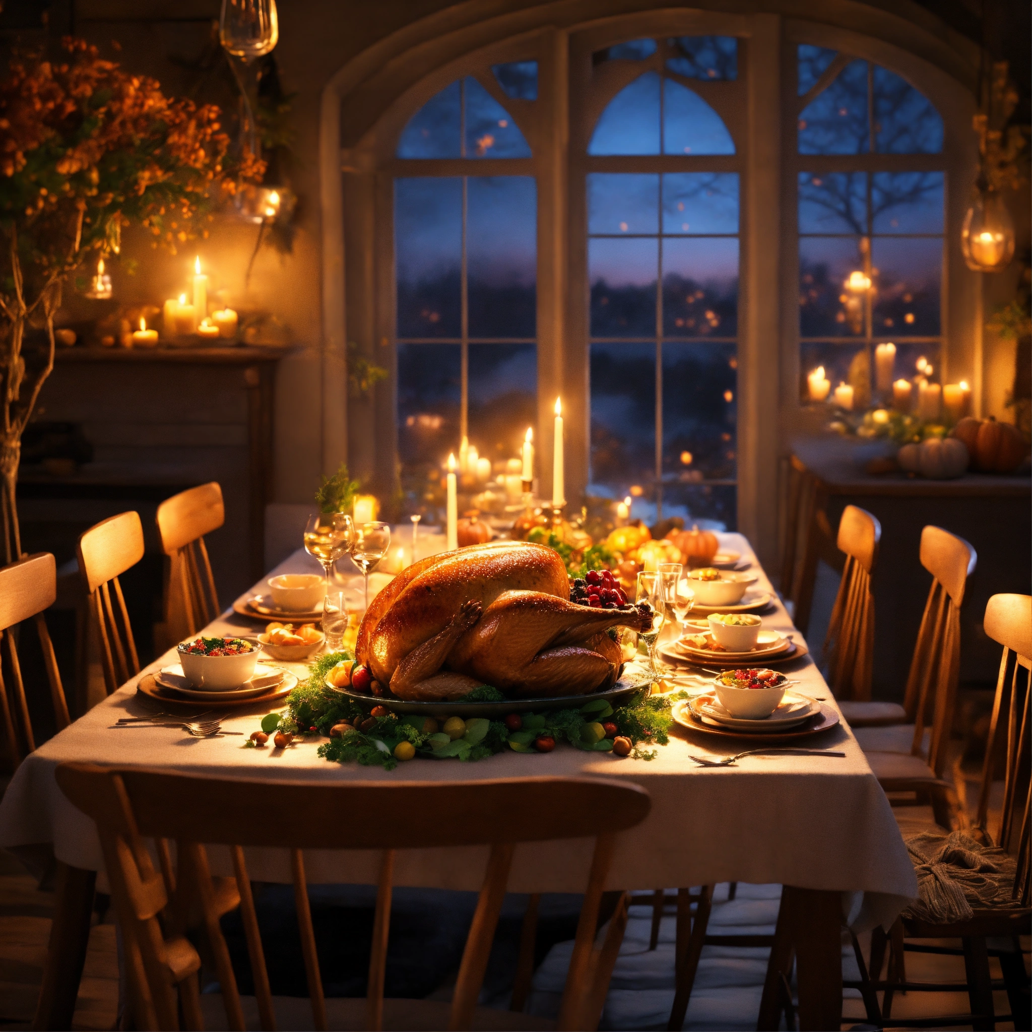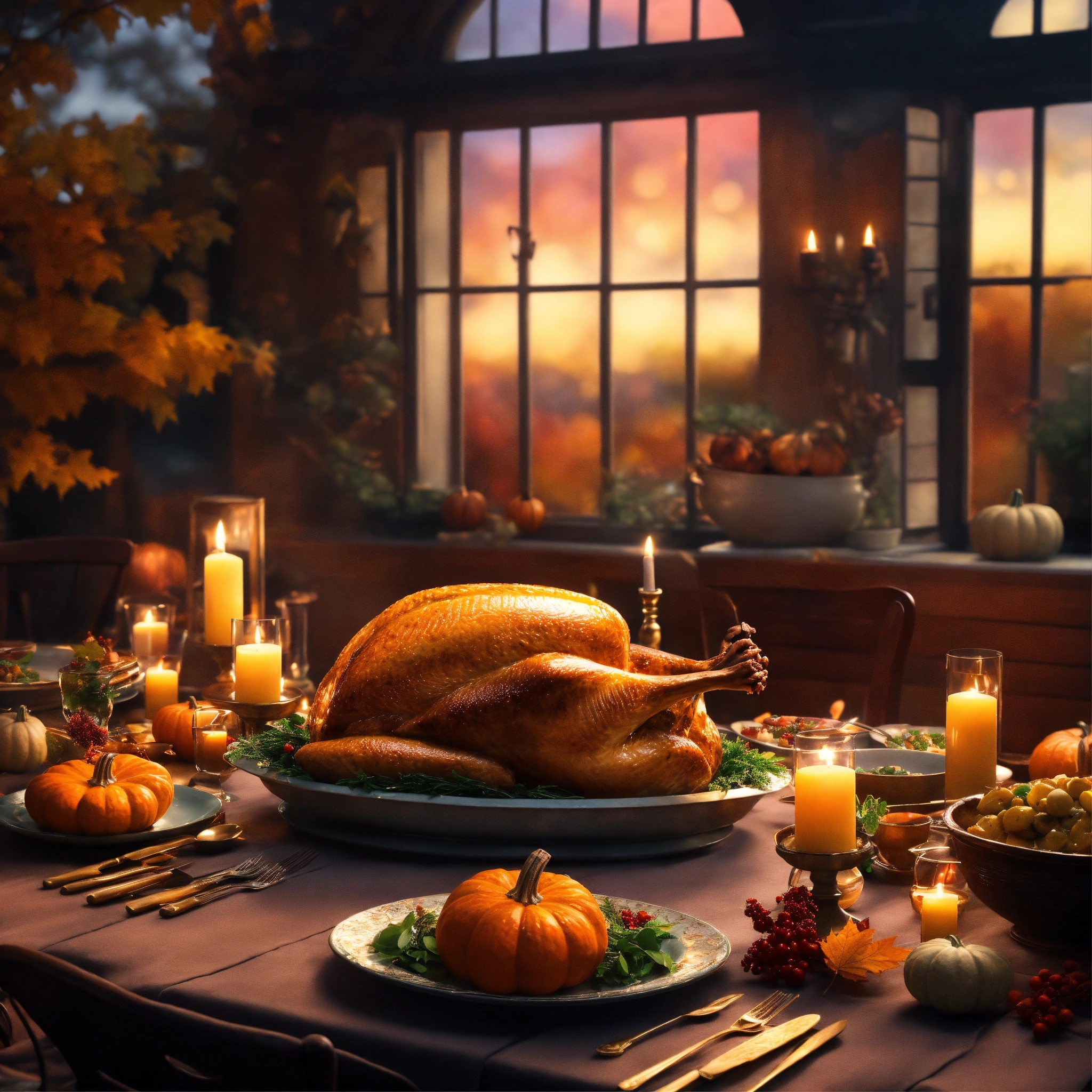 Epic shot of a ultra cozy thanksgiving table (no meat), ultra detailed digital painting, little photorealistic, sharp focus, magical healing place. luminous. evening atmosphere. ultra cozy and inviting place, wish to be there. very detailed, arty, should rank high on youtube for a dream trip. addresses to women in menopause