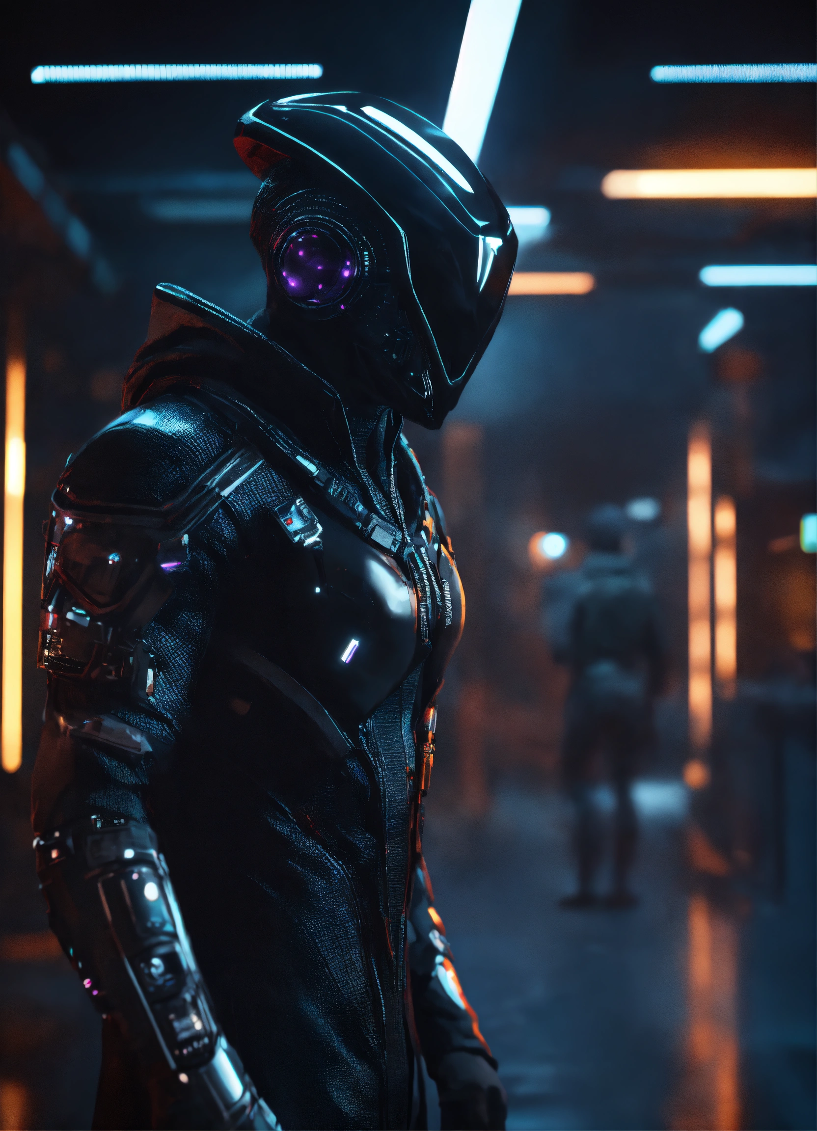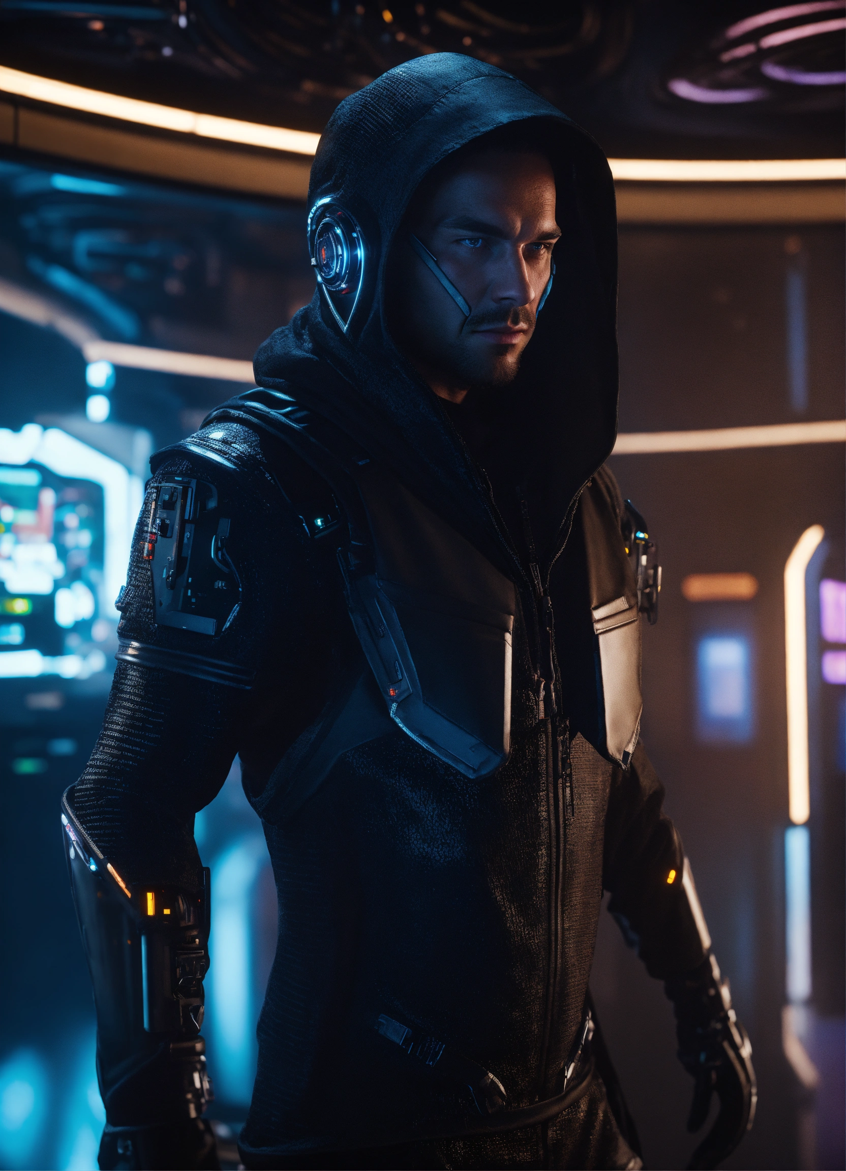 Male alien mutant half cyborg hacker wearing futuristic black clothing, hi-tech visor and hooded cape, in a dark futuristic space port bar, 8k, realistic. unreal engine, pixar