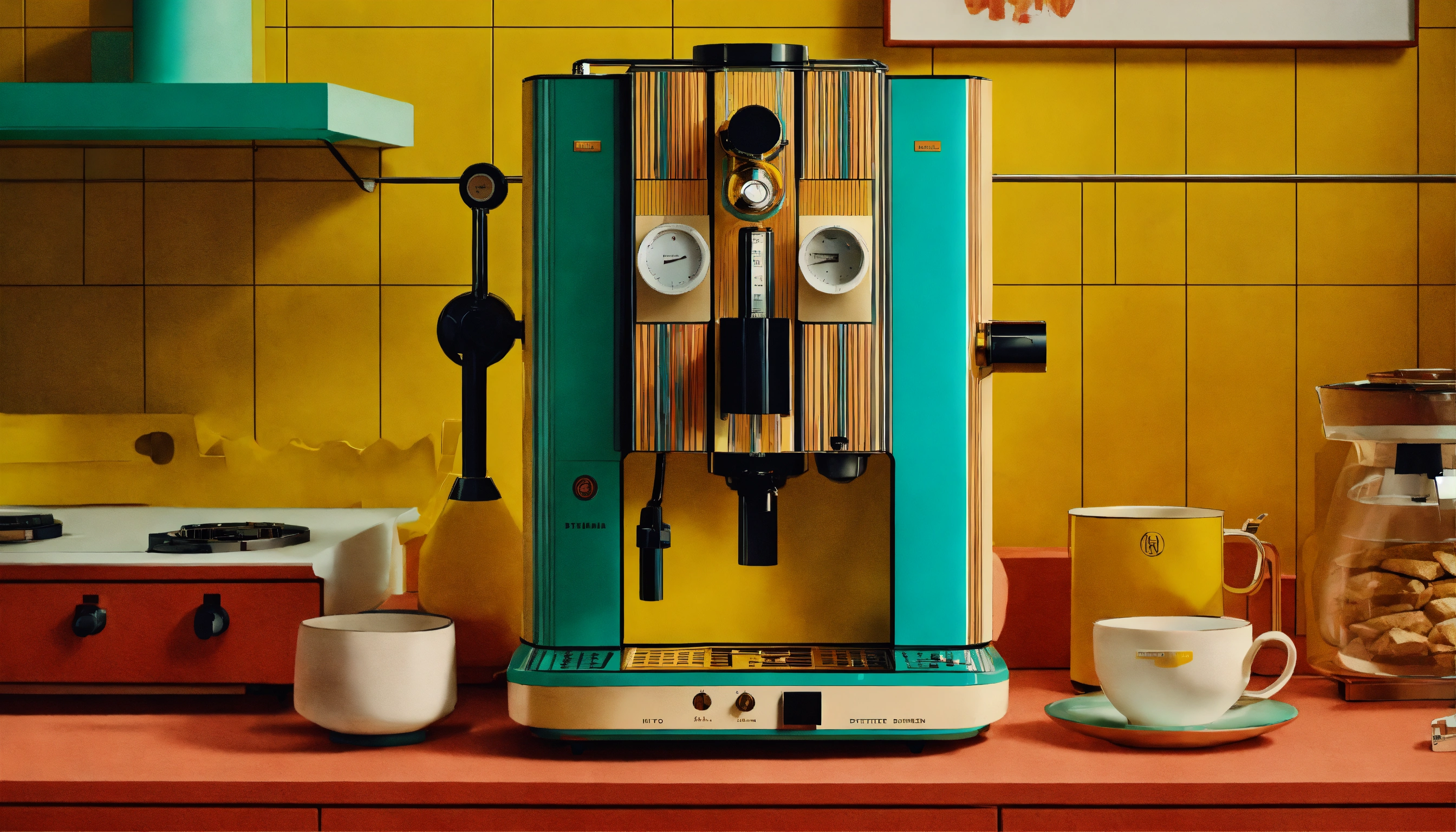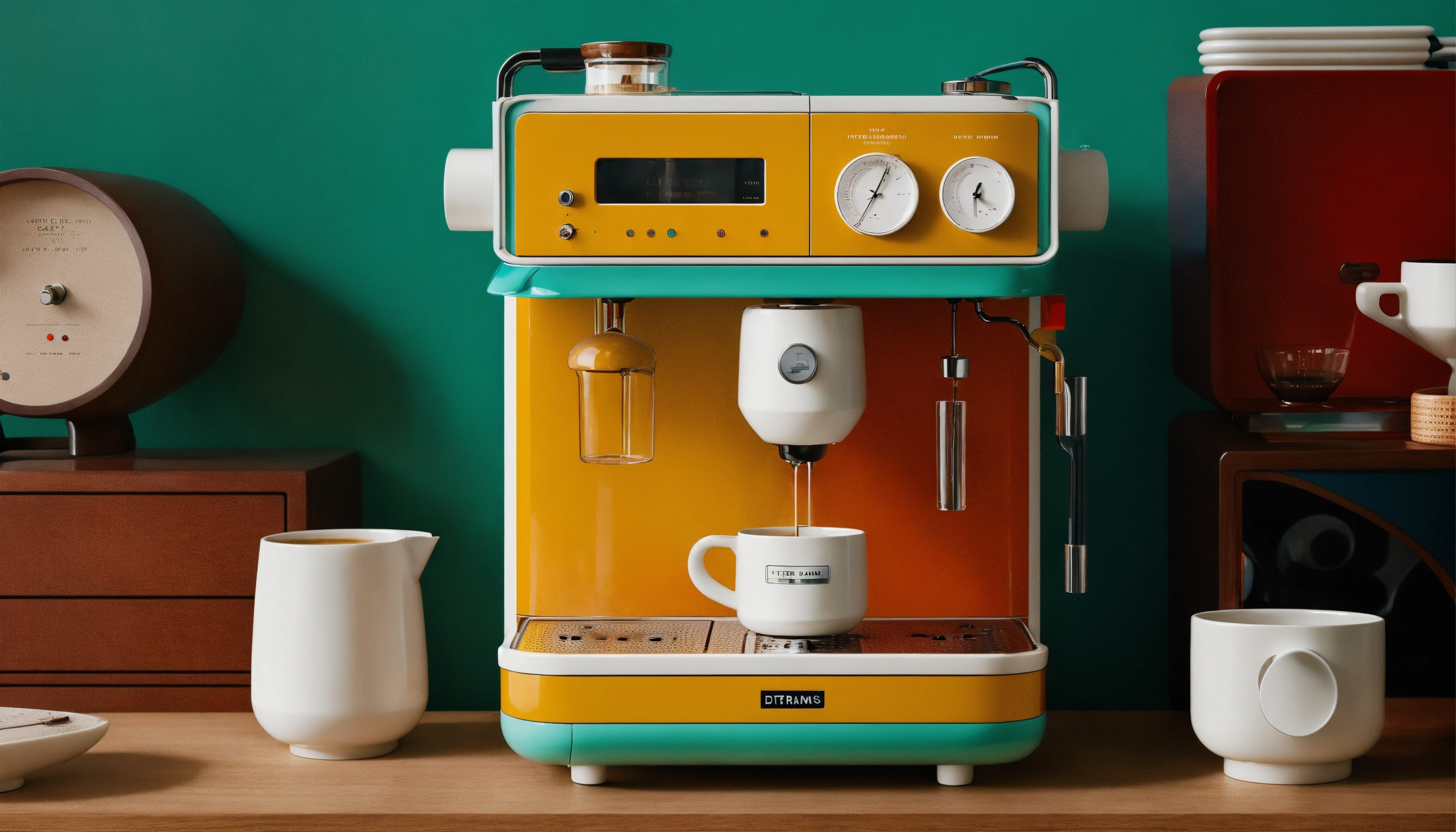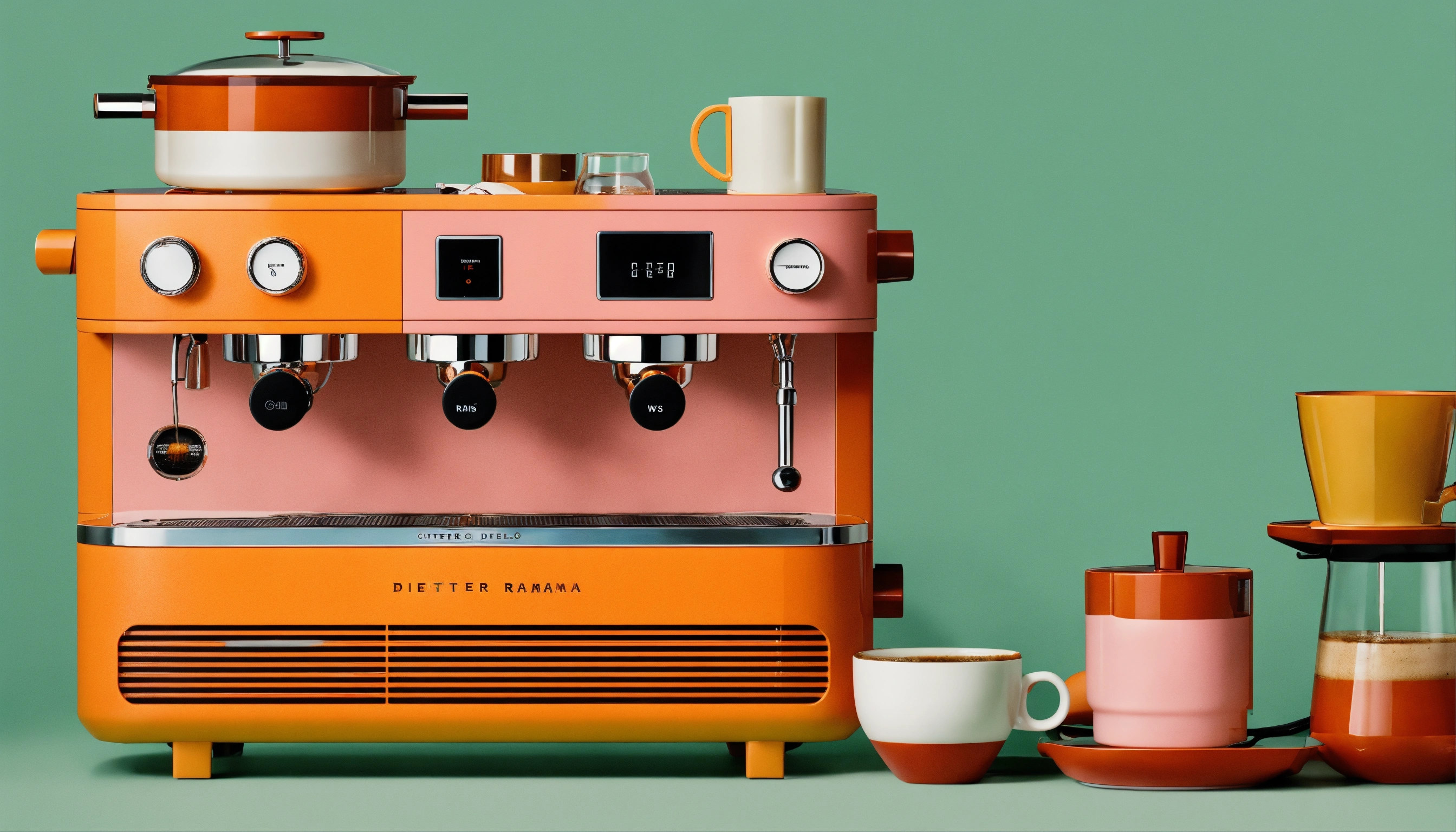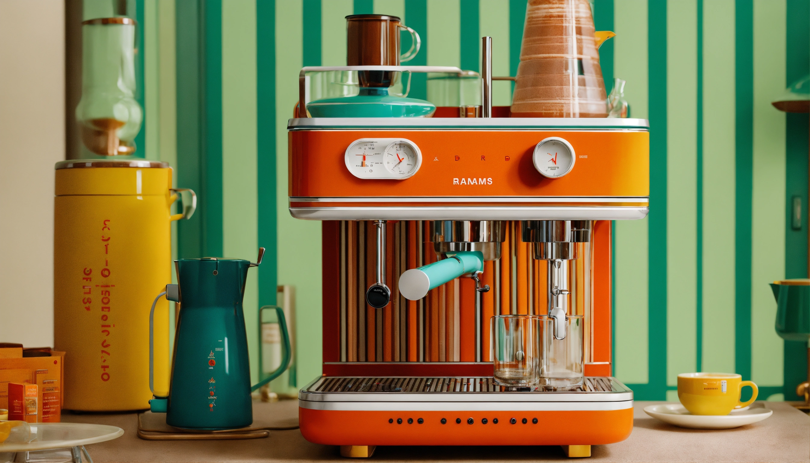 Wes anderson x dieter rams collab, intricately designed coffee maker with lots of flowing pipes, steam, product ad retro, colorful stunning design