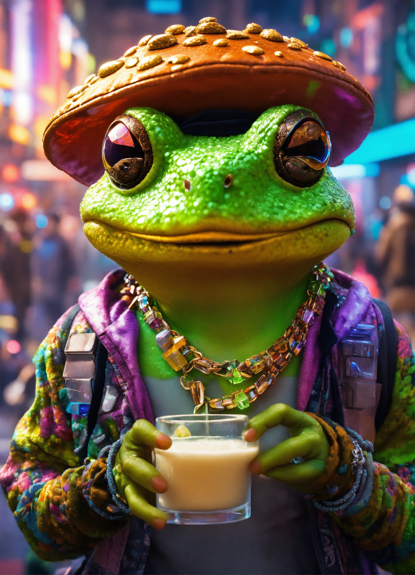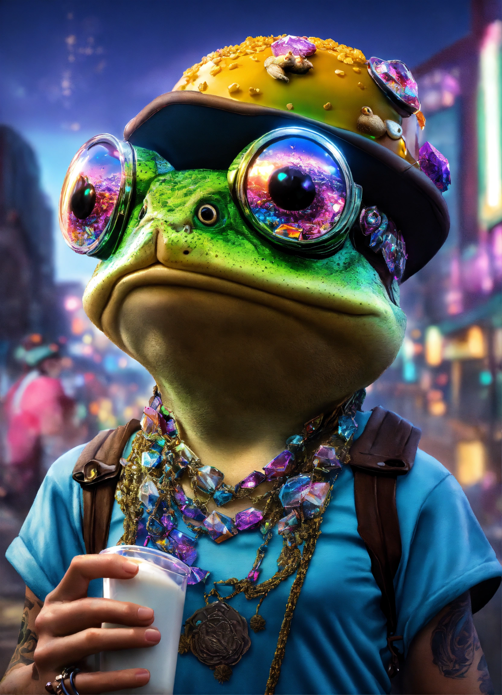 A toad drinking milk slice of life anime, cyberpunk colorado festival raver toad, crystal hemp necklace, hand full of money, of a person in urban street wear, psychedelic dmt clothing, vaping crystals photorealistic, volumetric lighting, 8k, highly detailed