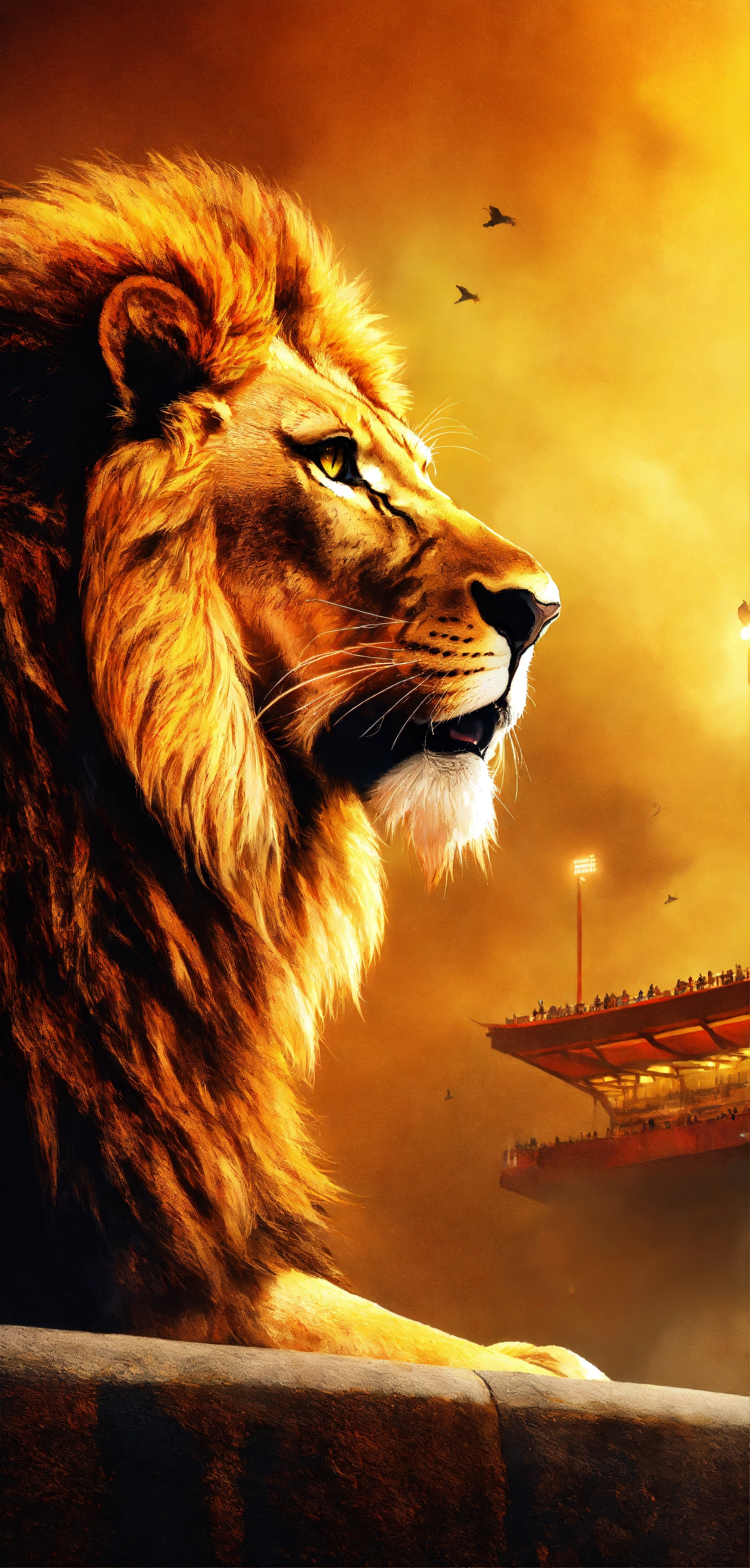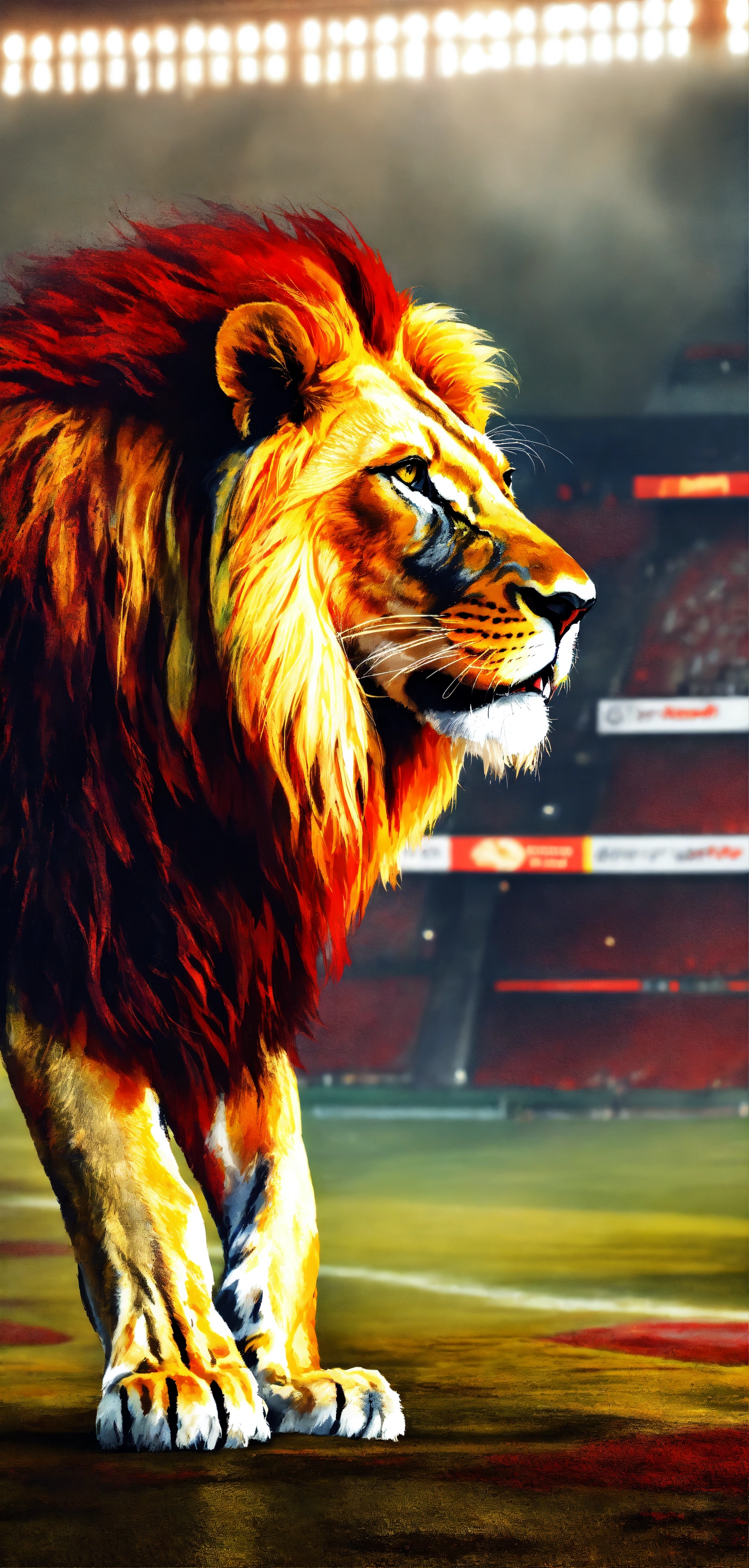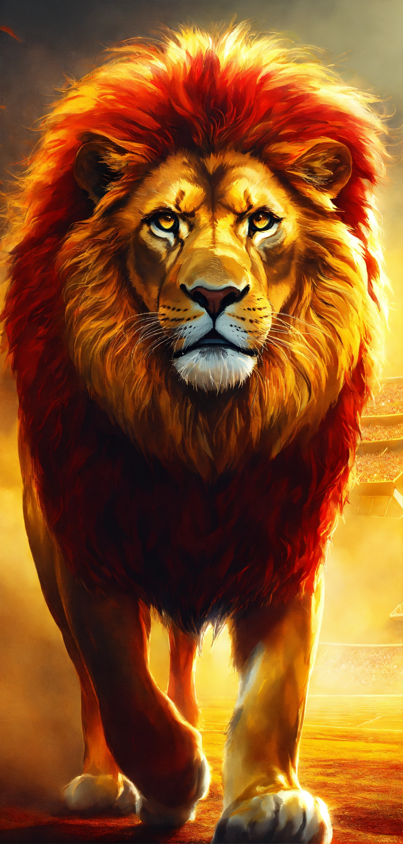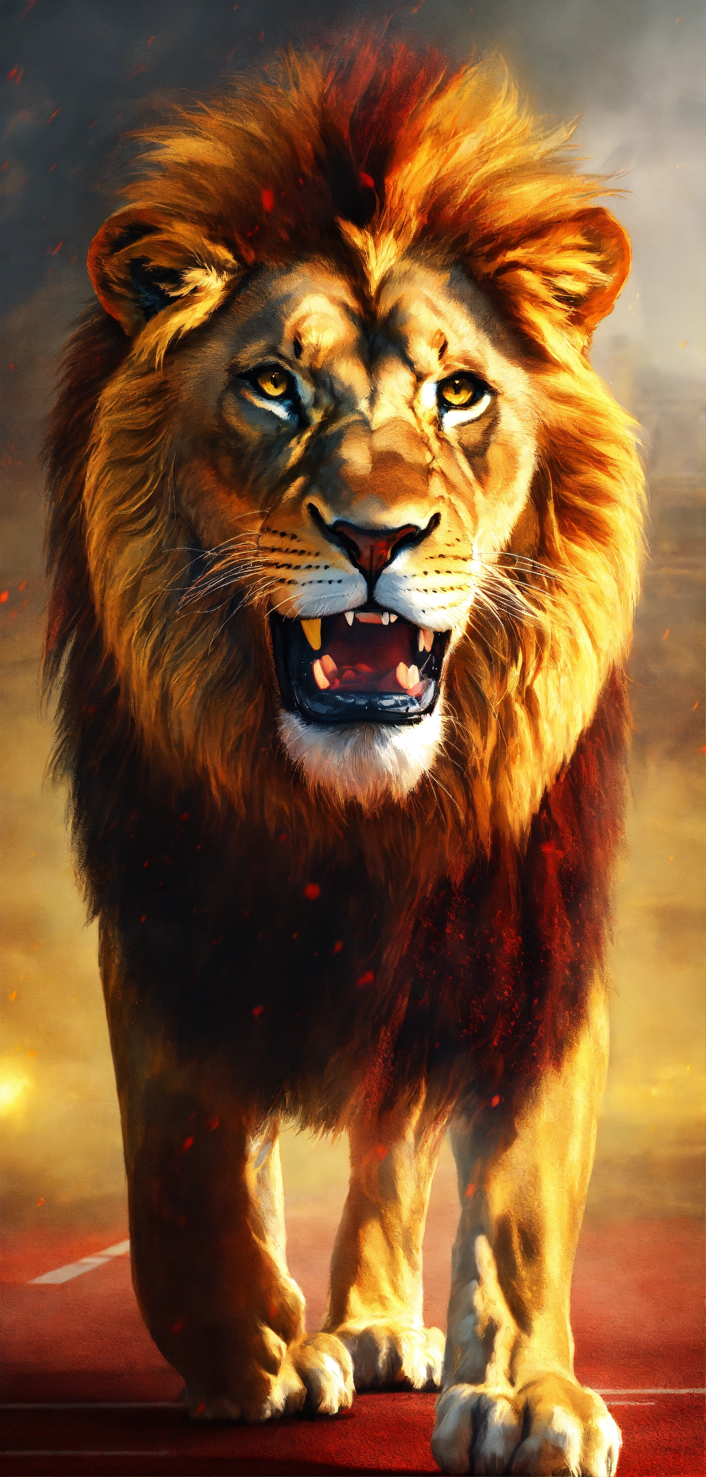 Lion, roaring lion yellow, red, majestic, realism, ultra-realism, foggy environment, above stadium, 4k